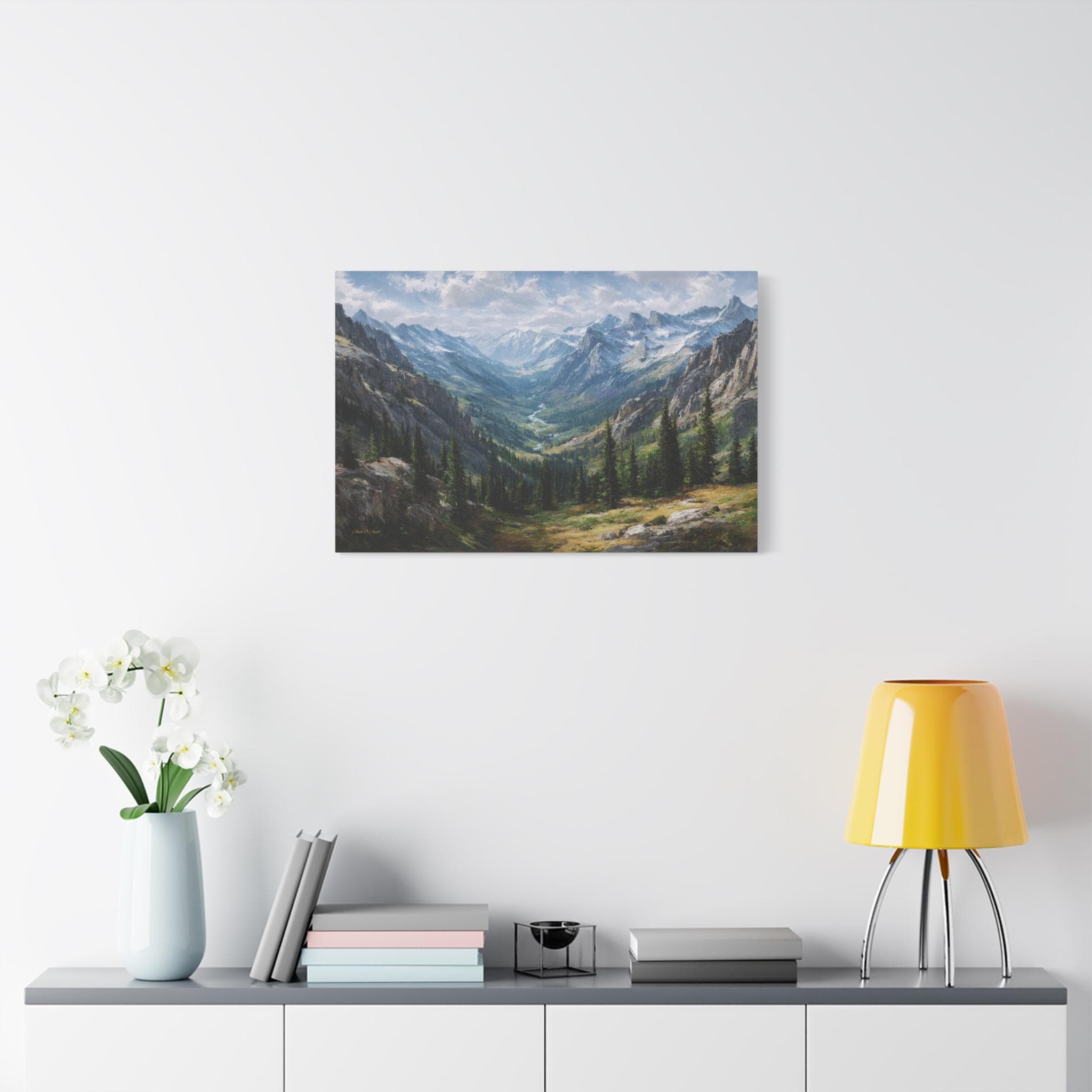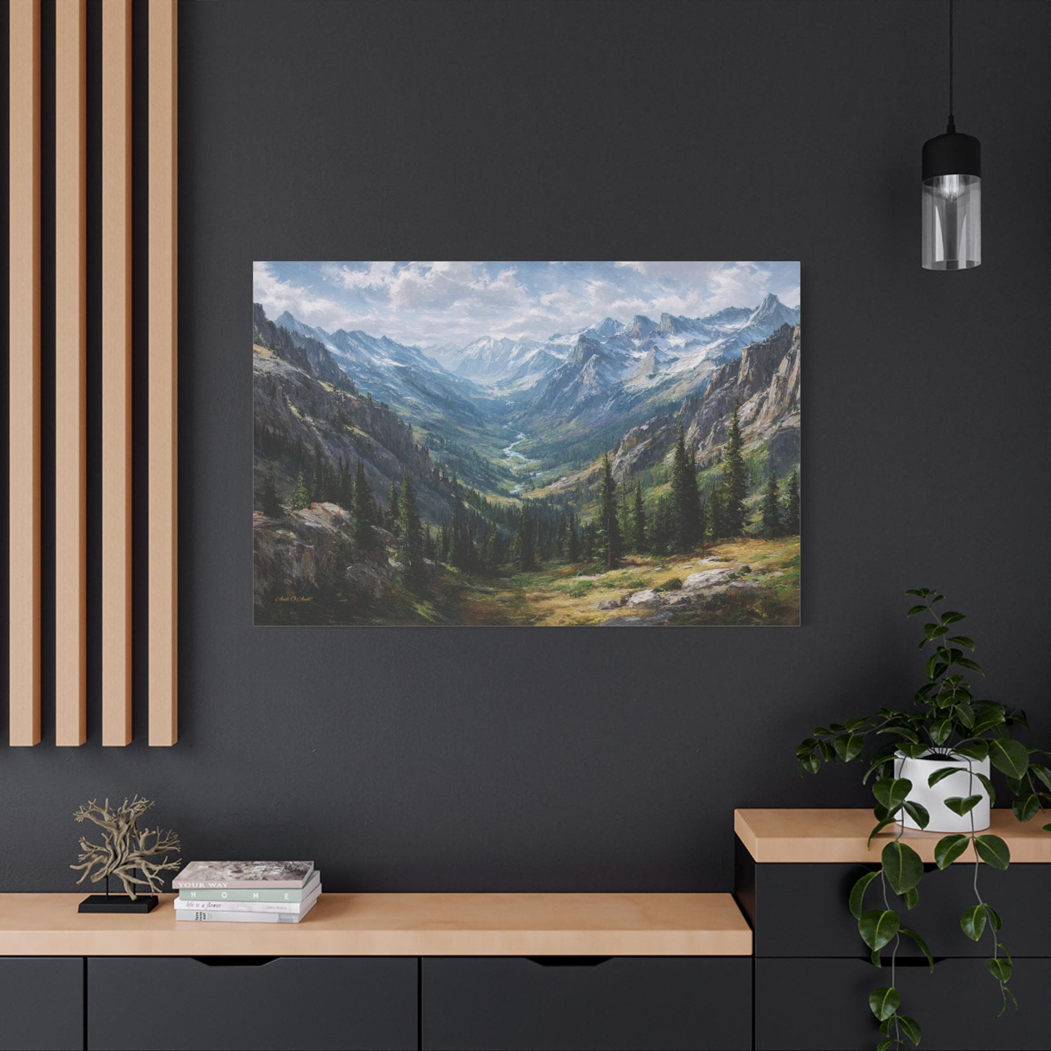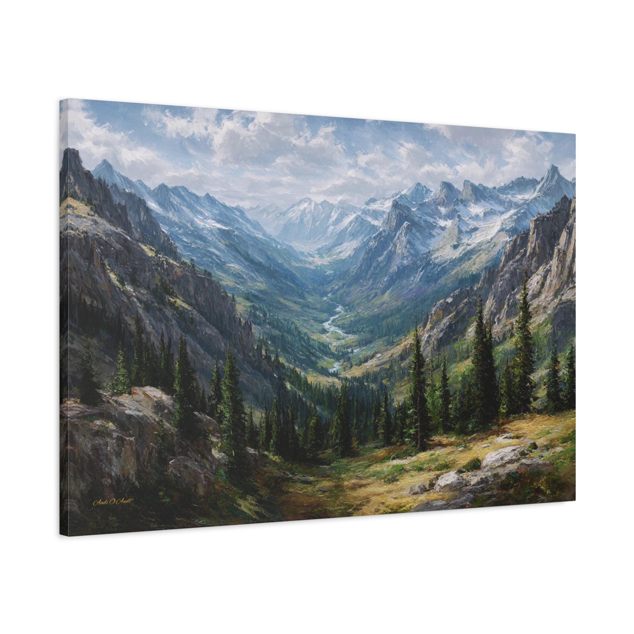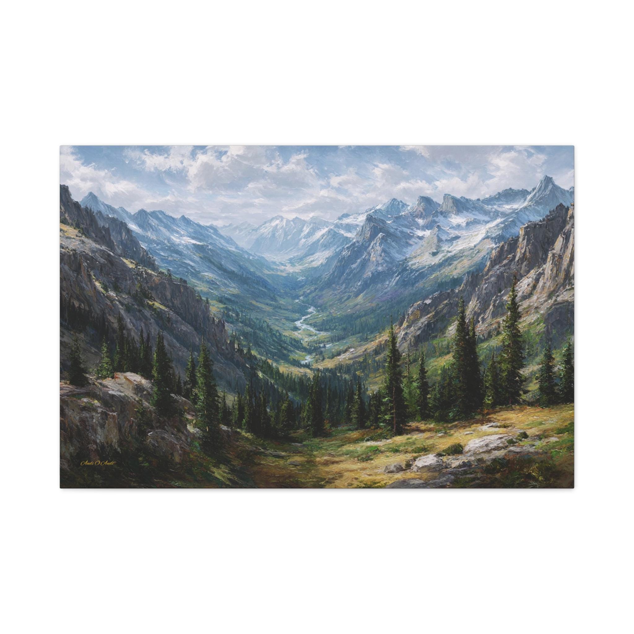 Bring the awe-inspiring majesty, expansive freedom, and rugged beauty of the alpine wilderness into your home with this stunning mountain valley canvas print. This captivating horizontal artwork features a breathtaking view down a lush, deep valley. A winding river cuts through dense evergreen pine forests and rugged, rocky cliffs, leading the eye toward towering, snow-capped mountain peaks set beneath a dynamic, cloud-swept sky.