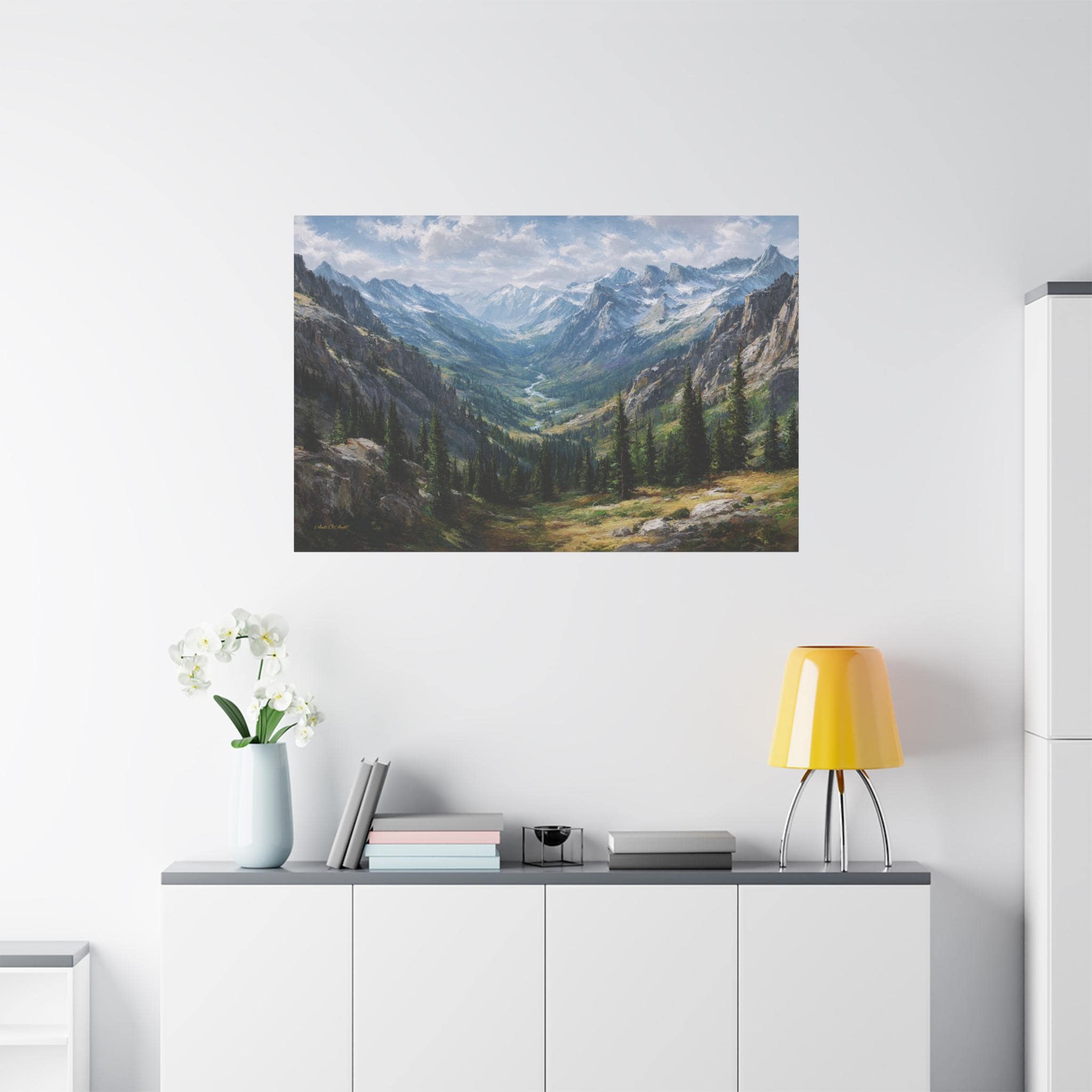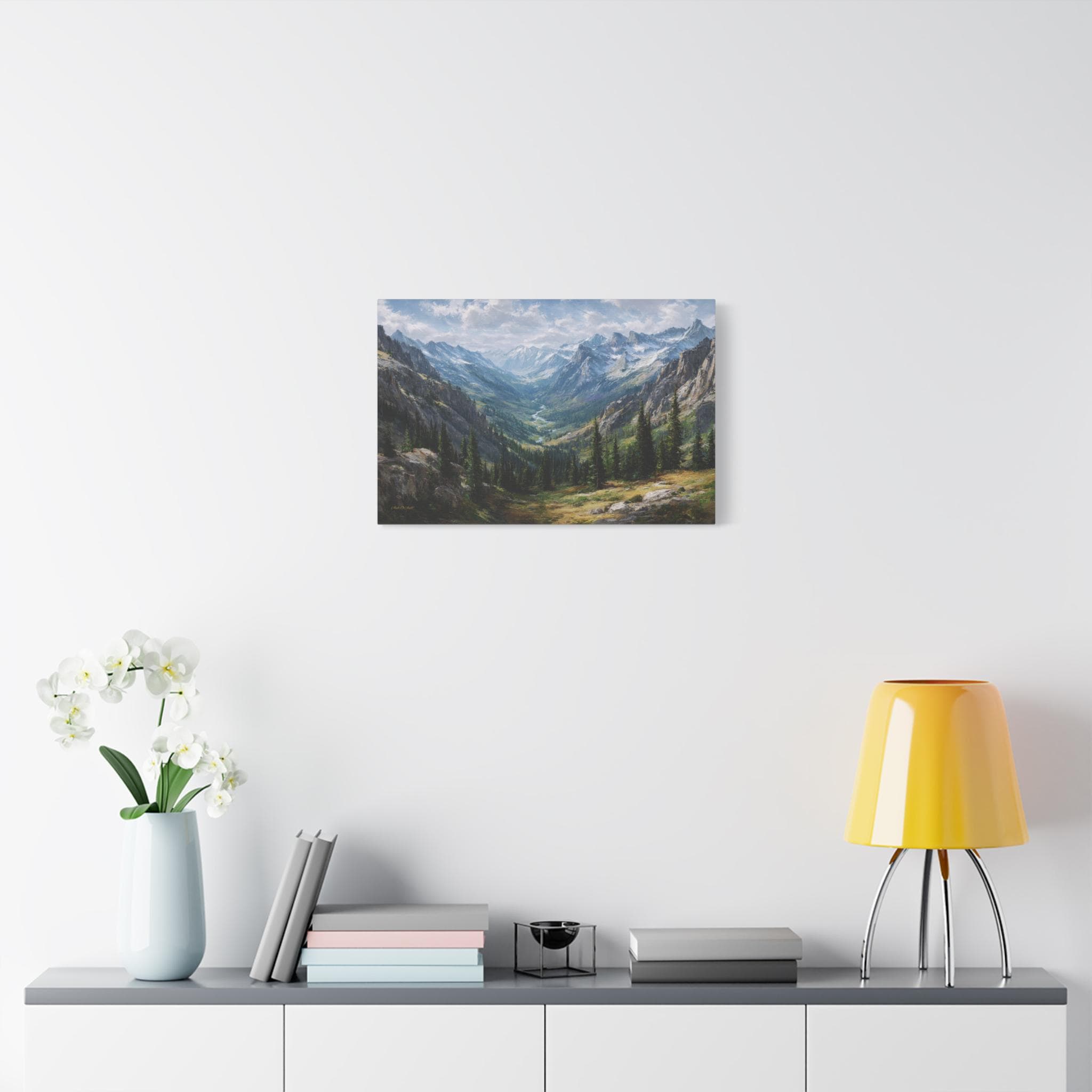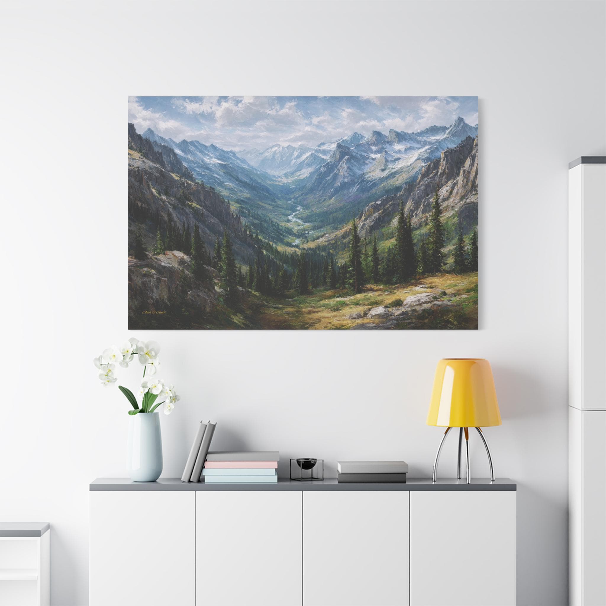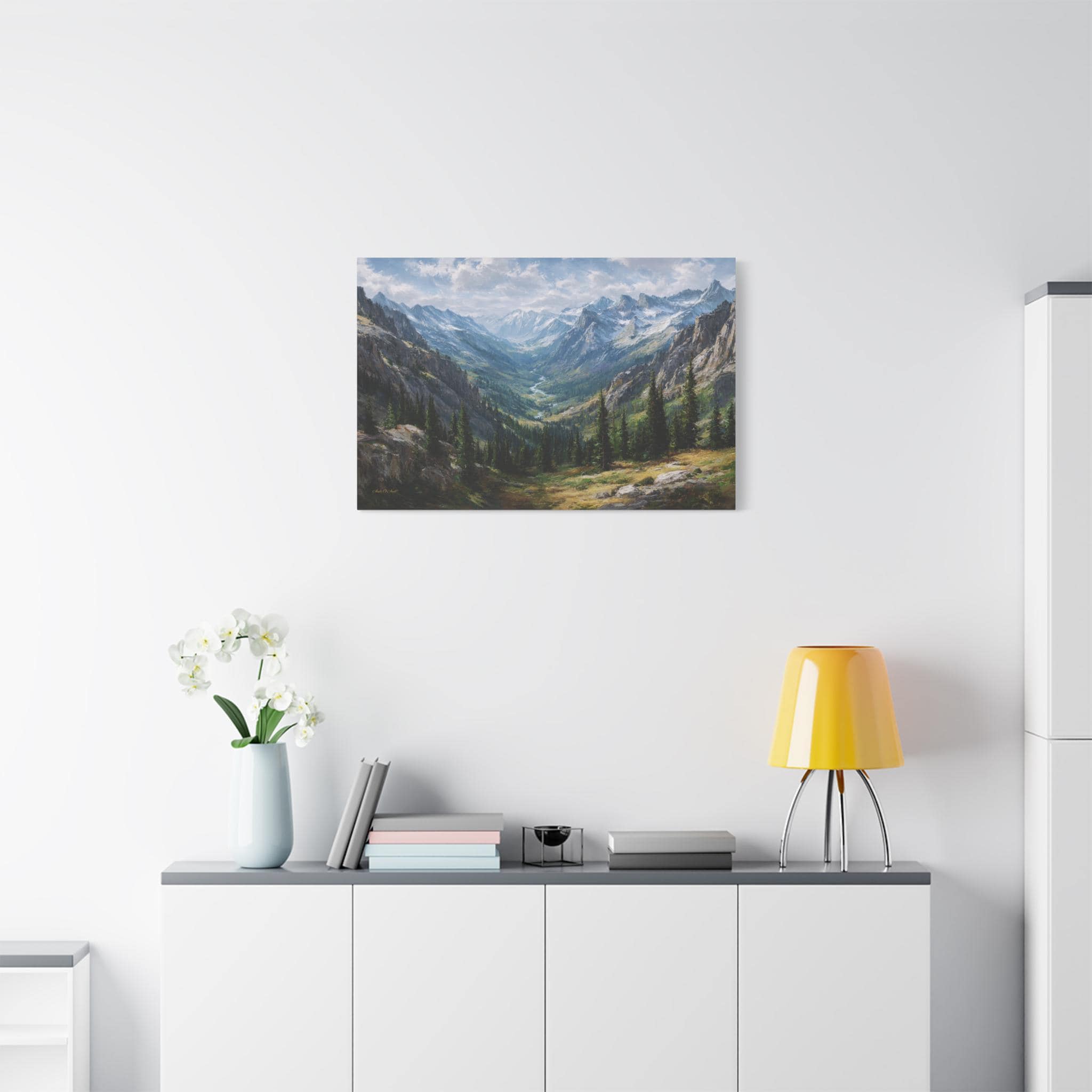 Bring the awe-inspiring majesty, expansive freedom, and rugged beauty of the alpine wilderness into your home with this stunning mountain valley canvas print. This captivating horizontal artwork features a breathtaking view down a lush, deep valley. A winding river cuts through dense evergreen pine forests and rugged, rocky cliffs, leading the eye toward towering, snow-capped mountain peaks set beneath a dynamic, cloud-swept sky.