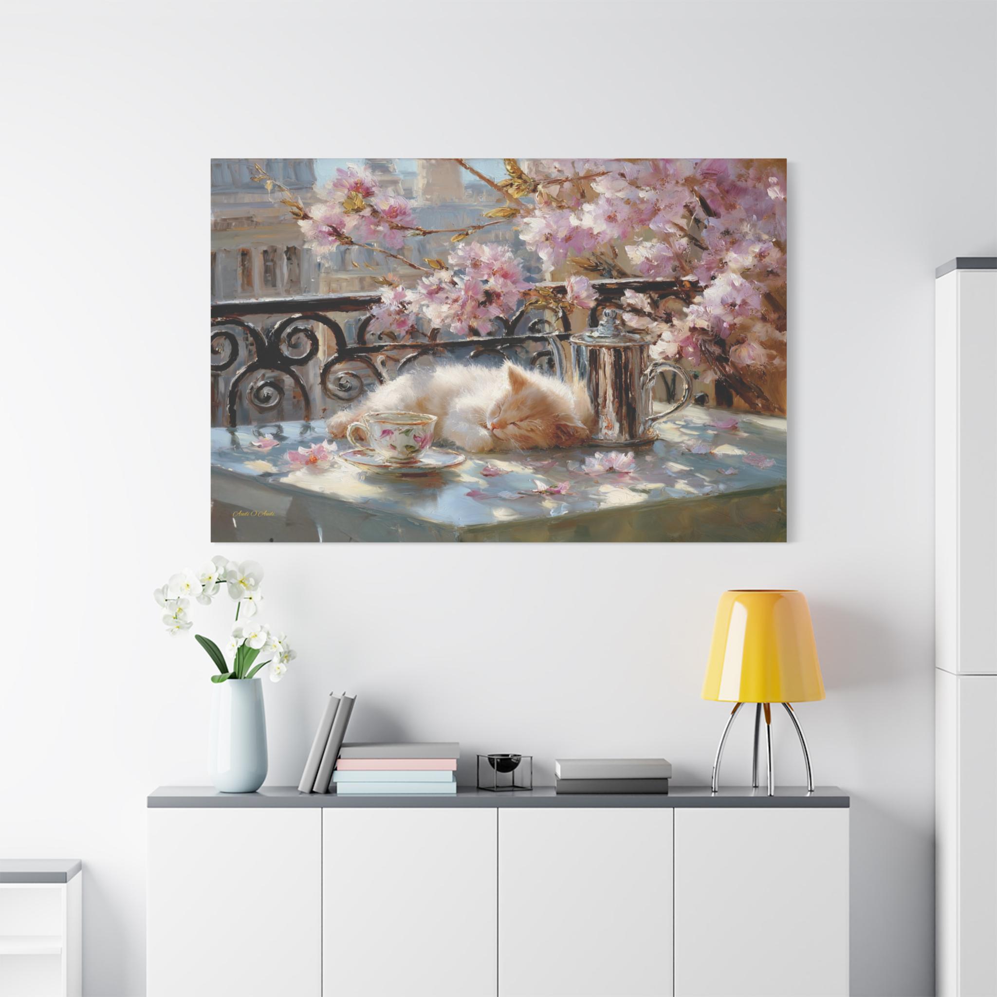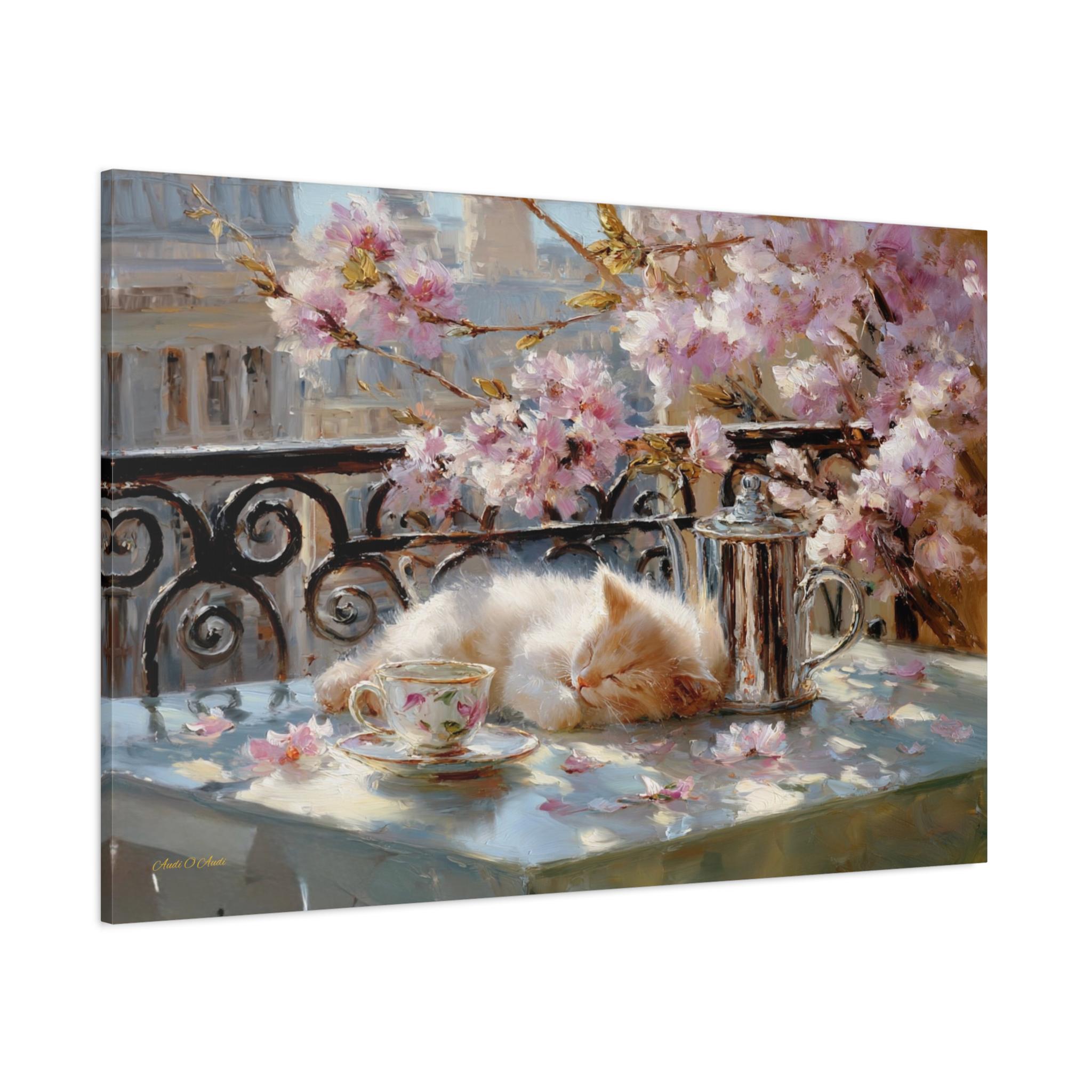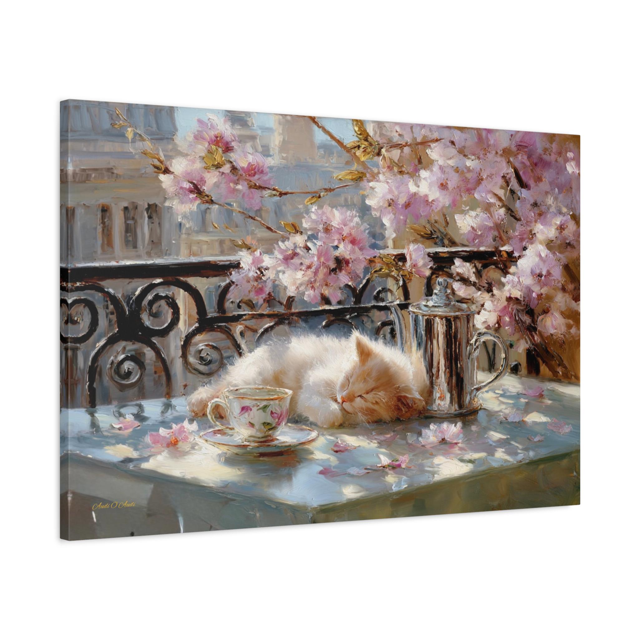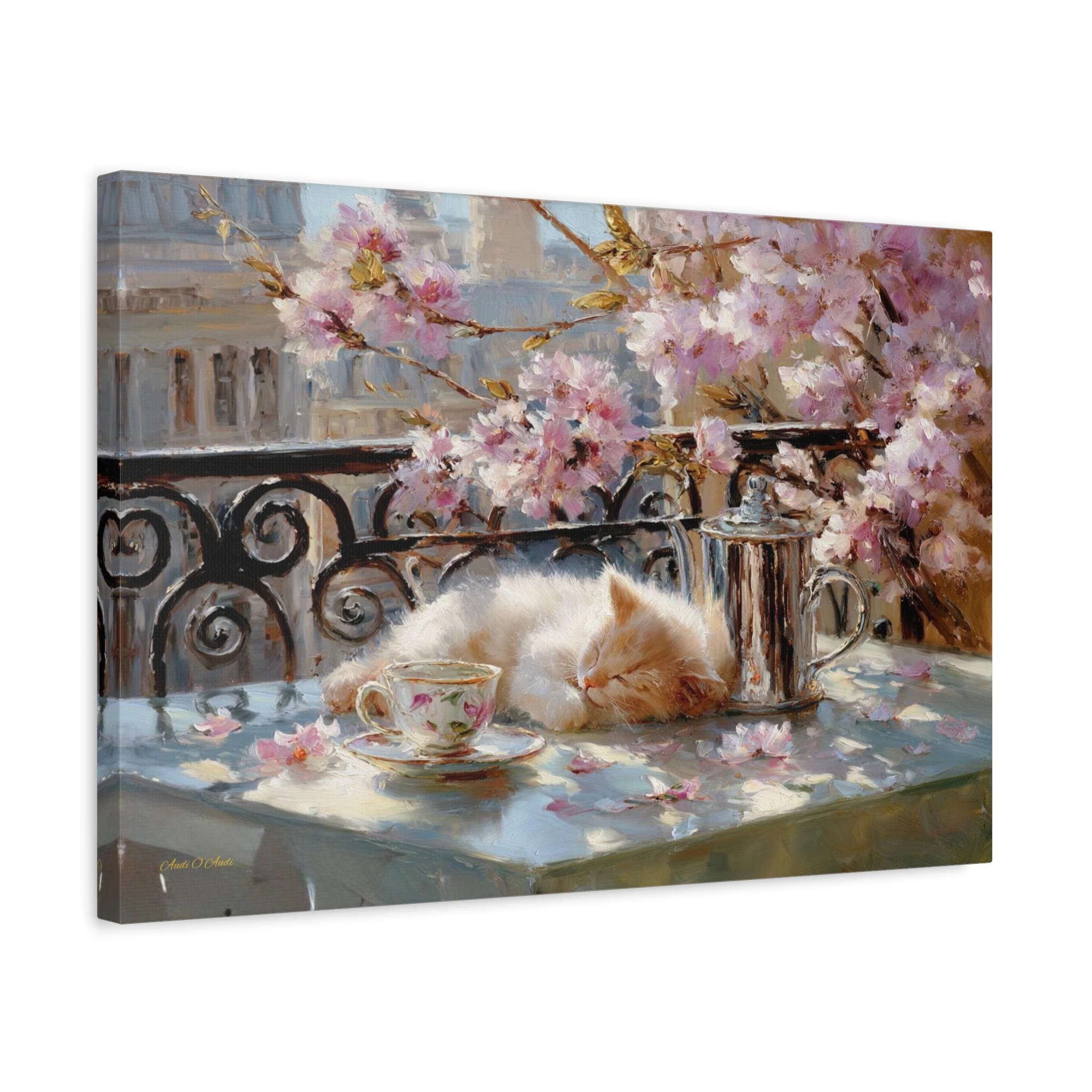 Bring the idyllic charm, peaceful warmth, and whimsical beauty of a European spring morning into your home with this stunning sleeping kitten canvas print. This captivating horizontal artwork features a fluffy, sun-drenched kitten taking a peaceful nap on a balcony table beside a delicate floral teacup and a classic silver teapot. The scene is perfectly framed by a classic wrought-iron railing and breathtaking pink spring blossoms, with soft petals scattered across the table.