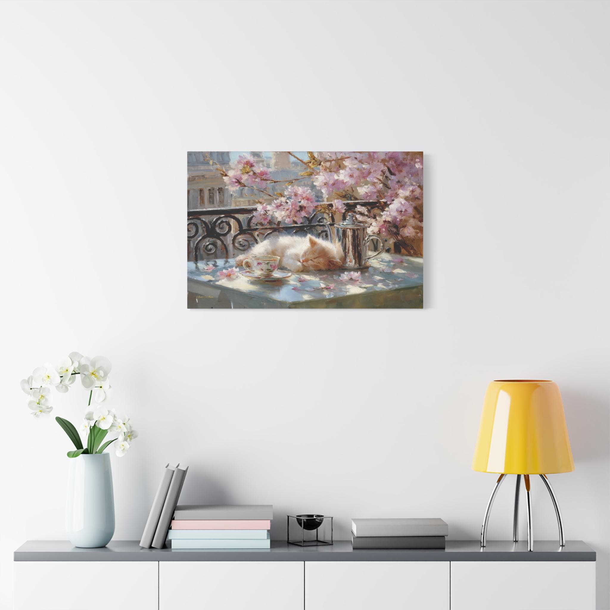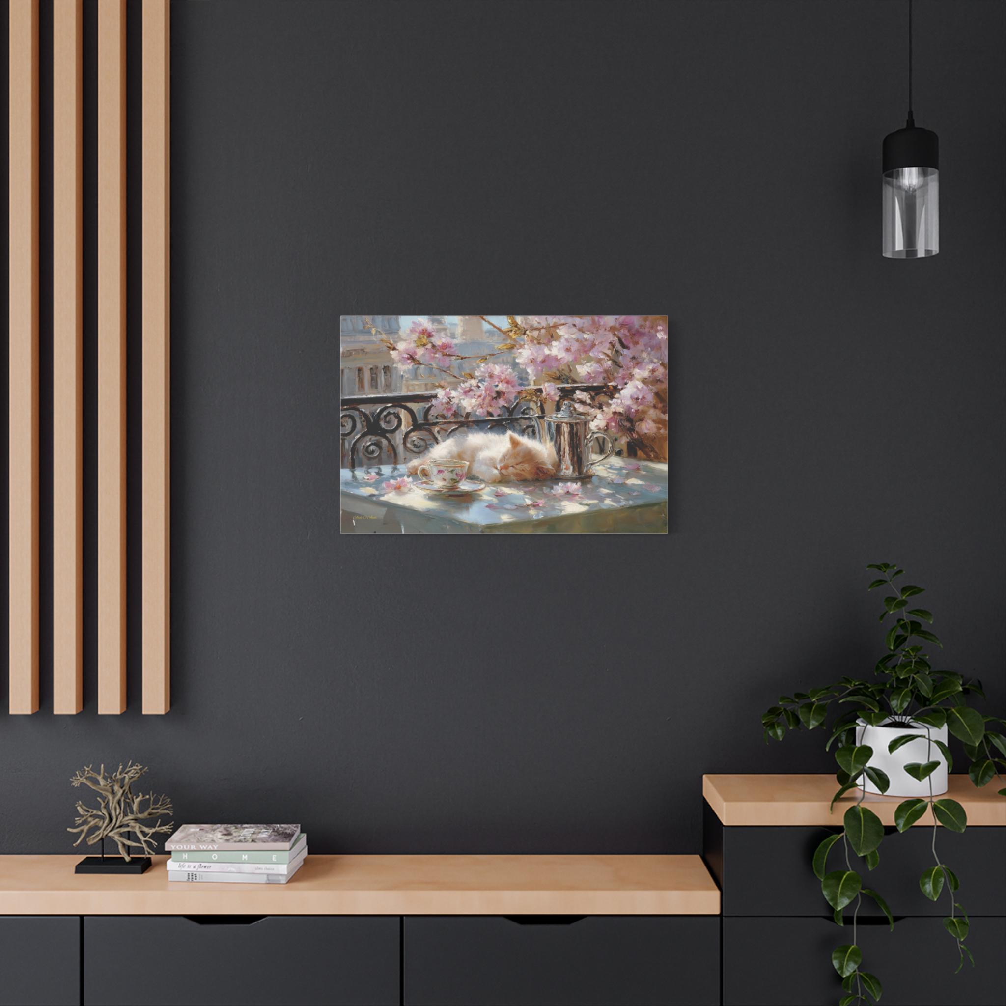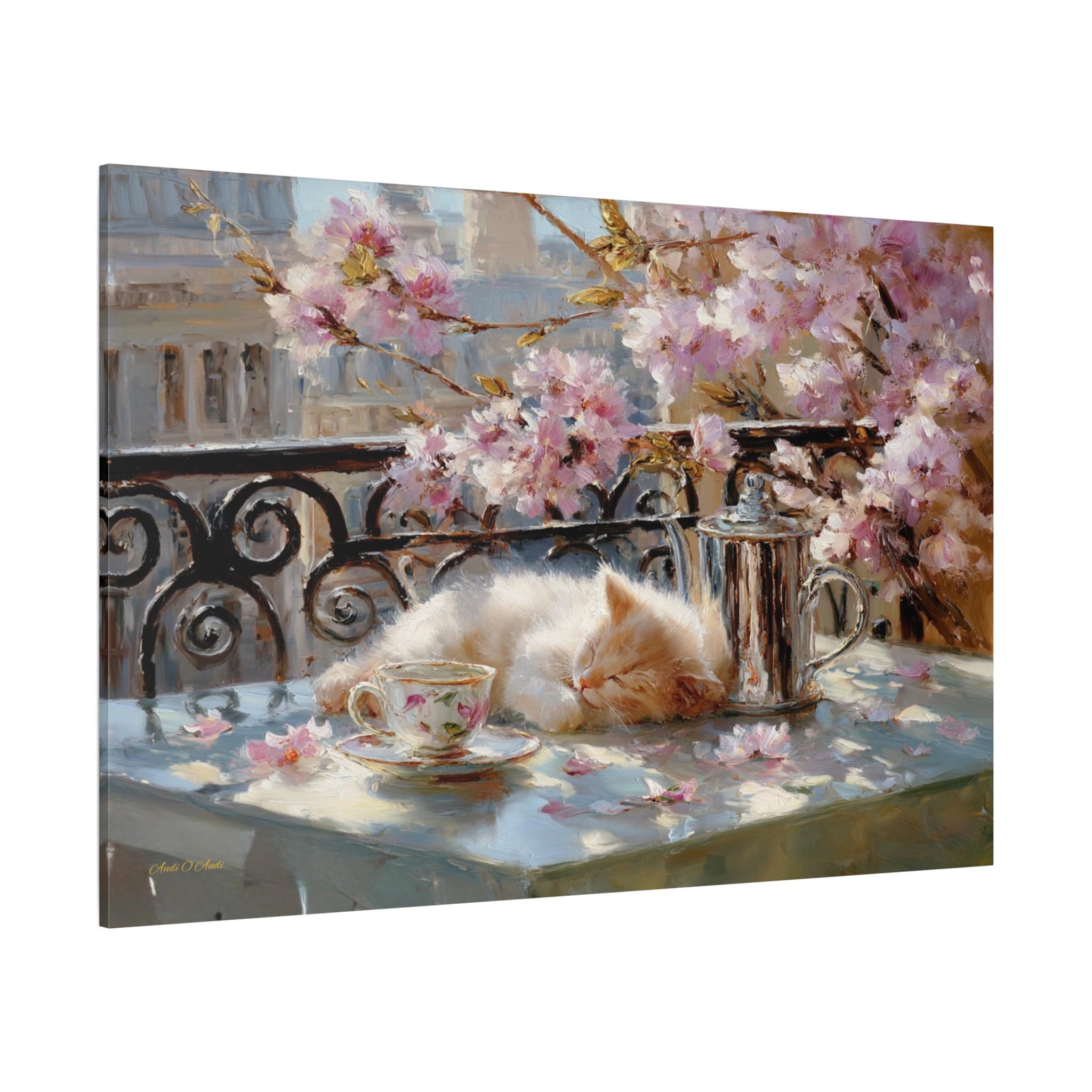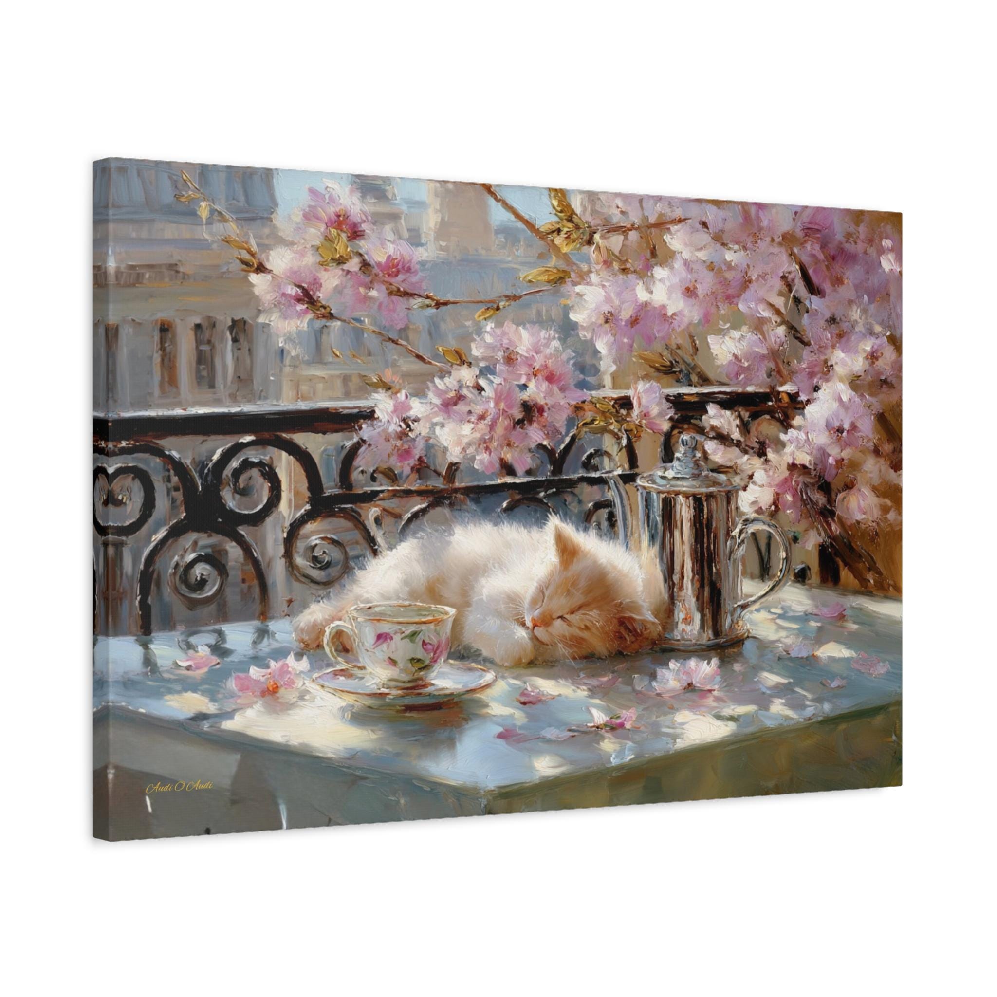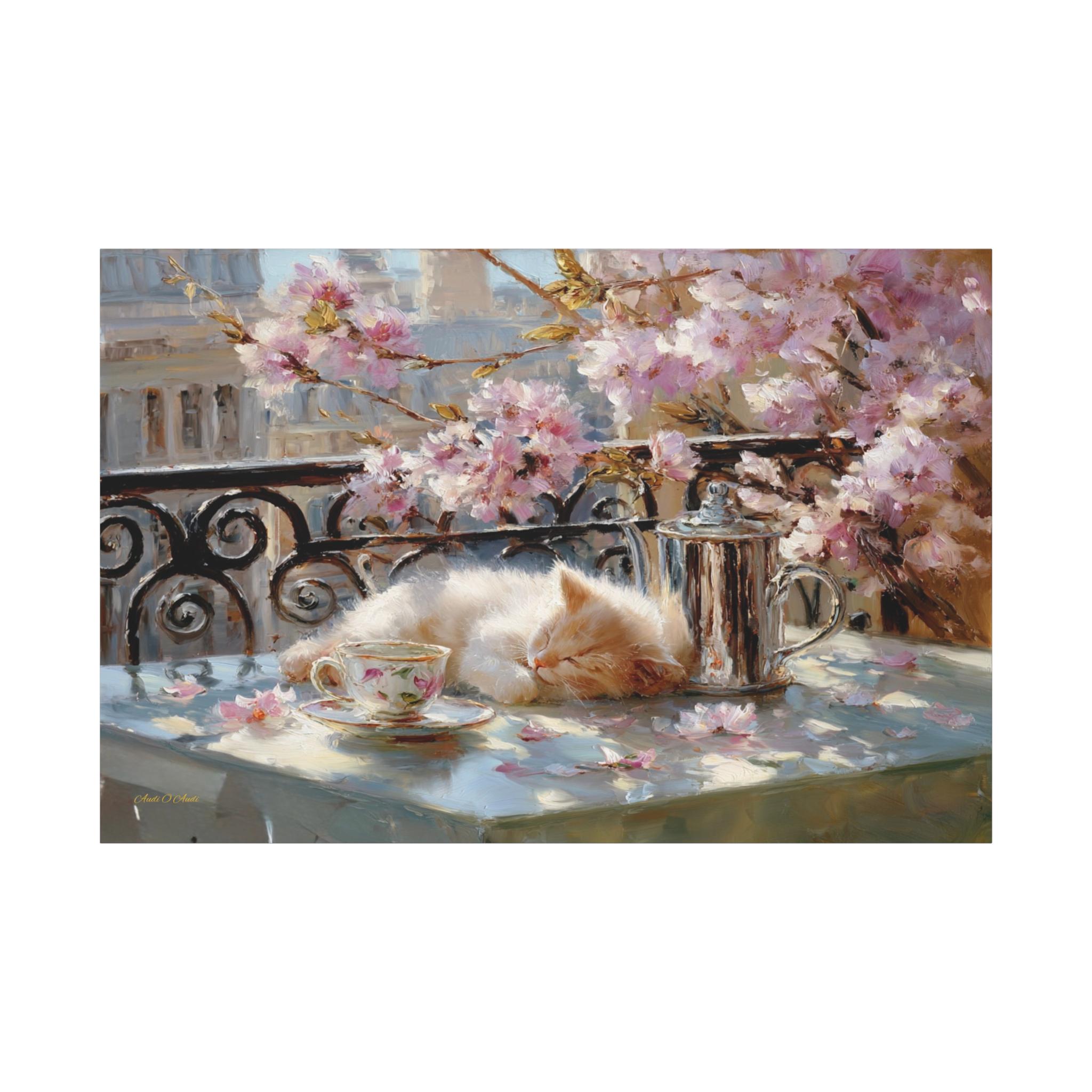 Bring the idyllic charm, peaceful warmth, and whimsical beauty of a European spring morning into your home with this stunning sleeping kitten canvas print. This captivating horizontal artwork features a fluffy, sun-drenched kitten taking a peaceful nap on a balcony table beside a delicate floral teacup and a classic silver teapot. The scene is perfectly framed by a classic wrought-iron railing and breathtaking pink spring blossoms, with soft petals scattered across the table.