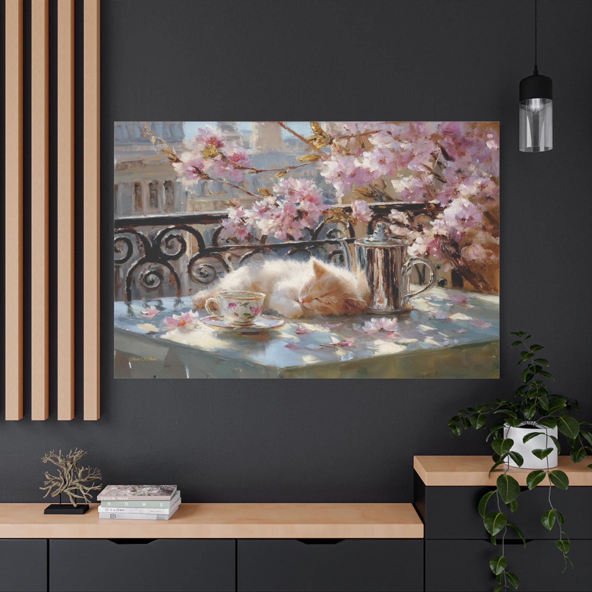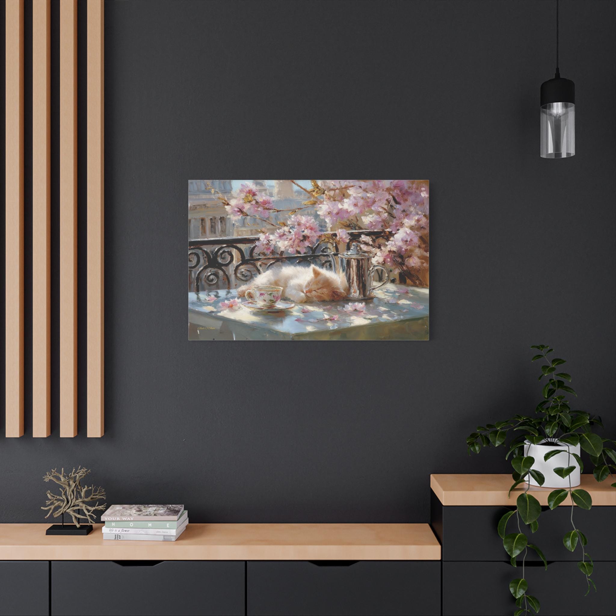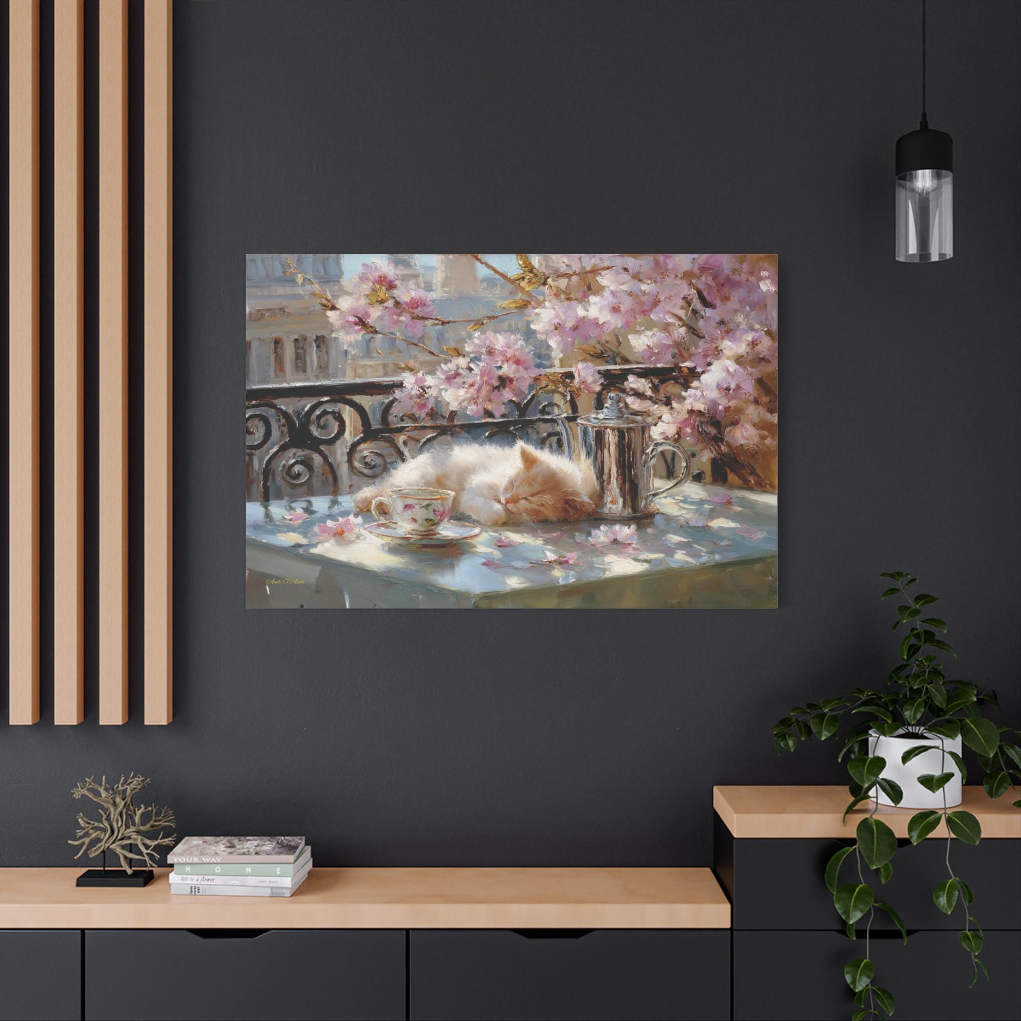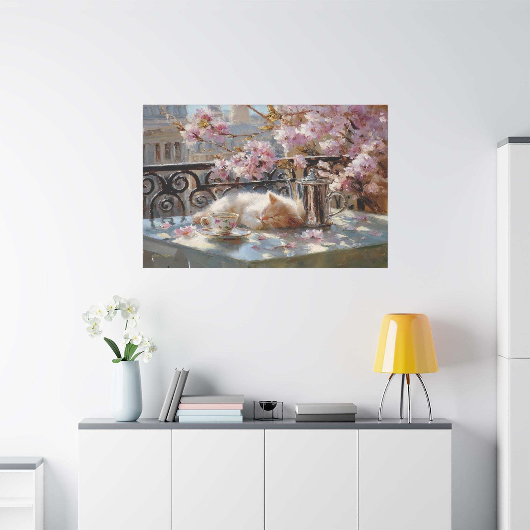 Bring the idyllic charm, peaceful warmth, and whimsical beauty of a European spring morning into your home with this stunning sleeping kitten canvas print. This captivating horizontal artwork features a fluffy, sun-drenched kitten taking a peaceful nap on a balcony table beside a delicate floral teacup and a classic silver teapot. The scene is perfectly framed by a classic wrought-iron railing and breathtaking pink spring blossoms, with soft petals scattered across the table.