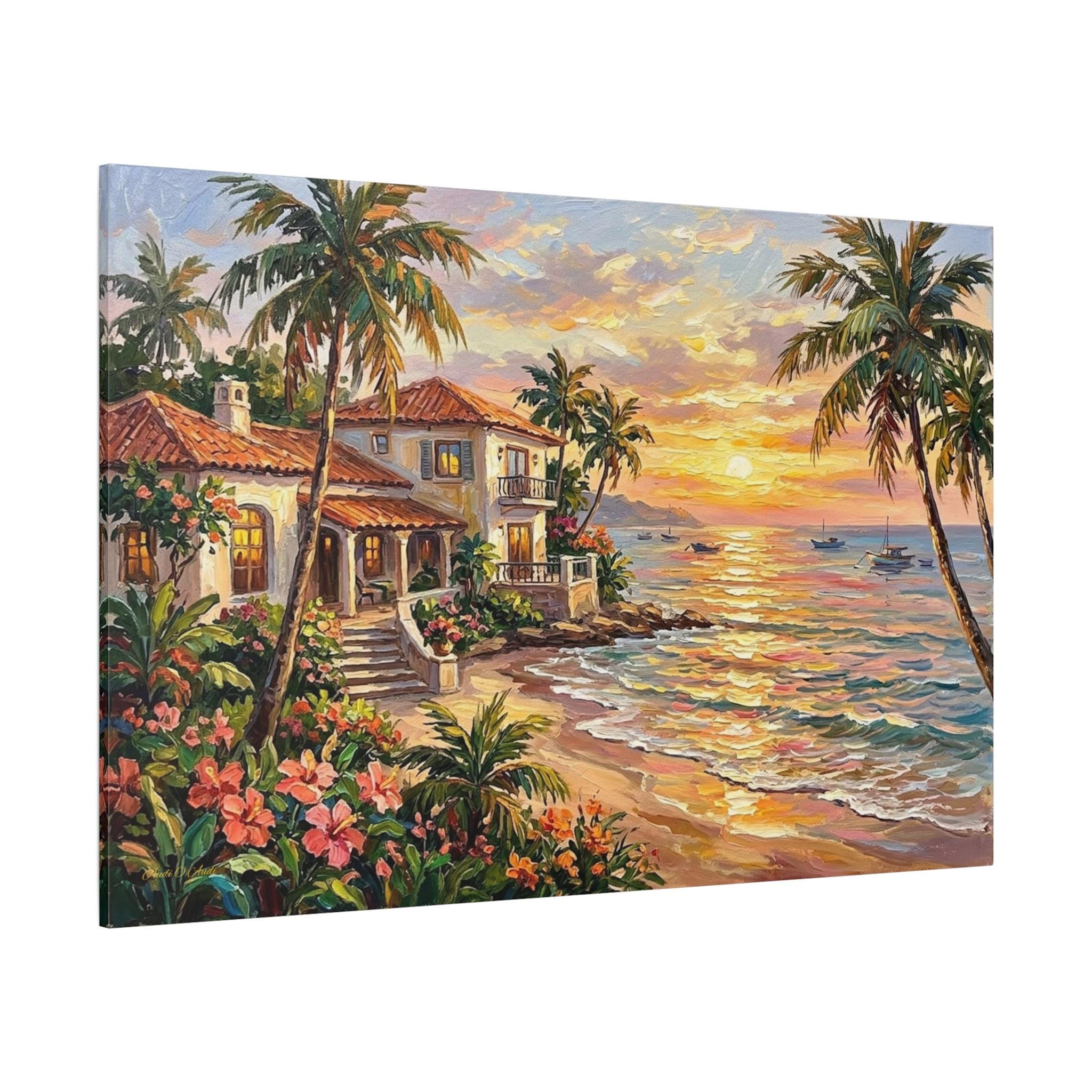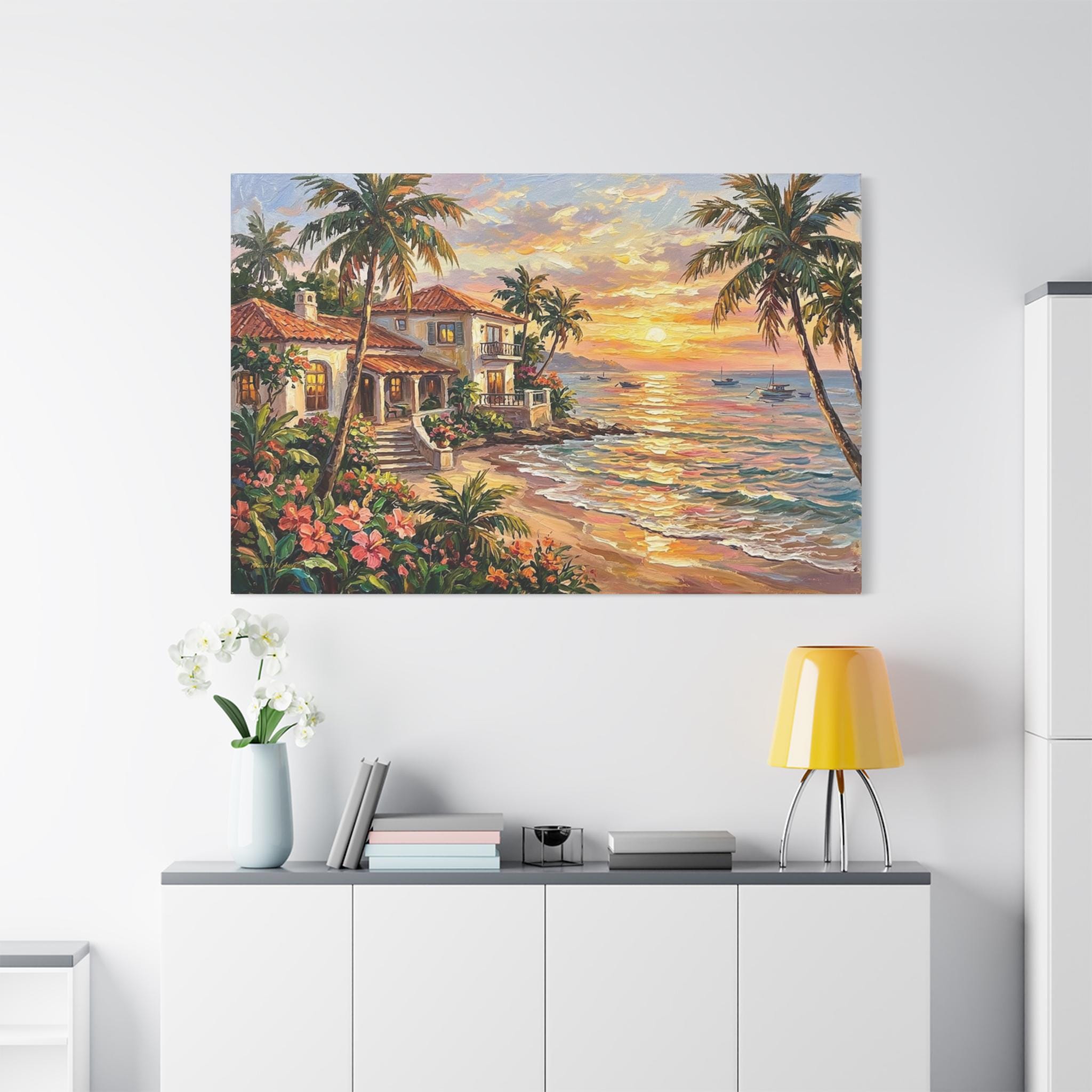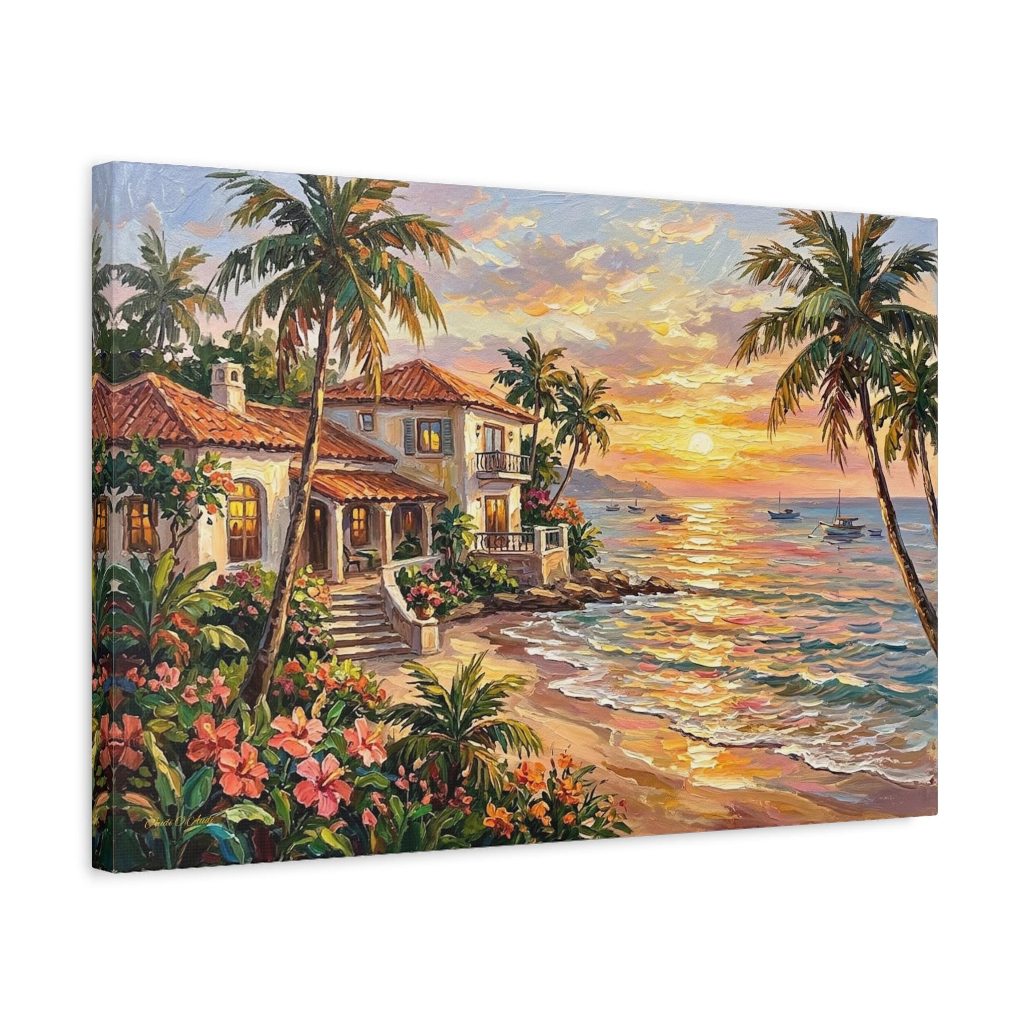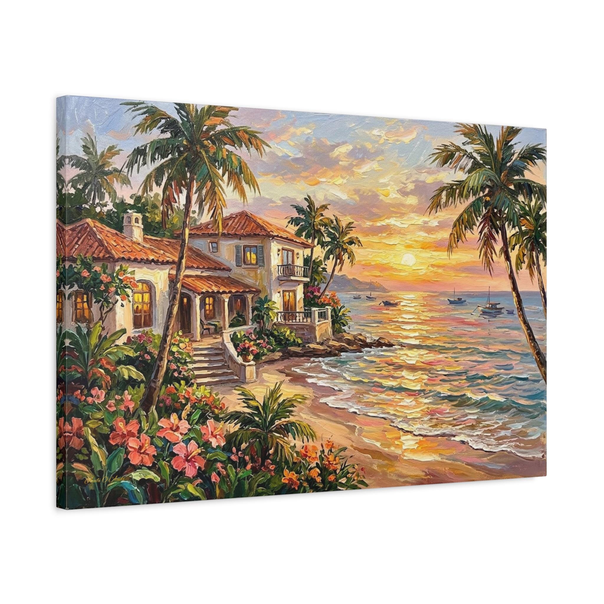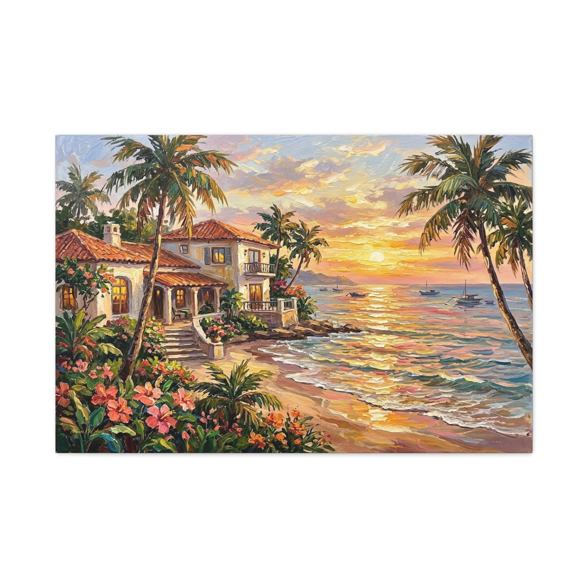 Bring the luxurious warmth, breathtaking romance, and peaceful serenity of a tropical island getaway into your home with this stunning coastal sunset canvas print. This captivating horizontal artwork features a beautiful Mediterranean-style beach house with glowing windows and a terracotta roof, nestled along a pristine shoreline. The scene is framed by towering palm trees and lush pink tropical flowers, while a brilliant golden sunset reflects perfectly across the gentle ocean waves, illuminating distant sailboats.