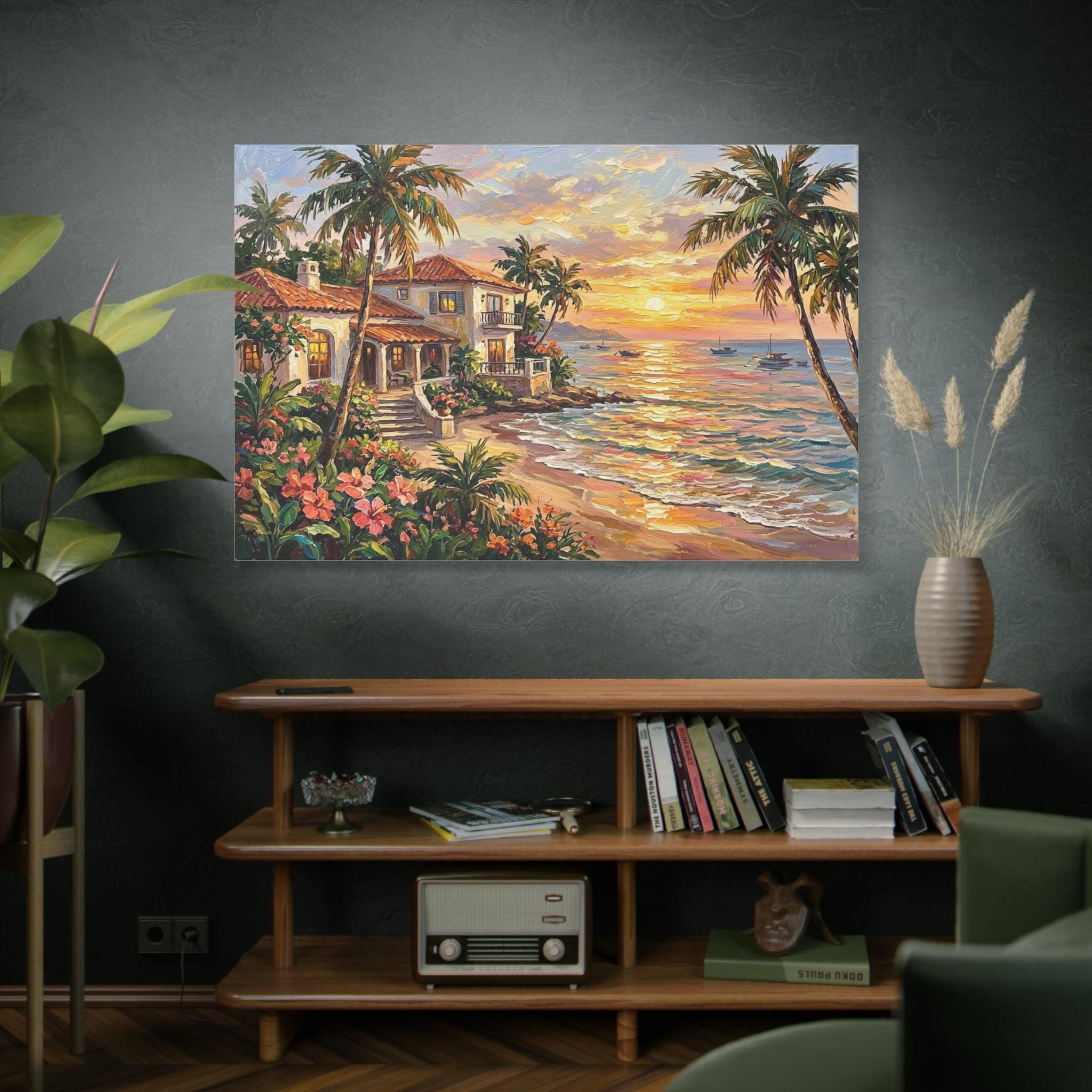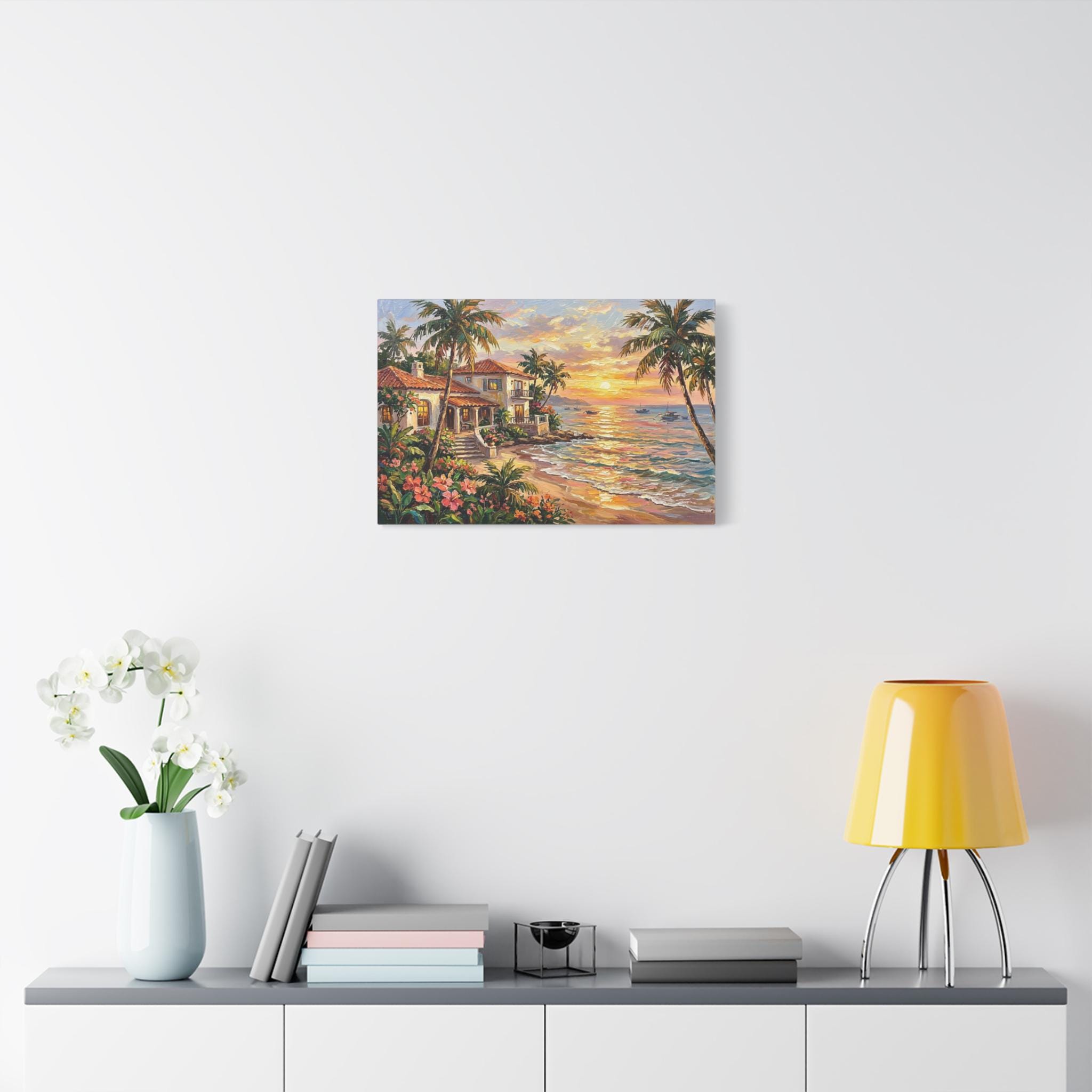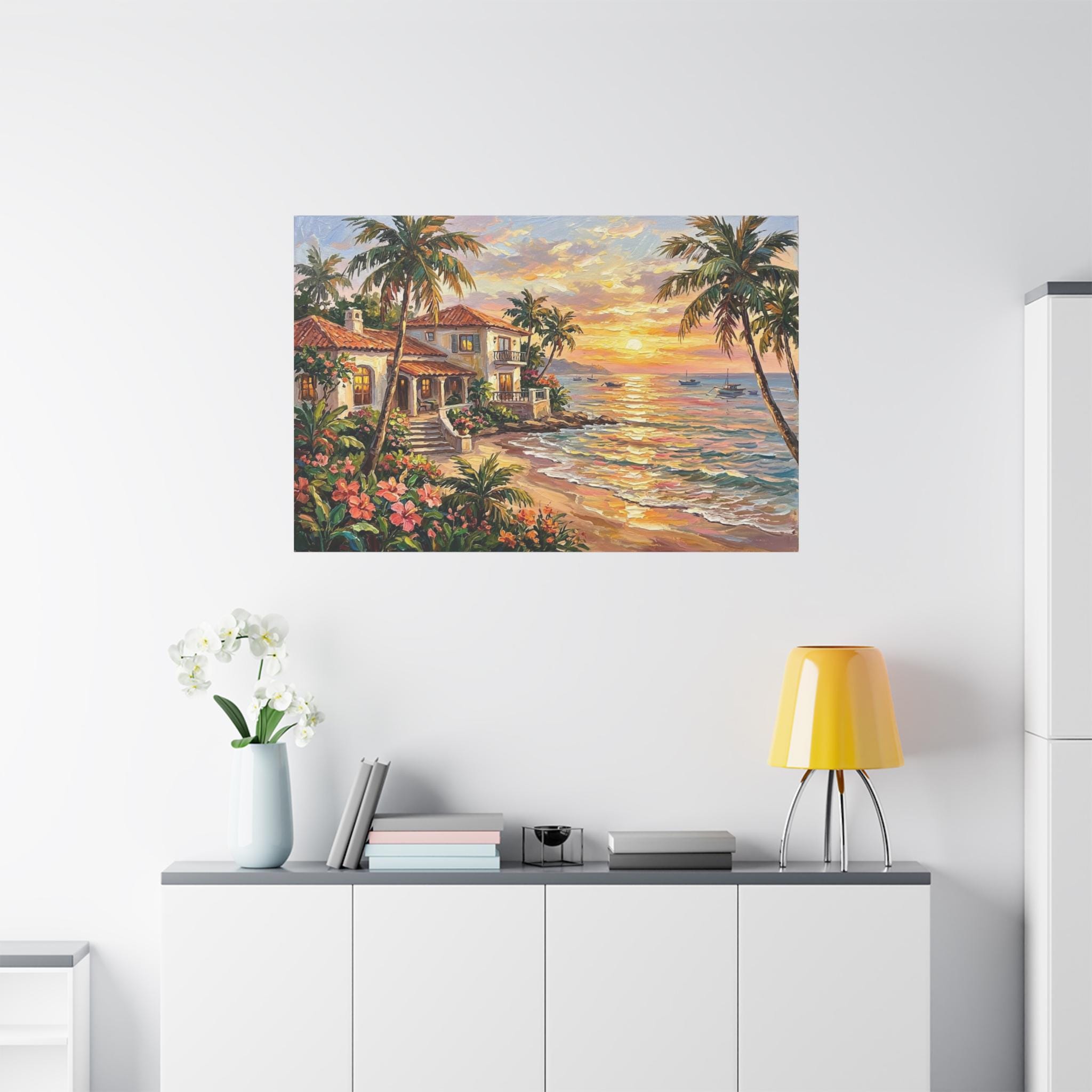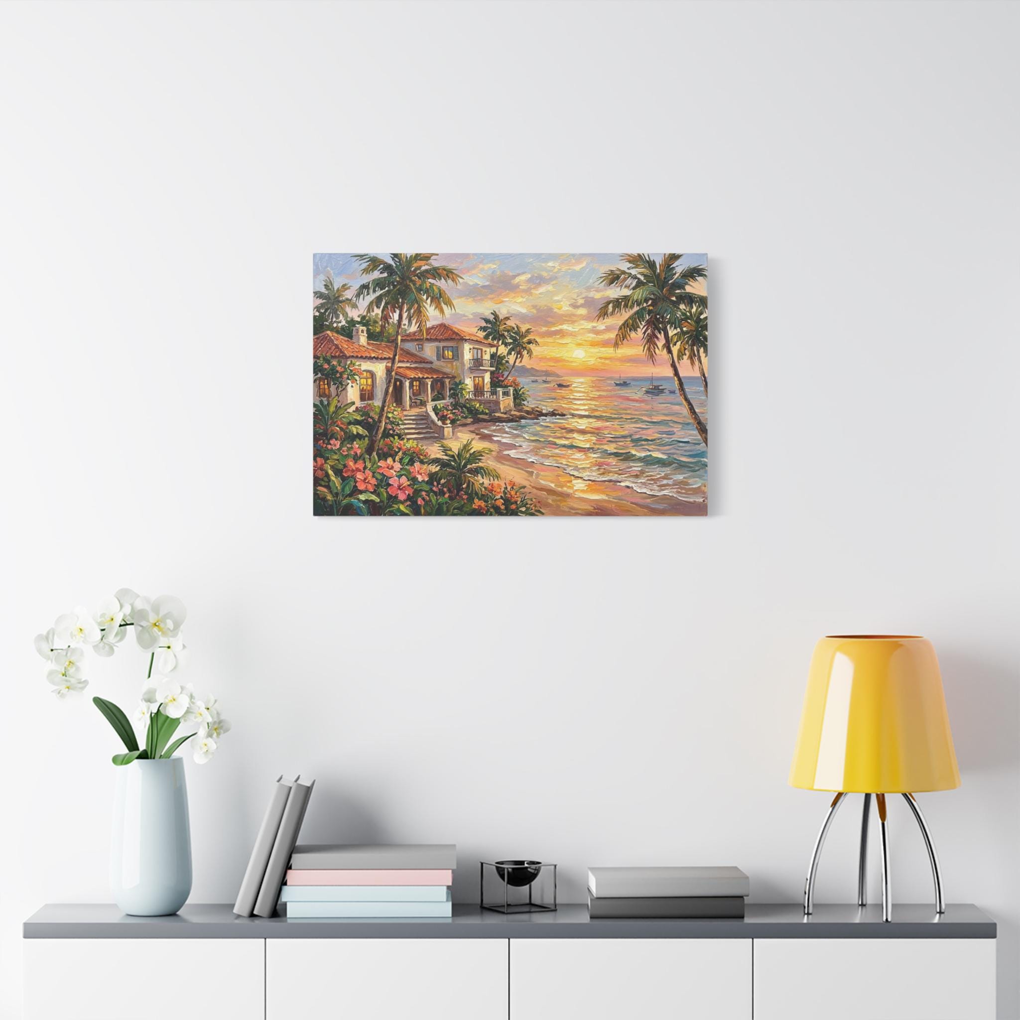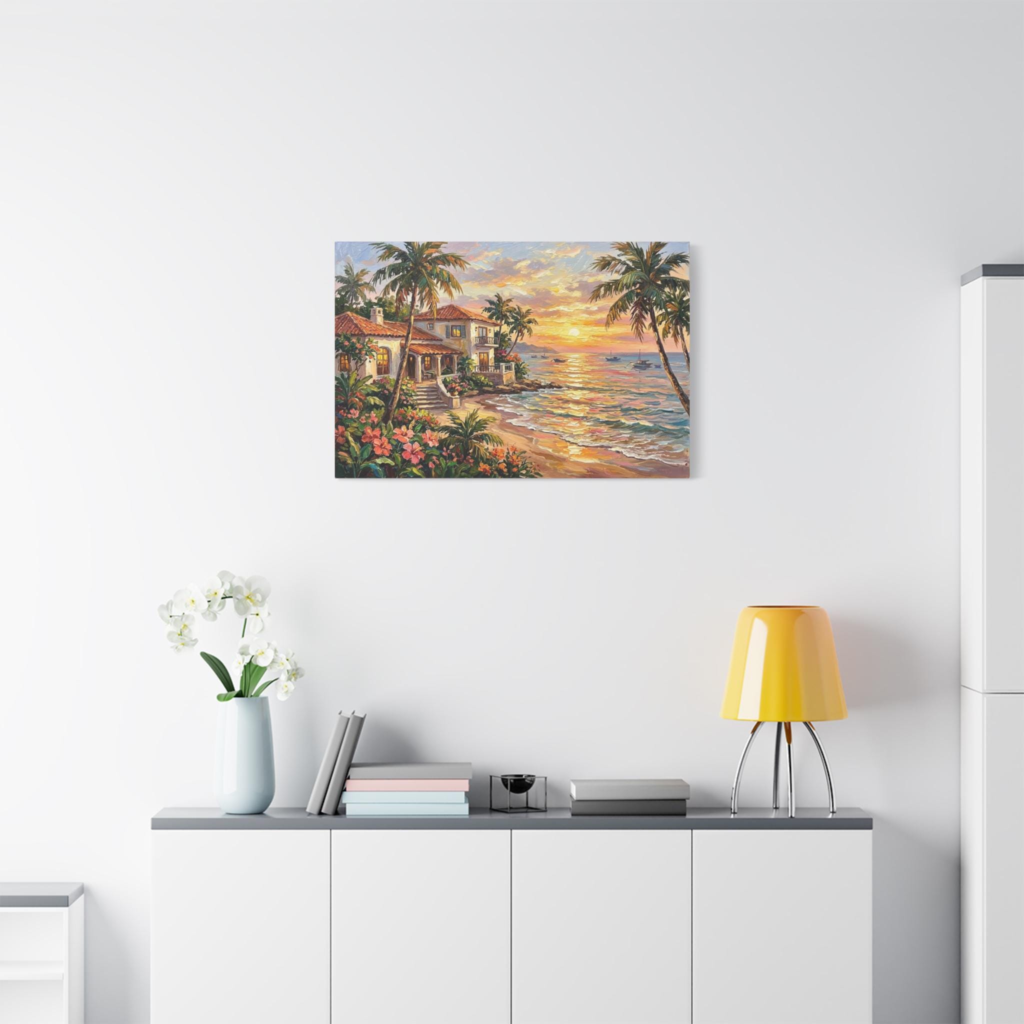 Bring the luxurious warmth, breathtaking romance, and peaceful serenity of a tropical island getaway into your home with this stunning coastal sunset canvas print. This captivating horizontal artwork features a beautiful Mediterranean-style beach house with glowing windows and a terracotta roof, nestled along a pristine shoreline. The scene is framed by towering palm trees and lush pink tropical flowers, while a brilliant golden sunset reflects perfectly across the gentle ocean waves, illuminating distant sailboats.