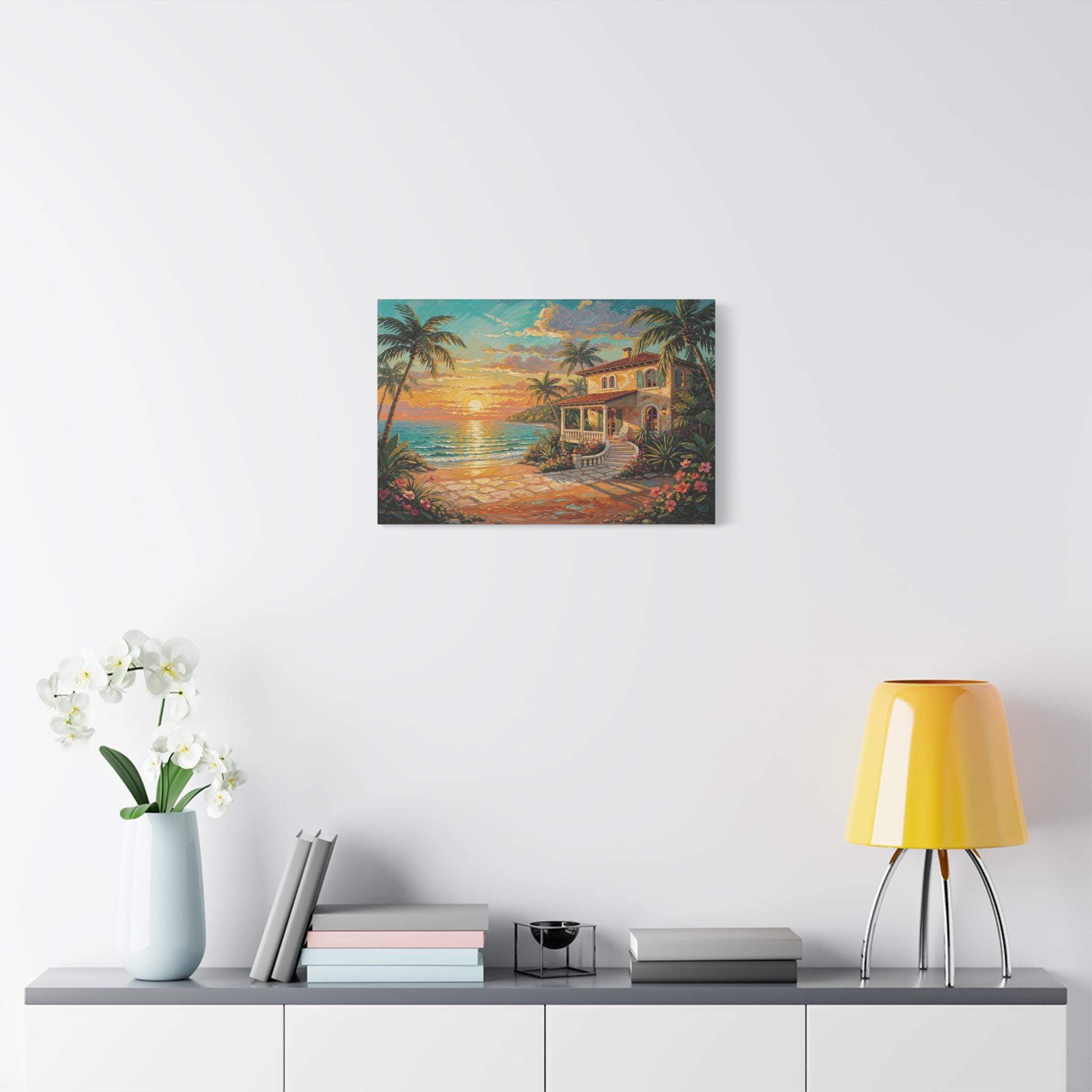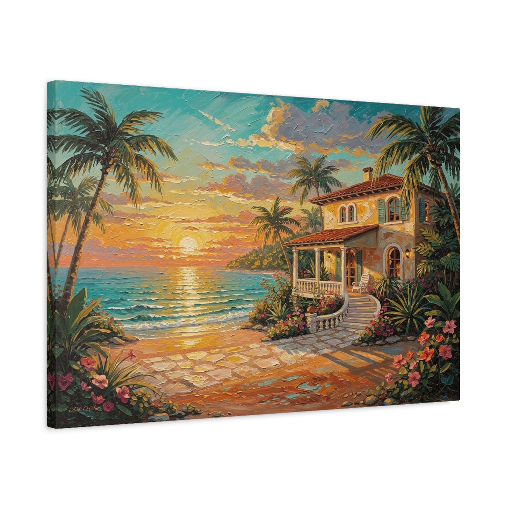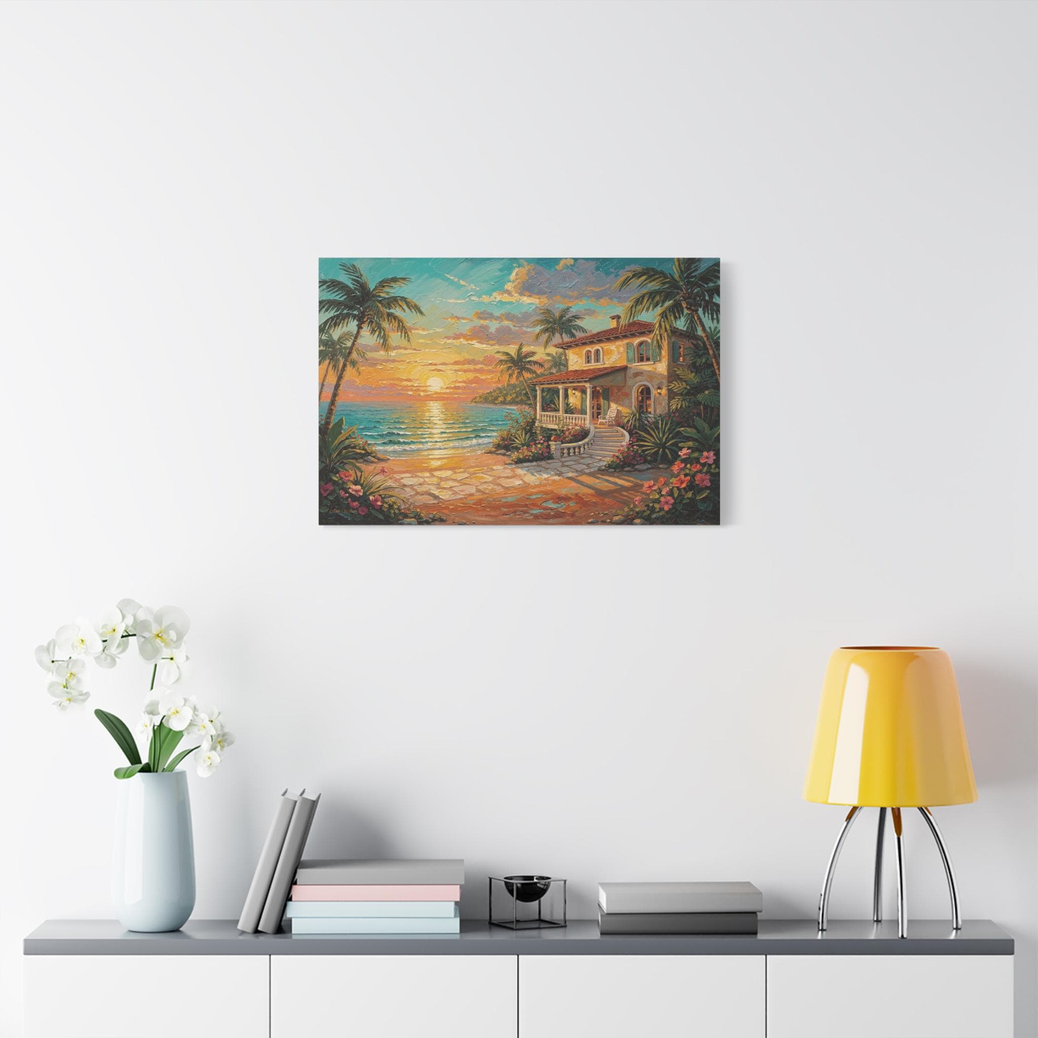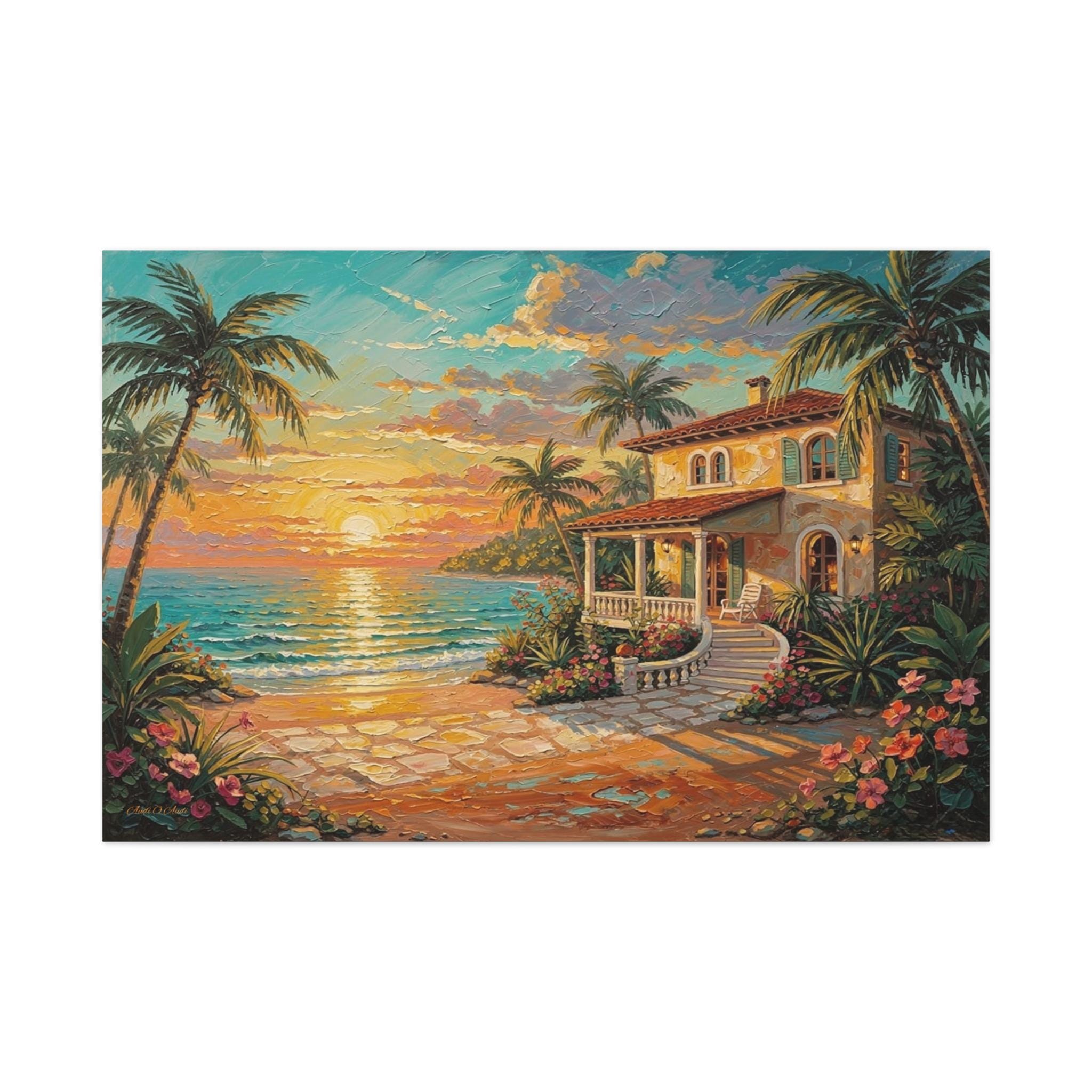 Bring the luxurious warmth, breathtaking romance, and peaceful serenity of an island getaway into your home with this stunning coastal sunset canvas print. This captivating horizontal artwork features a charming Mediterranean-style beach house nestled along a pristine shoreline. An inviting stone pathway leads past vibrant tropical flowers and towering palm trees toward the crisp, turquoise ocean, all illuminated by a brilliant, glowing golden sunset.