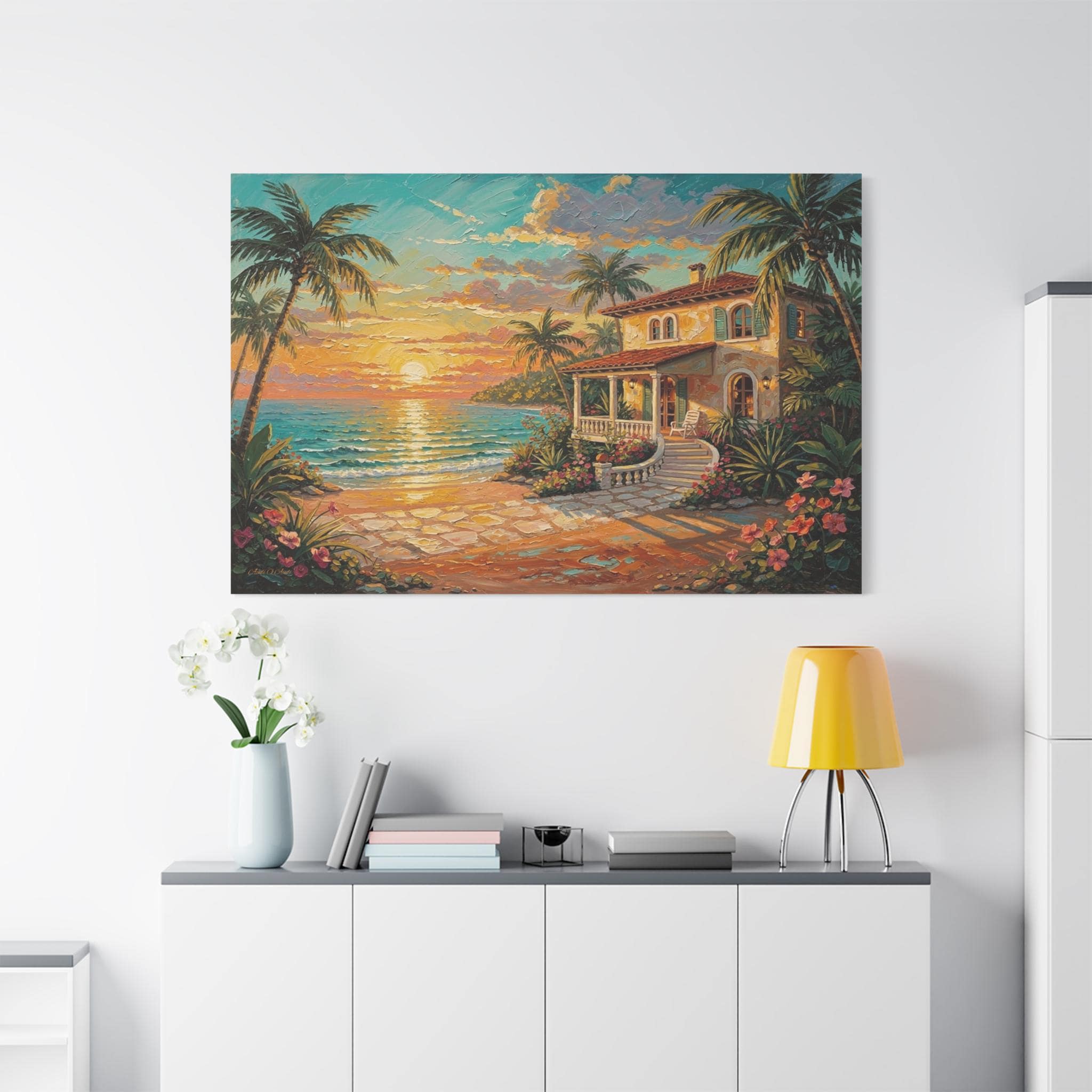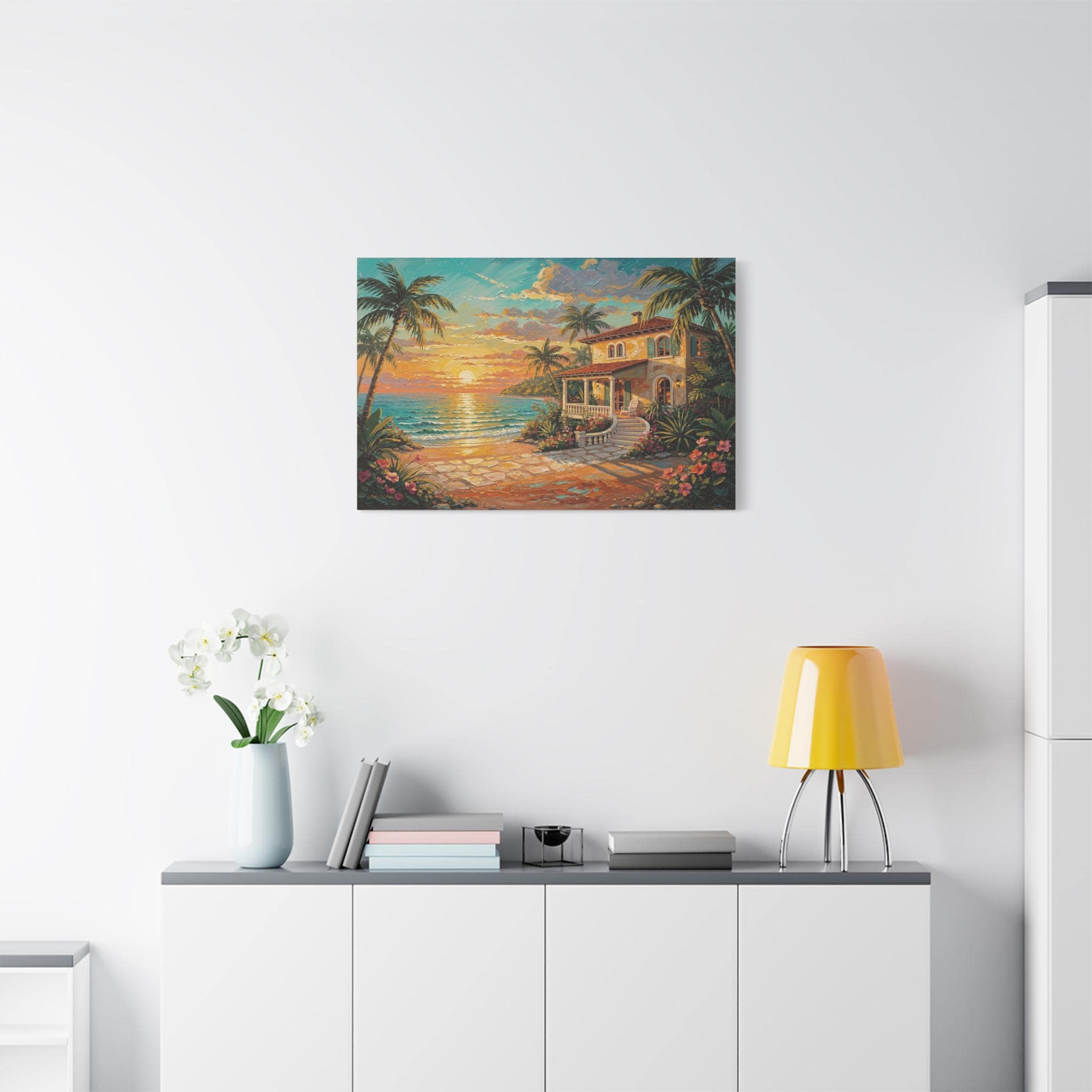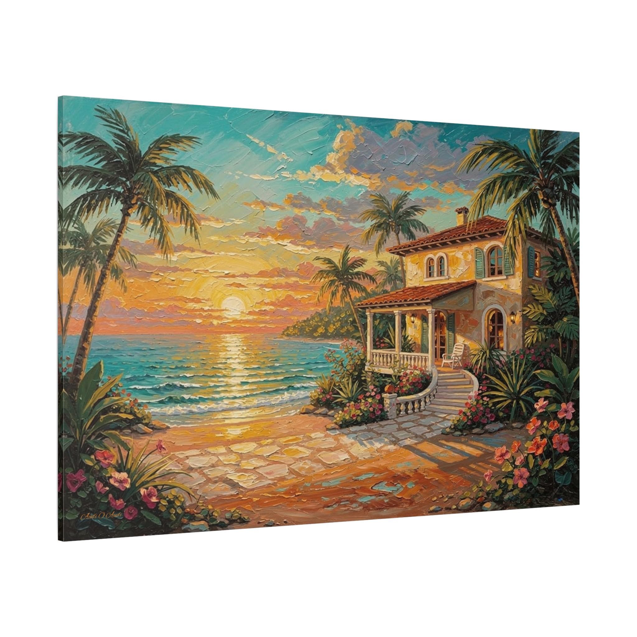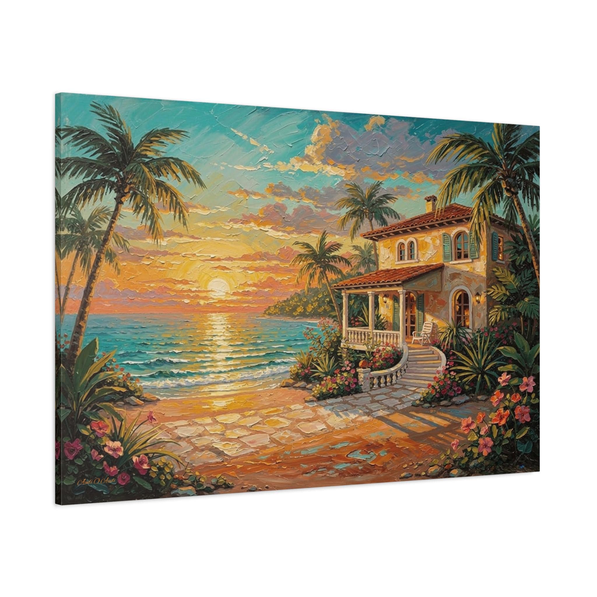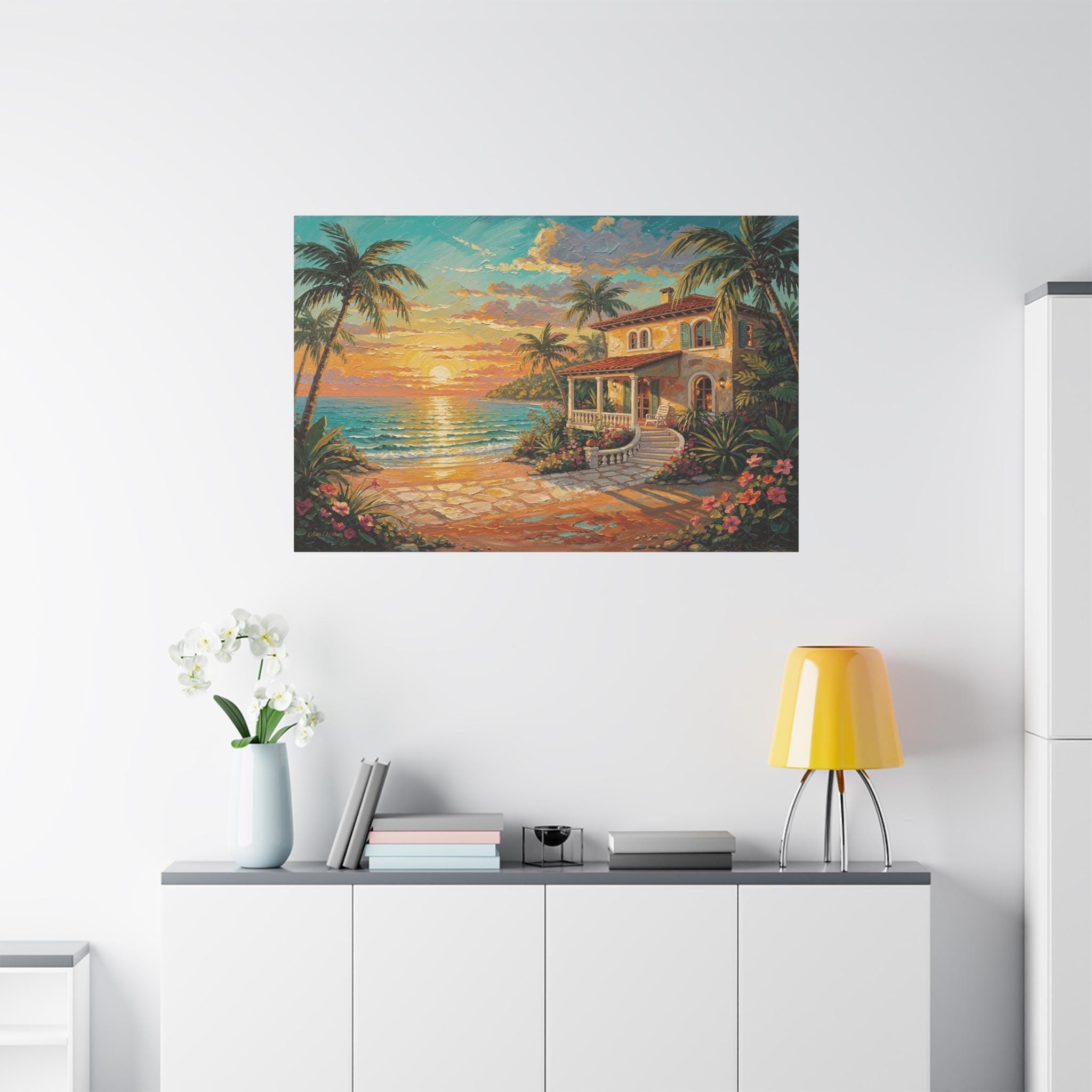 Bring the luxurious warmth, breathtaking romance, and peaceful serenity of an island getaway into your home with this stunning coastal sunset canvas print. This captivating horizontal artwork features a charming Mediterranean-style beach house nestled along a pristine shoreline. An inviting stone pathway leads past vibrant tropical flowers and towering palm trees toward the crisp, turquoise ocean, all illuminated by a brilliant, glowing golden sunset.