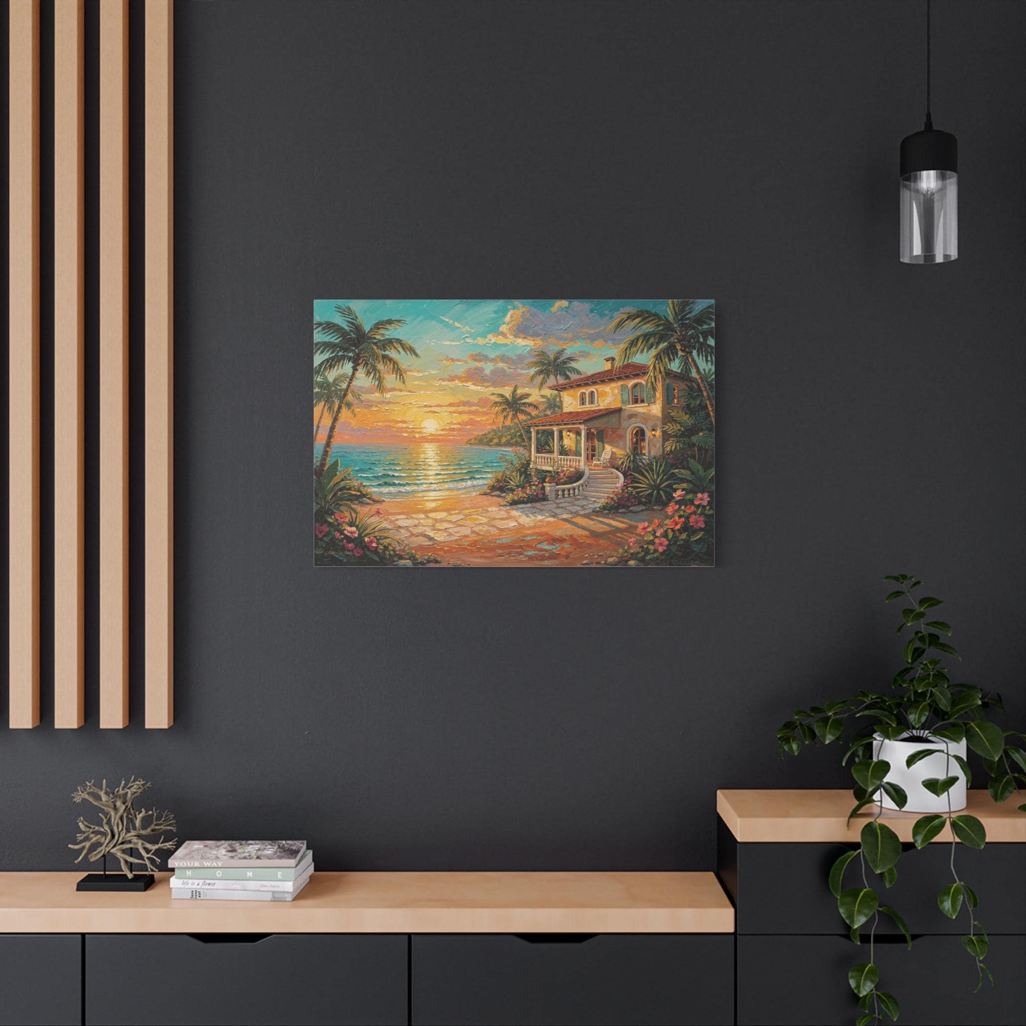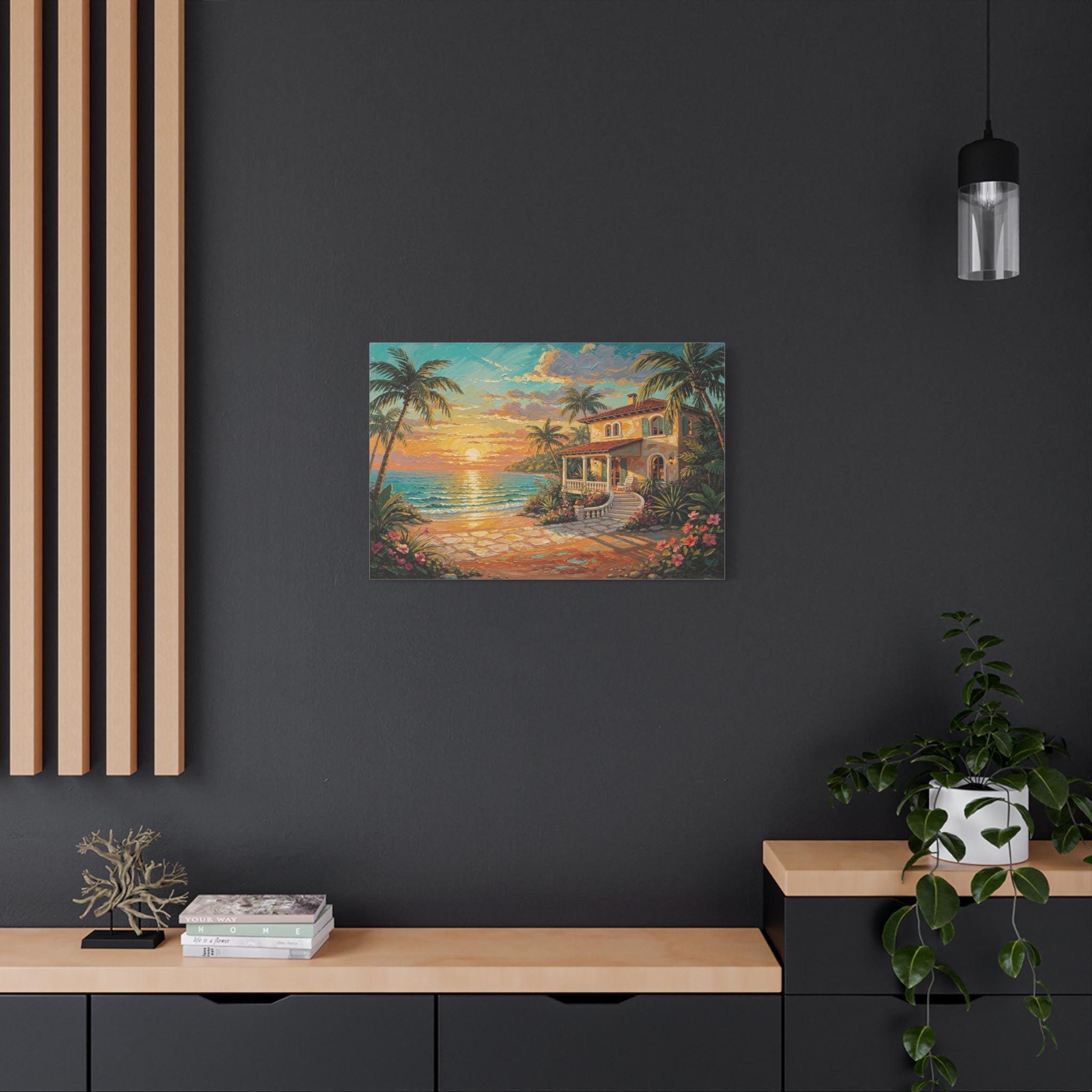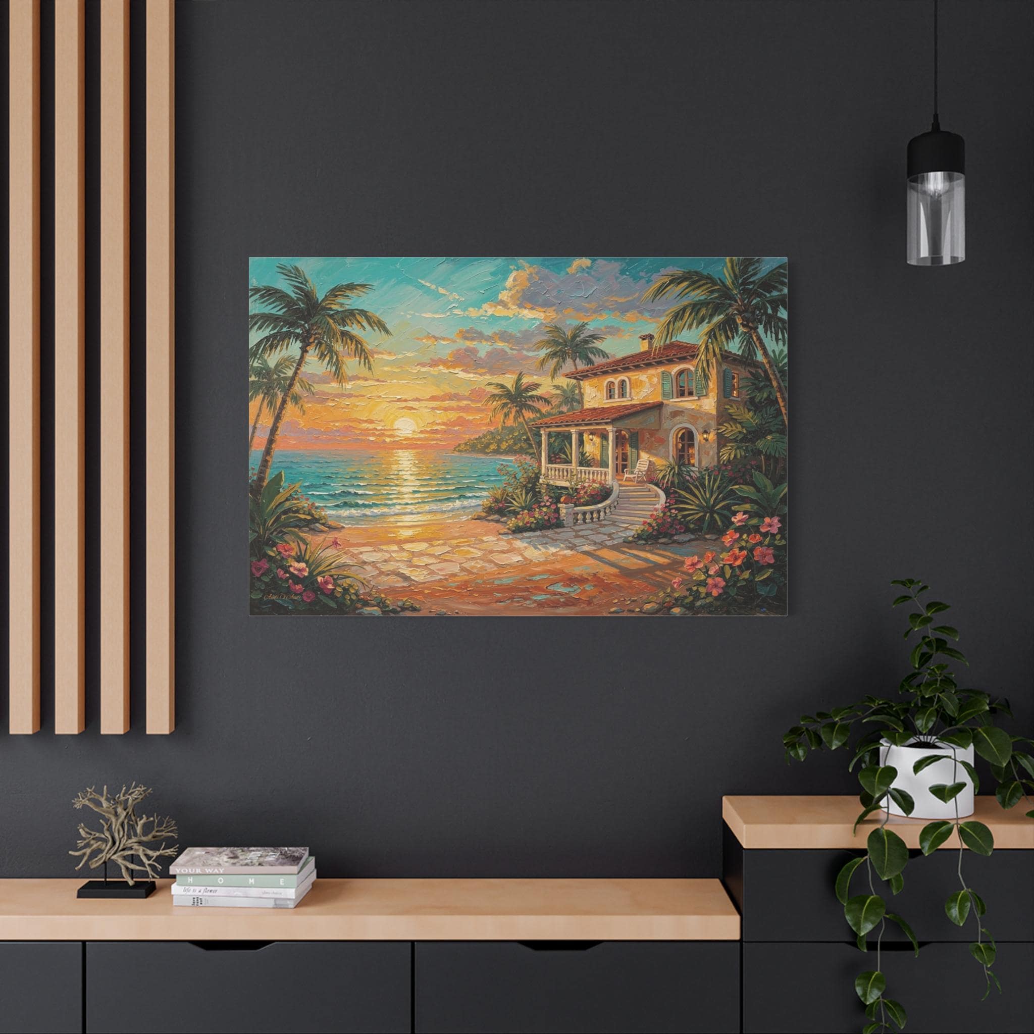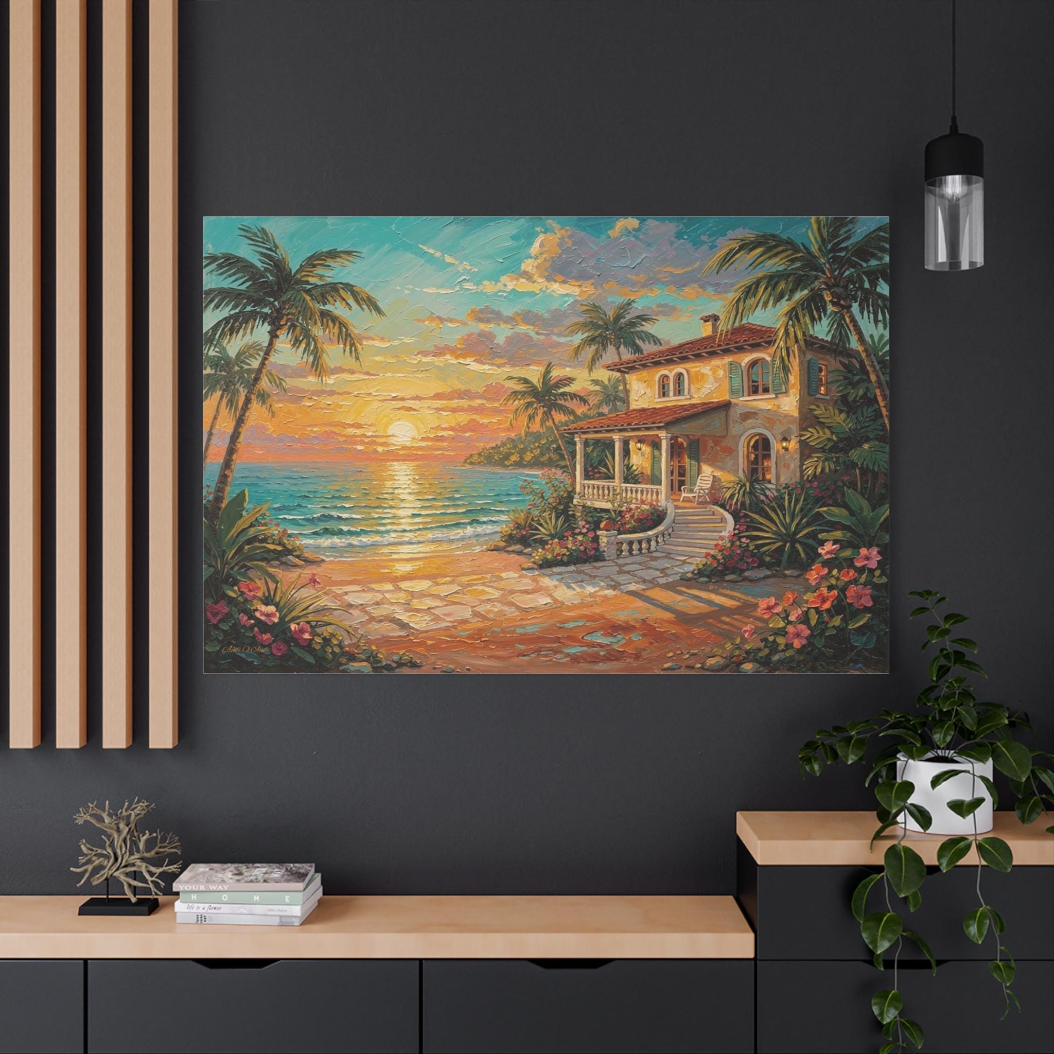 Bring the luxurious warmth, breathtaking romance, and peaceful serenity of an island getaway into your home with this stunning coastal sunset canvas print. This captivating horizontal artwork features a charming Mediterranean-style beach house nestled along a pristine shoreline. An inviting stone pathway leads past vibrant tropical flowers and towering palm trees toward the crisp, turquoise ocean, all illuminated by a brilliant, glowing golden sunset.