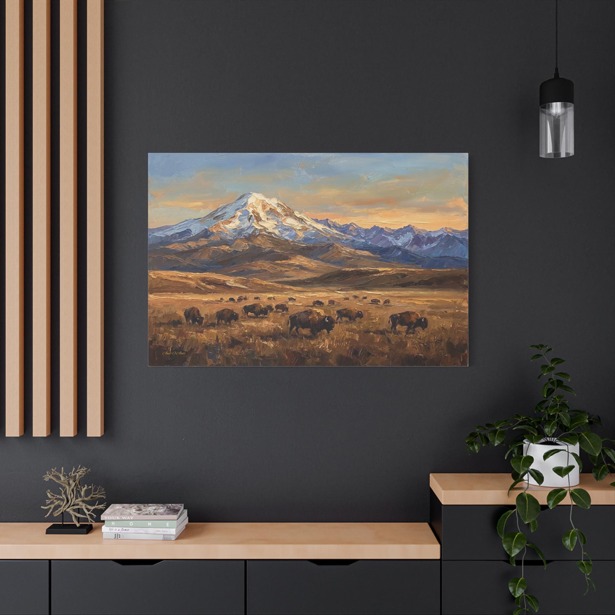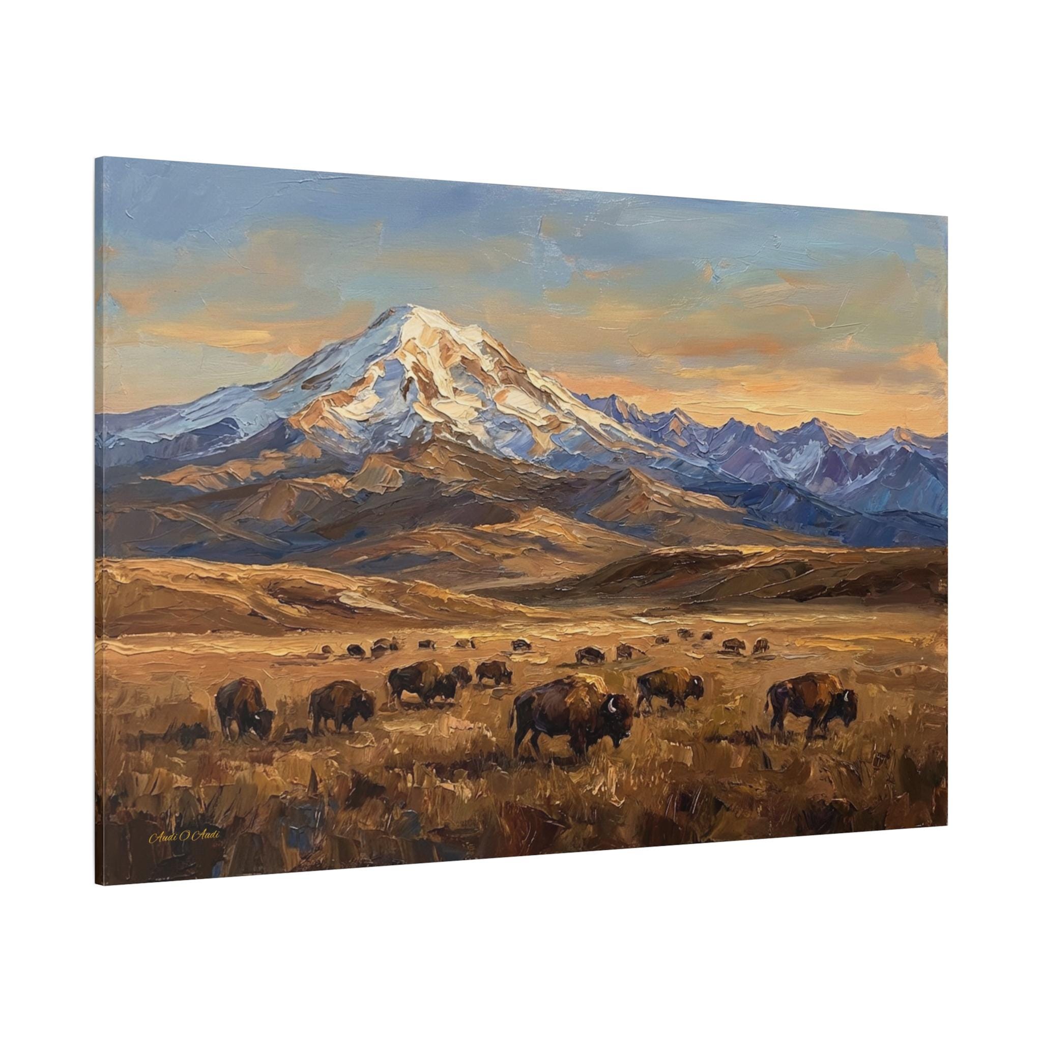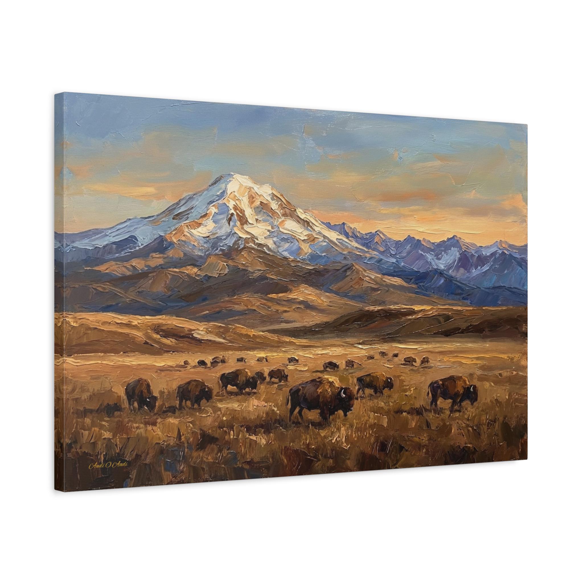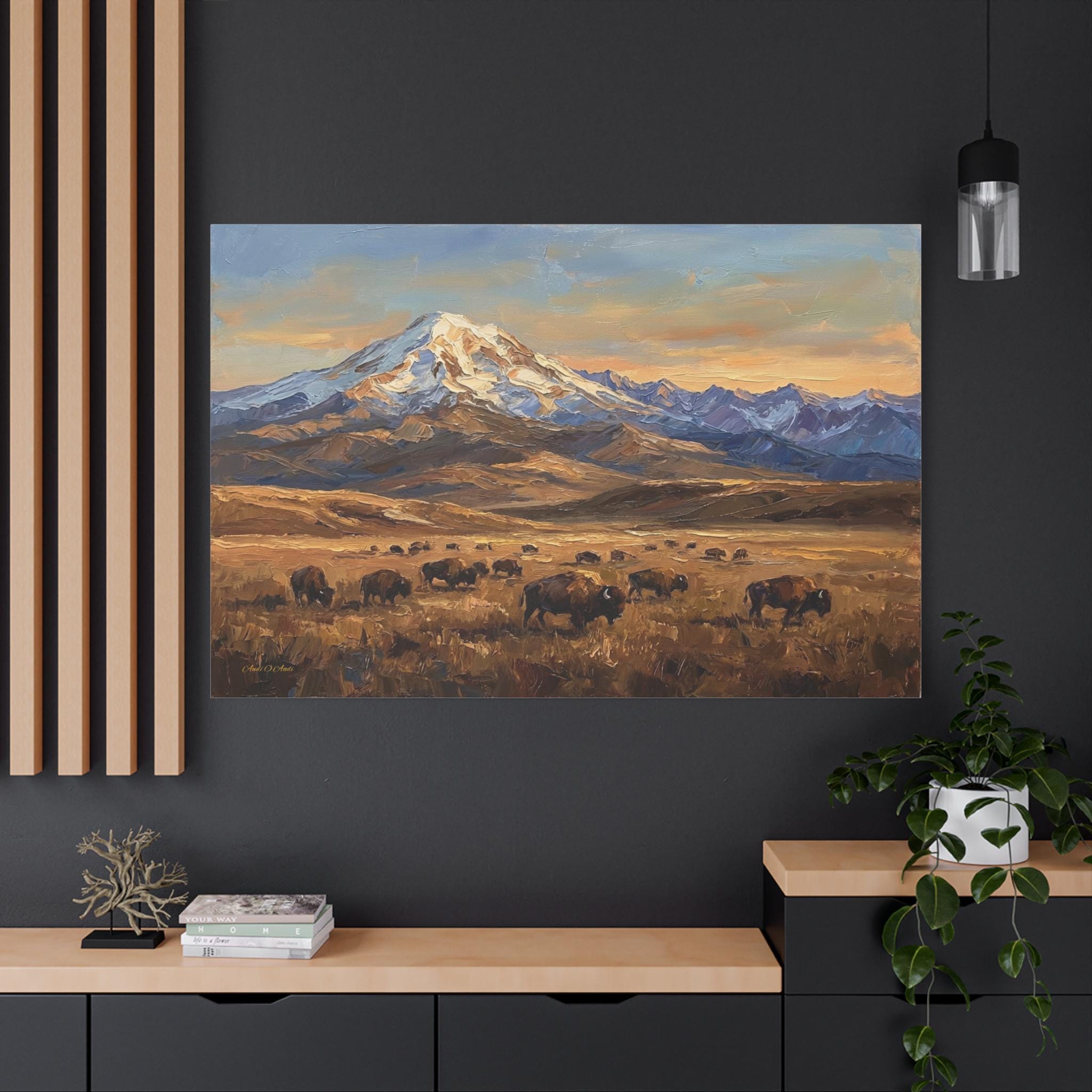Bring the awe-inspiring majesty, untamed freedom, and rugged beauty of the American West into your home with this stunning western landscape canvas print. This captivating horizontal artwork features a peaceful herd of American buffalo grazing across a vast, golden prairie. In the distance, a towering, majestic snow-capped mountain rises against a soft, pastel sunset sky, perfectly capturing the expansive beauty of the great frontier.