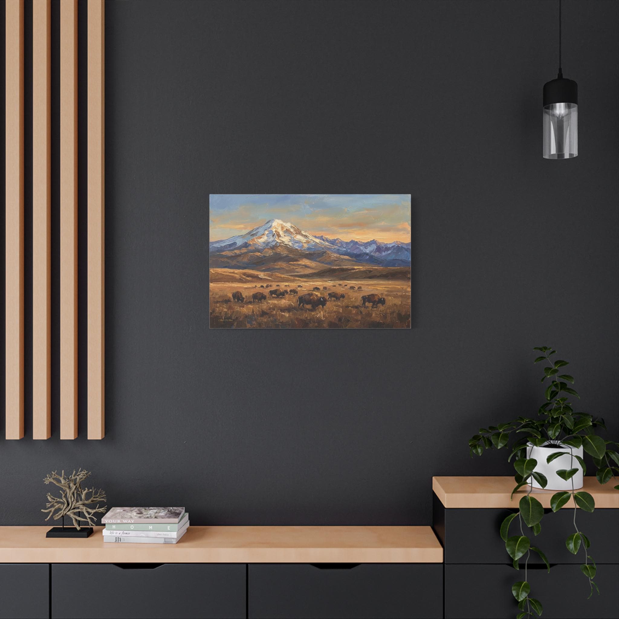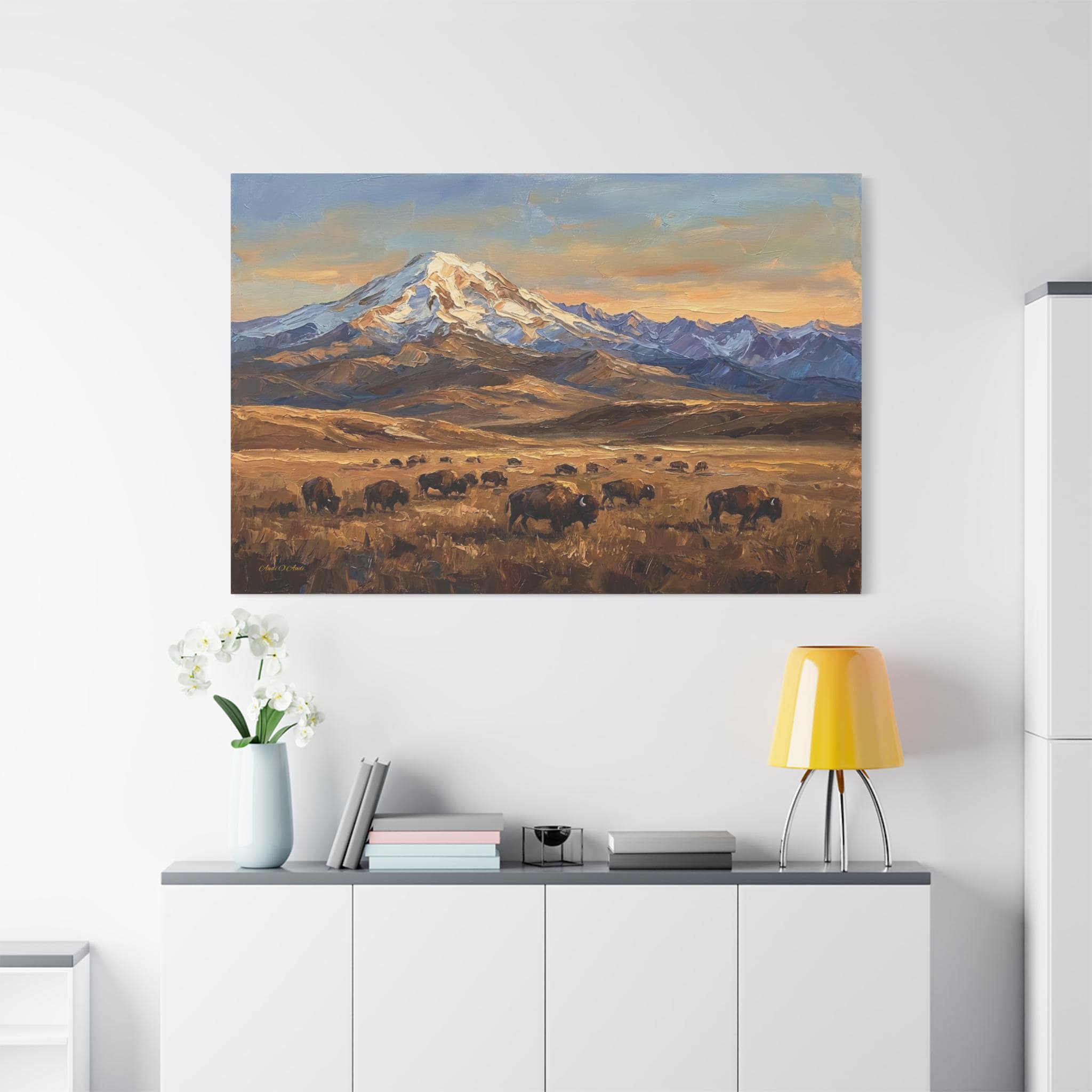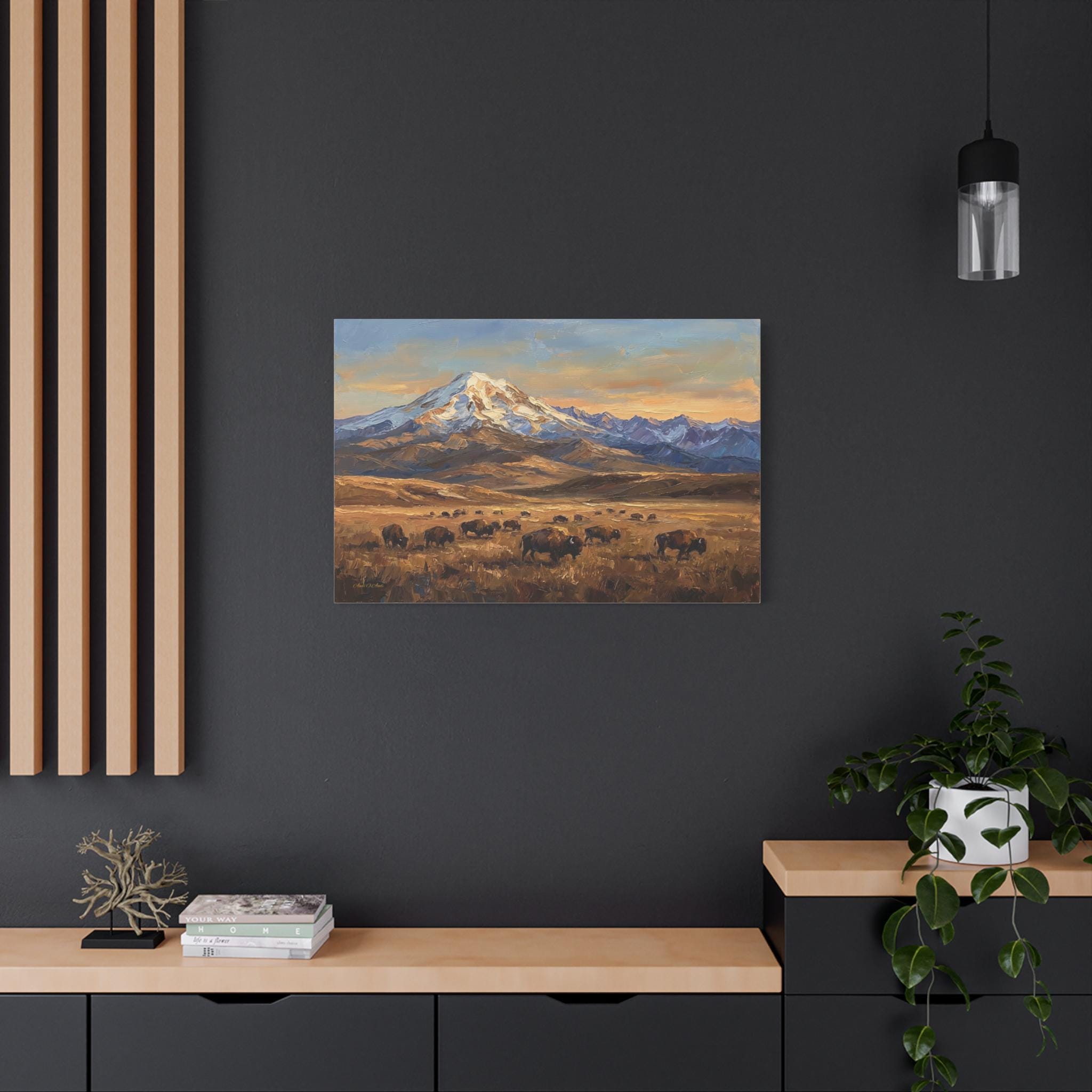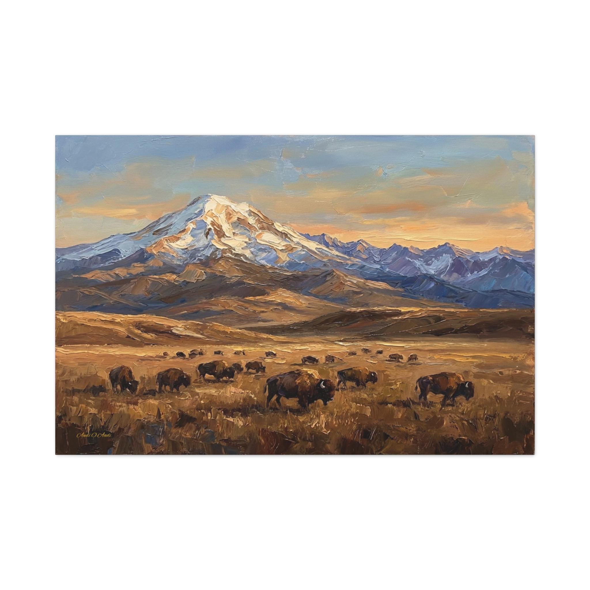 Bring the awe-inspiring majesty, untamed freedom, and rugged beauty of the American West into your home with this stunning western landscape canvas print. This captivating horizontal artwork features a peaceful herd of American buffalo grazing across a vast, golden prairie. In the distance, a towering, majestic snow-capped mountain rises against a soft, pastel sunset sky, perfectly capturing the expansive beauty of the great frontier.