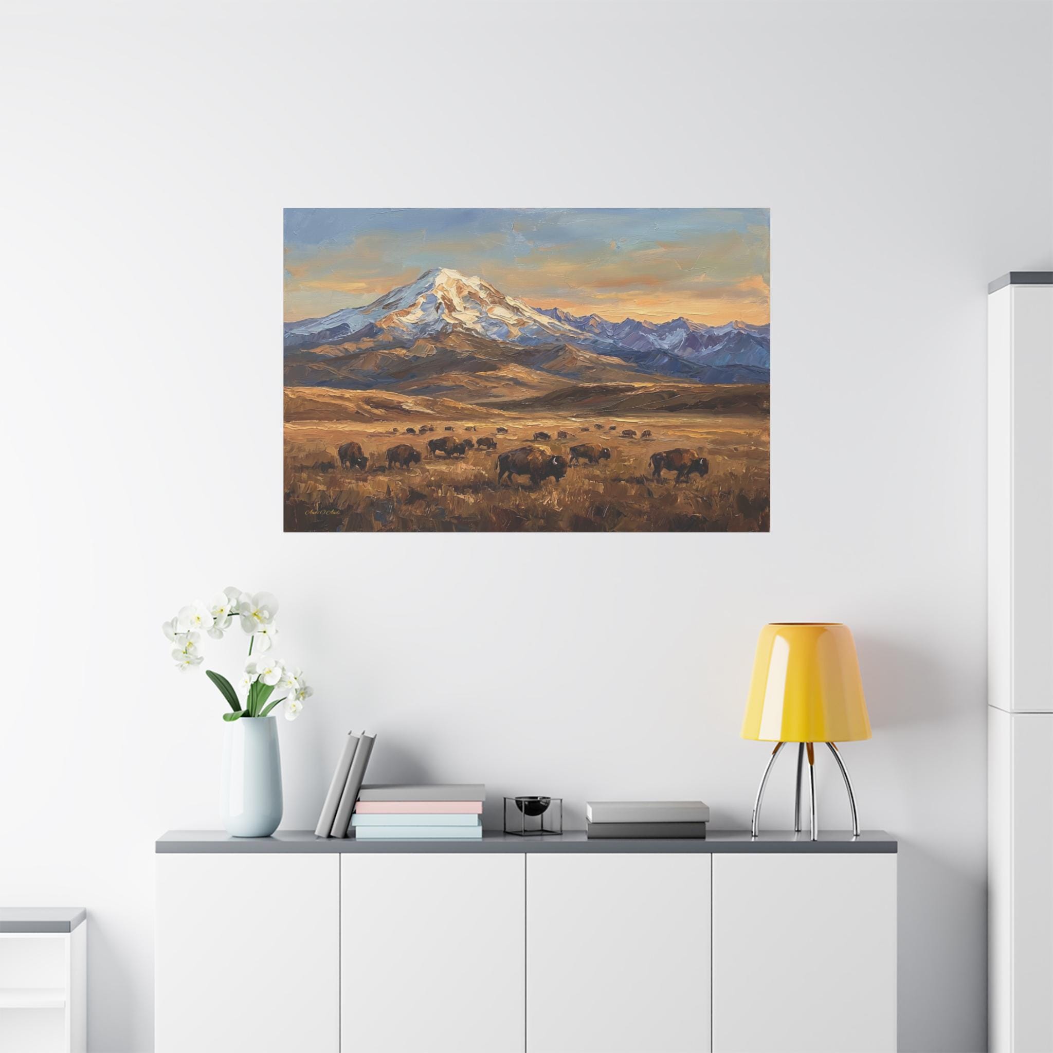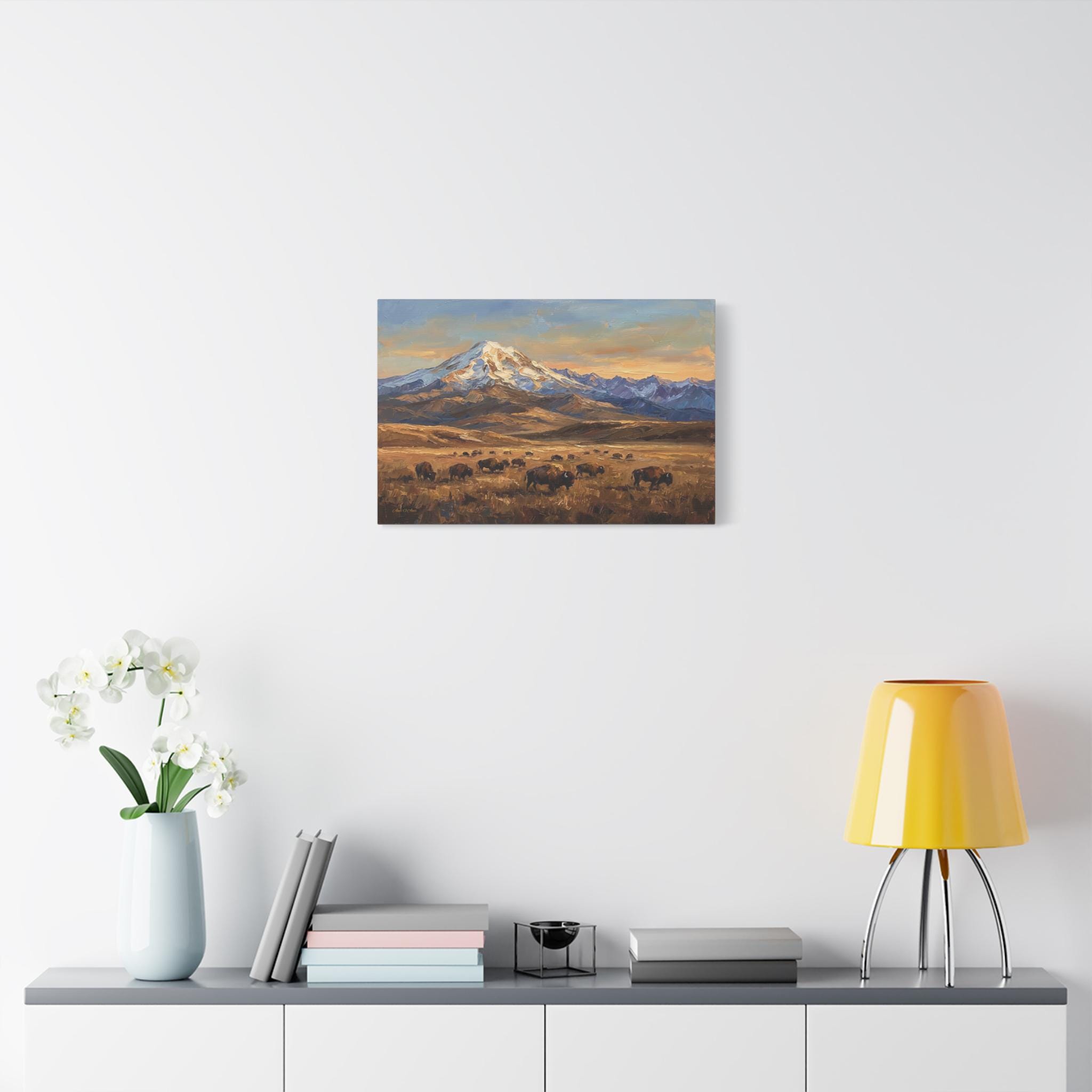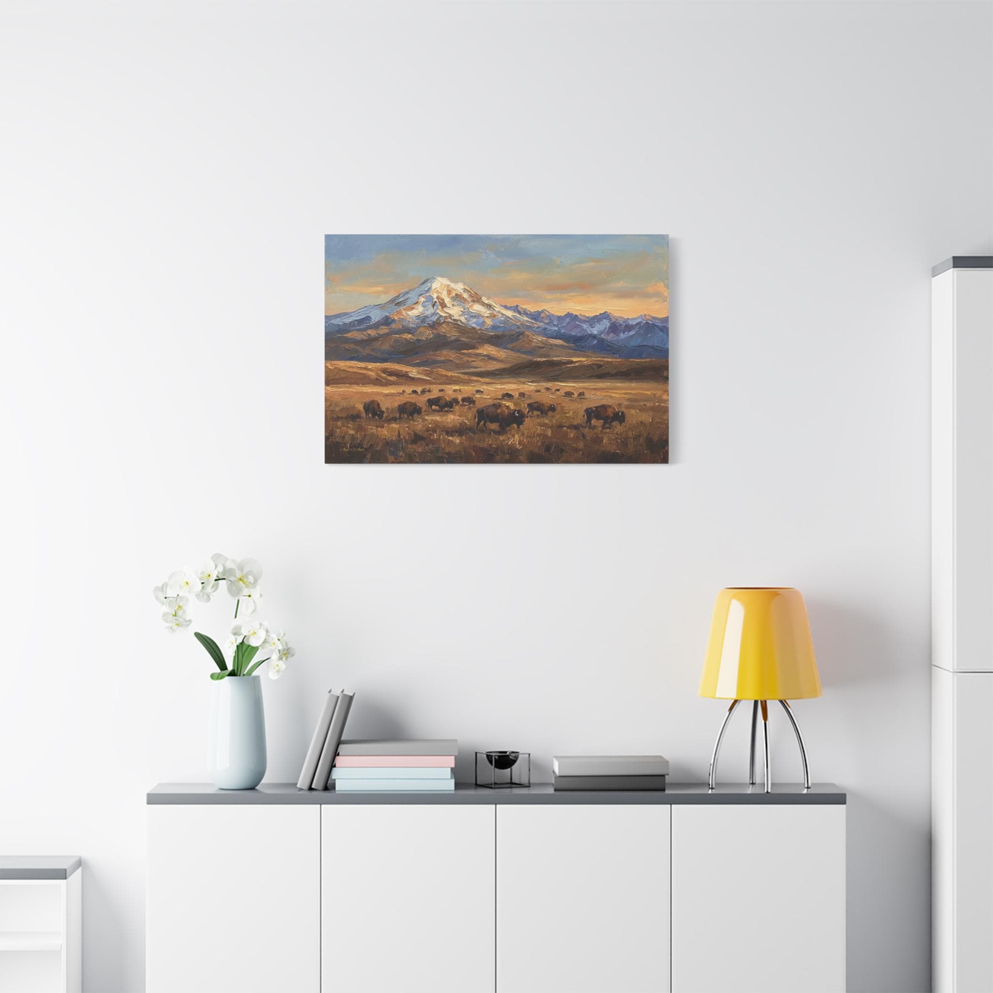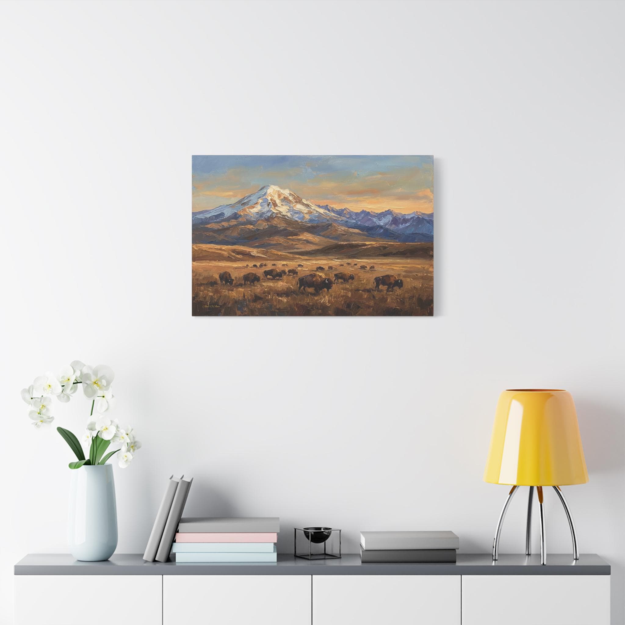 Bring the awe-inspiring majesty, untamed freedom, and rugged beauty of the American West into your home with this stunning western landscape canvas print. This captivating horizontal artwork features a peaceful herd of American buffalo grazing across a vast, golden prairie. In the distance, a towering, majestic snow-capped mountain rises against a soft, pastel sunset sky, perfectly capturing the expansive beauty of the great frontier.