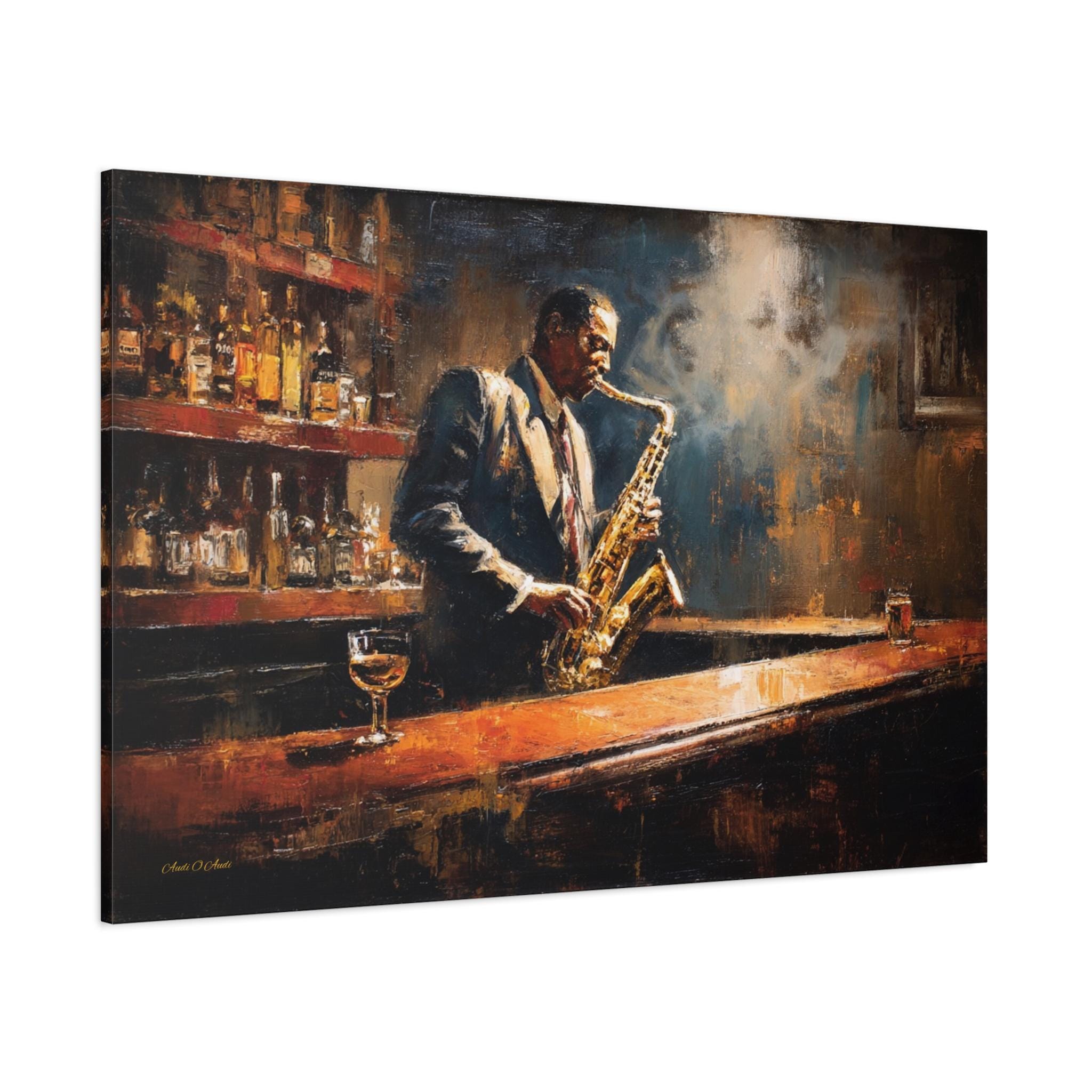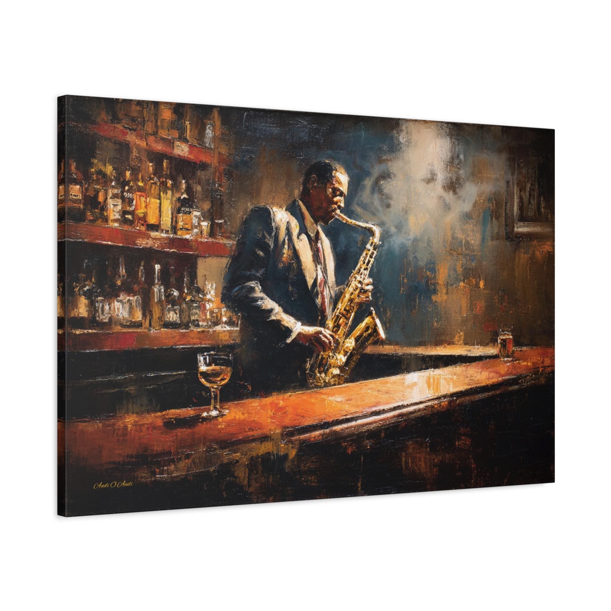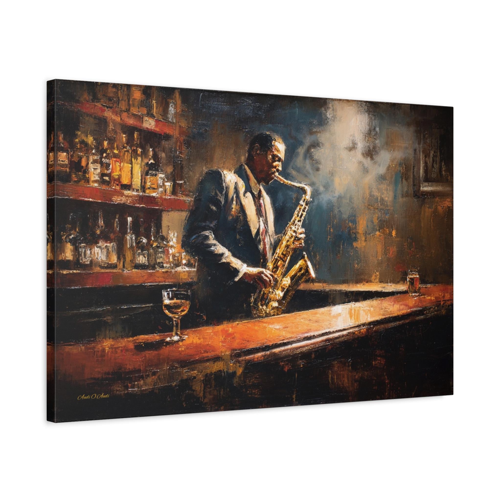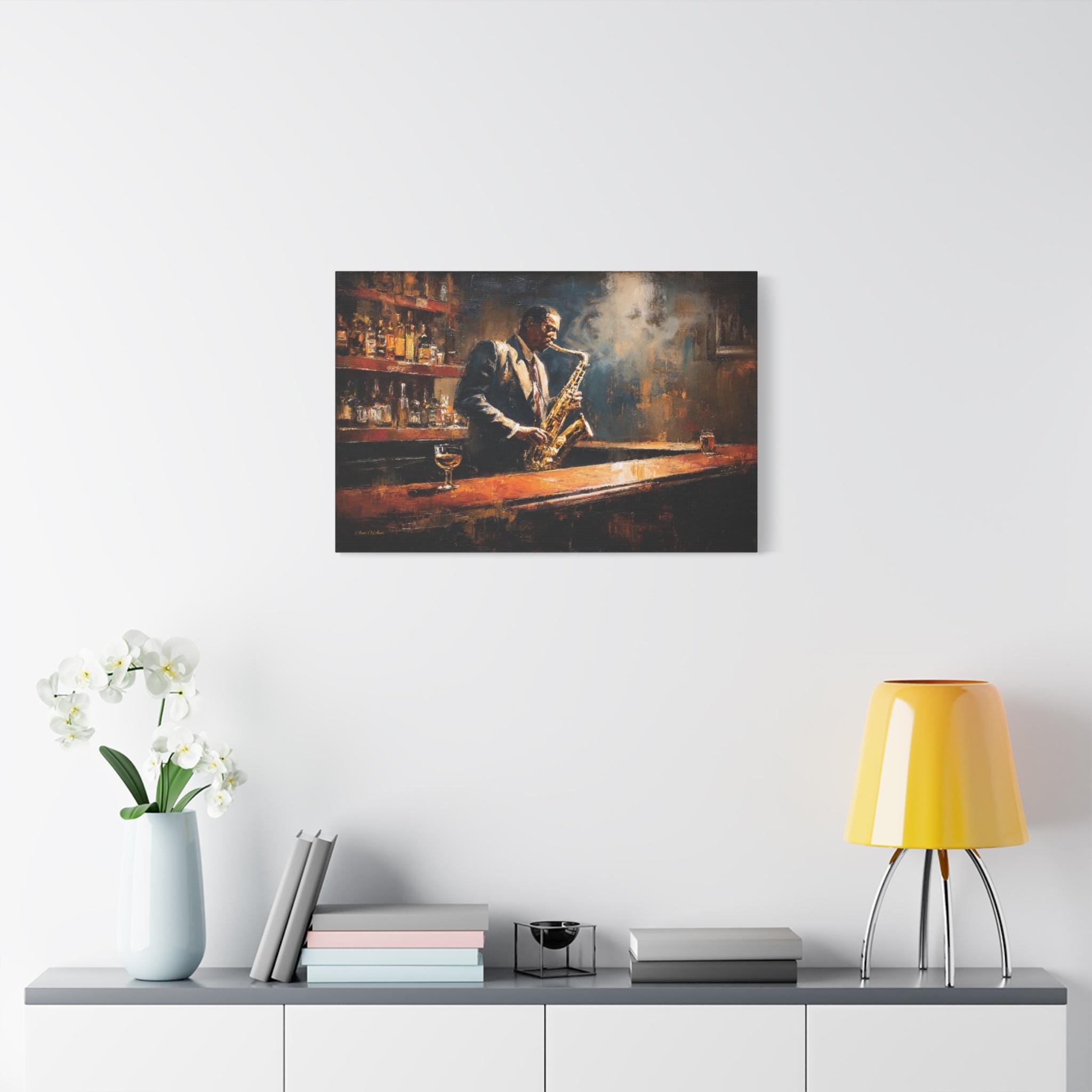 Bring the soulful rhythm, nostalgic elegance, and smoky, cinematic atmosphere of a classic speakeasy into your home with this stunning jazz club canvas print. This captivating horizontal artwork features a passionate saxophonist lost in the music, standing at a polished wooden bar. The scene is bathed in a moody, diffused spotlight that cuts through the smoky air, illuminating the golden brass of the saxophone and the warm amber liquid in the glass resting on the counter.