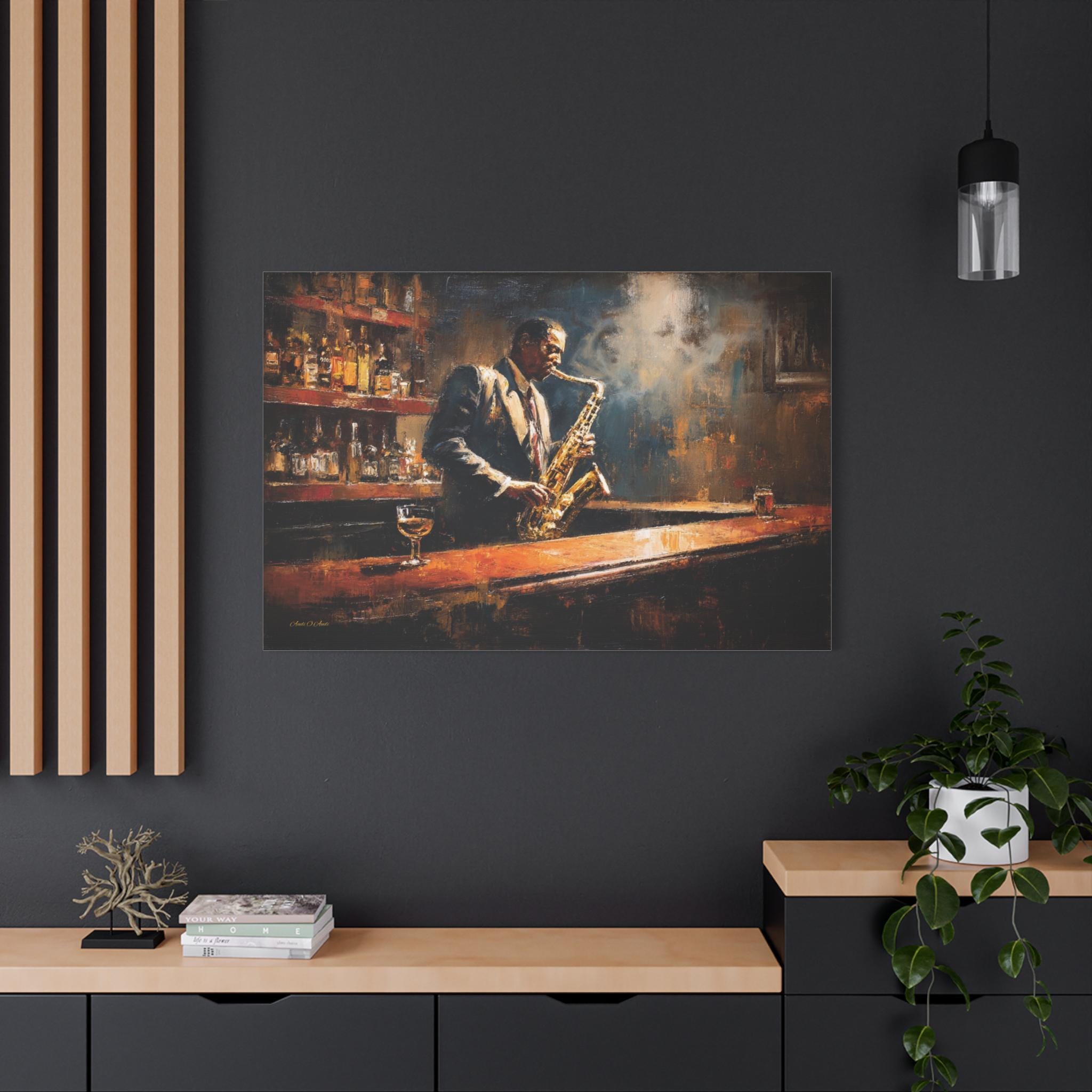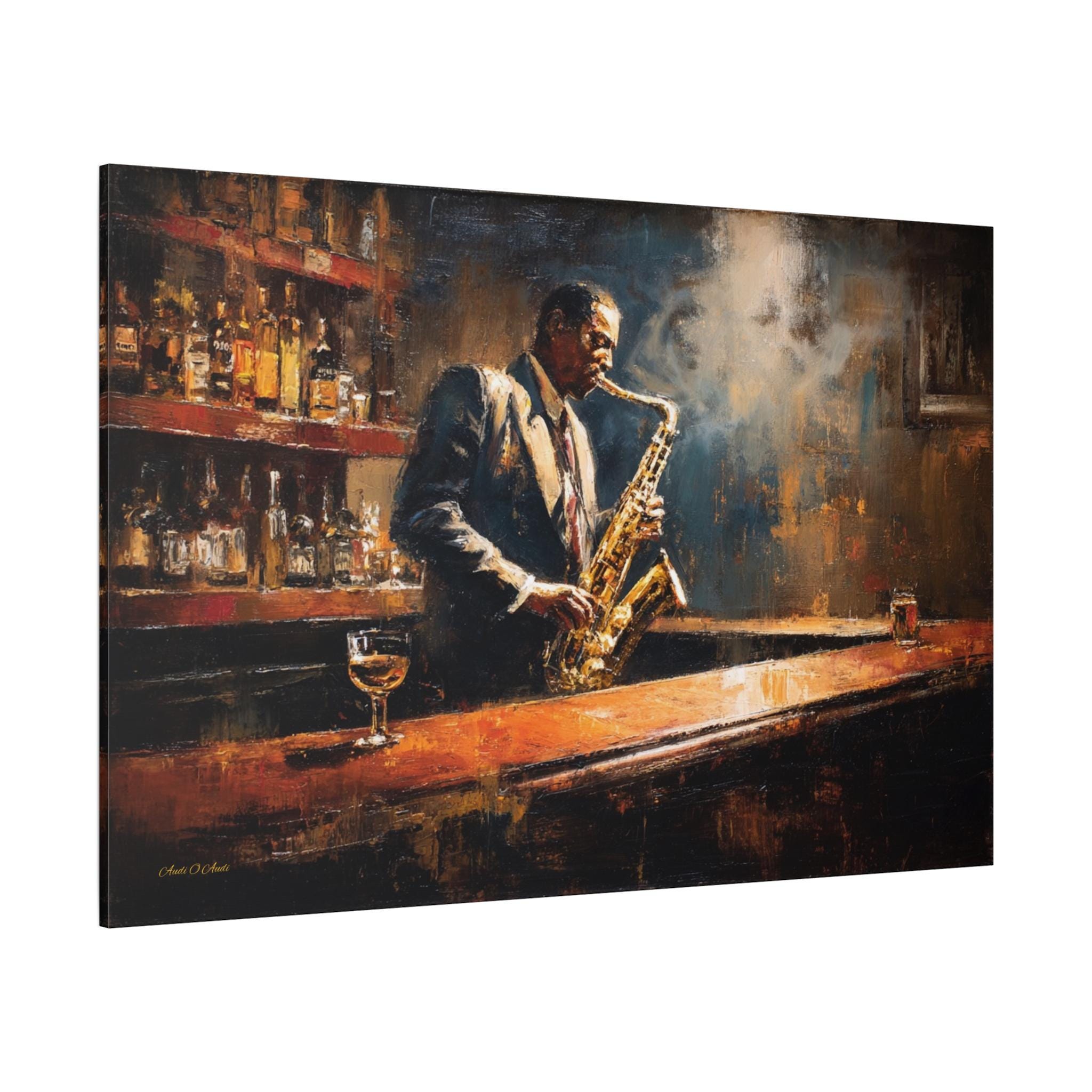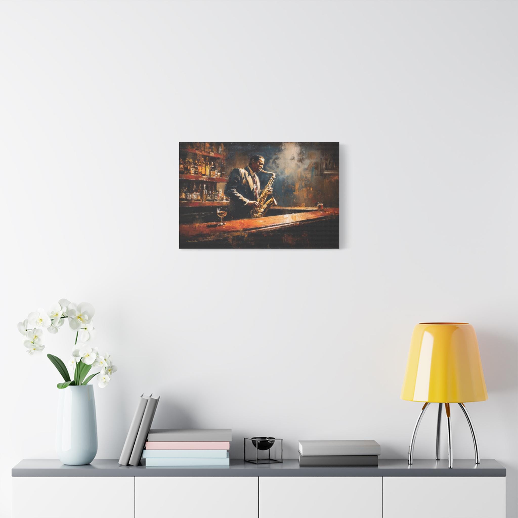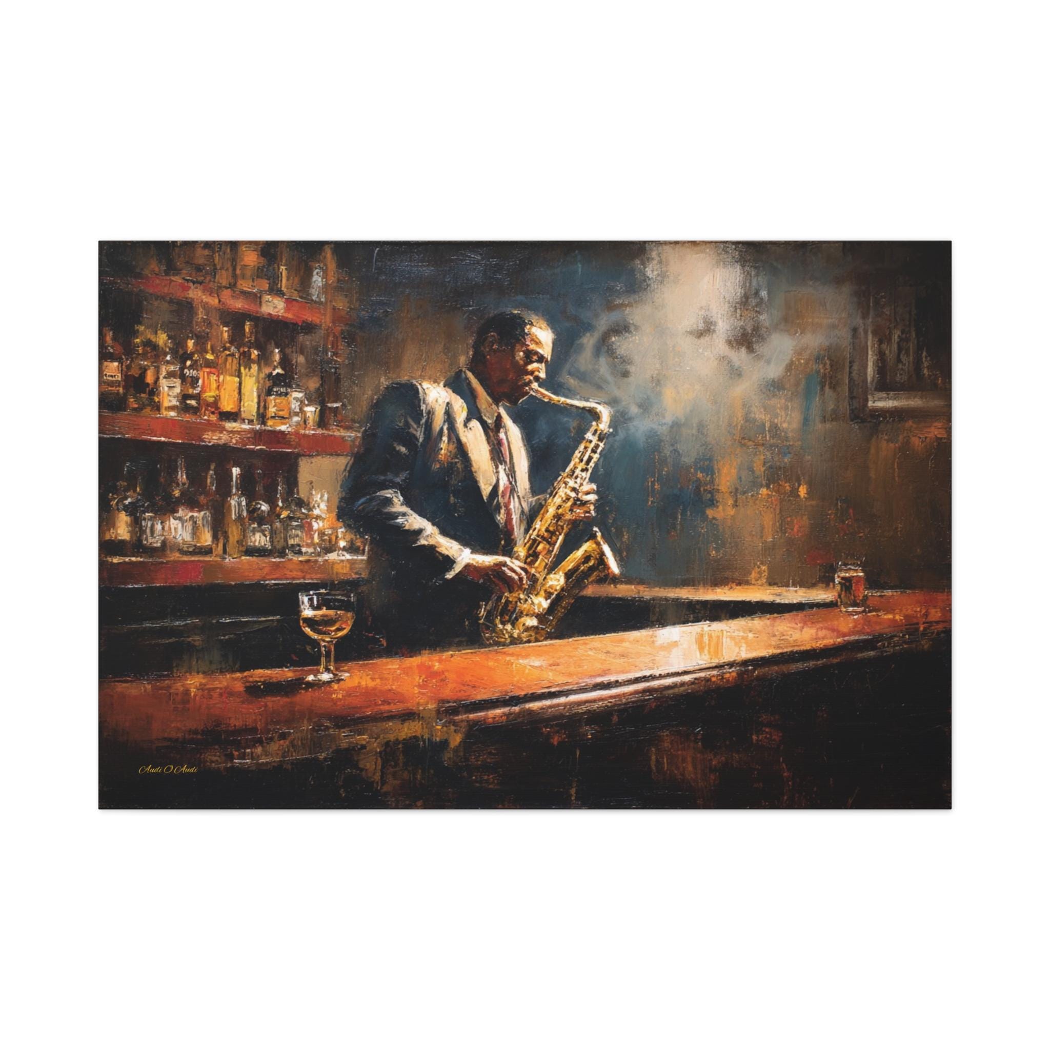 Bring the soulful rhythm, nostalgic elegance, and smoky, cinematic atmosphere of a classic speakeasy into your home with this stunning jazz club canvas print. This captivating horizontal artwork features a passionate saxophonist lost in the music, standing at a polished wooden bar. The scene is bathed in a moody, diffused spotlight that cuts through the smoky air, illuminating the golden brass of the saxophone and the warm amber liquid in the glass resting on the counter.
