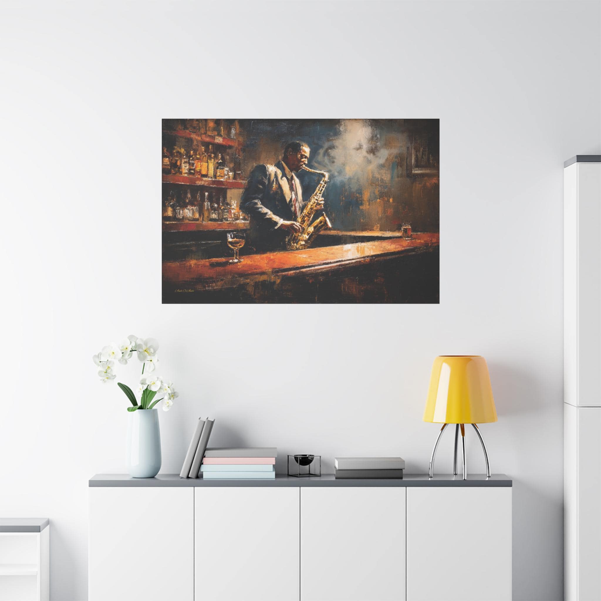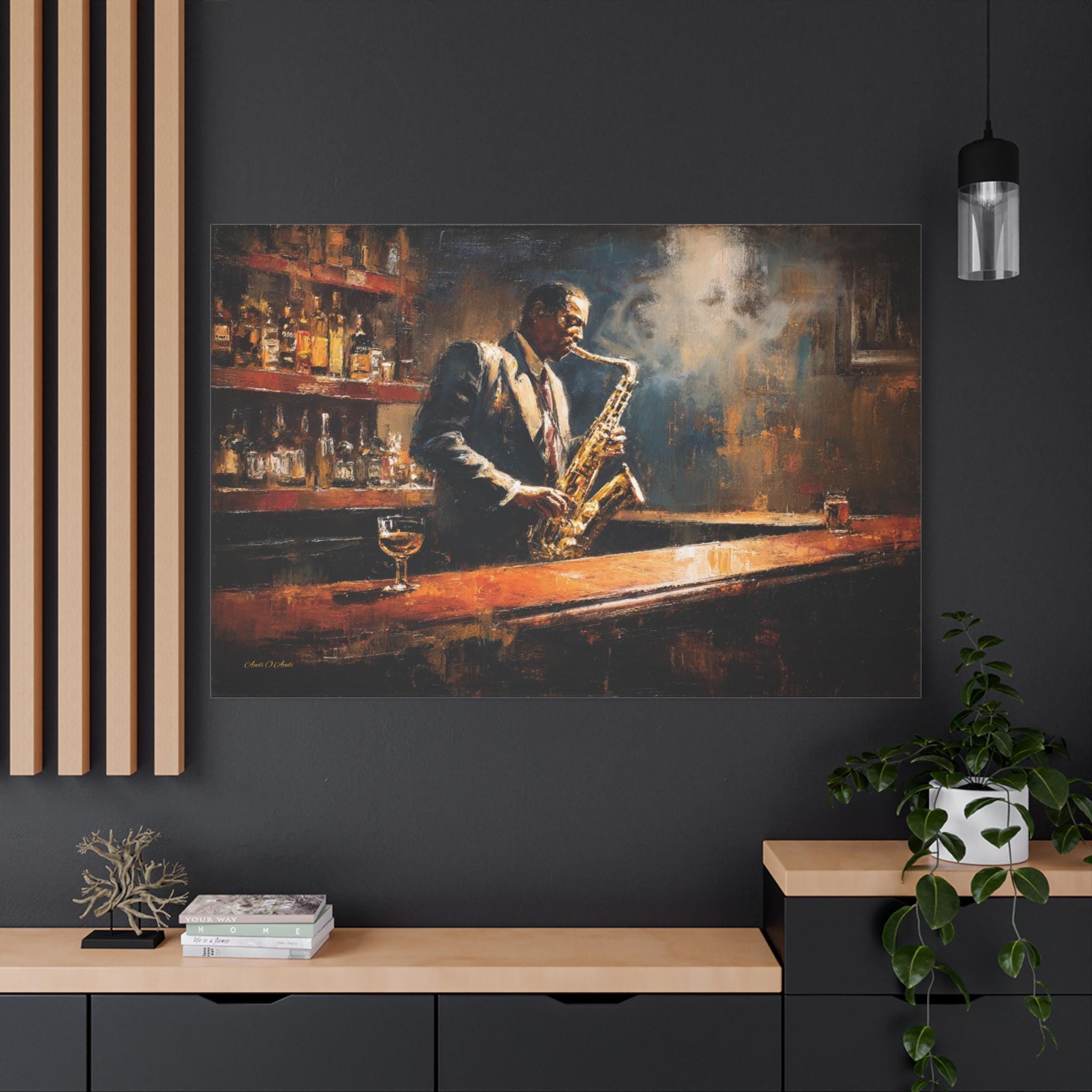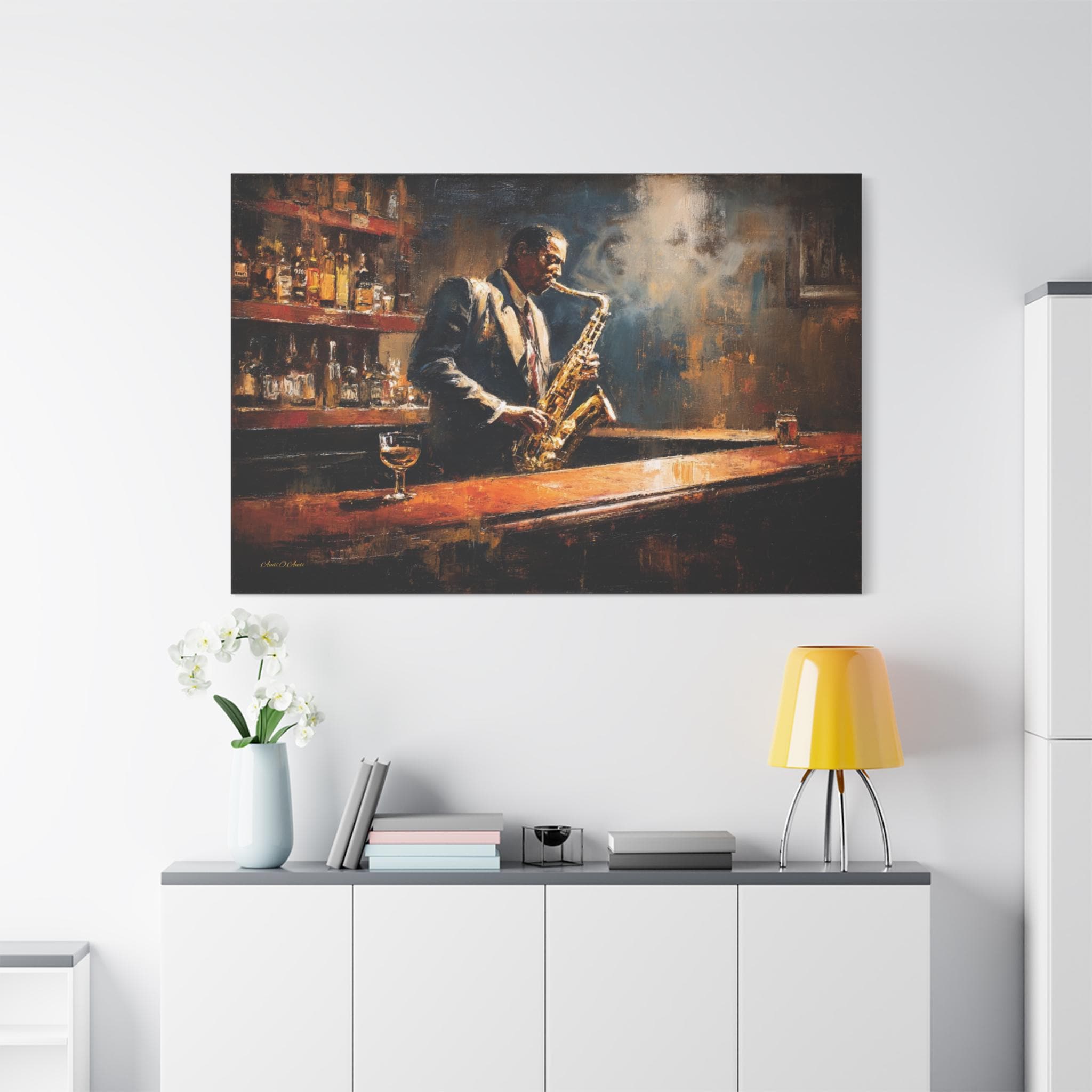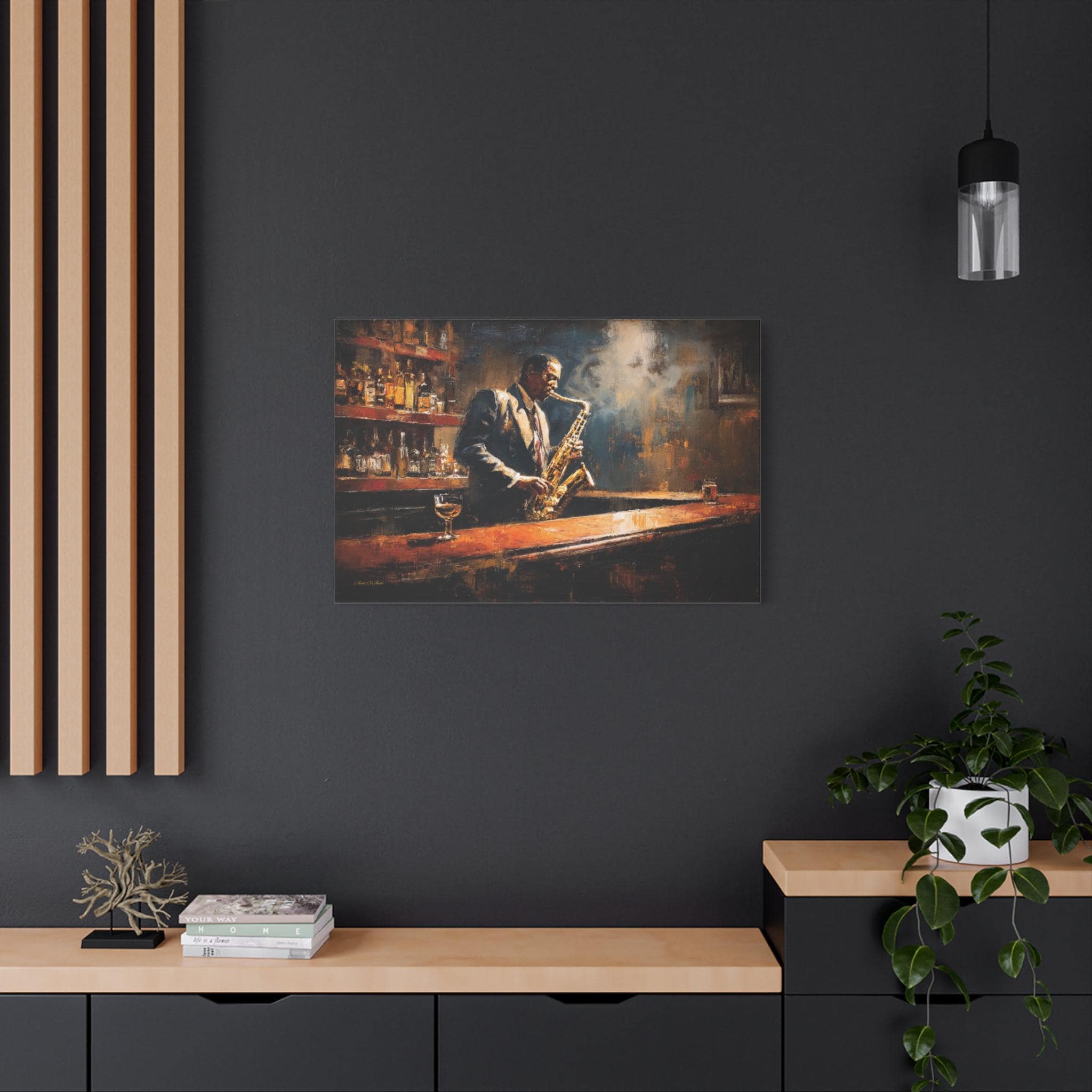 Bring the soulful rhythm, nostalgic elegance, and smoky, cinematic atmosphere of a classic speakeasy into your home with this stunning jazz club canvas print. This captivating horizontal artwork features a passionate saxophonist lost in the music, standing at a polished wooden bar. The scene is bathed in a moody, diffused spotlight that cuts through the smoky air, illuminating the golden brass of the saxophone and the warm amber liquid in the glass resting on the counter.