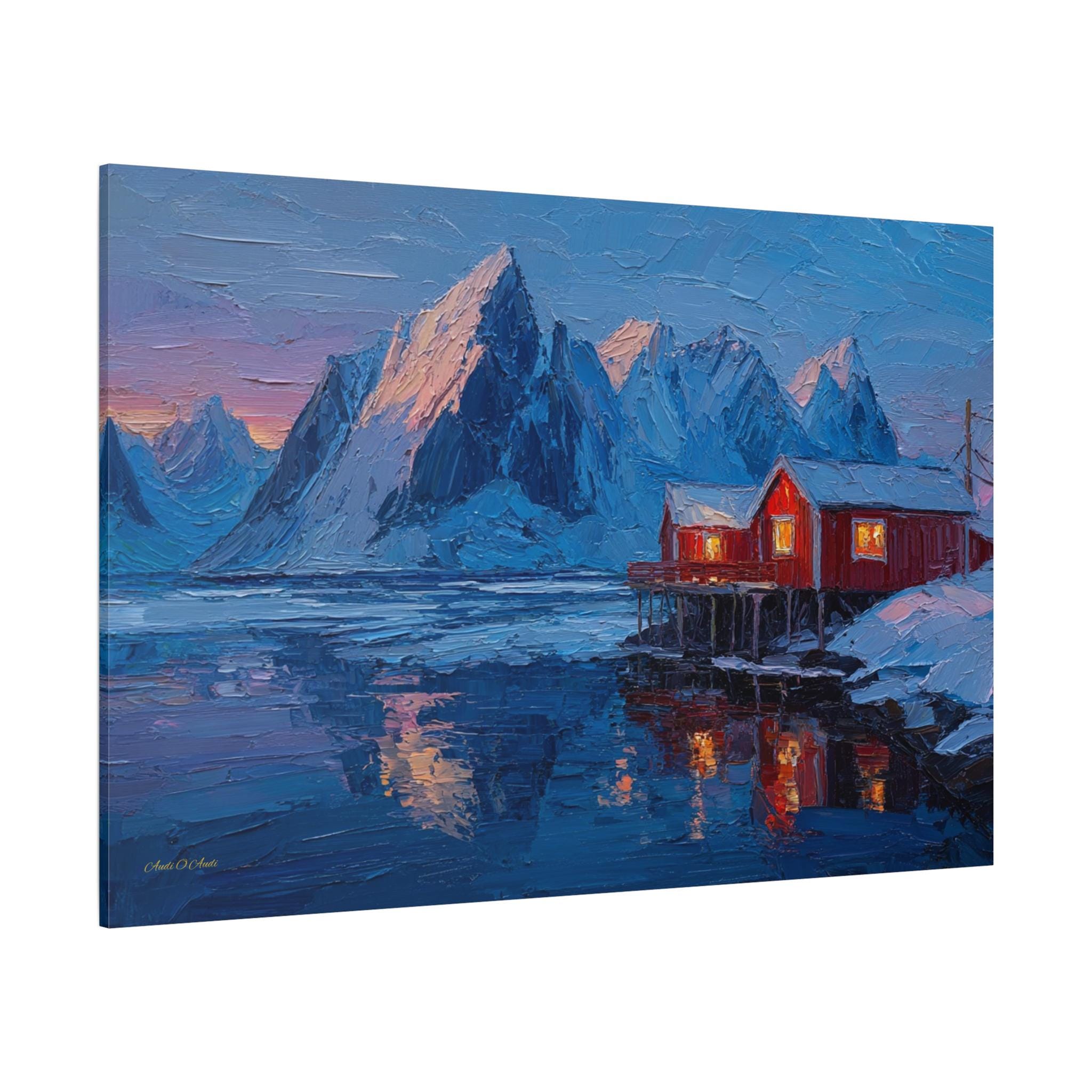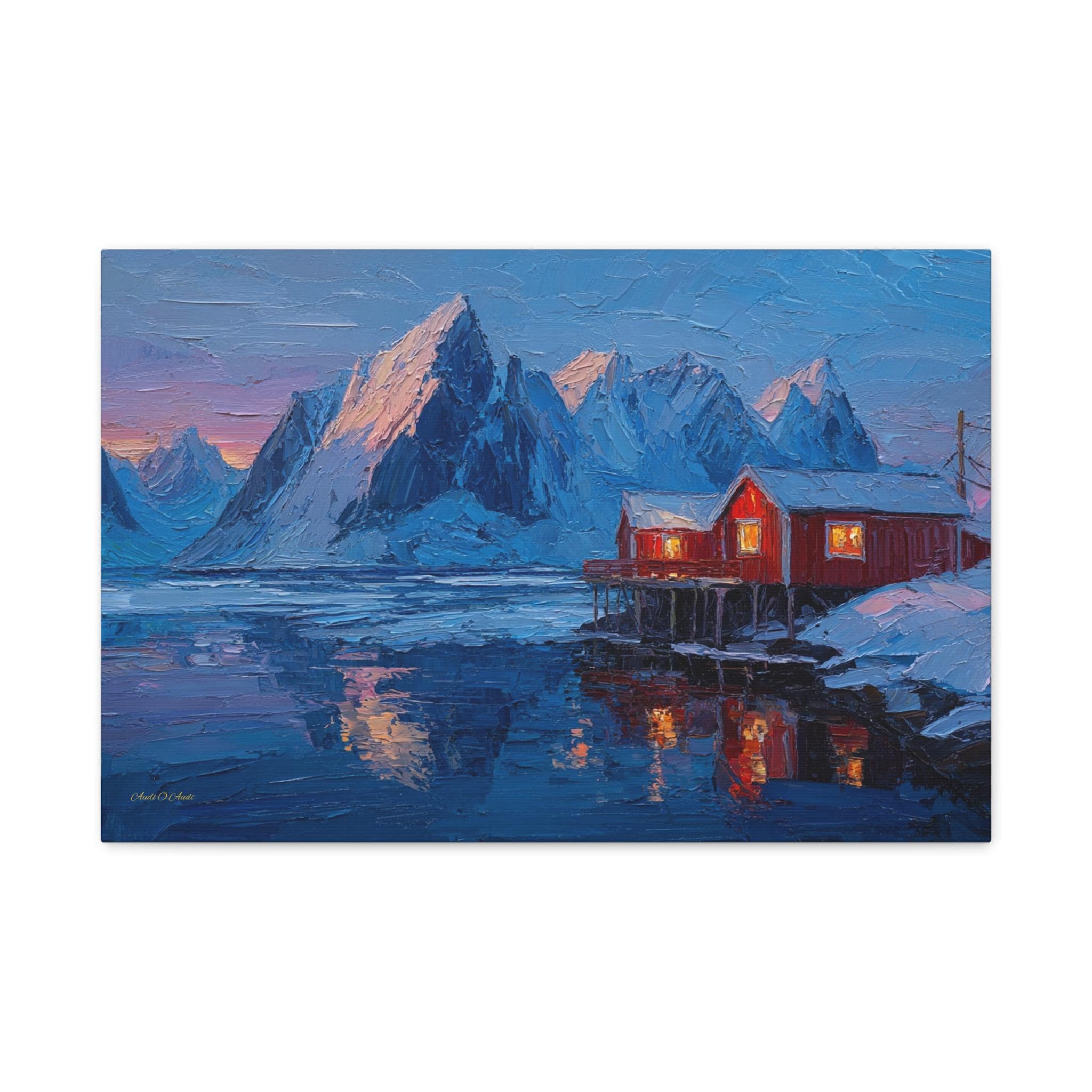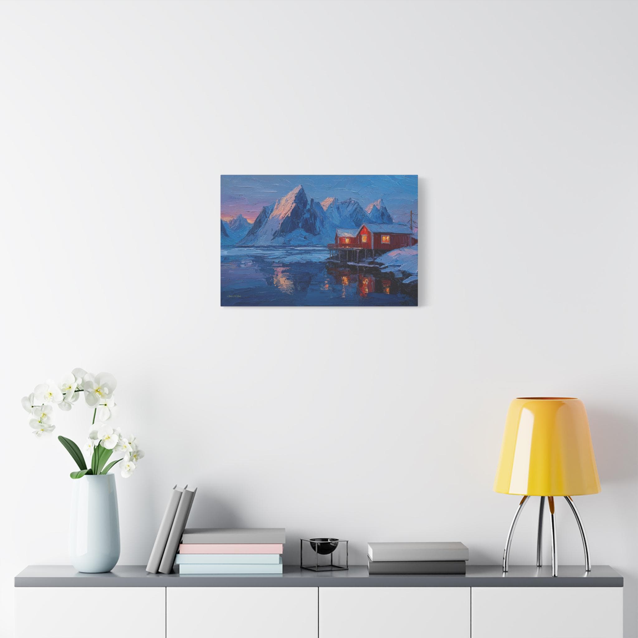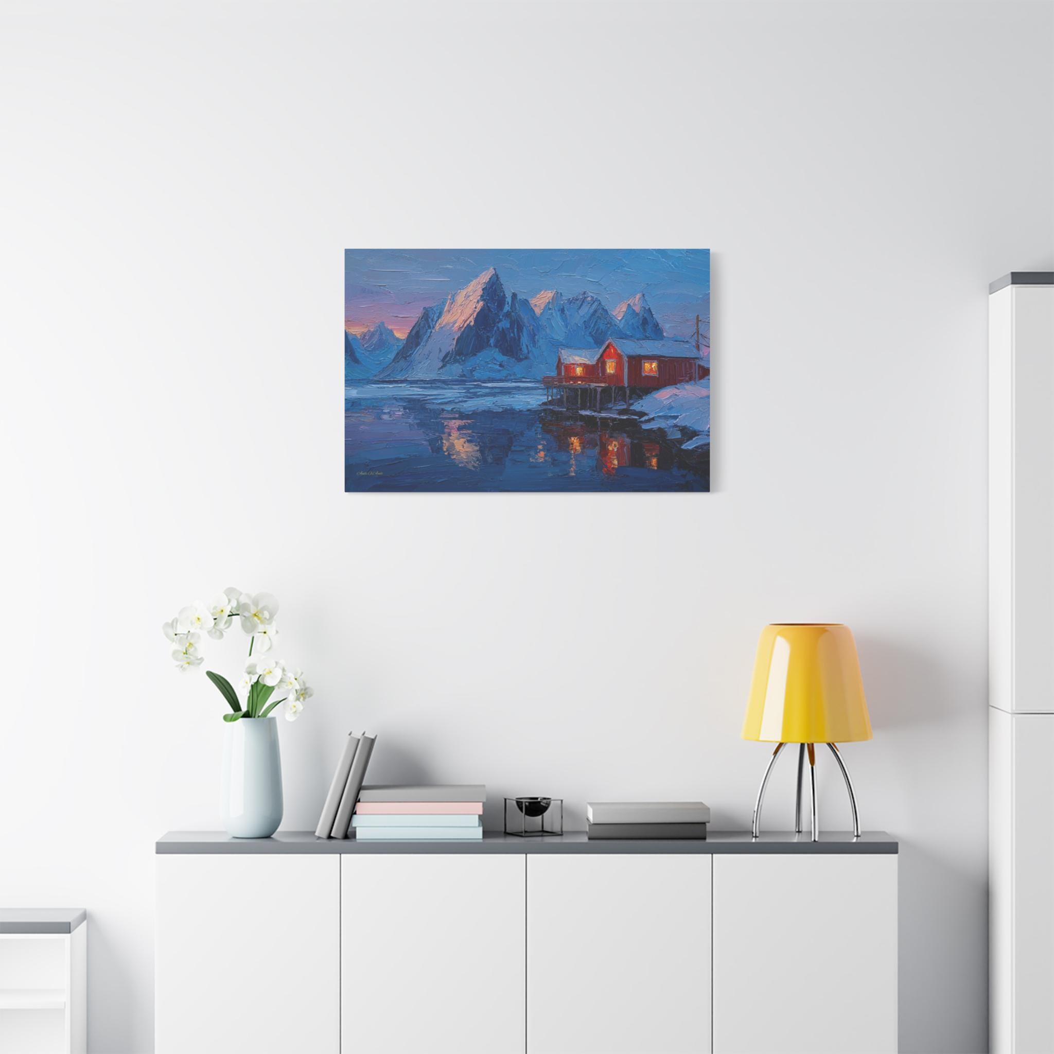 Bring the awe-inspiring majesty, dramatic contrast, and cozy "hygge" warmth of the Norwegian wilderness into your home with this stunning Lofoten Islands winter canvas print. This captivating horizontal artwork features a traditional, vibrant red fishing cabin perched on stilts over a freezing, icy fjord. The warm, golden light spilling from the cabin windows provides a comforting contrast to the towering, snow-capped jagged mountain peaks and the deep, icy blues of the arctic landscape.