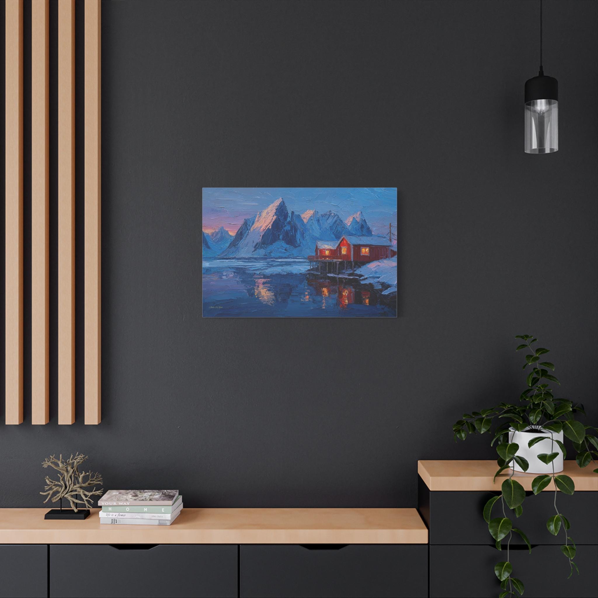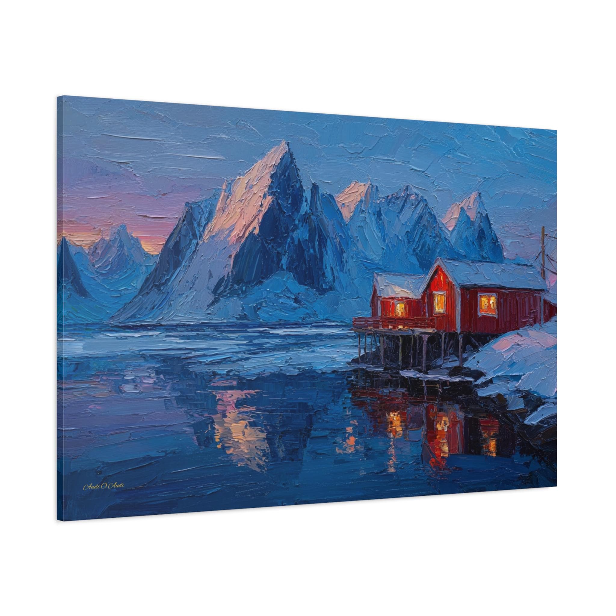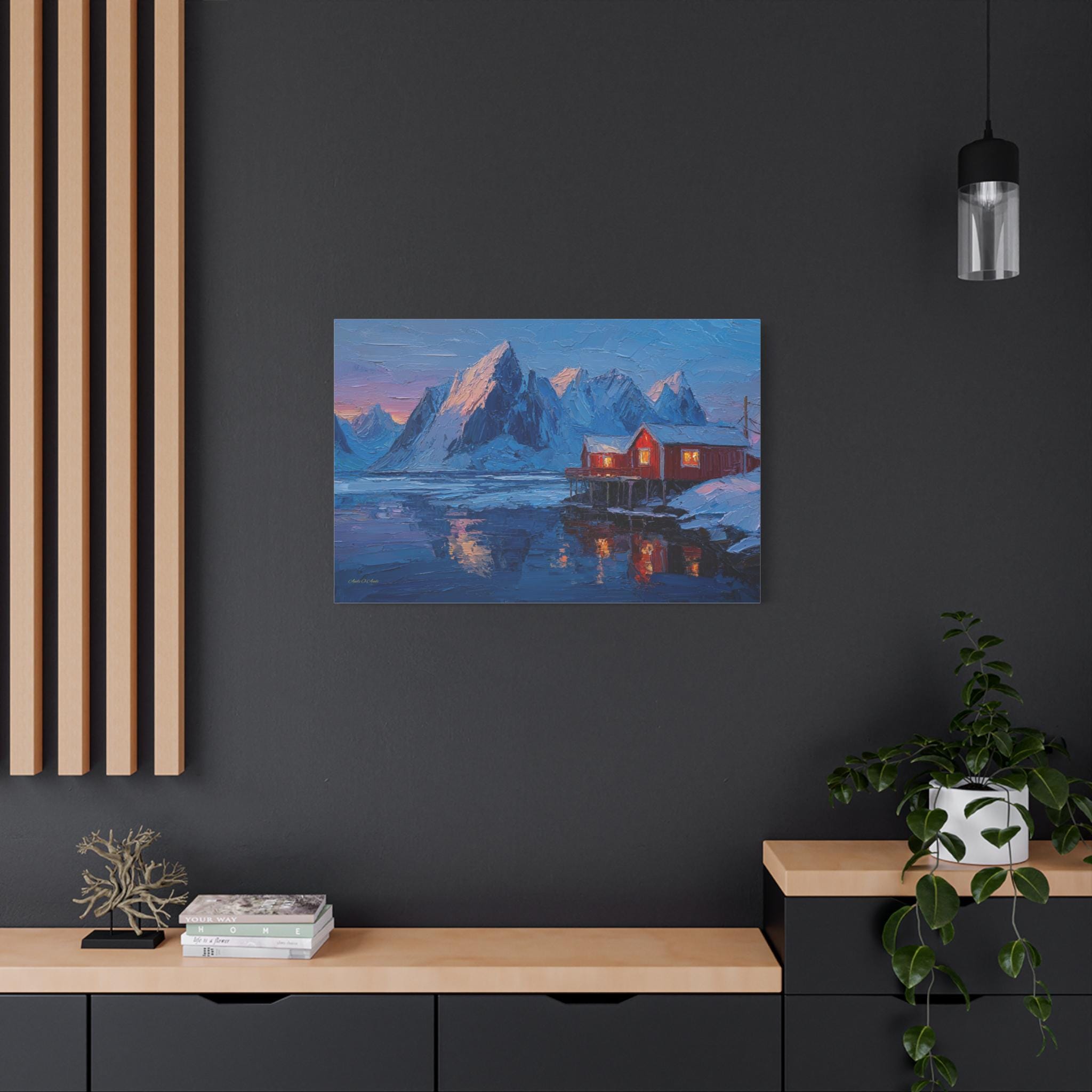 Bring the awe-inspiring majesty, dramatic contrast, and cozy "hygge" warmth of the Norwegian wilderness into your home with this stunning Lofoten Islands winter canvas print. This captivating horizontal artwork features a traditional, vibrant red fishing cabin perched on stilts over a freezing, icy fjord. The warm, golden light spilling from the cabin windows provides a comforting contrast to the towering, snow-capped jagged mountain peaks and the deep, icy blues of the arctic landscape.