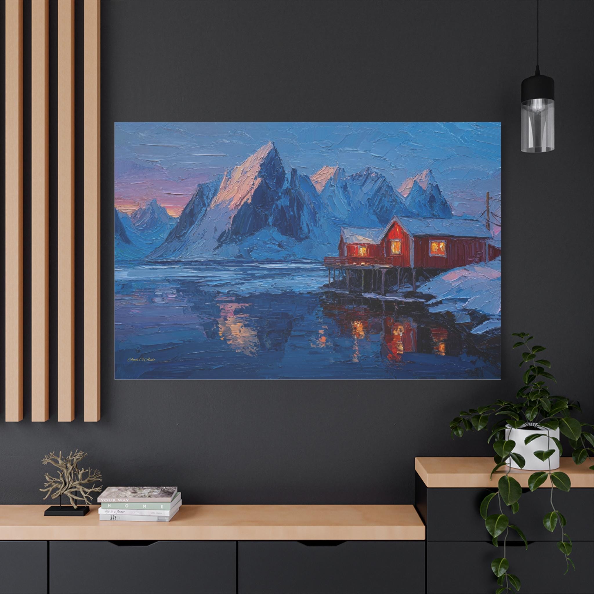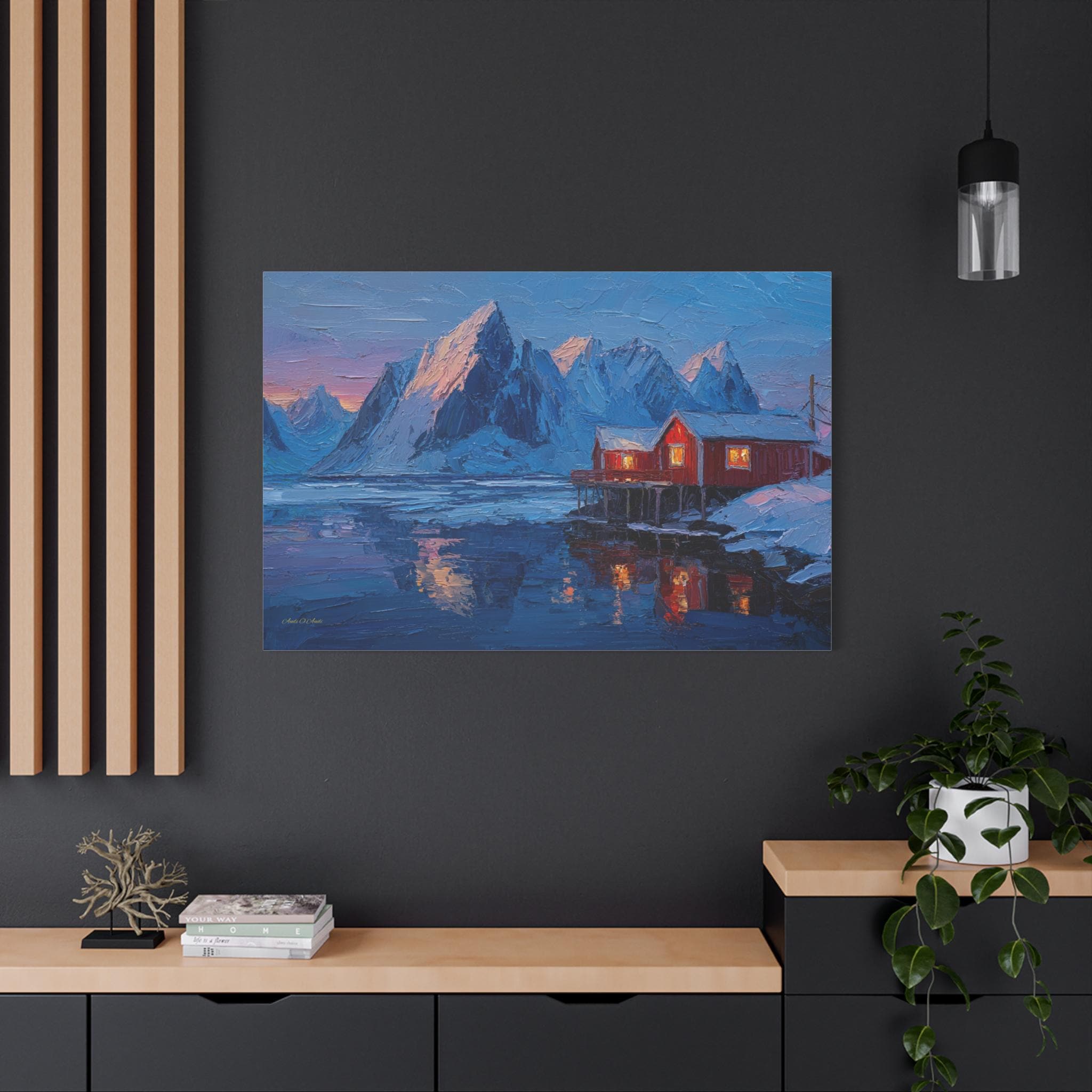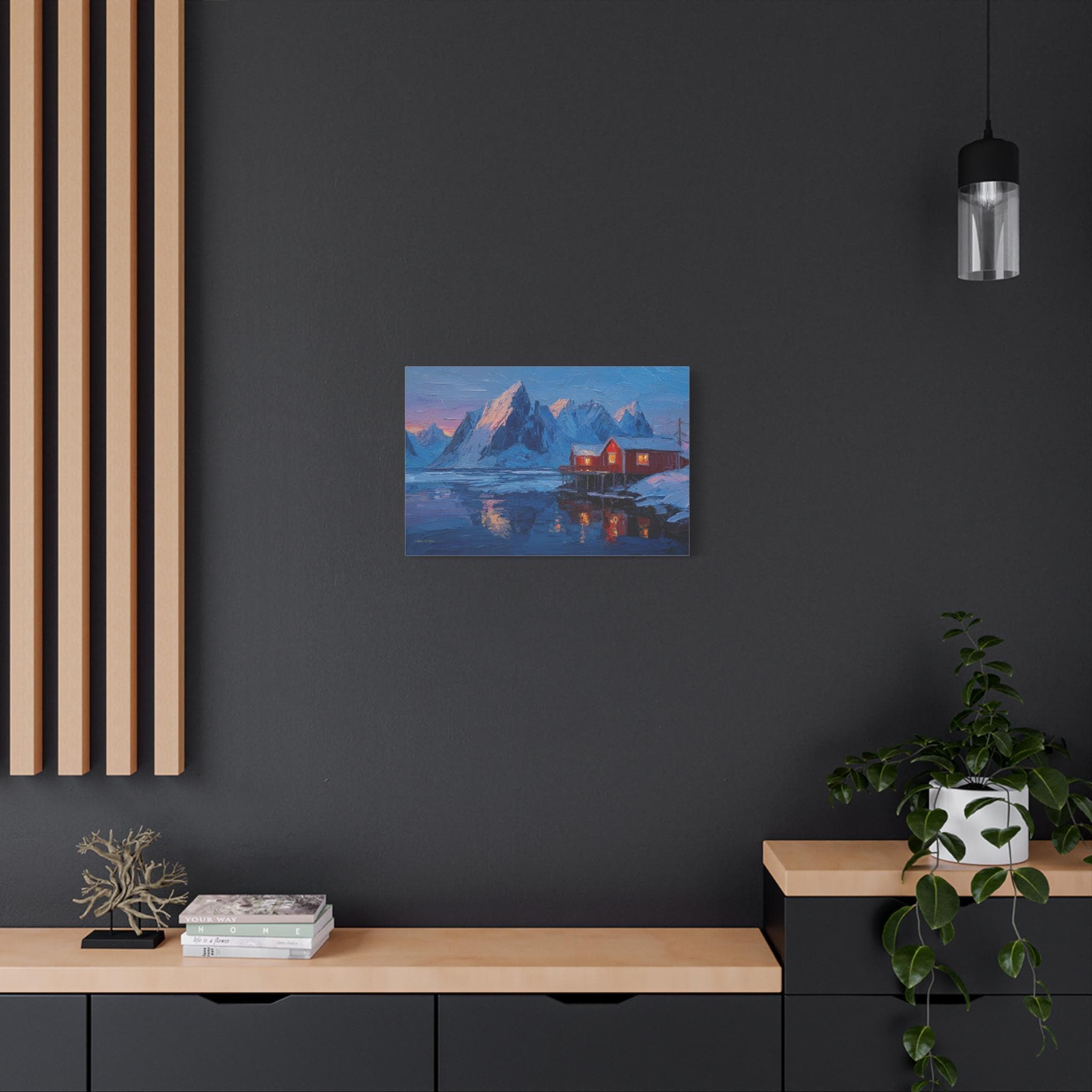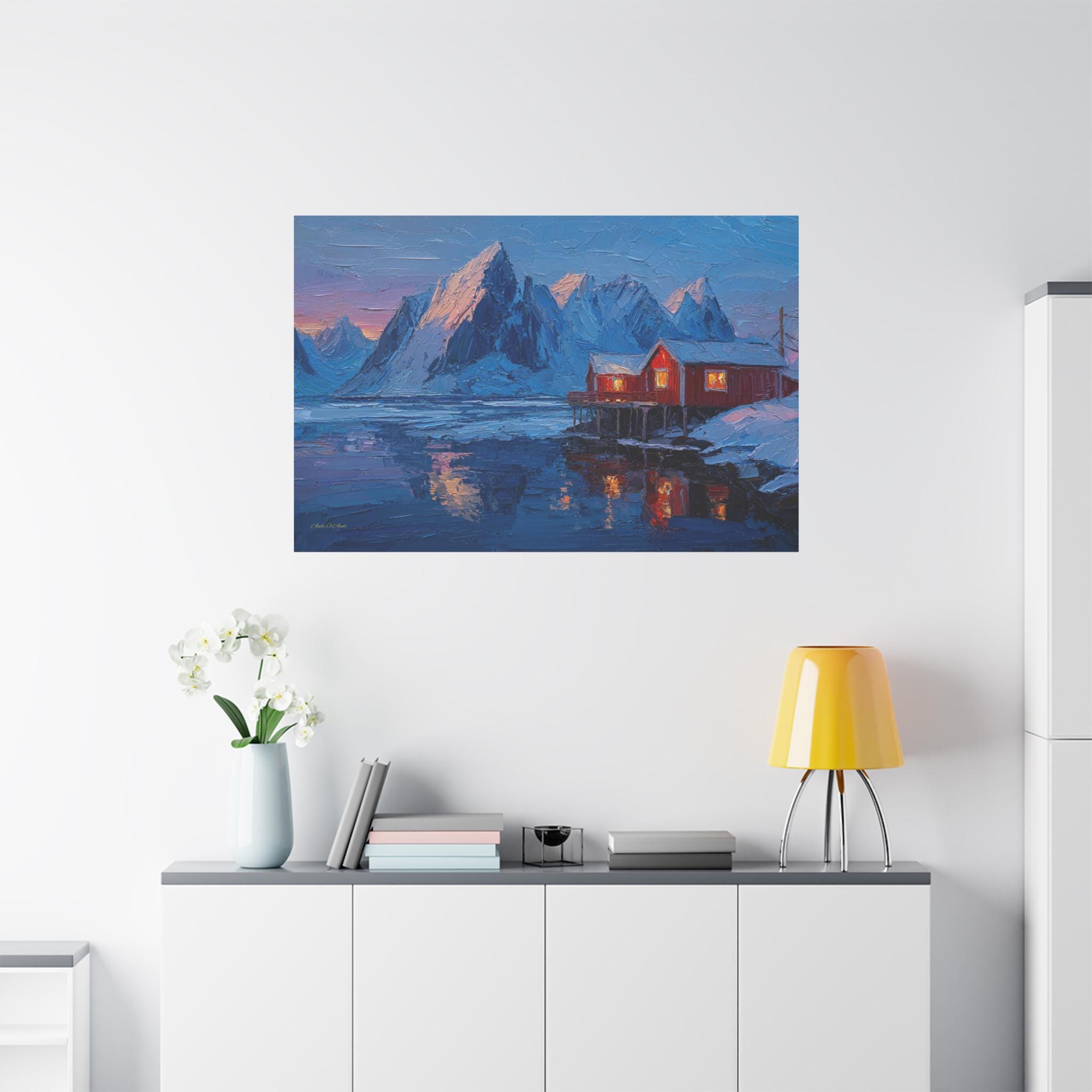 Bring the awe-inspiring majesty, dramatic contrast, and cozy "hygge" warmth of the Norwegian wilderness into your home with this stunning Lofoten Islands winter canvas print. This captivating horizontal artwork features a traditional, vibrant red fishing cabin perched on stilts over a freezing, icy fjord. The warm, golden light spilling from the cabin windows provides a comforting contrast to the towering, snow-capped jagged mountain peaks and the deep, icy blues of the arctic landscape.