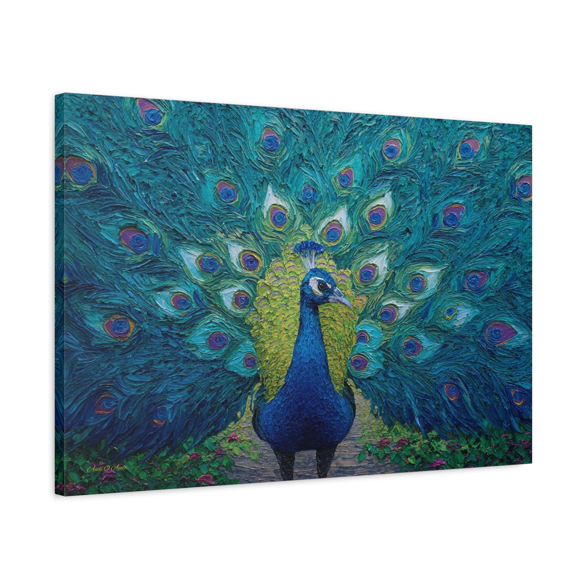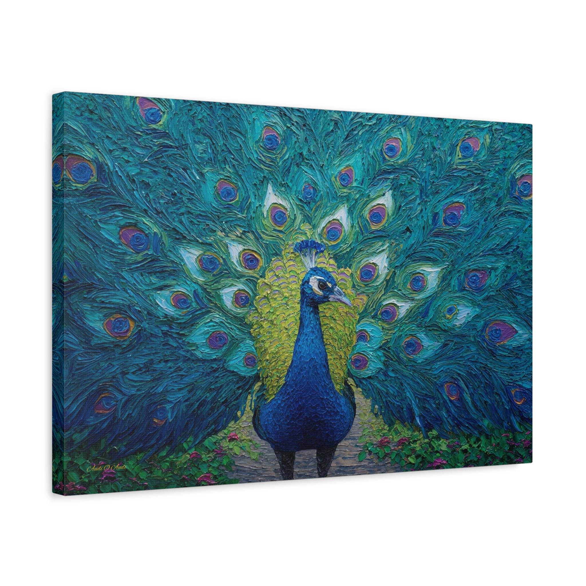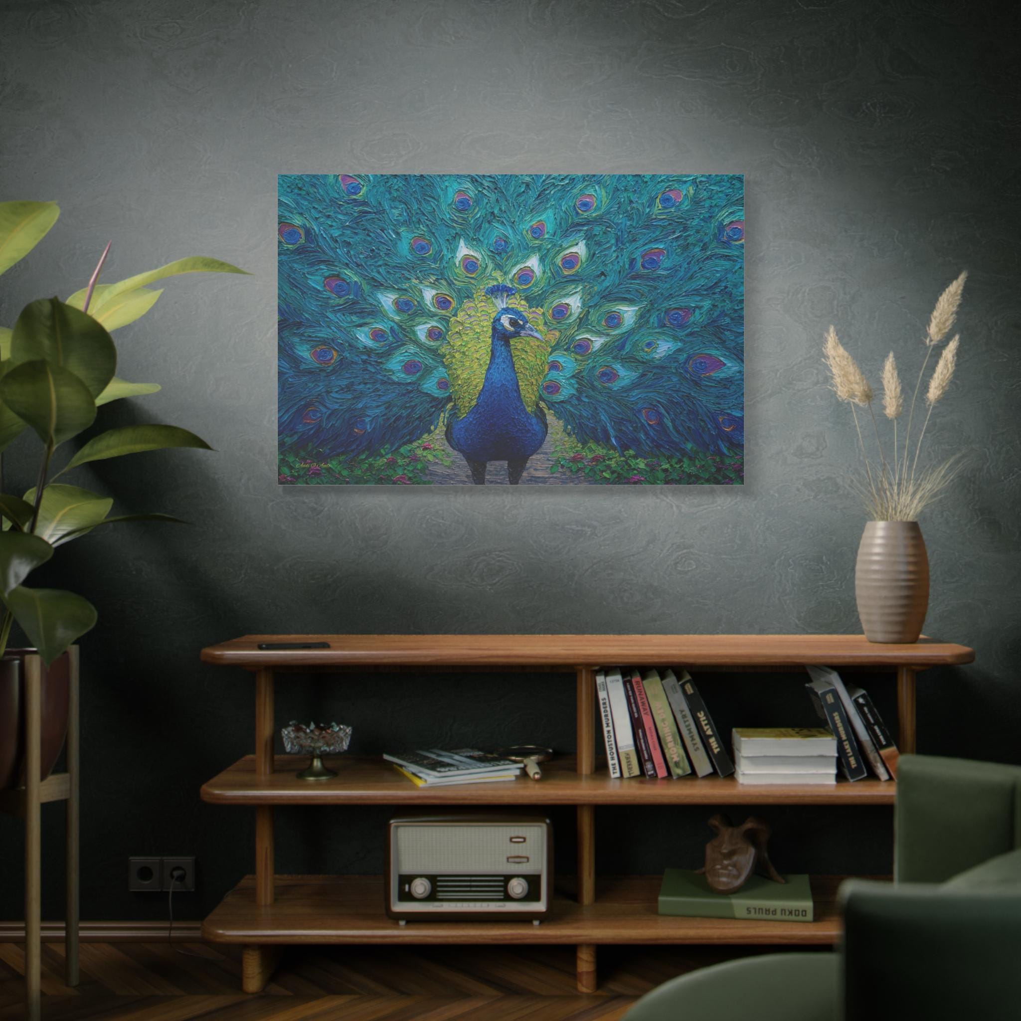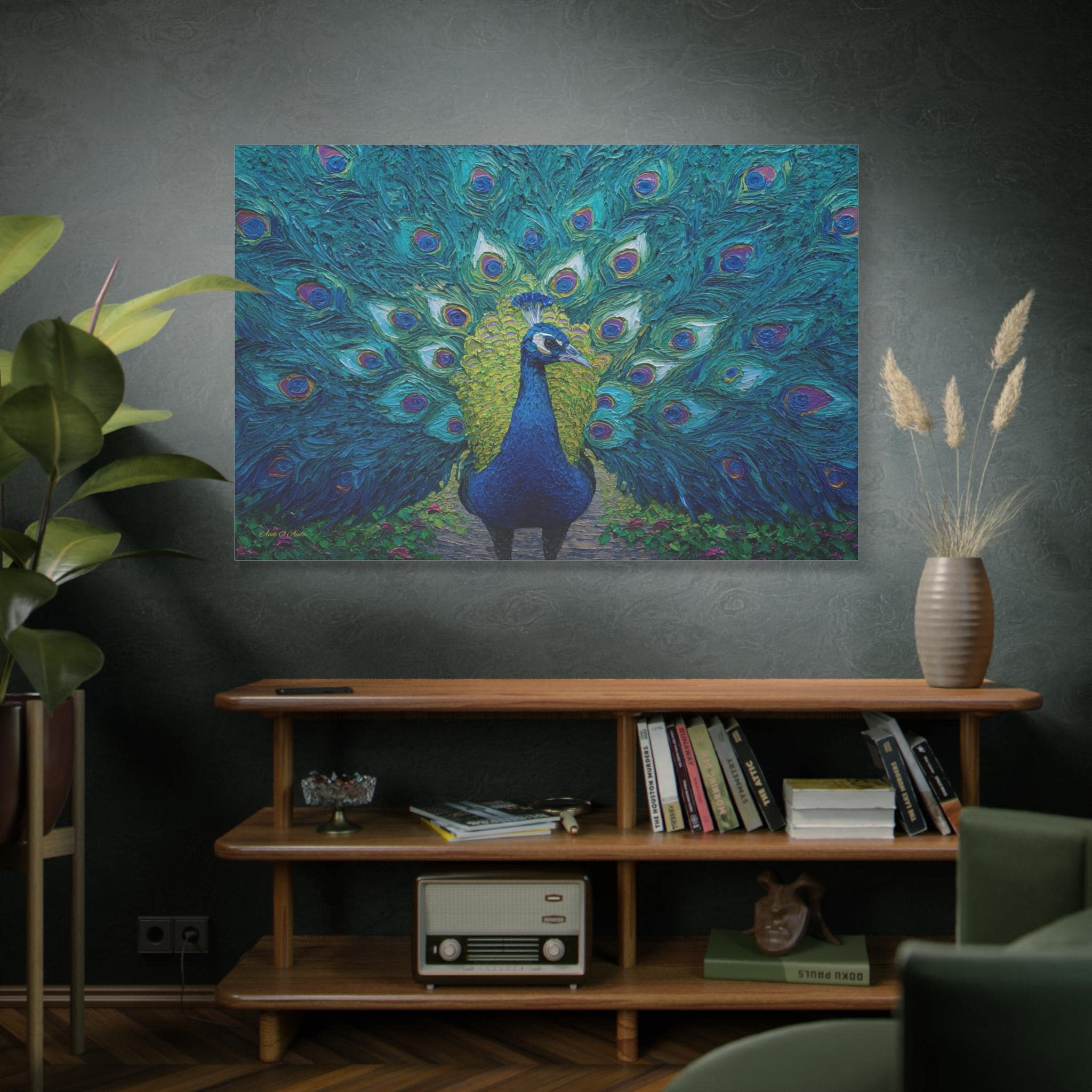 Bring explosive color, regal elegance, and breathtaking maximalist beauty into your home with this stunning majestic peacock canvas print. This captivating horizontal artwork features a magnificent peacock with its tail feathers fully fanned out in a spectacular display. The incredibly rich jewel-toned palette of sapphire blues, emerald greens, iridescent teals, and touches of gold pops brilliantly, drawing the eye to the intricate "eyes" of every single feather.