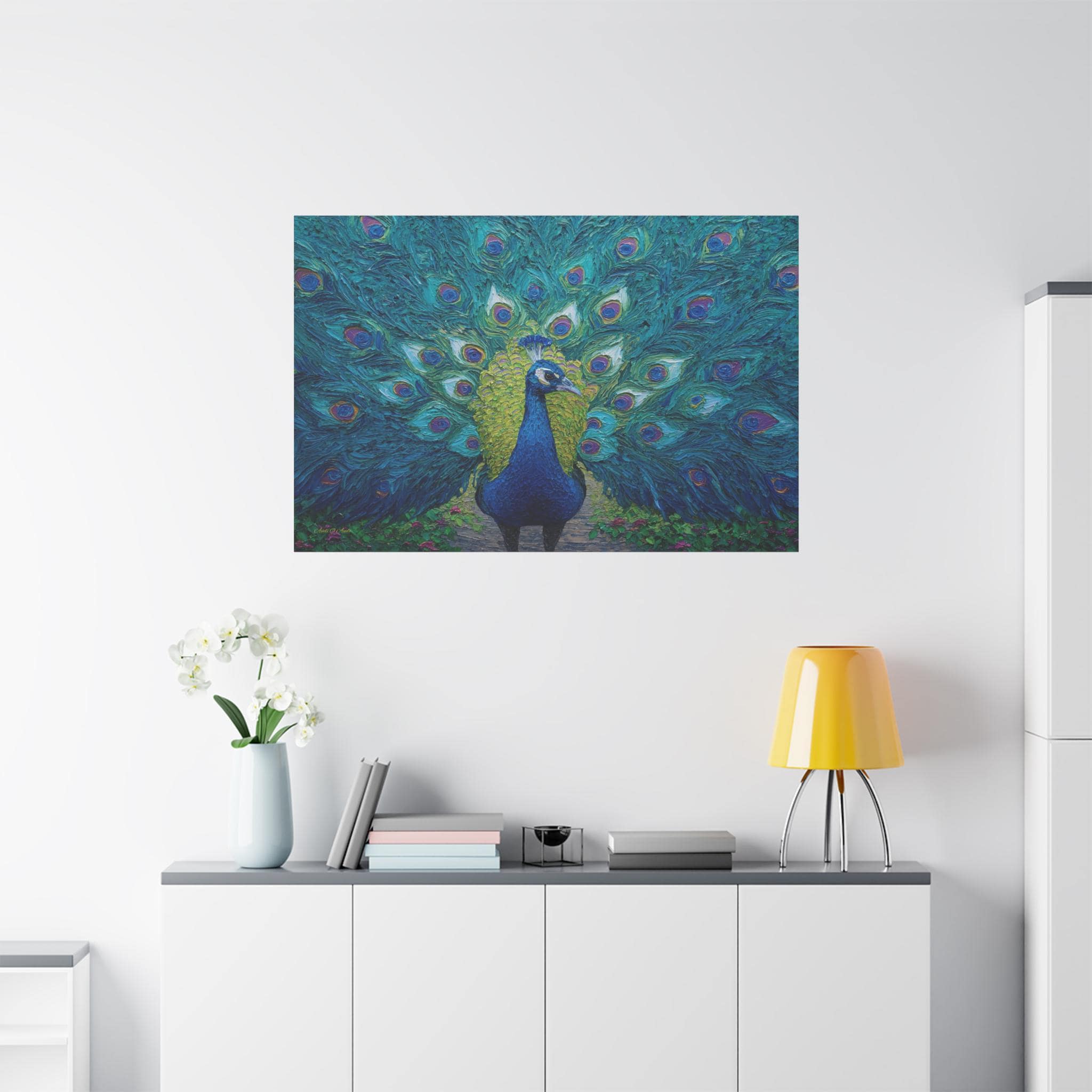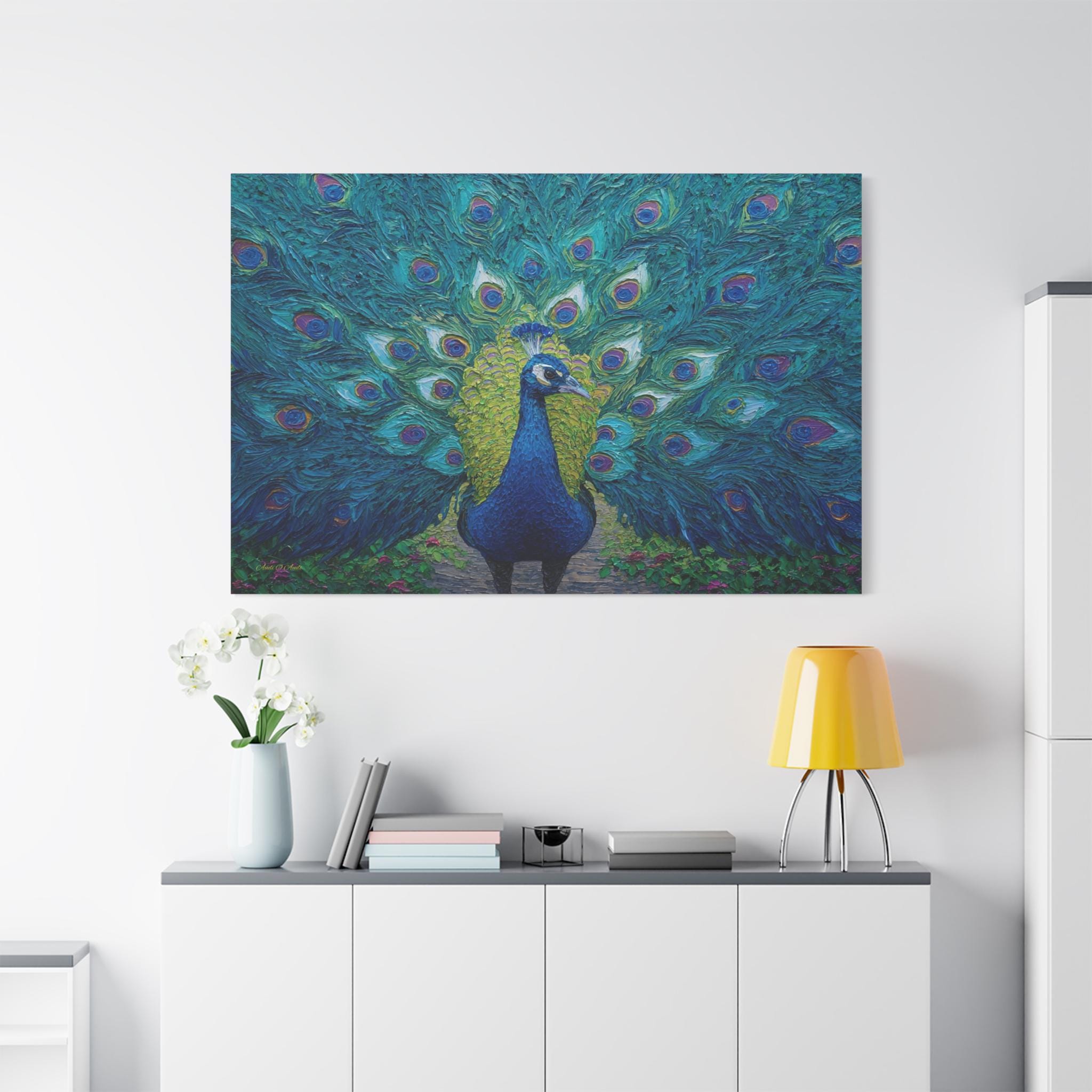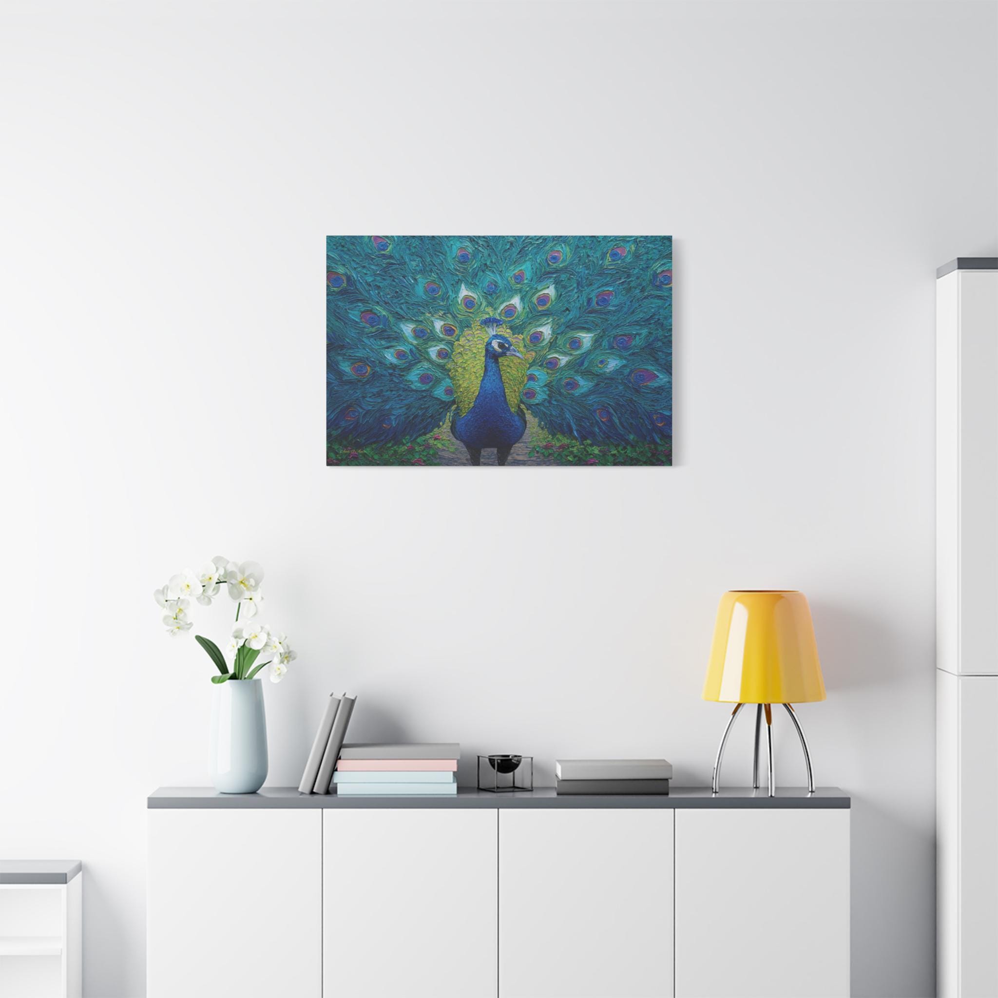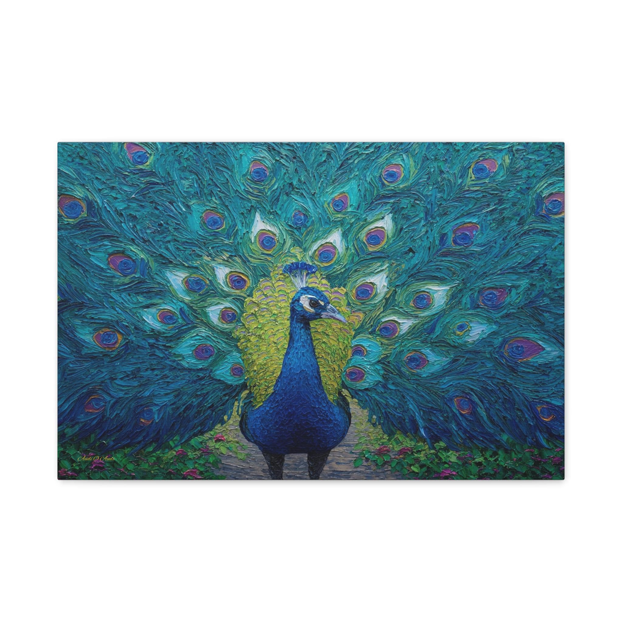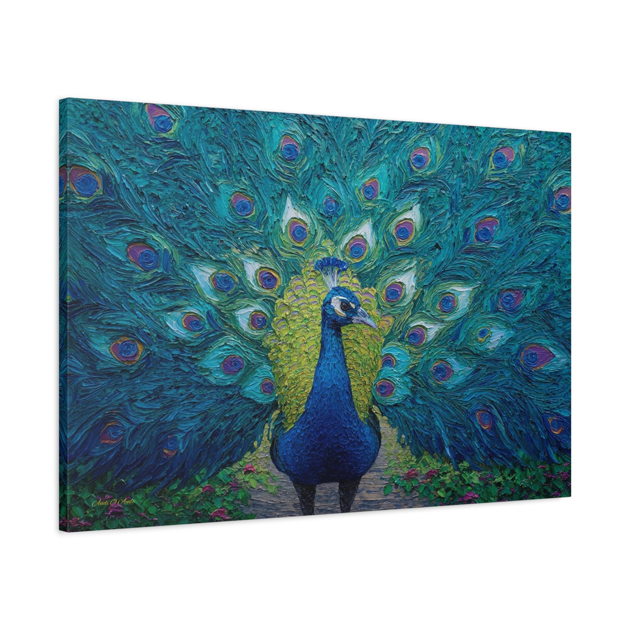 Bring explosive color, regal elegance, and breathtaking maximalist beauty into your home with this stunning majestic peacock canvas print. This captivating horizontal artwork features a magnificent peacock with its tail feathers fully fanned out in a spectacular display. The incredibly rich jewel-toned palette of sapphire blues, emerald greens, iridescent teals, and touches of gold pops brilliantly, drawing the eye to the intricate "eyes" of every single feather.