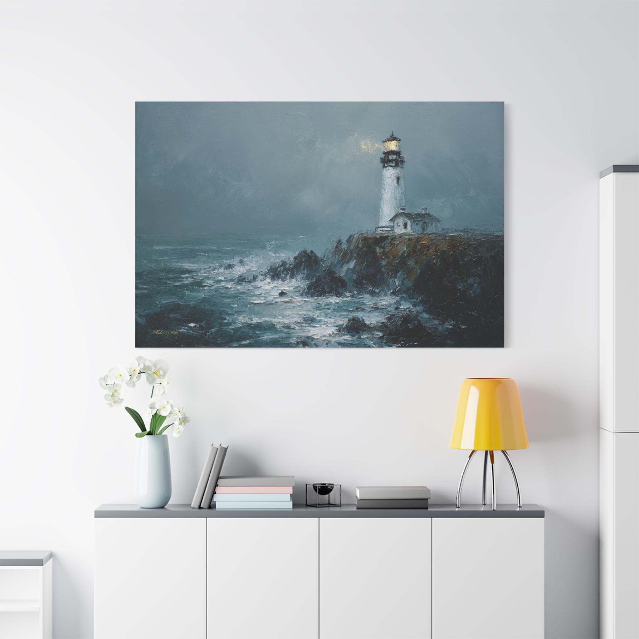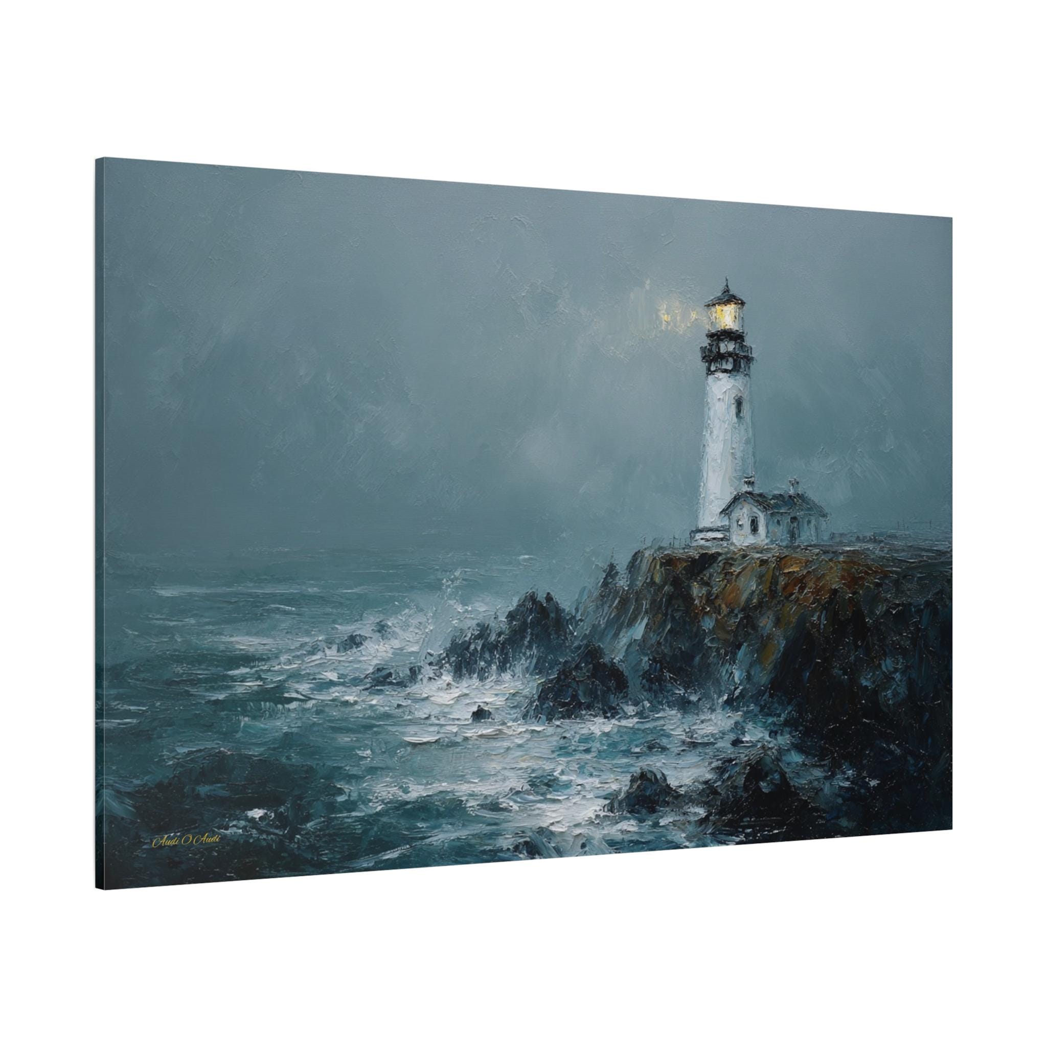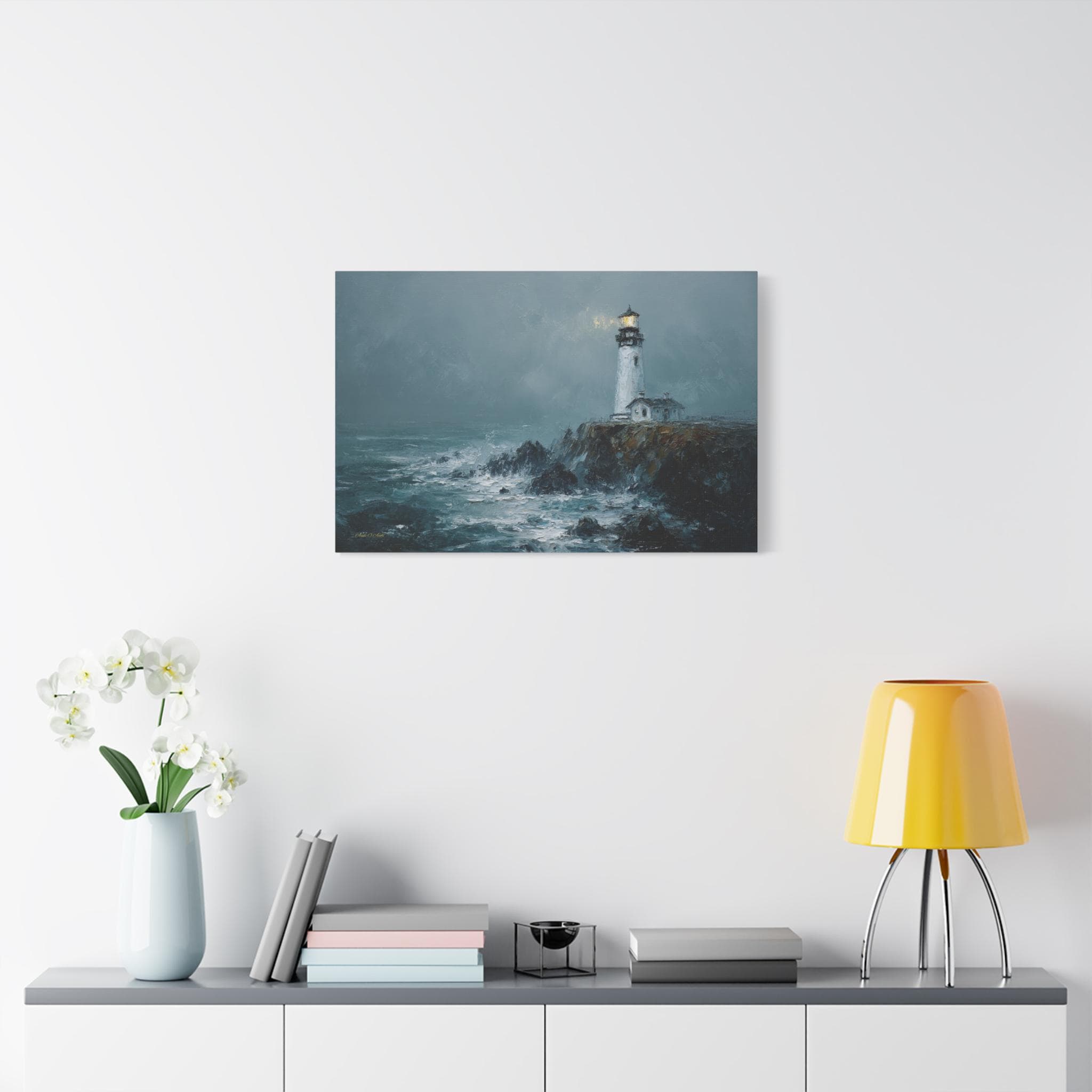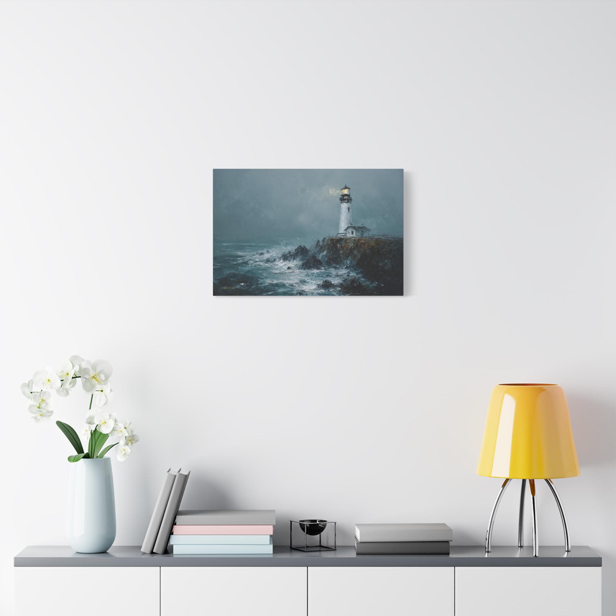 Bring the raw power, dramatic beauty, and moody atmosphere of the untamed ocean into your home with this stunning misty lighthouse canvas print. This captivating horizontal artwork features a solitary, steadfast white lighthouse perched on the edge of a rugged, dark cliff. Turbulent, white-capped waves crash against the rocks below, while a warm, golden light beams from the lantern room, cutting beautifully through the heavy, grey sea mist.