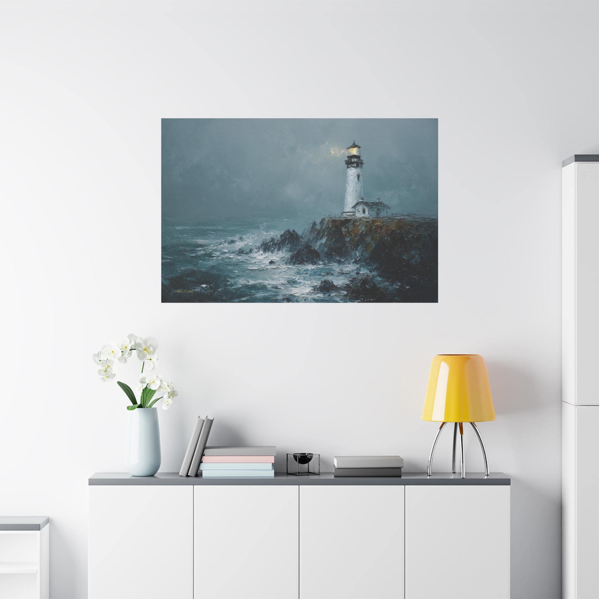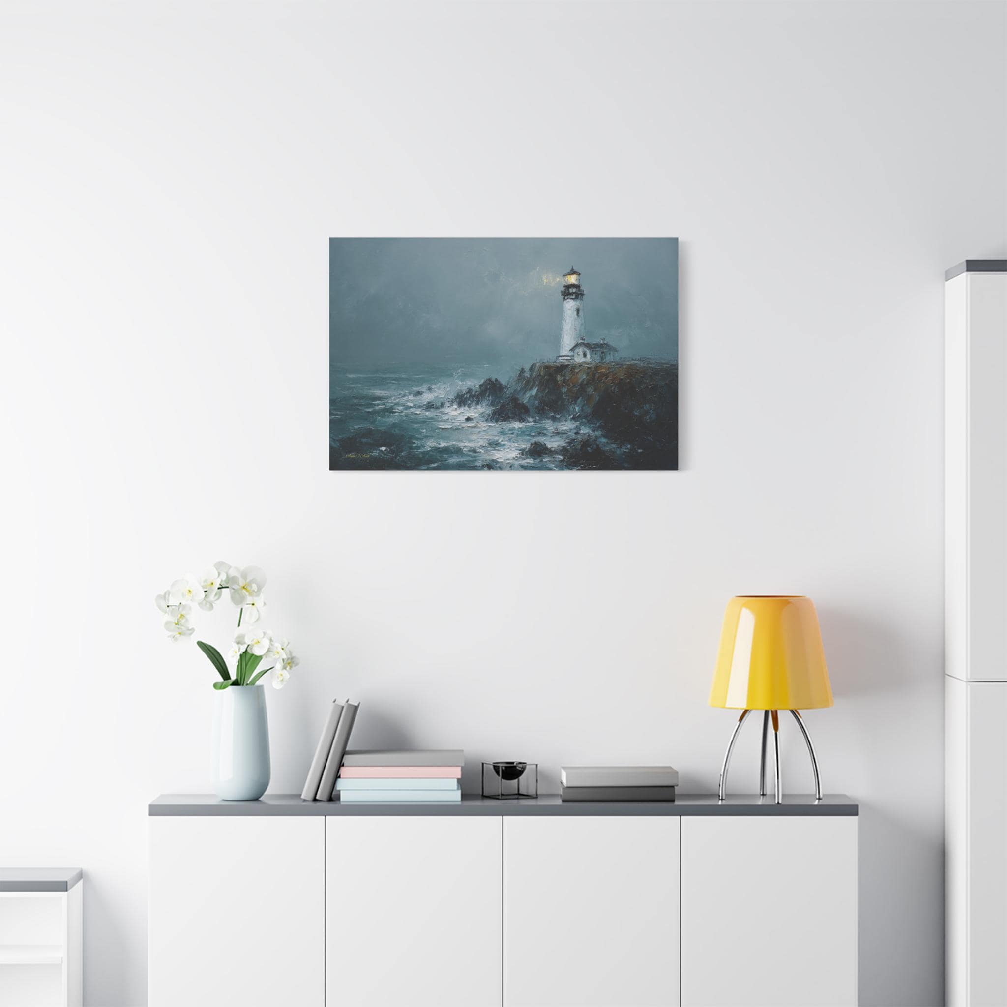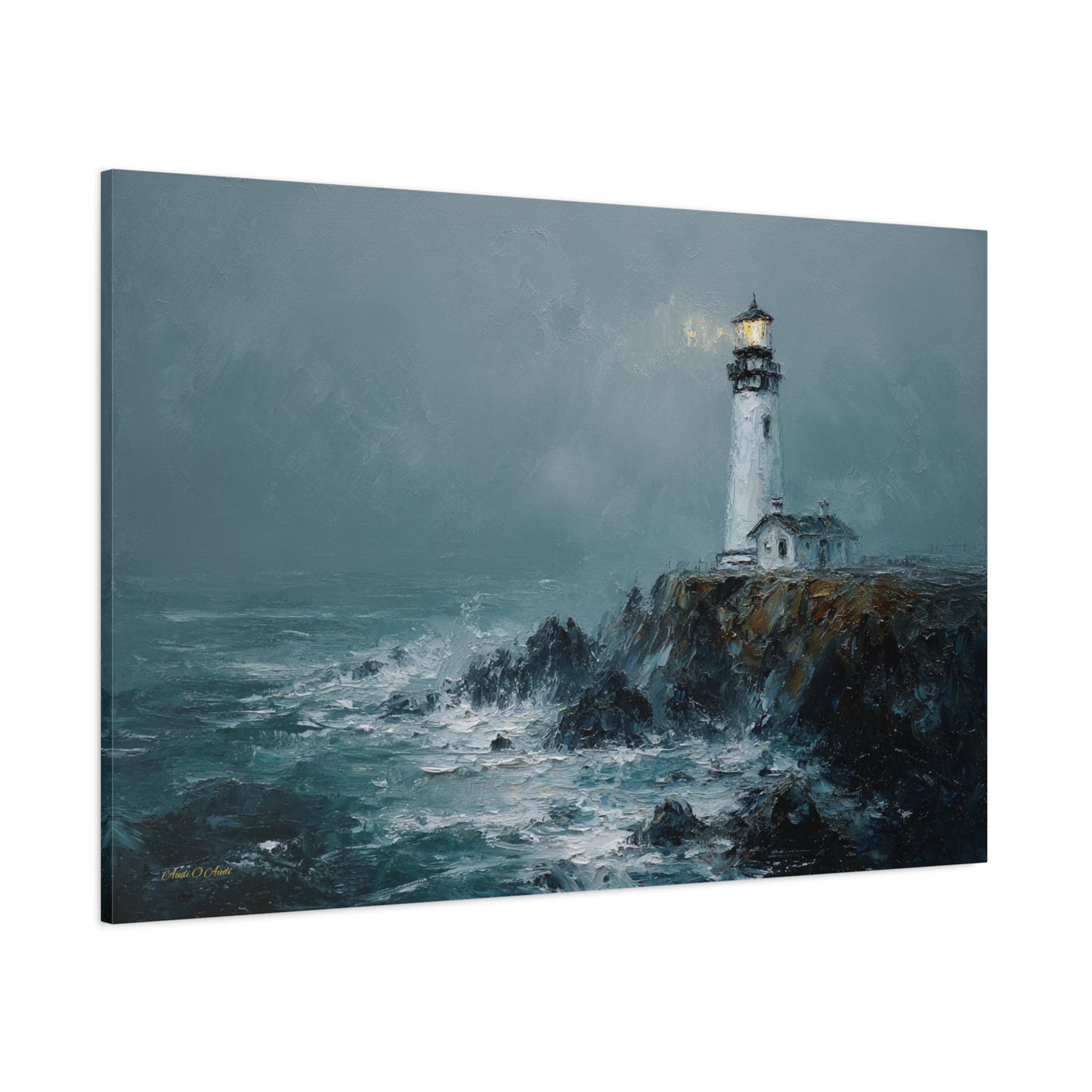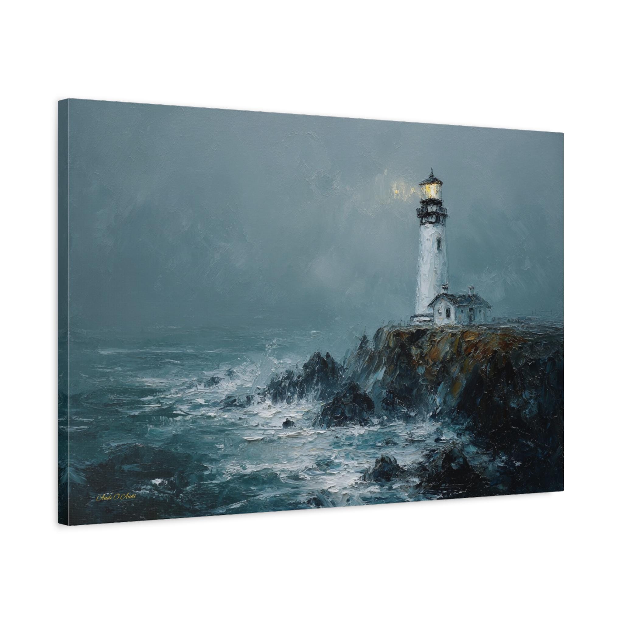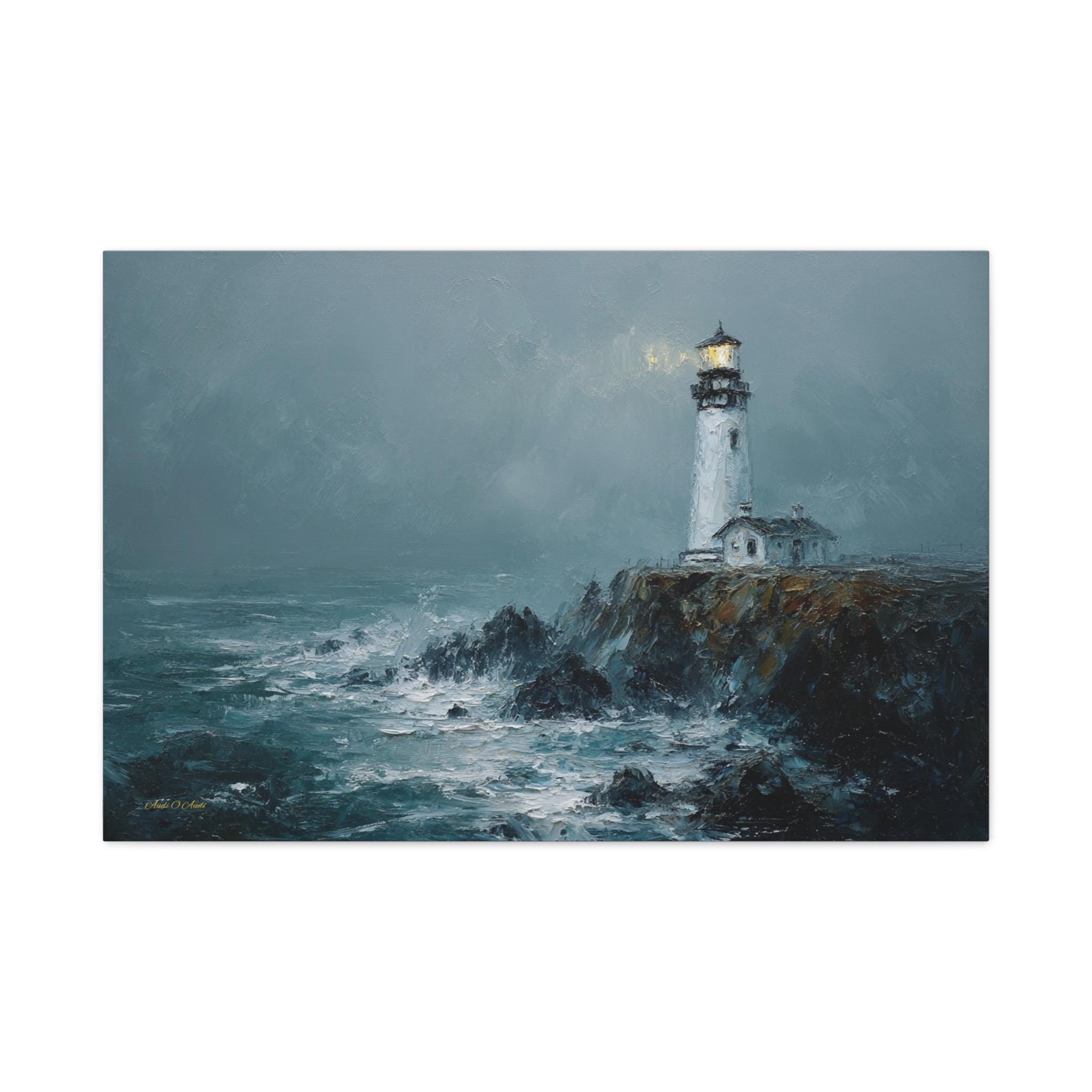Bring the raw power, dramatic beauty, and moody atmosphere of the untamed ocean into your home with this stunning misty lighthouse canvas print. This captivating horizontal artwork features a solitary, steadfast white lighthouse perched on the edge of a rugged, dark cliff. Turbulent, white-capped waves crash against the rocks below, while a warm, golden light beams from the lantern room, cutting beautifully through the heavy, grey sea mist.