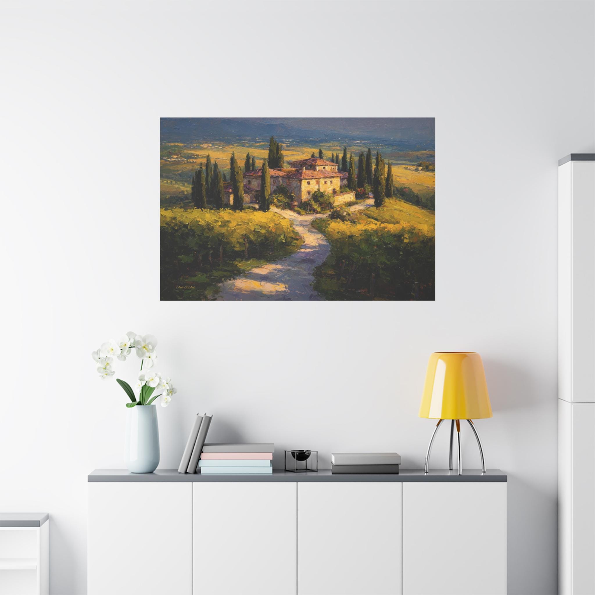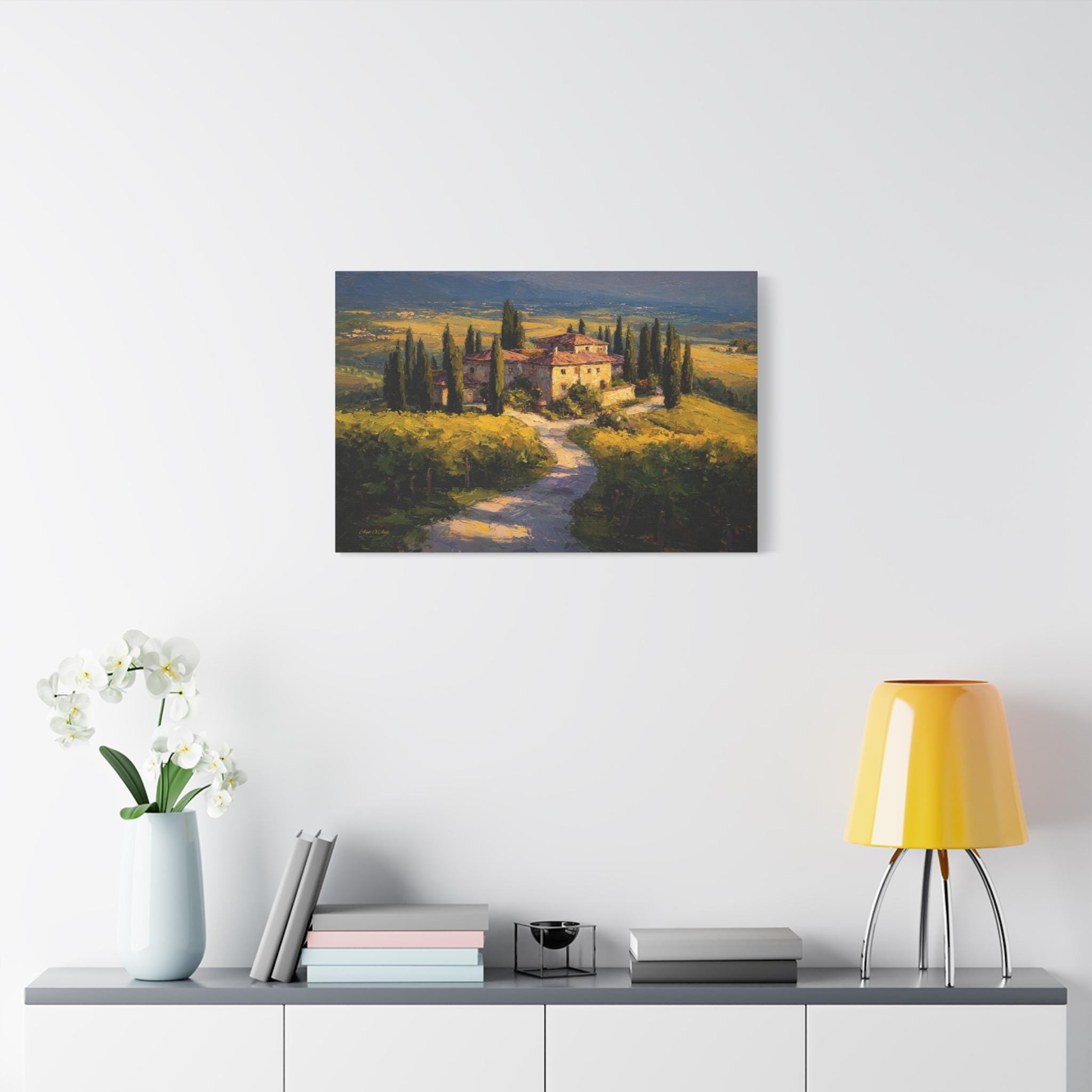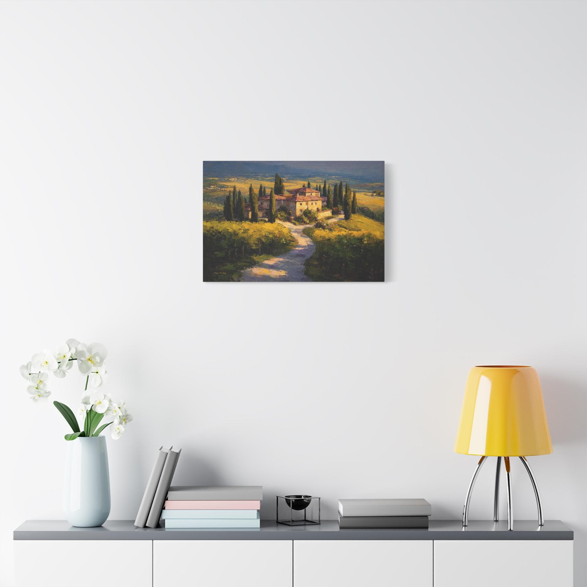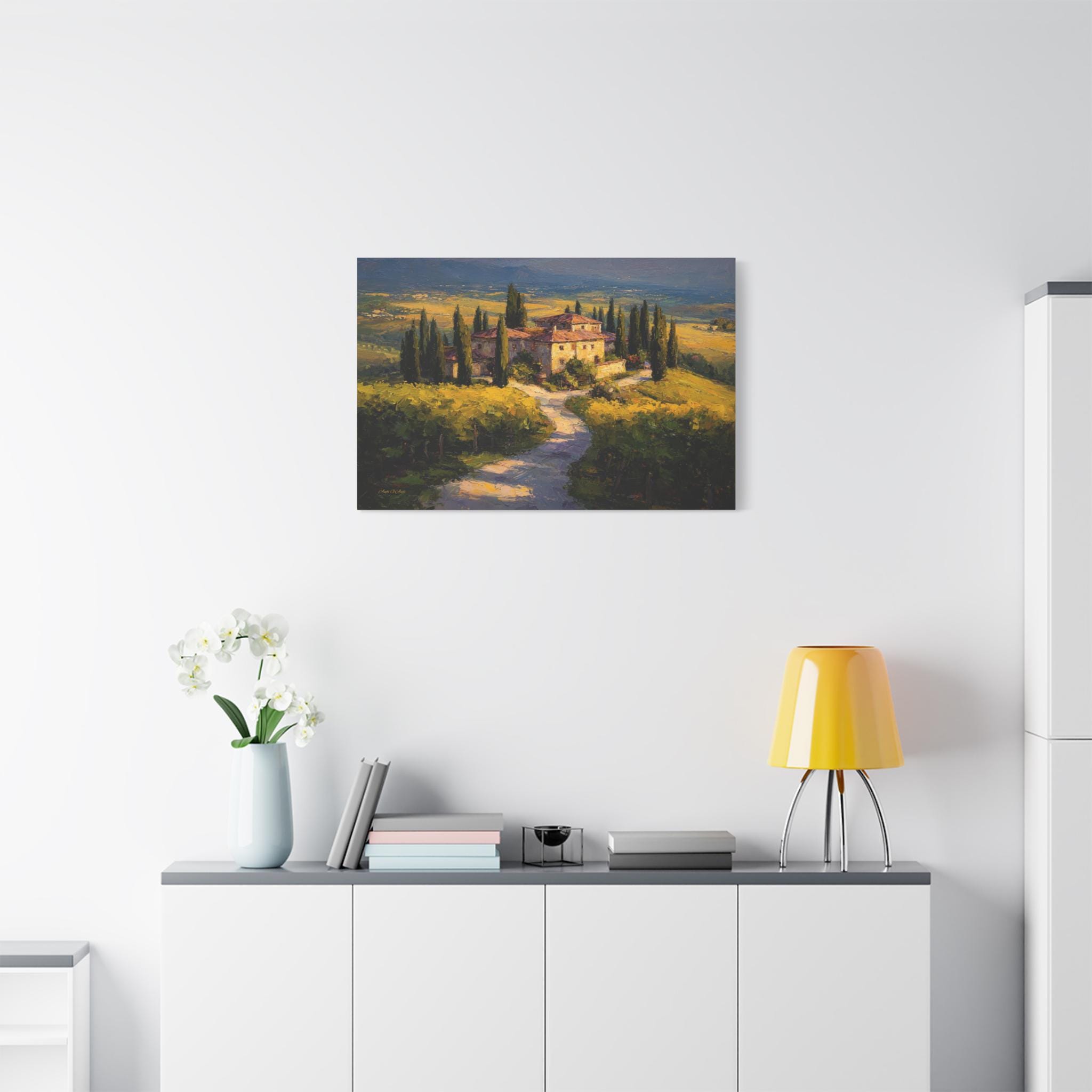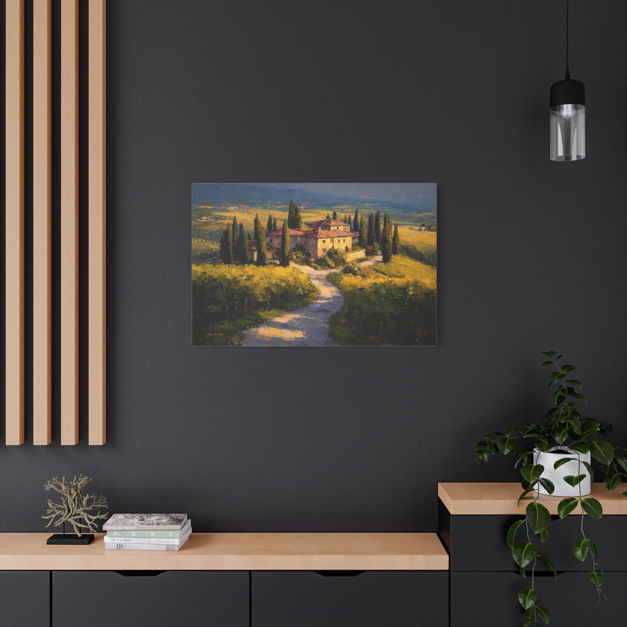 Bring the romantic beauty, sun-drenched warmth, and timeless elegance of the Italian countryside into your home with this stunning Tuscan landscape canvas print. This captivating horizontal artwork features a magnificent rustic stone villa nestled among rolling golden hills and lush green vineyards. A winding path lined with towering, iconic cypress trees leads the eye through the estate, all bathed in the breathtaking, glowing light of a perfect golden hour sunset.