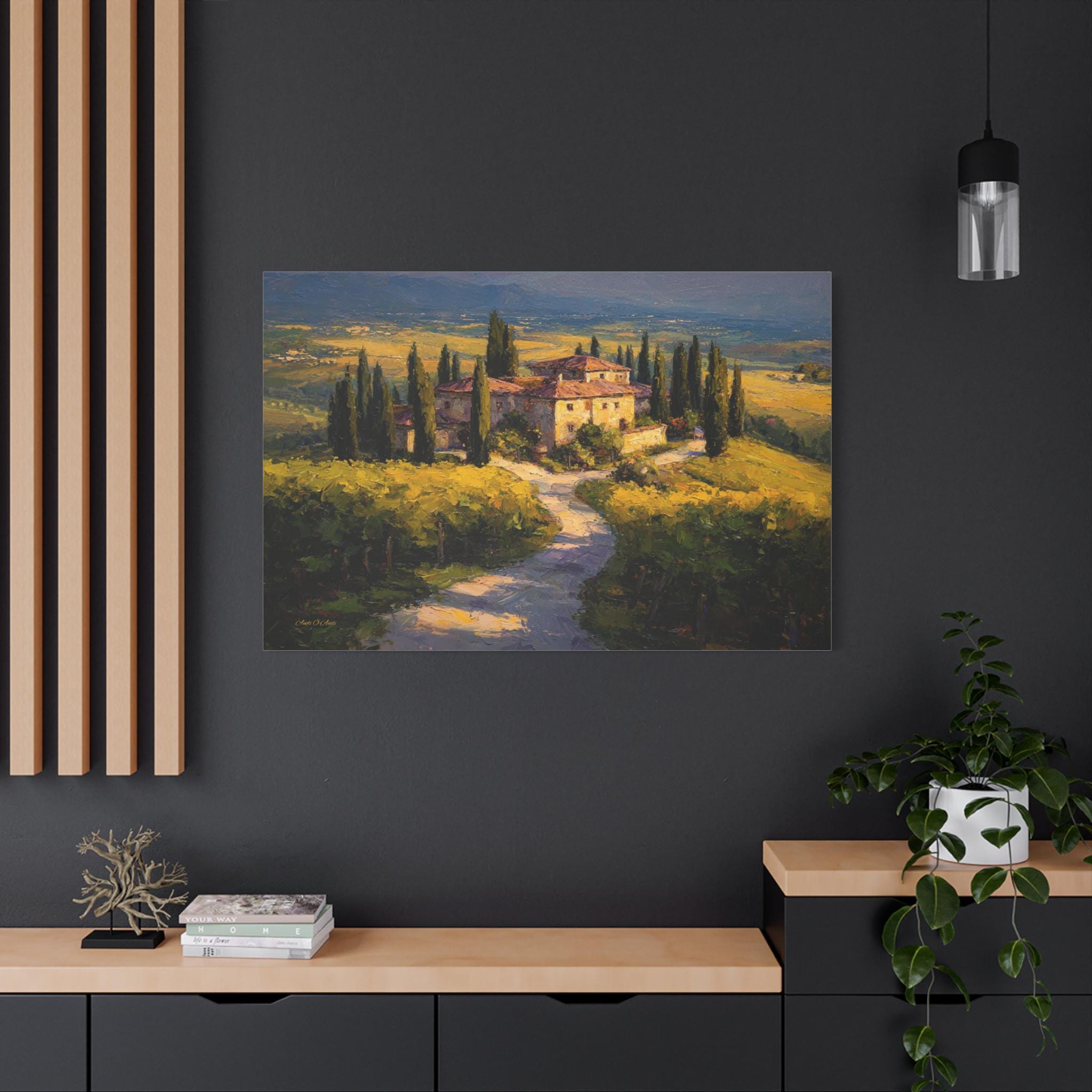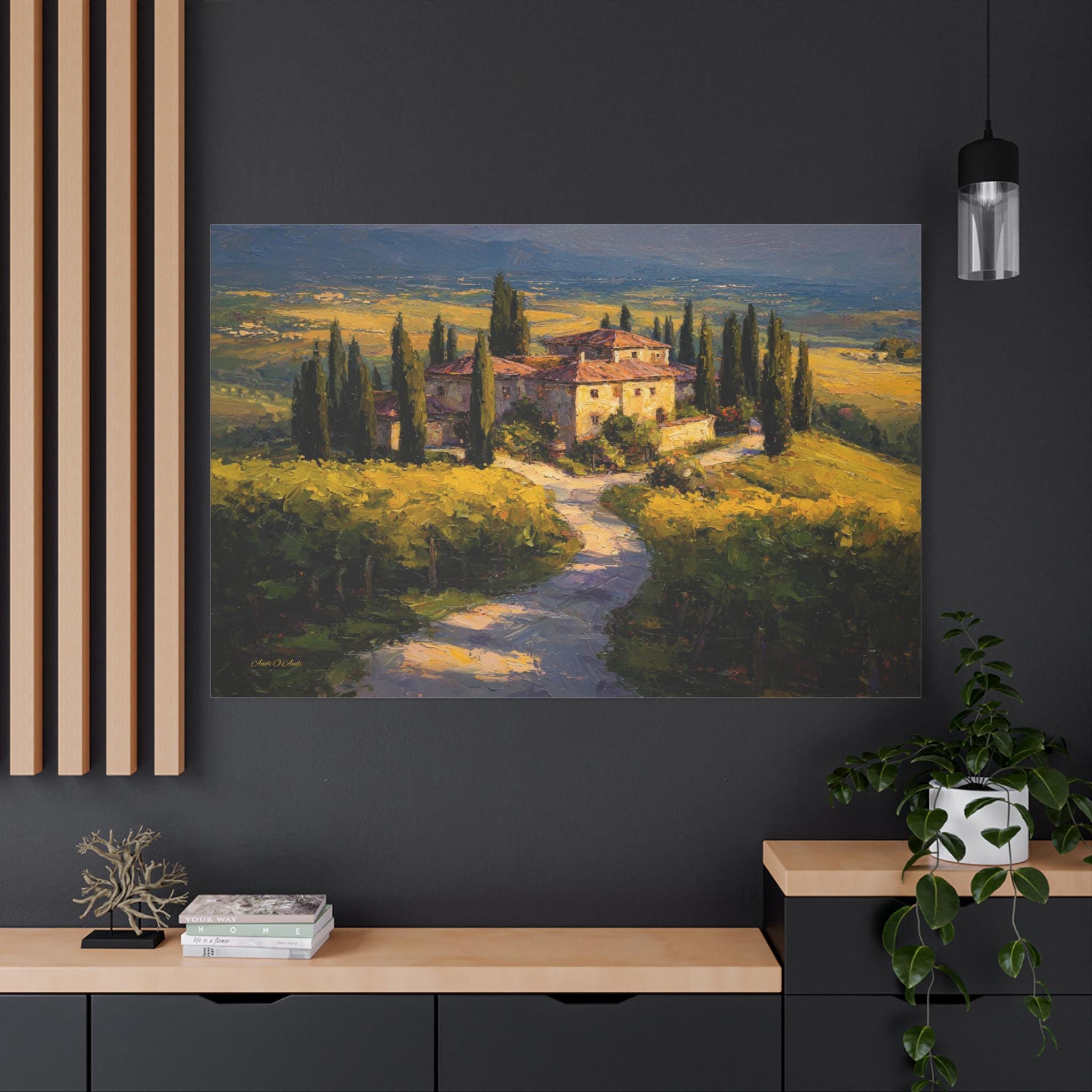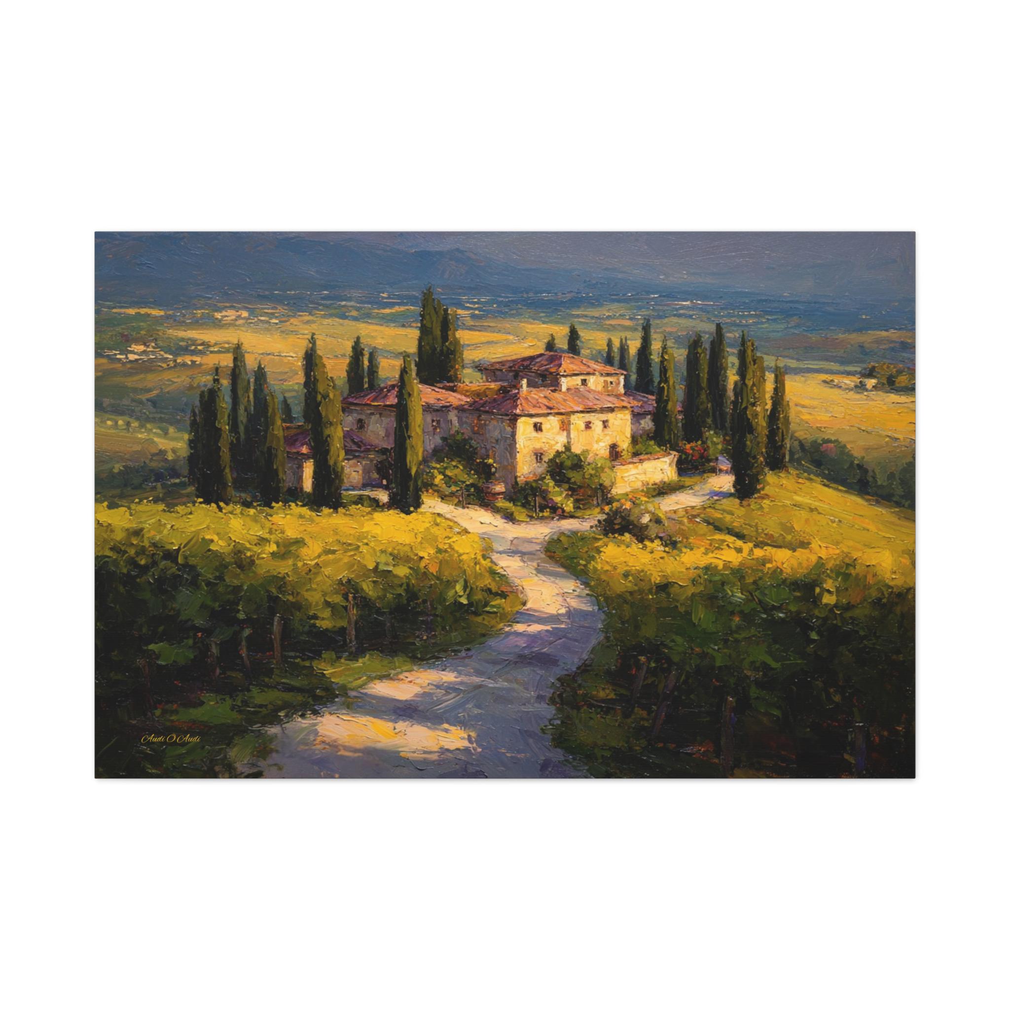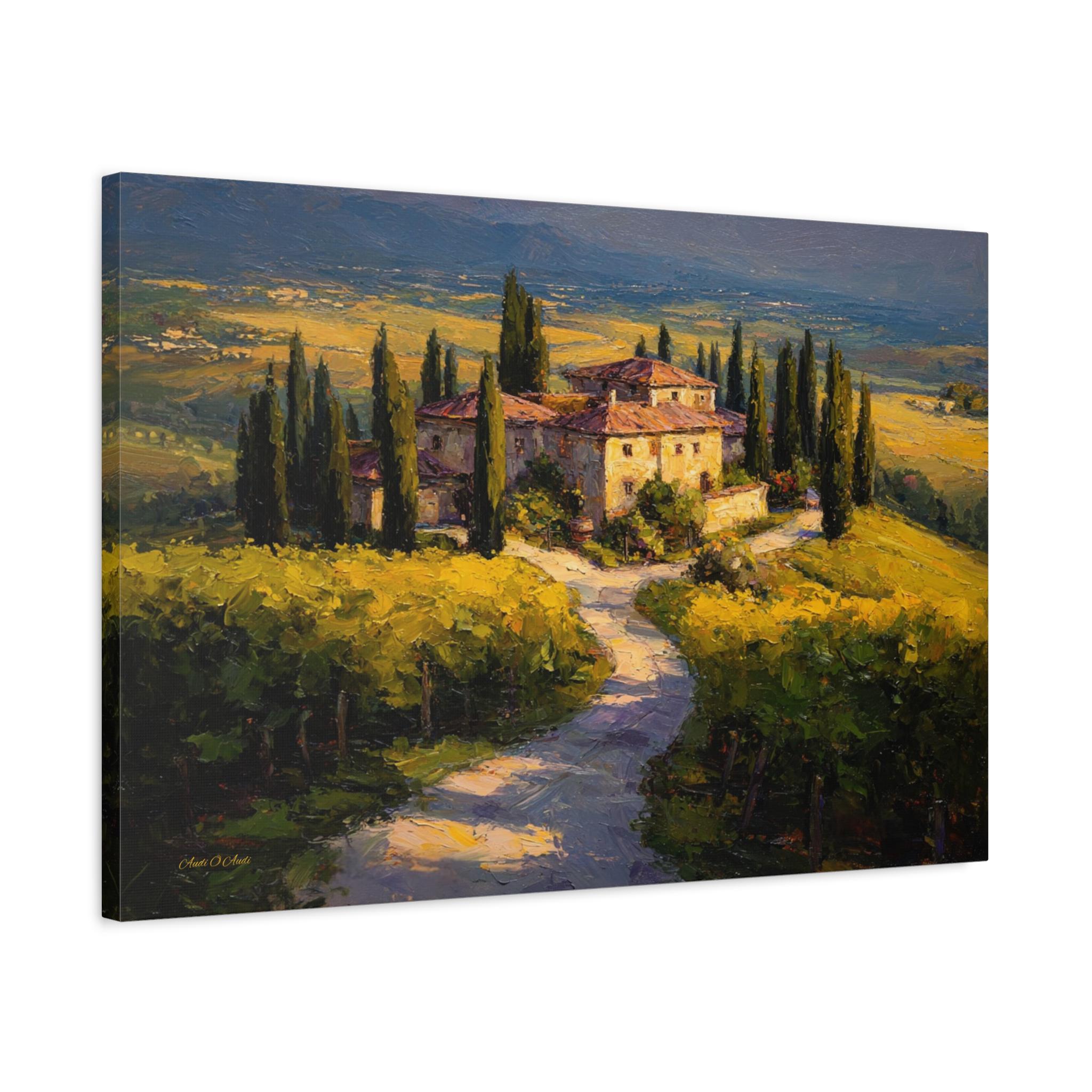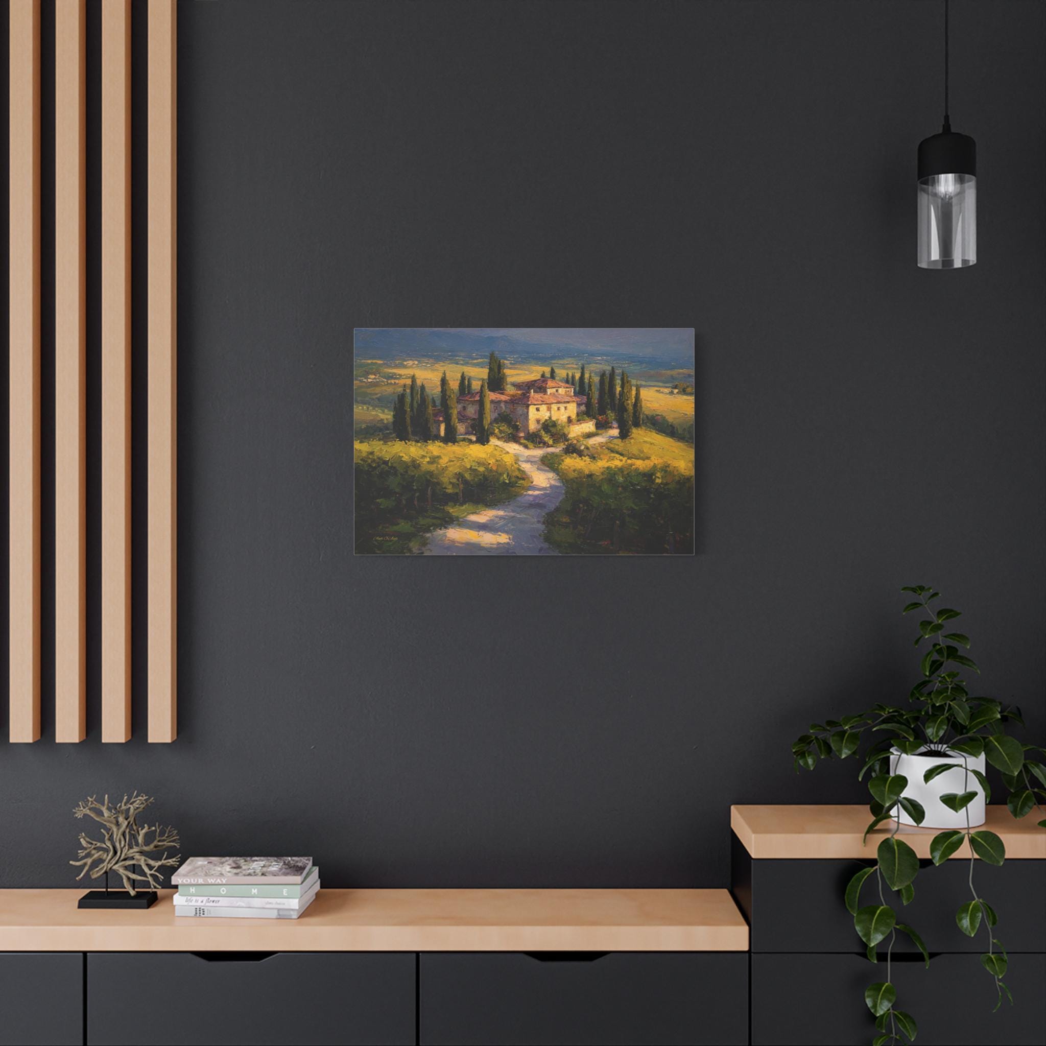 Bring the romantic beauty, sun-drenched warmth, and timeless elegance of the Italian countryside into your home with this stunning Tuscan landscape canvas print. This captivating horizontal artwork features a magnificent rustic stone villa nestled among rolling golden hills and lush green vineyards. A winding path lined with towering, iconic cypress trees leads the eye through the estate, all bathed in the breathtaking, glowing light of a perfect golden hour sunset.
