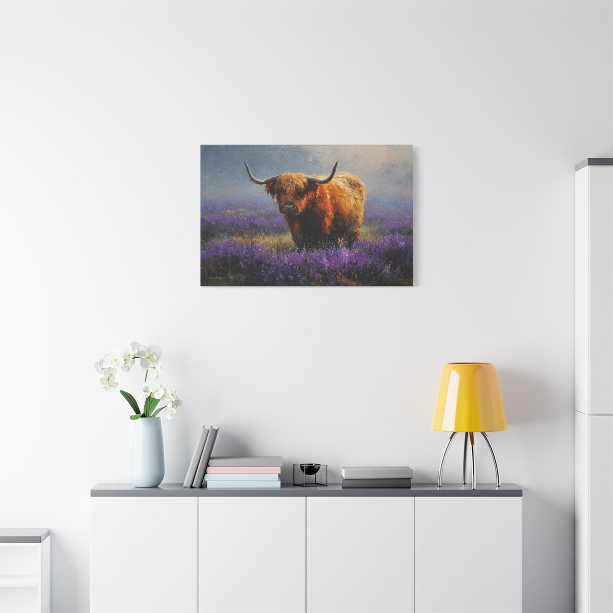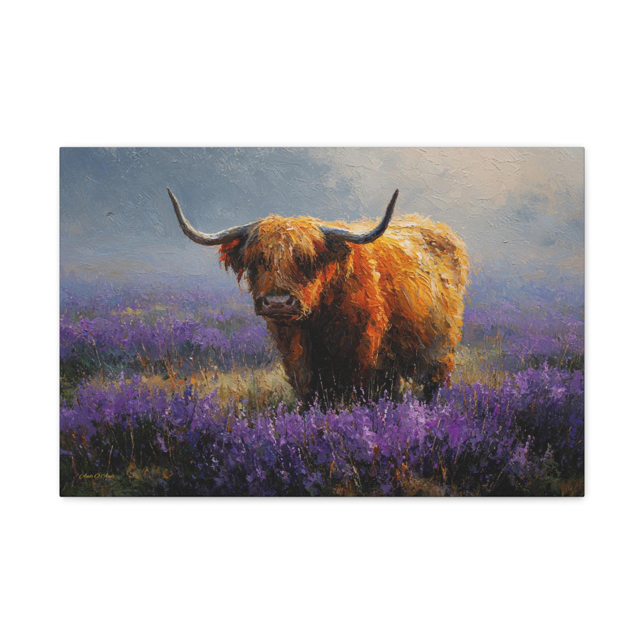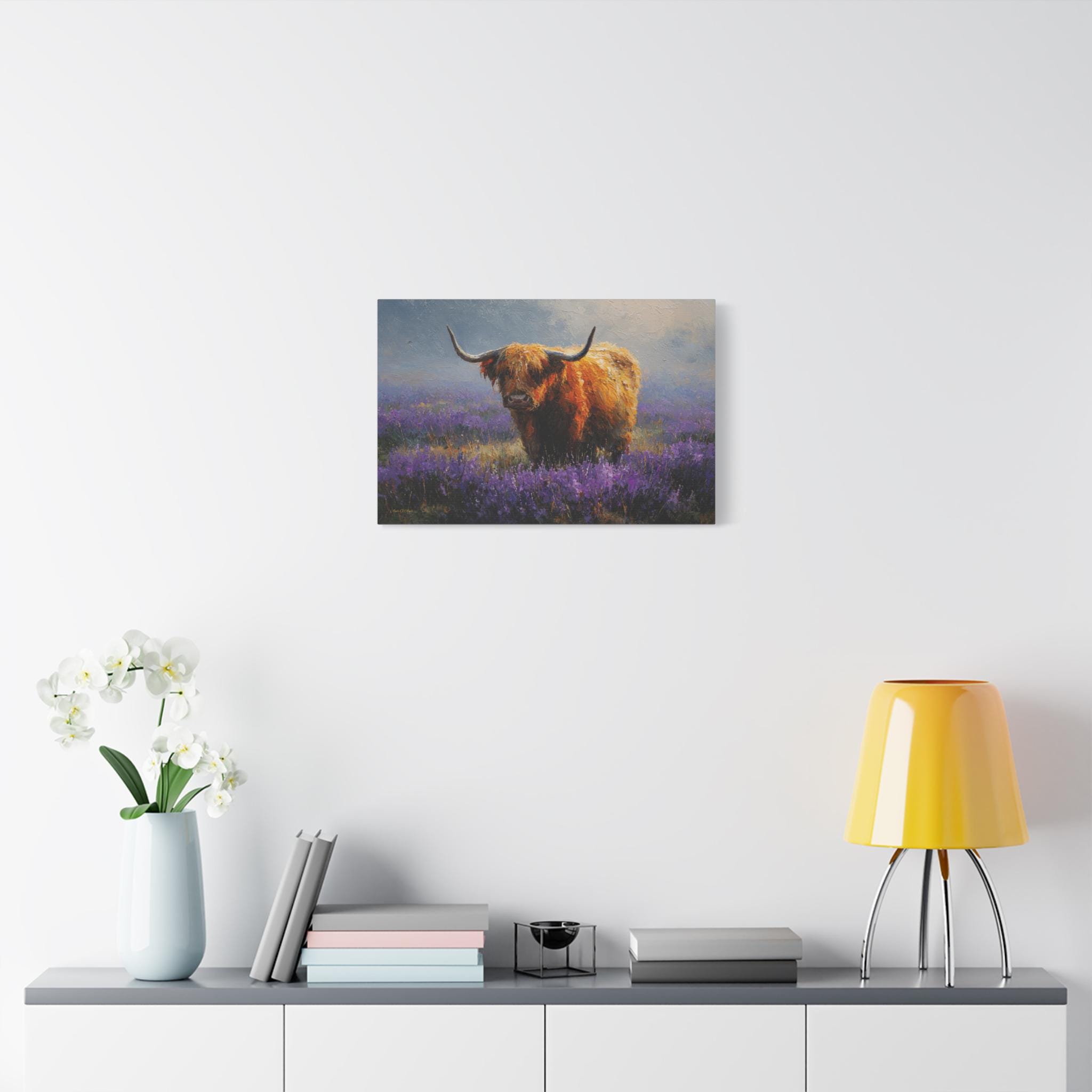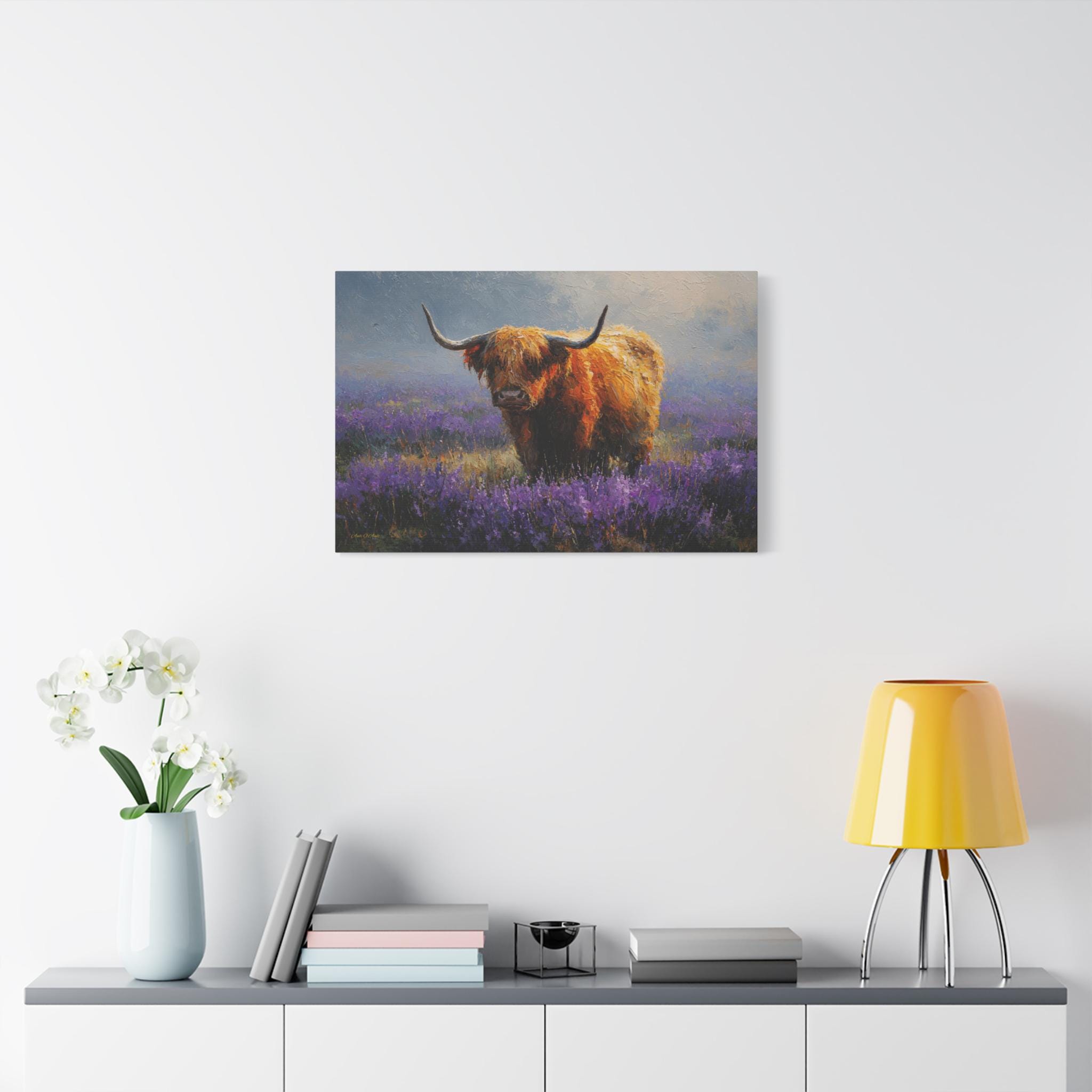 Bring the soulful charm, vibrant color, and rustic elegance of the Scottish countryside into your home with this stunning Highland cow canvas print. This captivating horizontal artwork features a gentle, majestic Highland cow with a glowing, shaggy ginger coat standing peacefully in a misty meadow filled with vibrant purple heather and wildflowers.