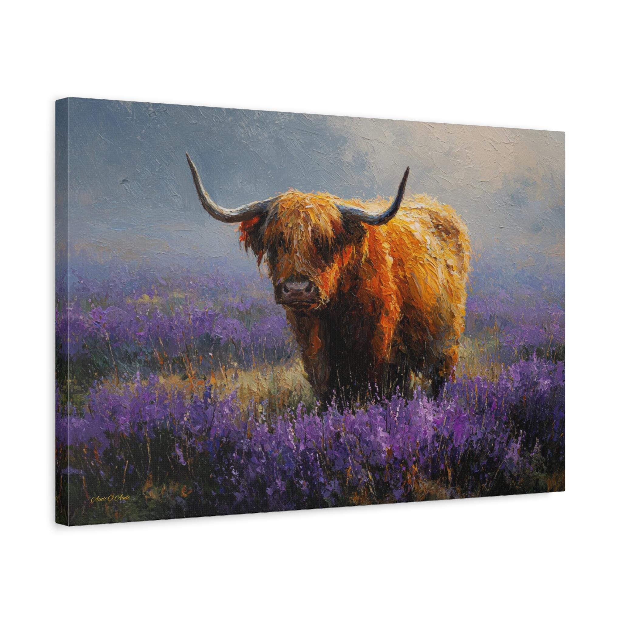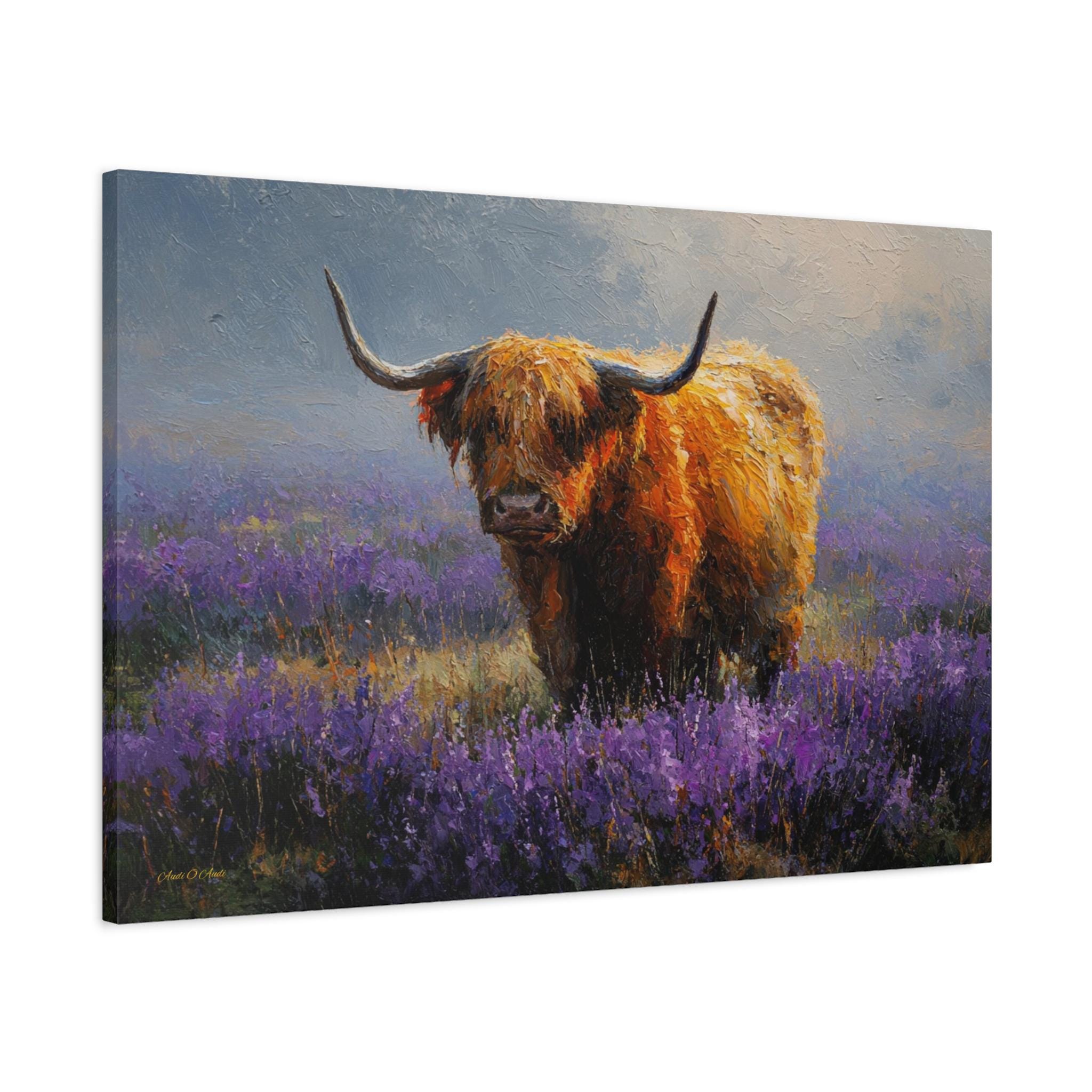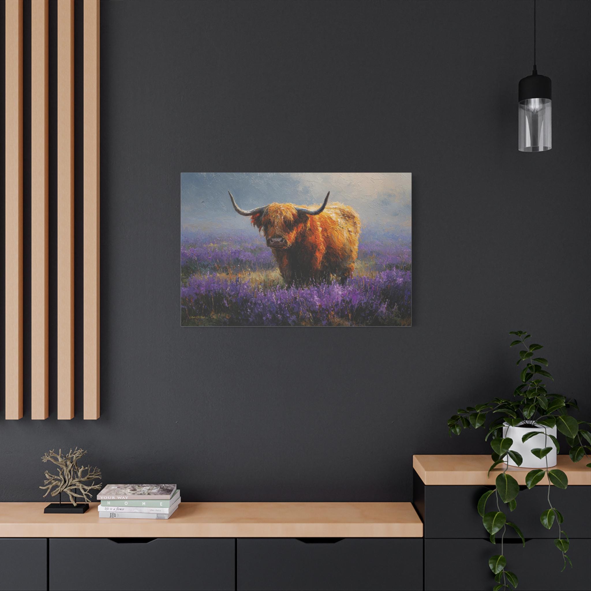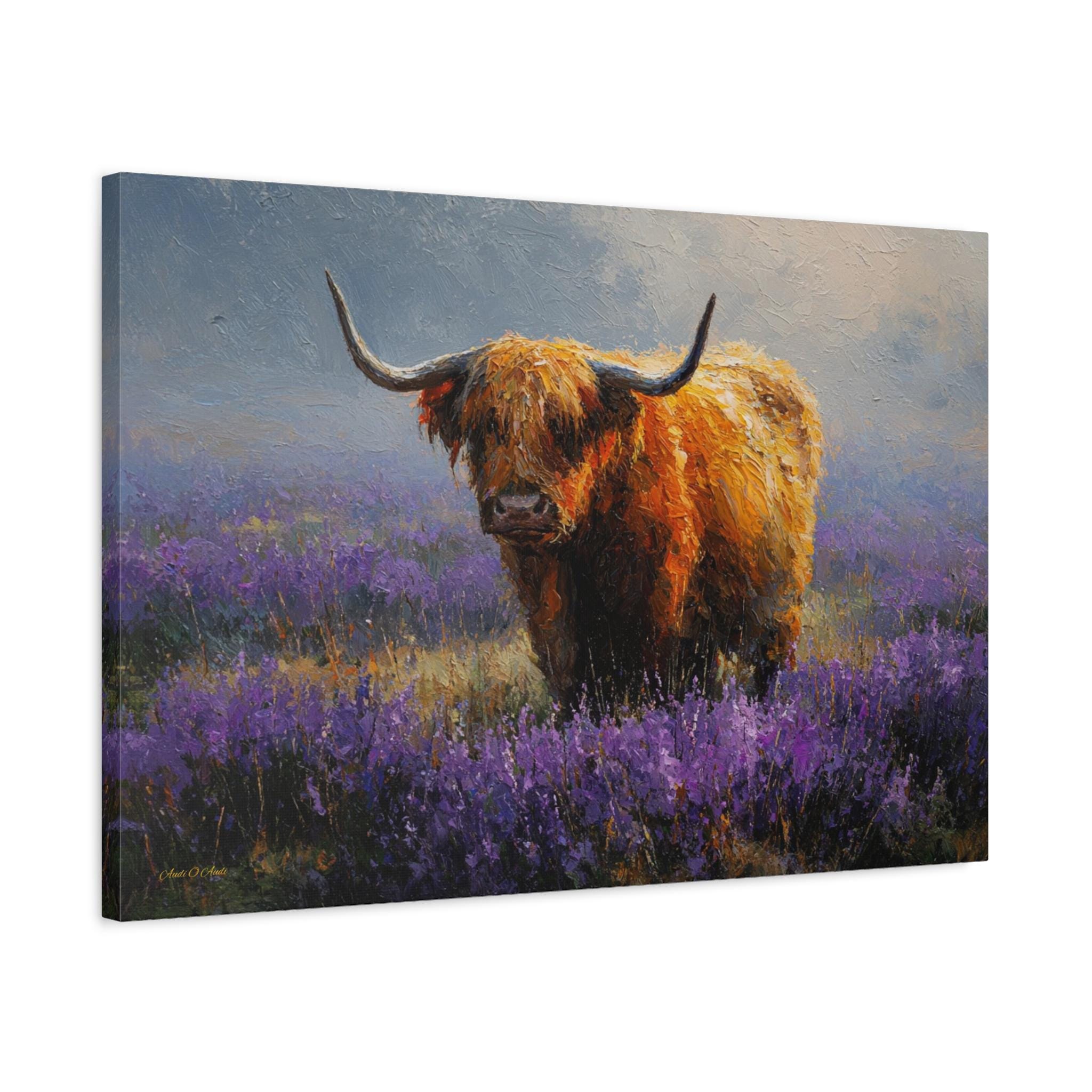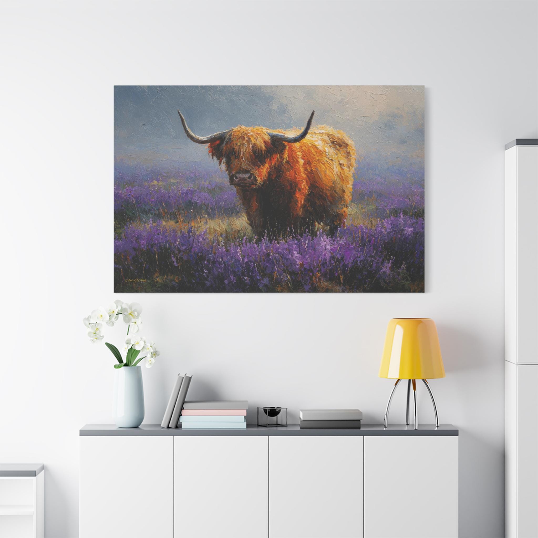 Bring the soulful charm, vibrant color, and rustic elegance of the Scottish countryside into your home with this stunning Highland cow canvas print. This captivating horizontal artwork features a gentle, majestic Highland cow with a glowing, shaggy ginger coat standing peacefully in a misty meadow filled with vibrant purple heather and wildflowers.