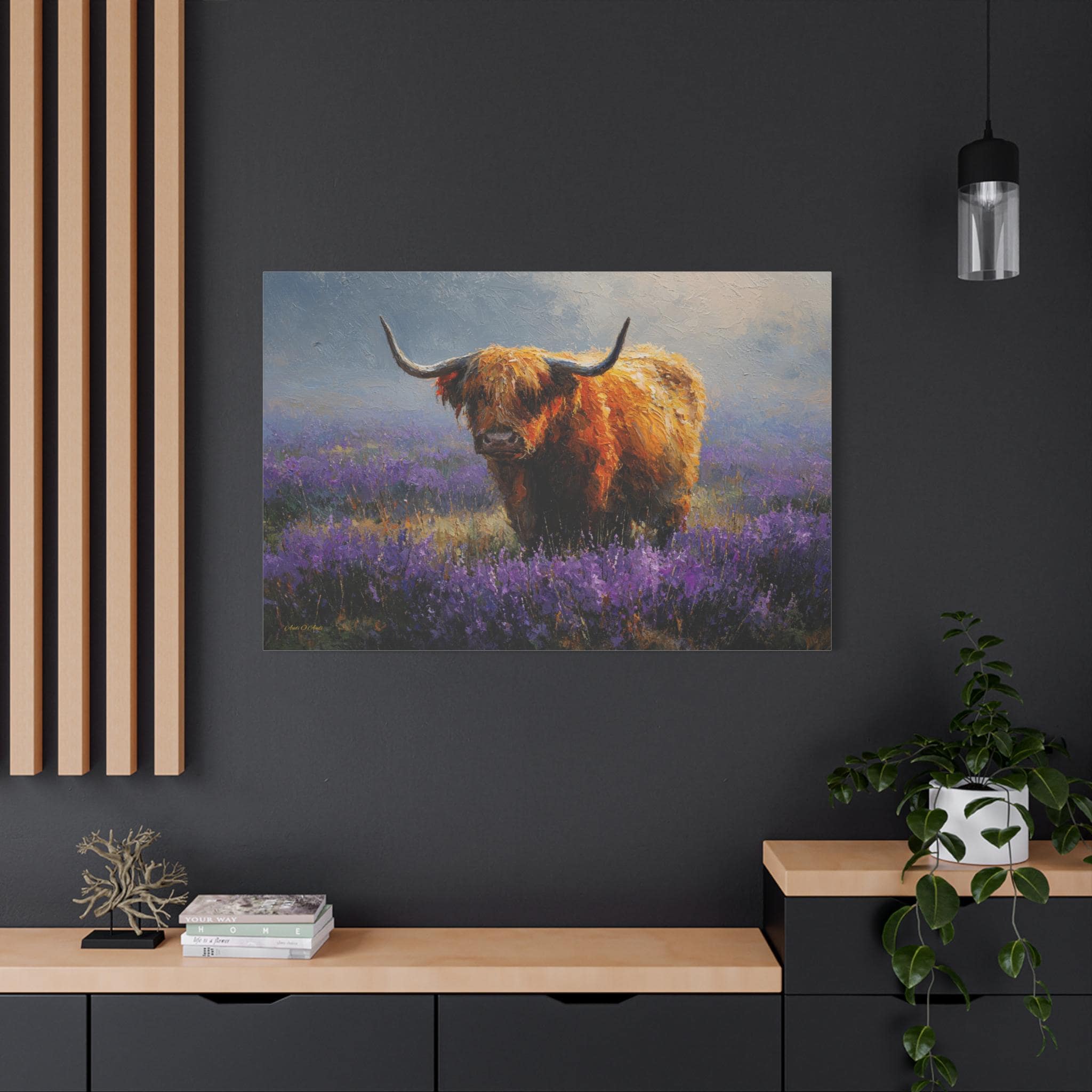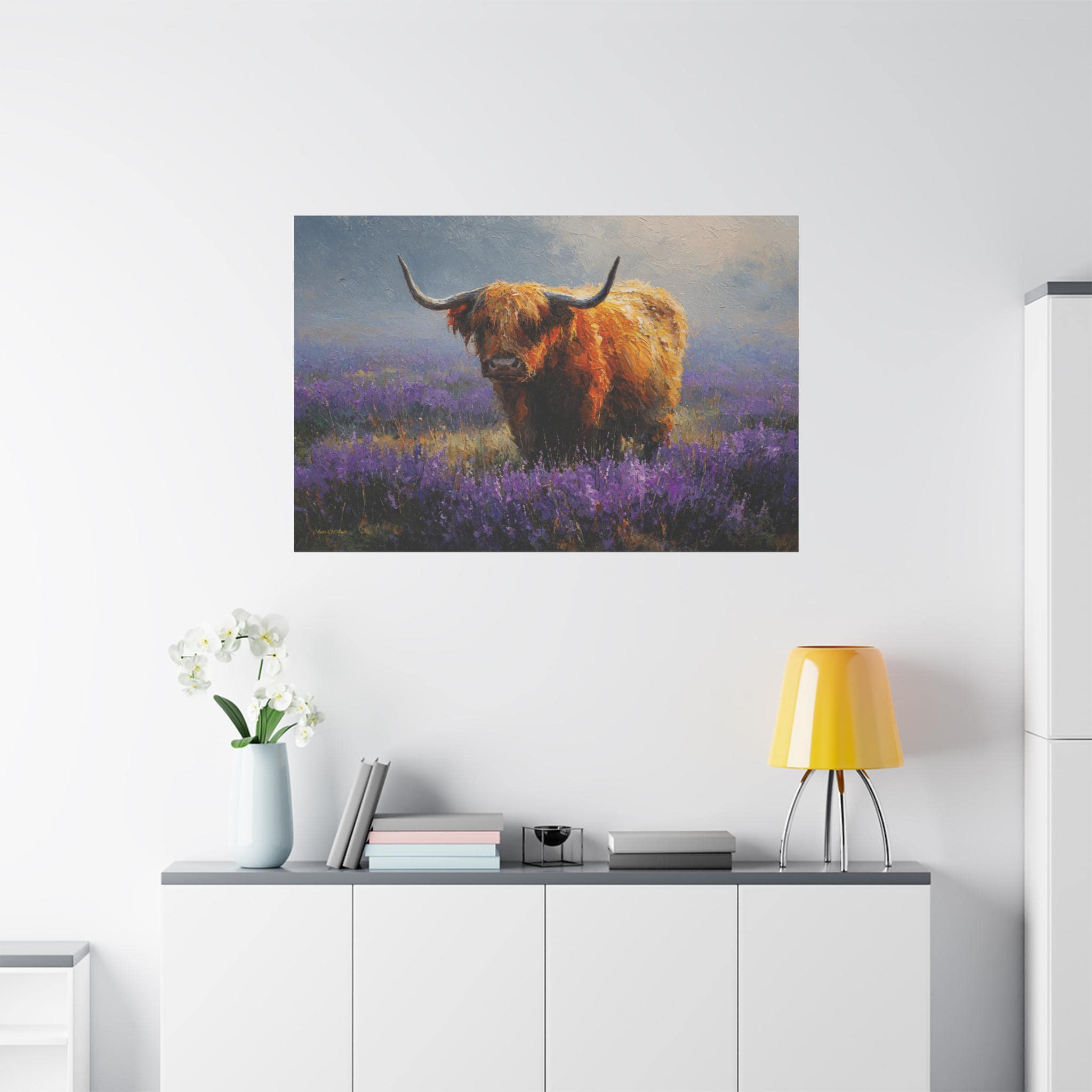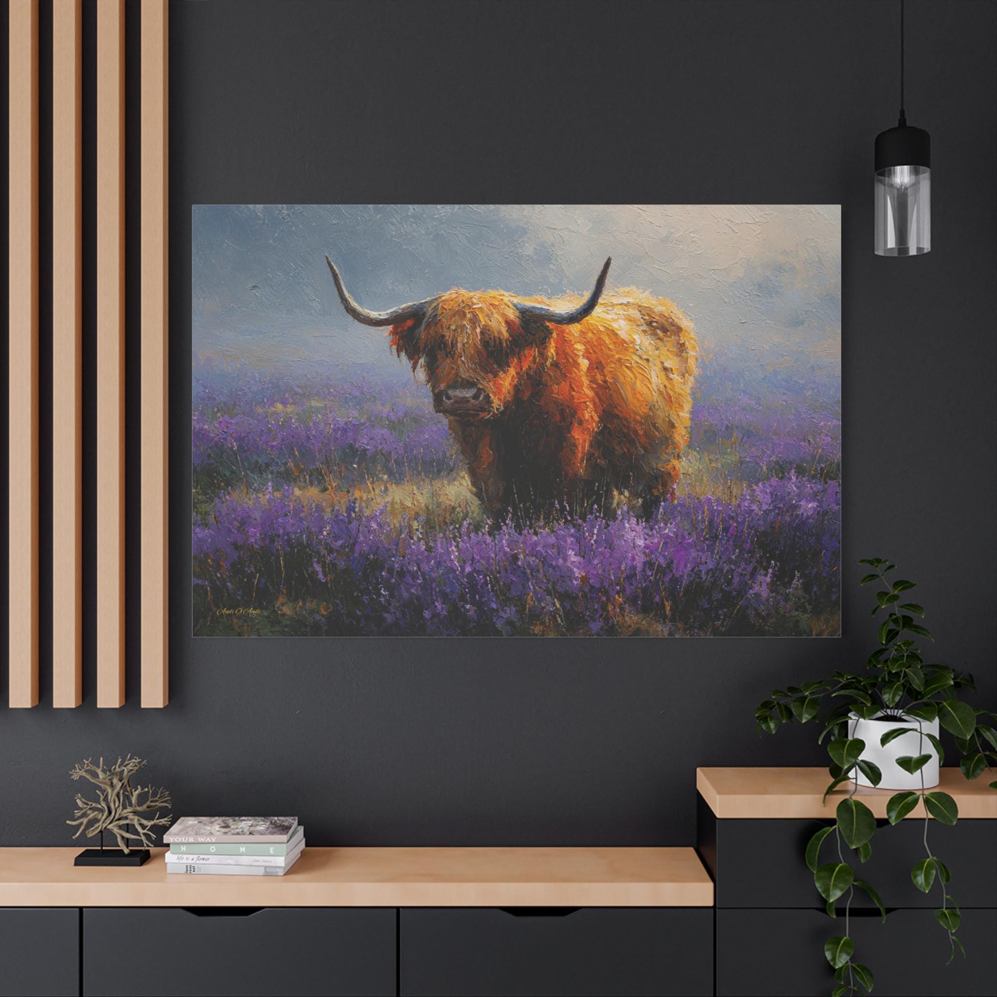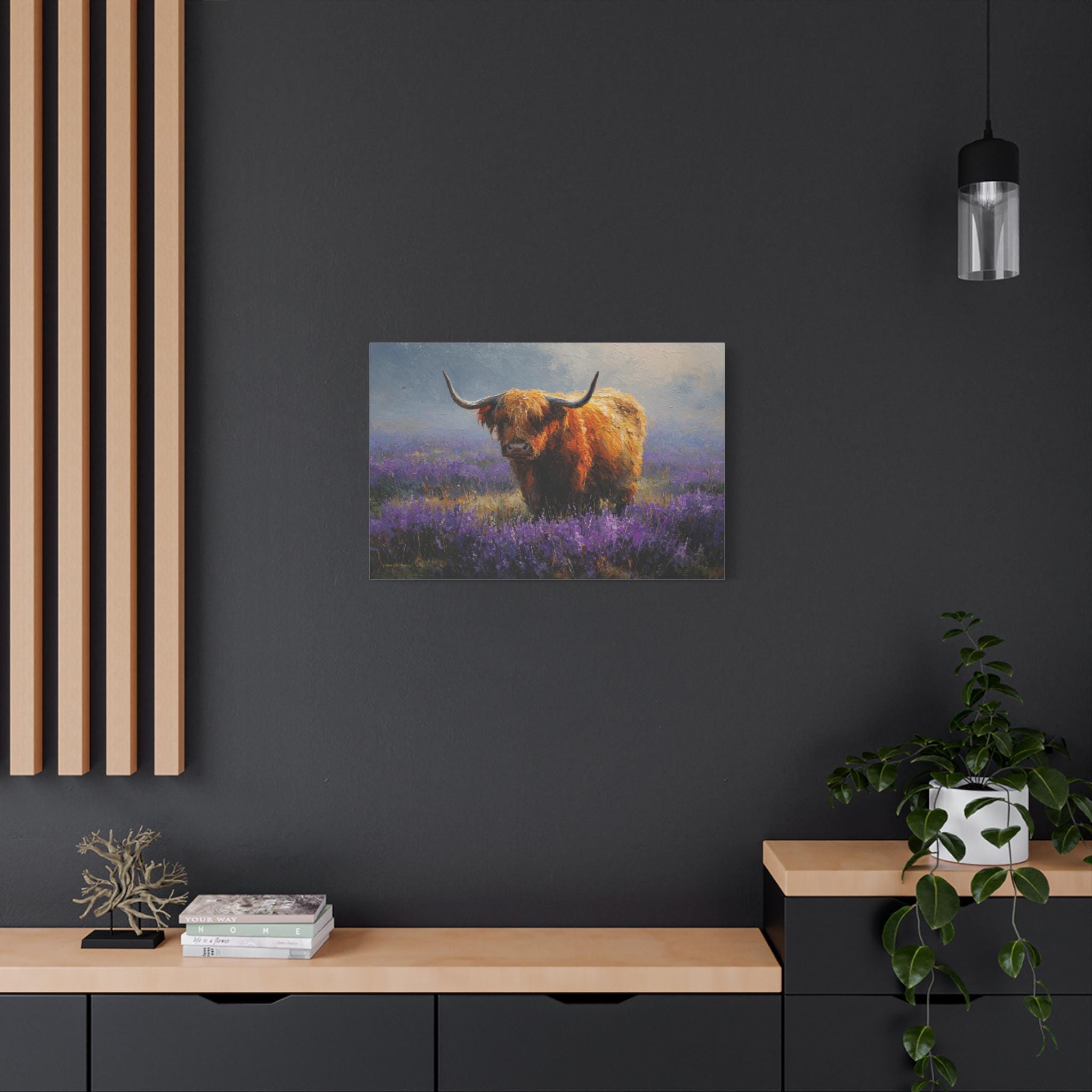 Bring the soulful charm, vibrant color, and rustic elegance of the Scottish countryside into your home with this stunning Highland cow canvas print. This captivating horizontal artwork features a gentle, majestic Highland cow with a glowing, shaggy ginger coat standing peacefully in a misty meadow filled with vibrant purple heather and wildflowers.