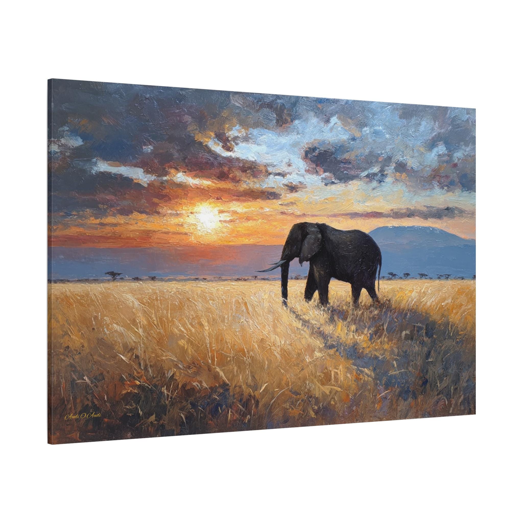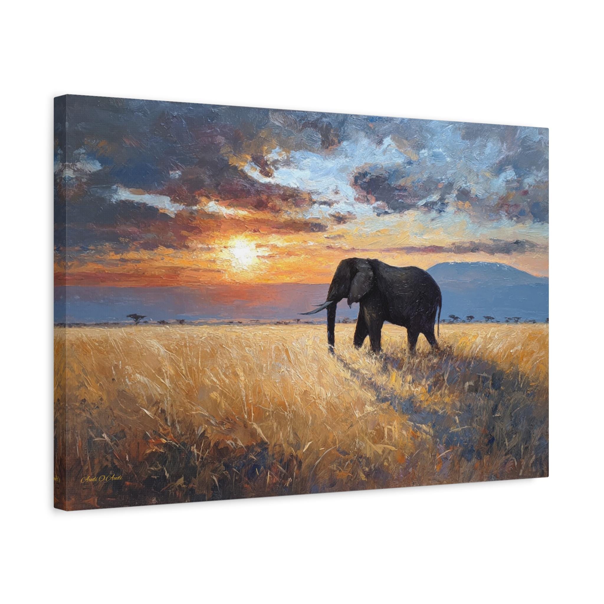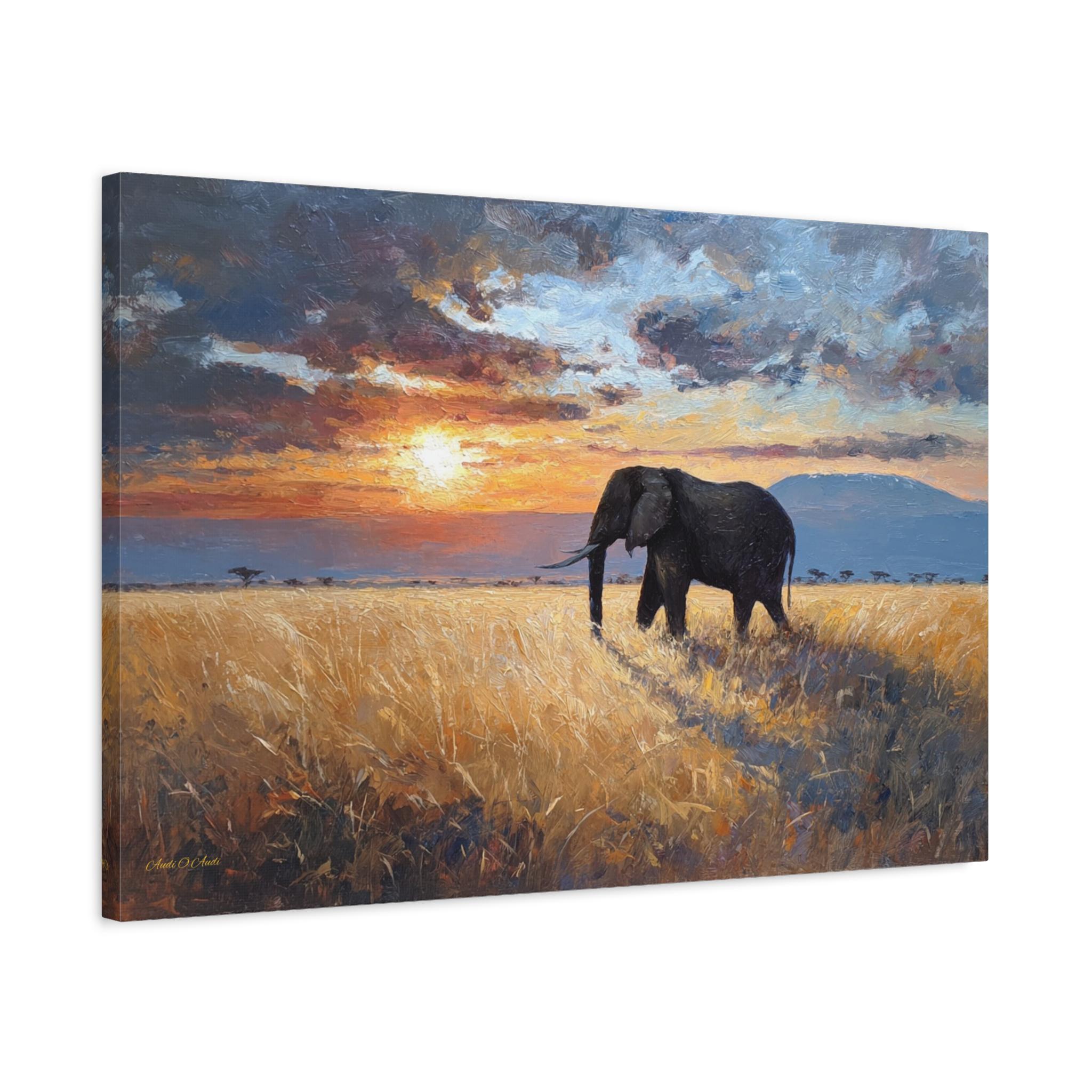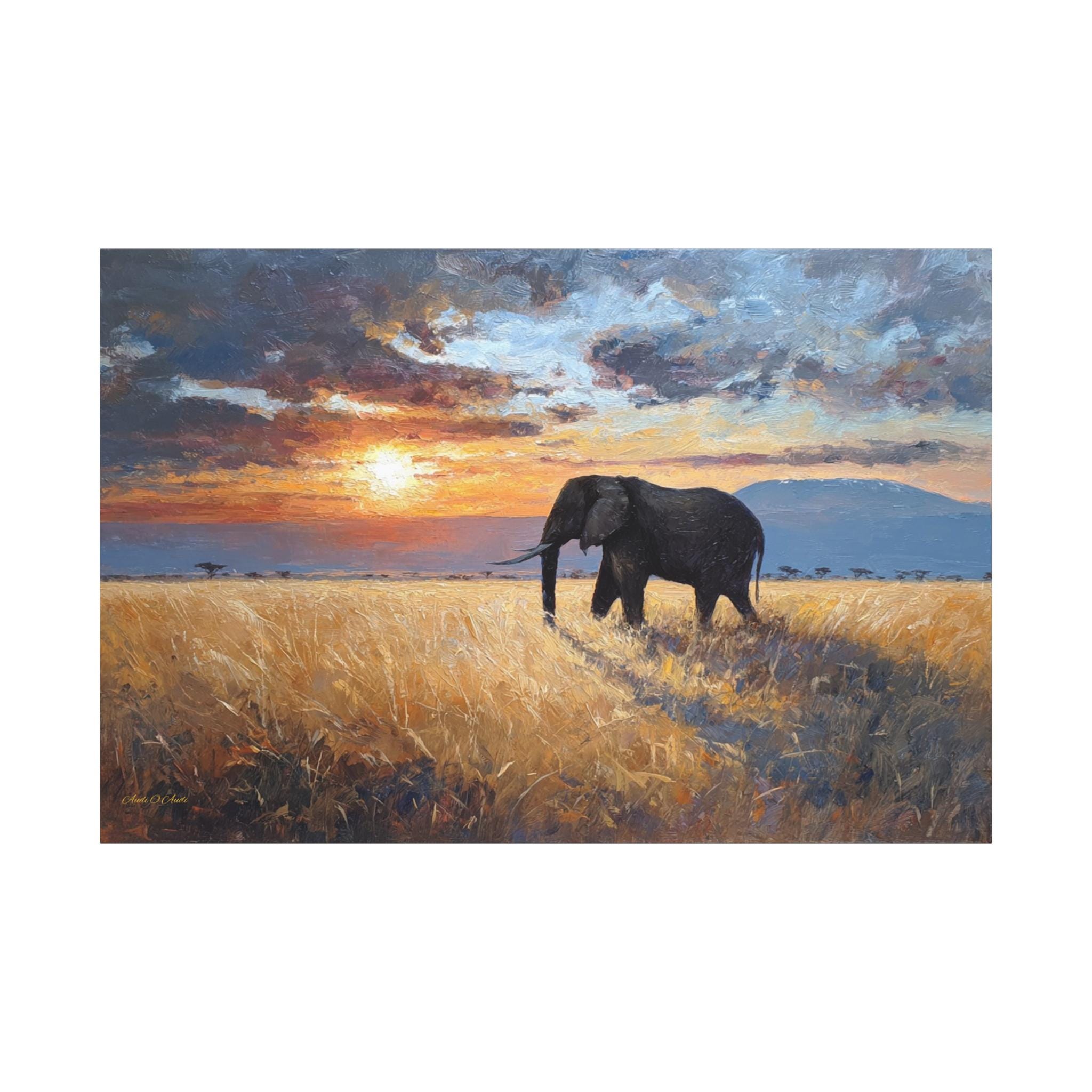 Bring the awe-inspiring majesty, untamed beauty, and radiant warmth of the African savanna into your home with this stunning elephant landscape canvas print. This captivating horizontal artwork features a magnificent, solitary African elephant walking through a field of golden, sun-drenched tall grass. In the background, the distant silhouette of Mount Kilimanjaro rests beneath a dramatic, heavy sky illuminated by a fiery, glowing sunset.