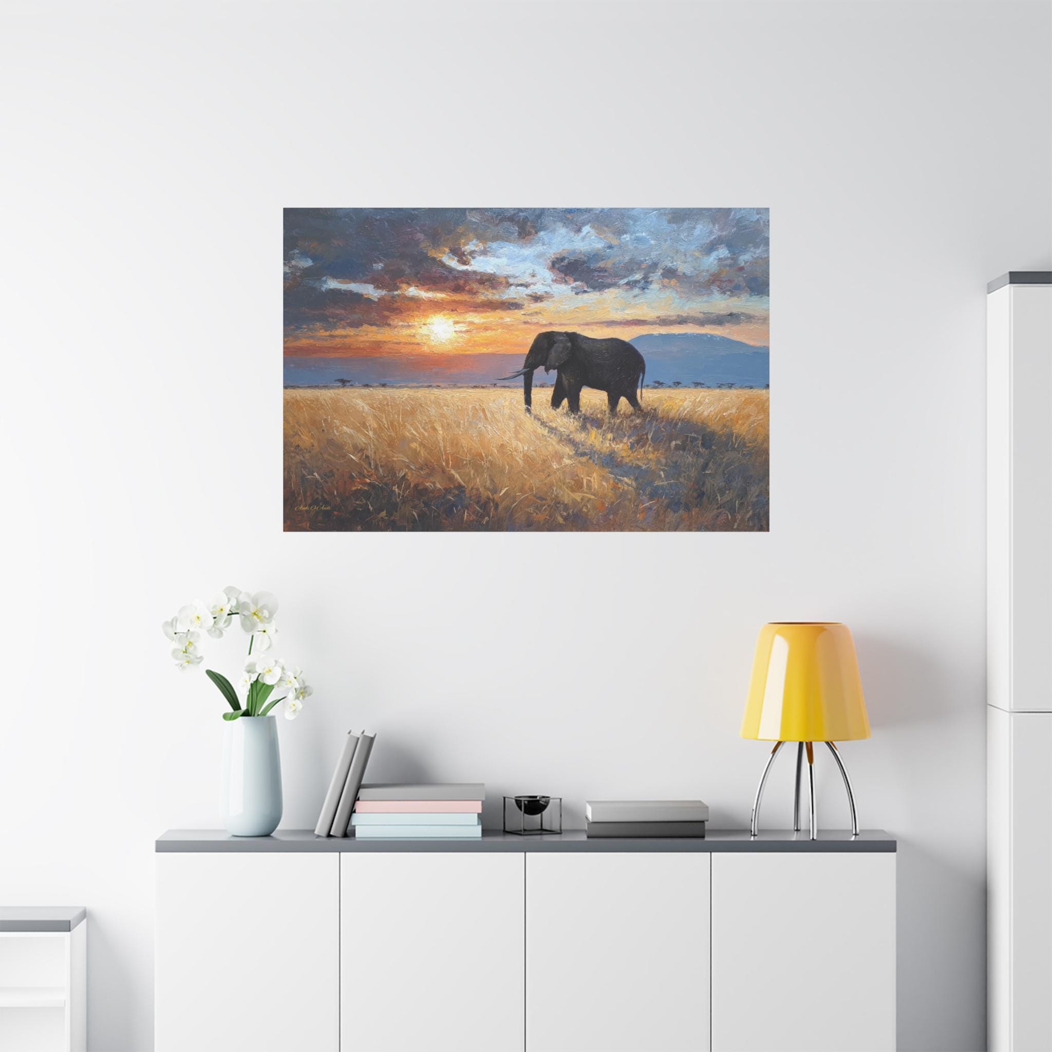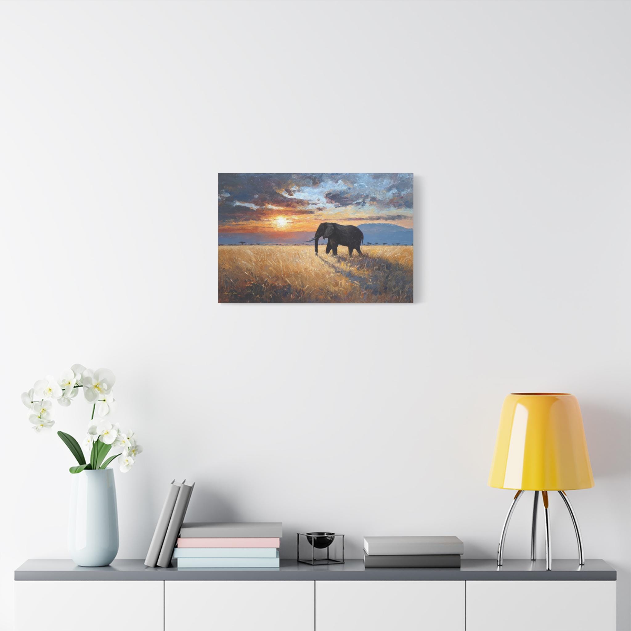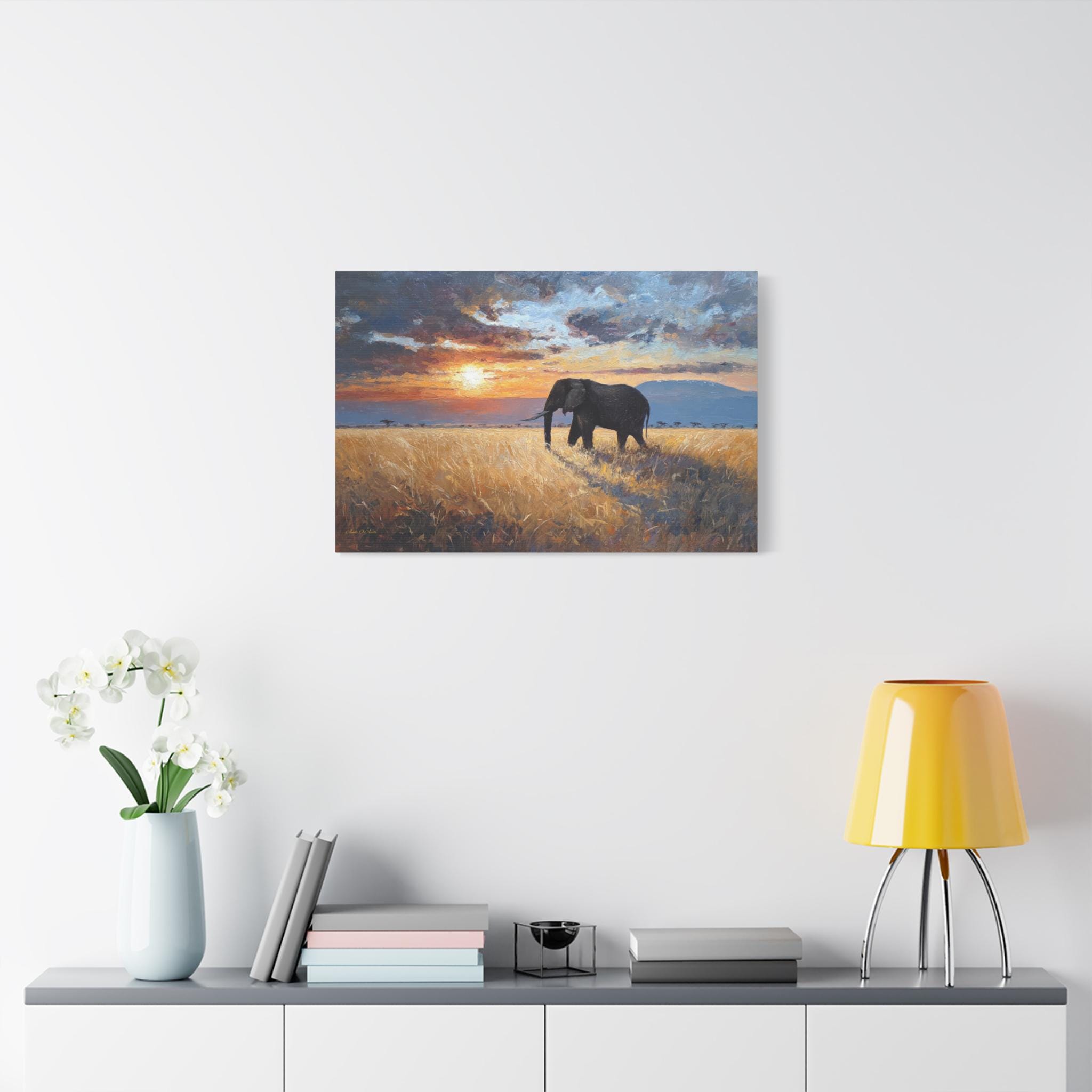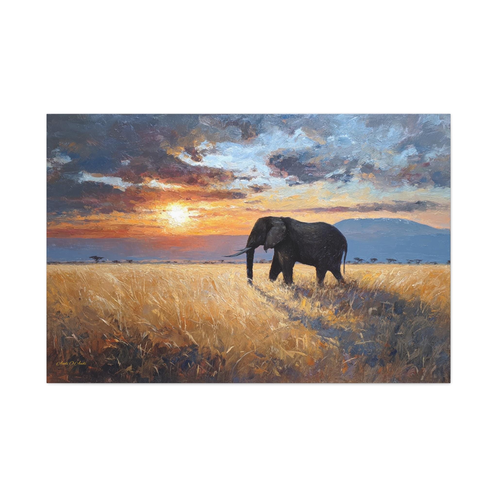 Bring the awe-inspiring majesty, untamed beauty, and radiant warmth of the African savanna into your home with this stunning elephant landscape canvas print. This captivating horizontal artwork features a magnificent, solitary African elephant walking through a field of golden, sun-drenched tall grass. In the background, the distant silhouette of Mount Kilimanjaro rests beneath a dramatic, heavy sky illuminated by a fiery, glowing sunset.