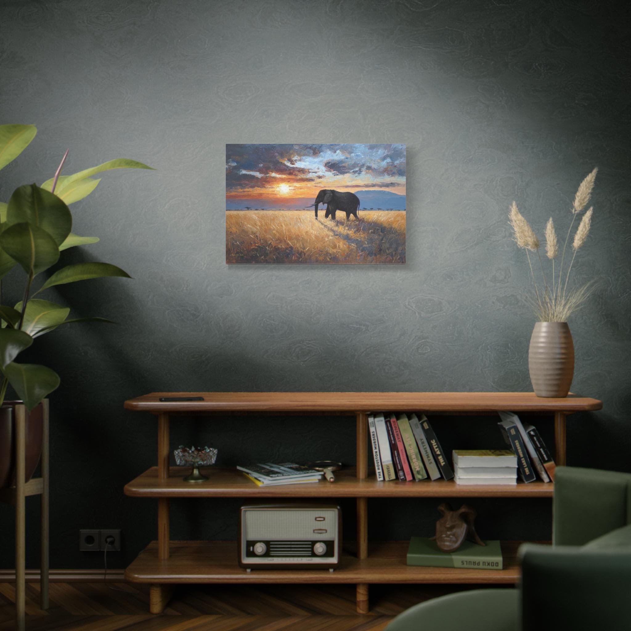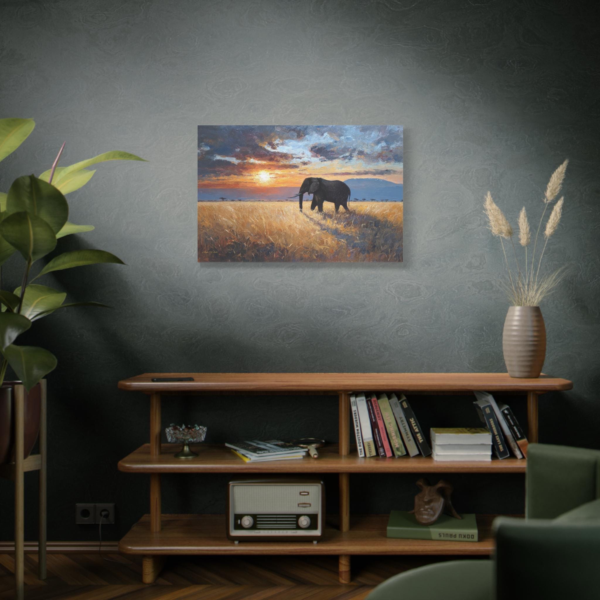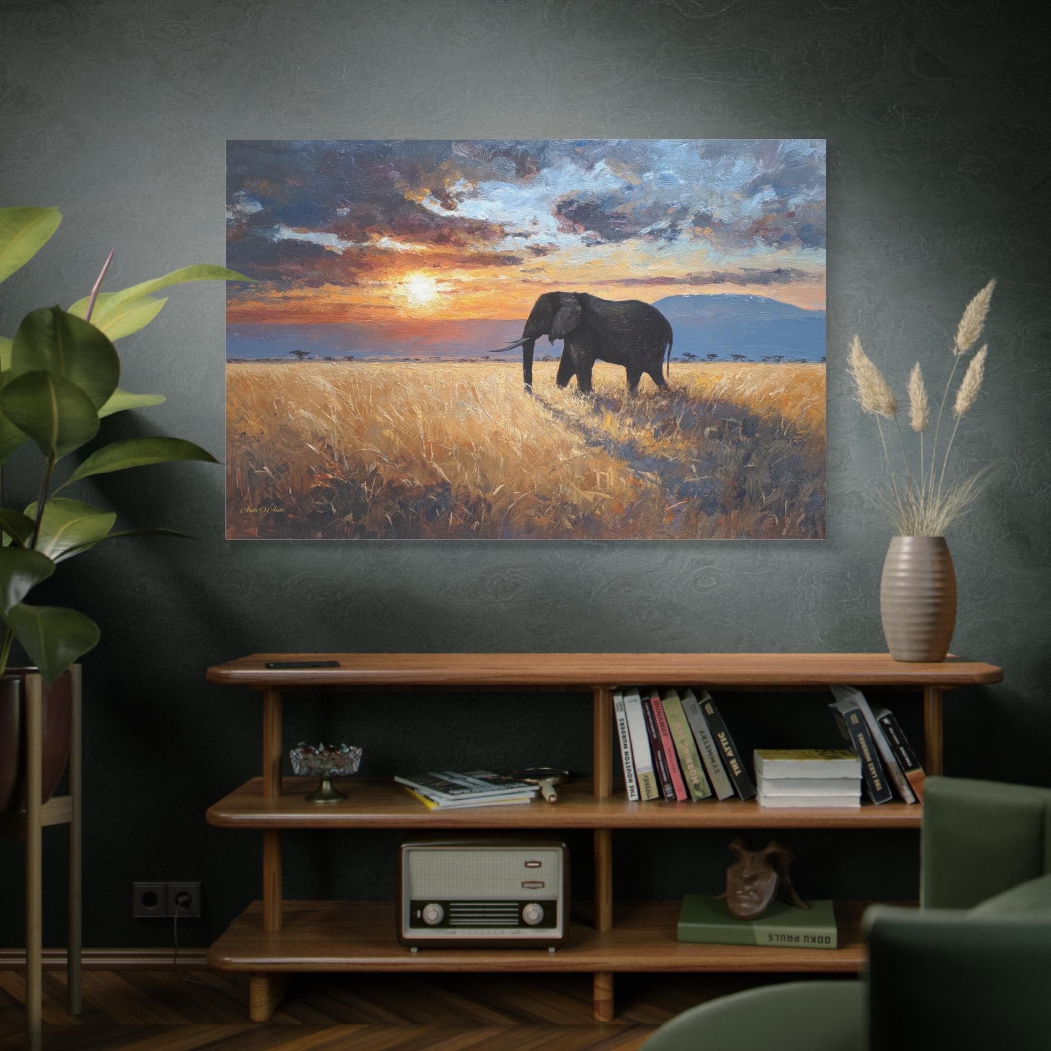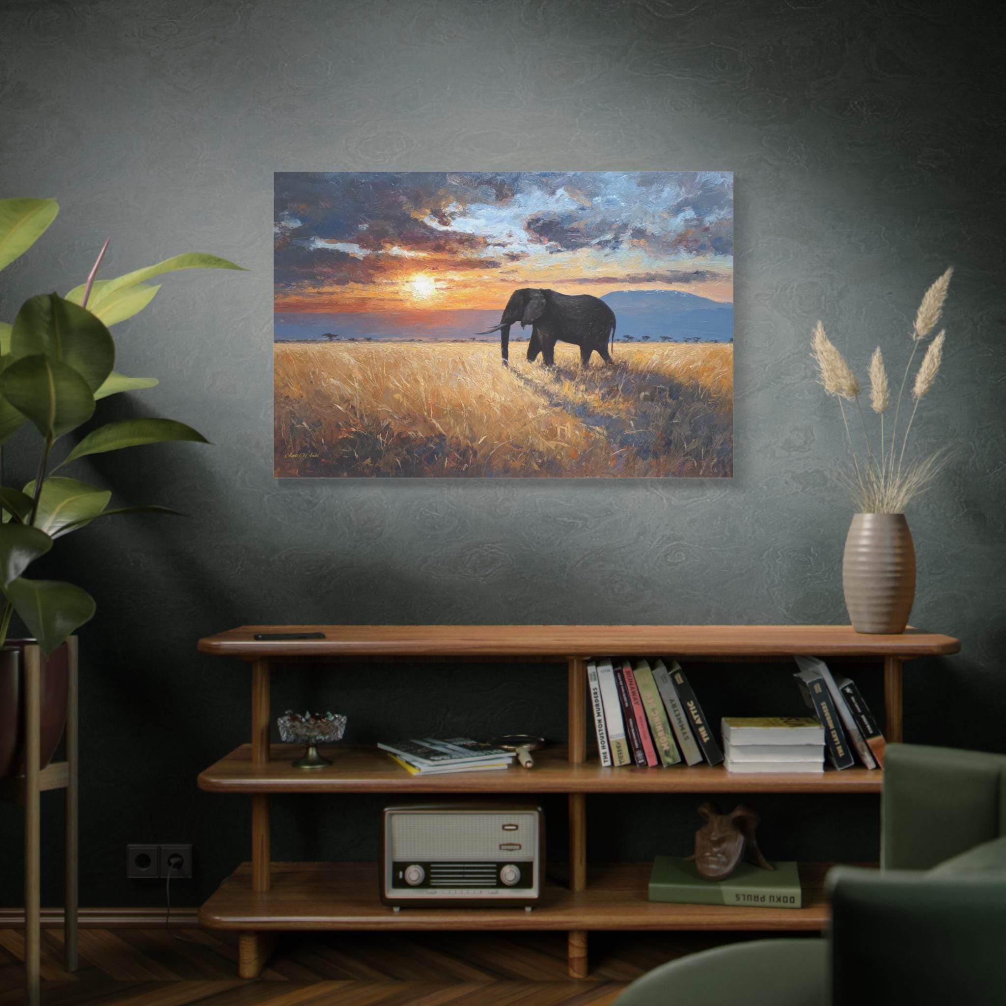 Bring the awe-inspiring majesty, untamed beauty, and radiant warmth of the African savanna into your home with this stunning elephant landscape canvas print. This captivating horizontal artwork features a magnificent, solitary African elephant walking through a field of golden, sun-drenched tall grass. In the background, the distant silhouette of Mount Kilimanjaro rests beneath a dramatic, heavy sky illuminated by a fiery, glowing sunset.