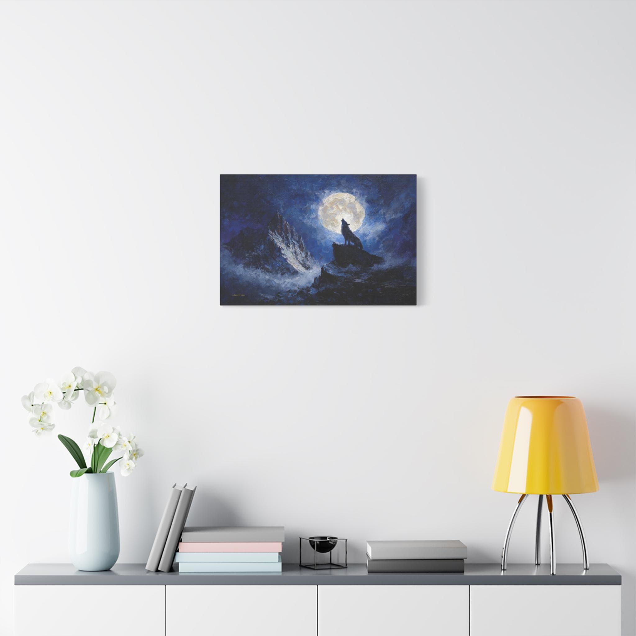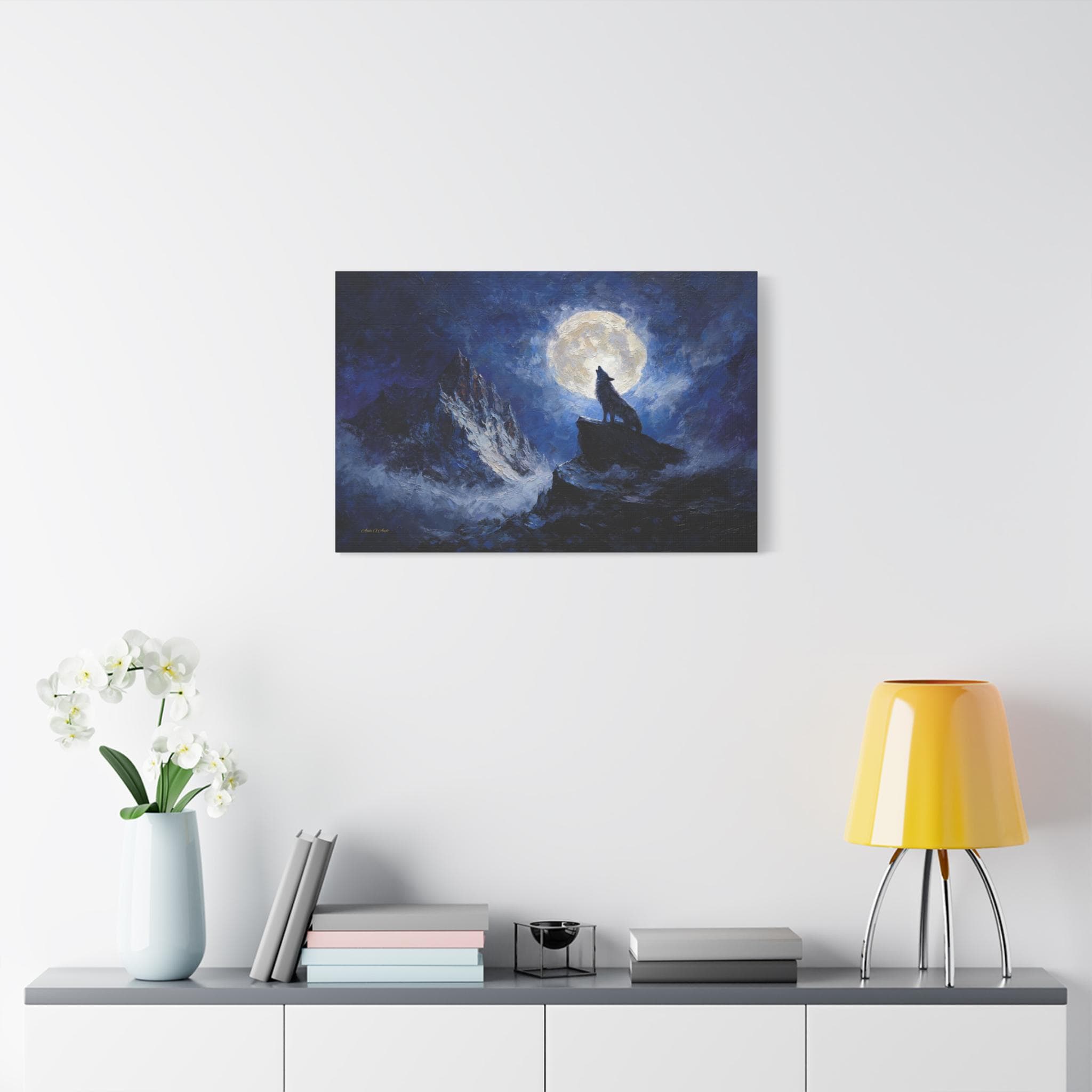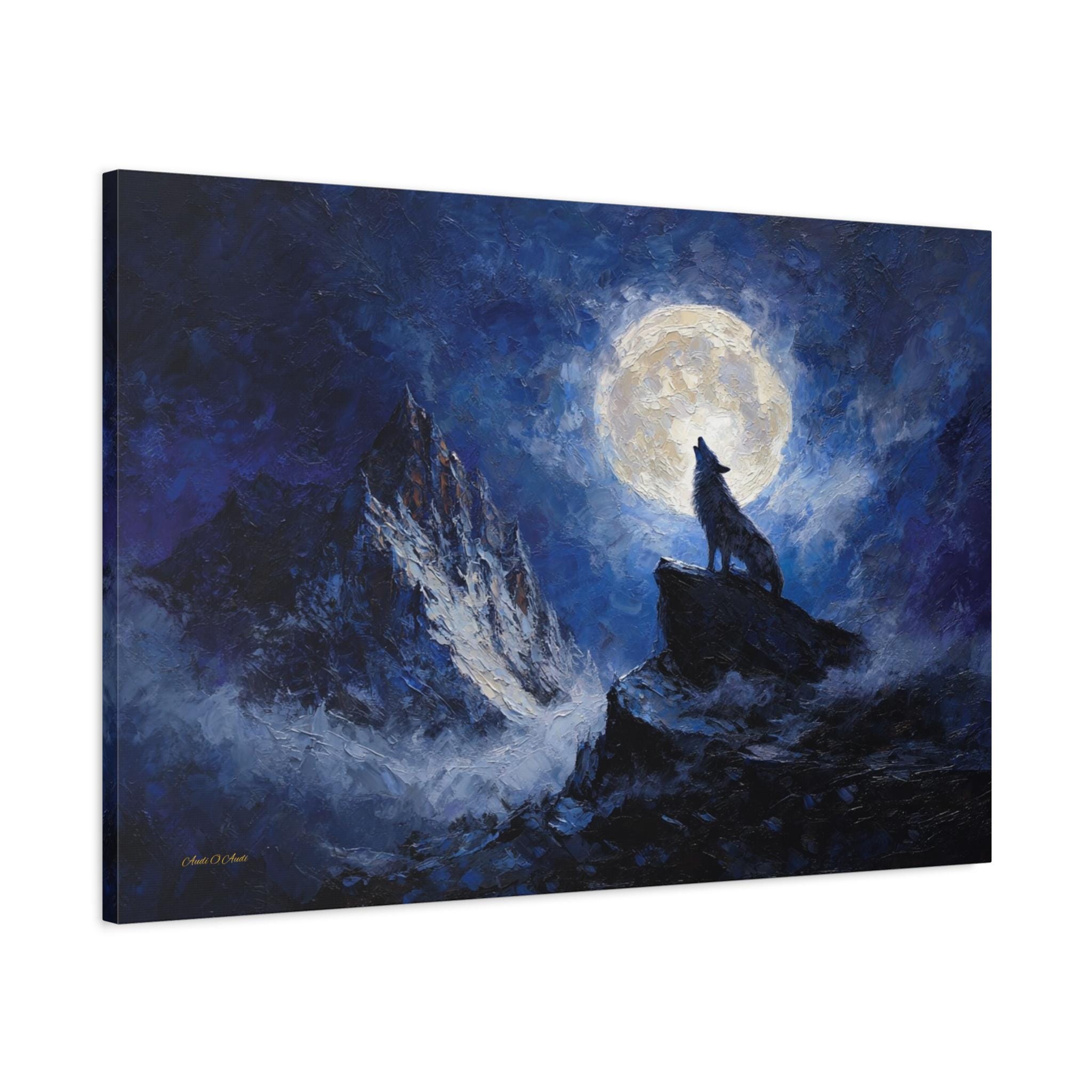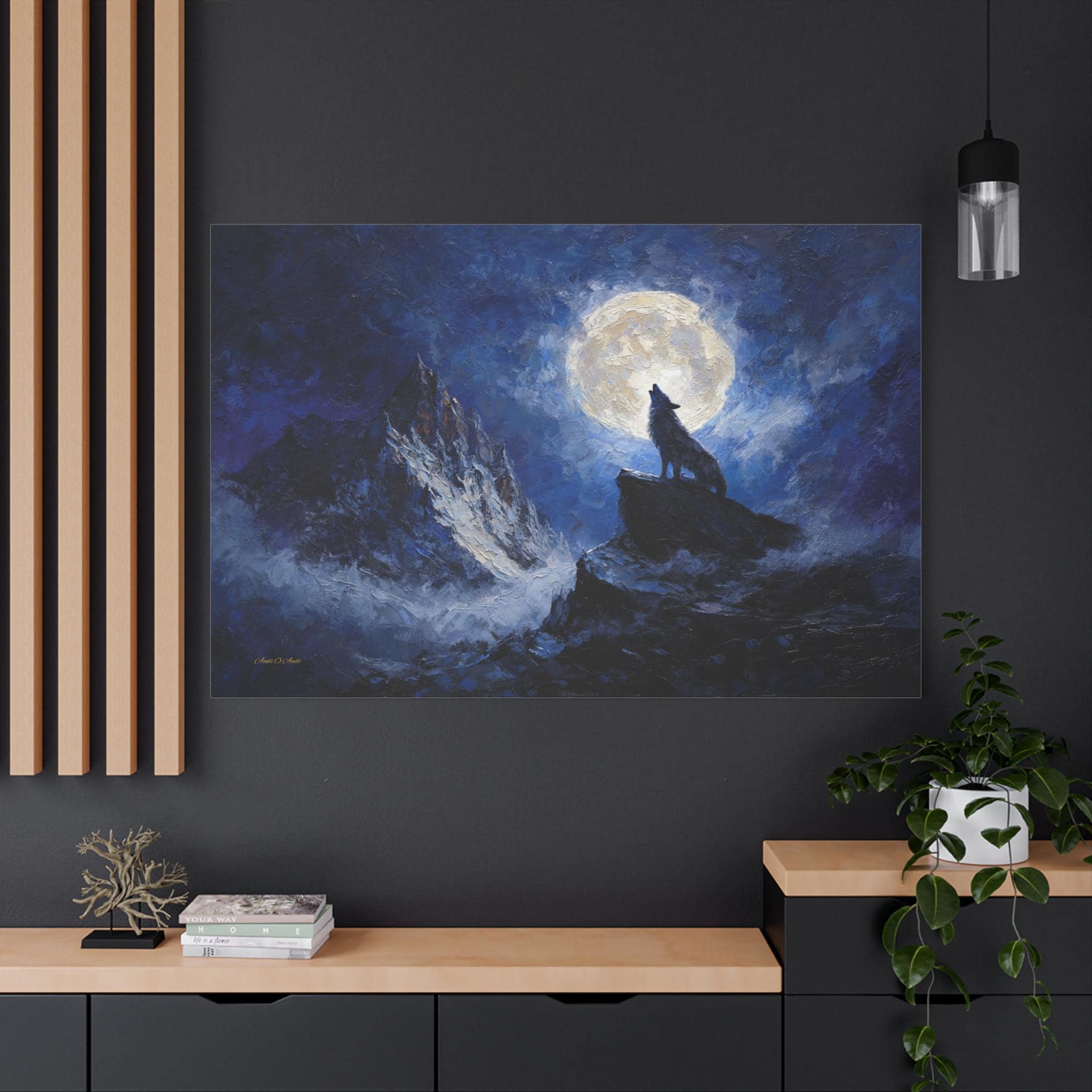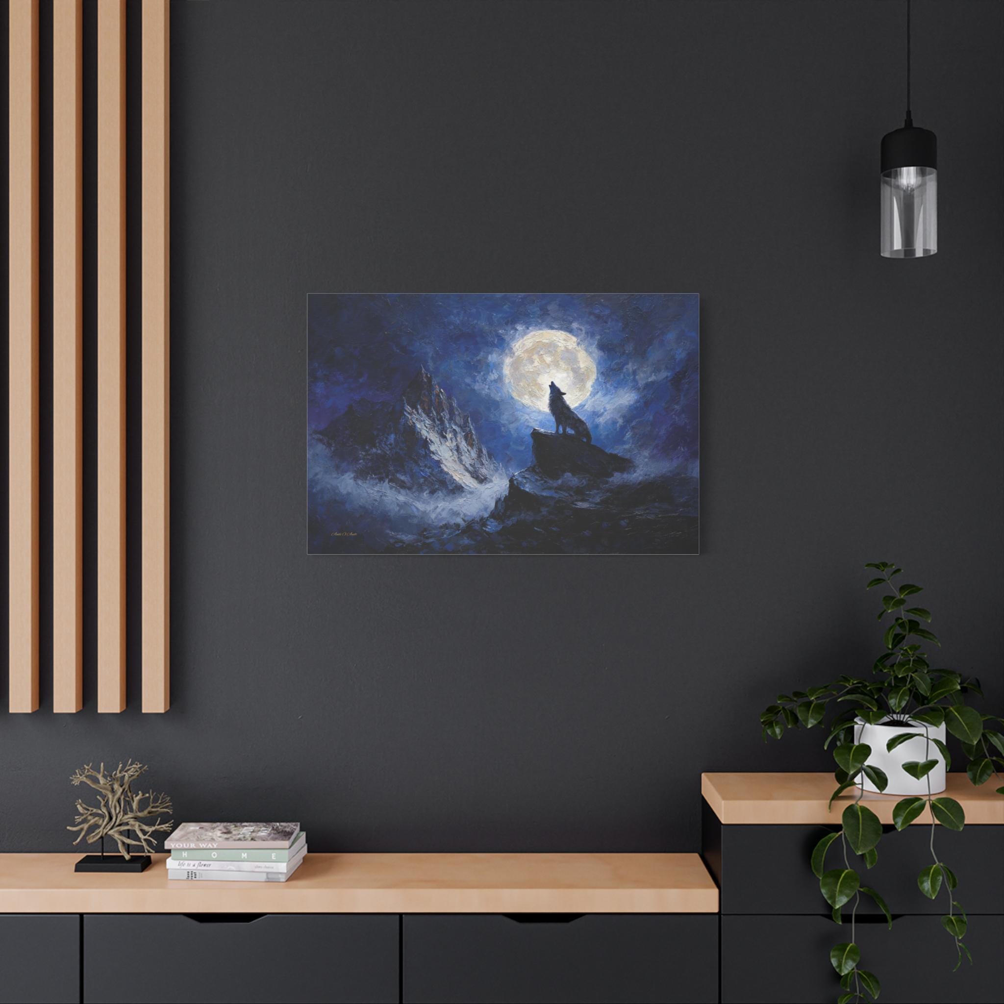 Bring the raw power, mystical energy, and breathtaking drama of the untamed wilderness into your home with this stunning wolf and moon canvas print. This captivating horizontal artwork features the striking silhouette of a lone wolf howling from a rugged mountain peak against a massive, glowing full moon. The intense color palette of deep midnight blues, moody indigos, and luminous lunar whites creates a truly unforgettable and atmospheric visual experience.