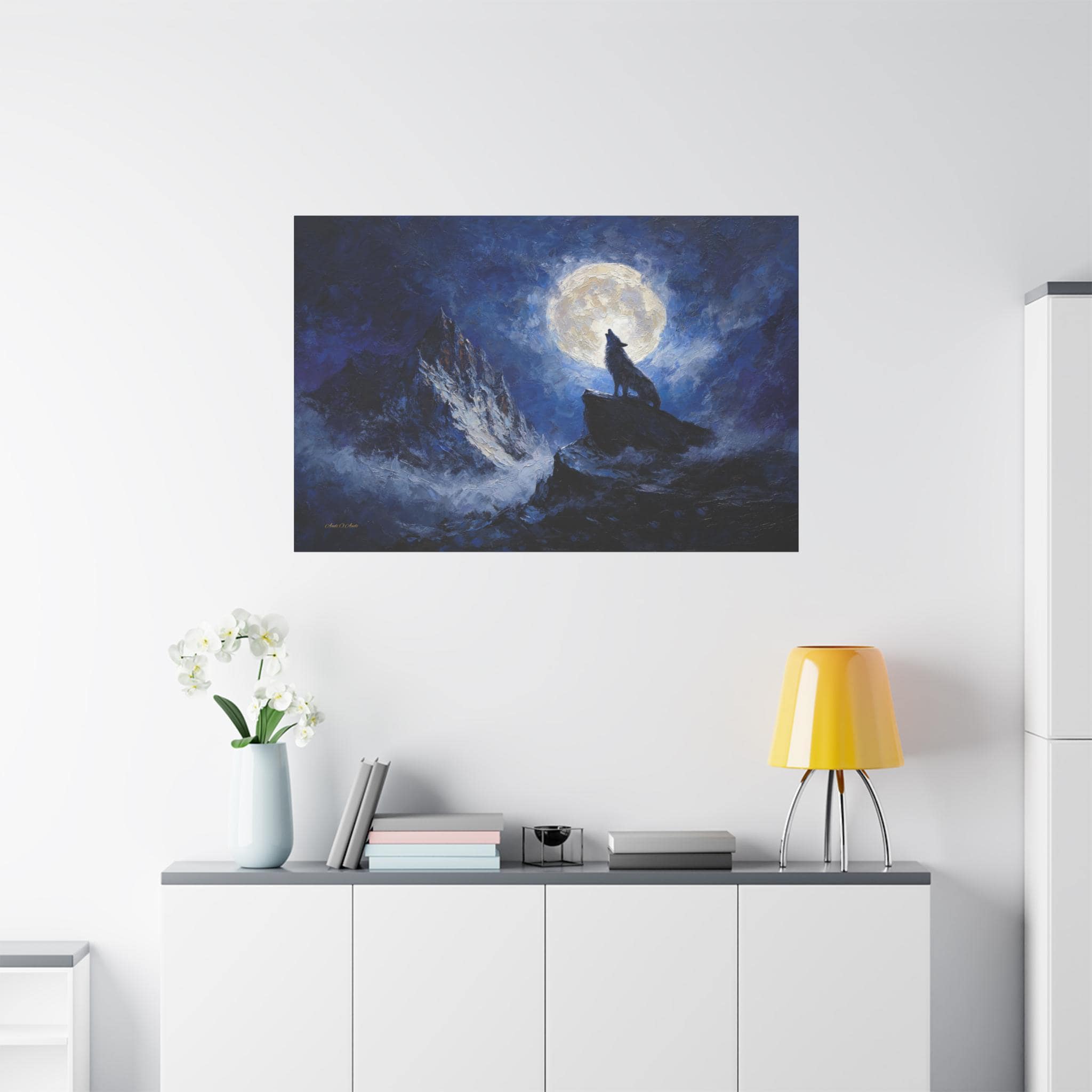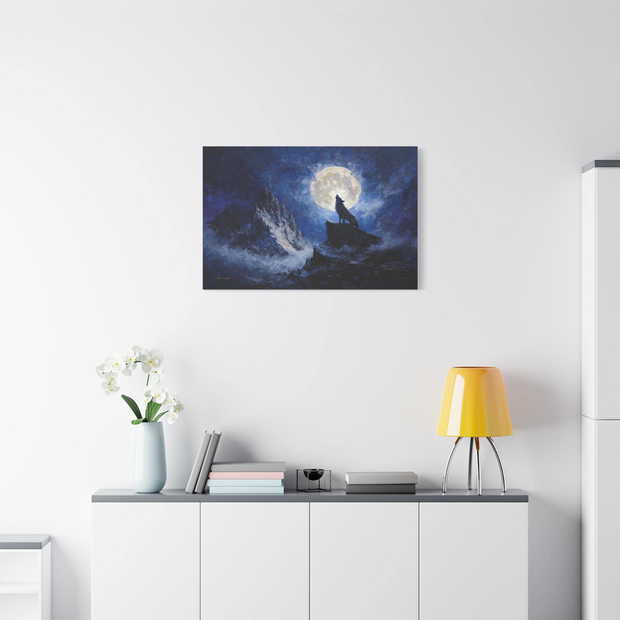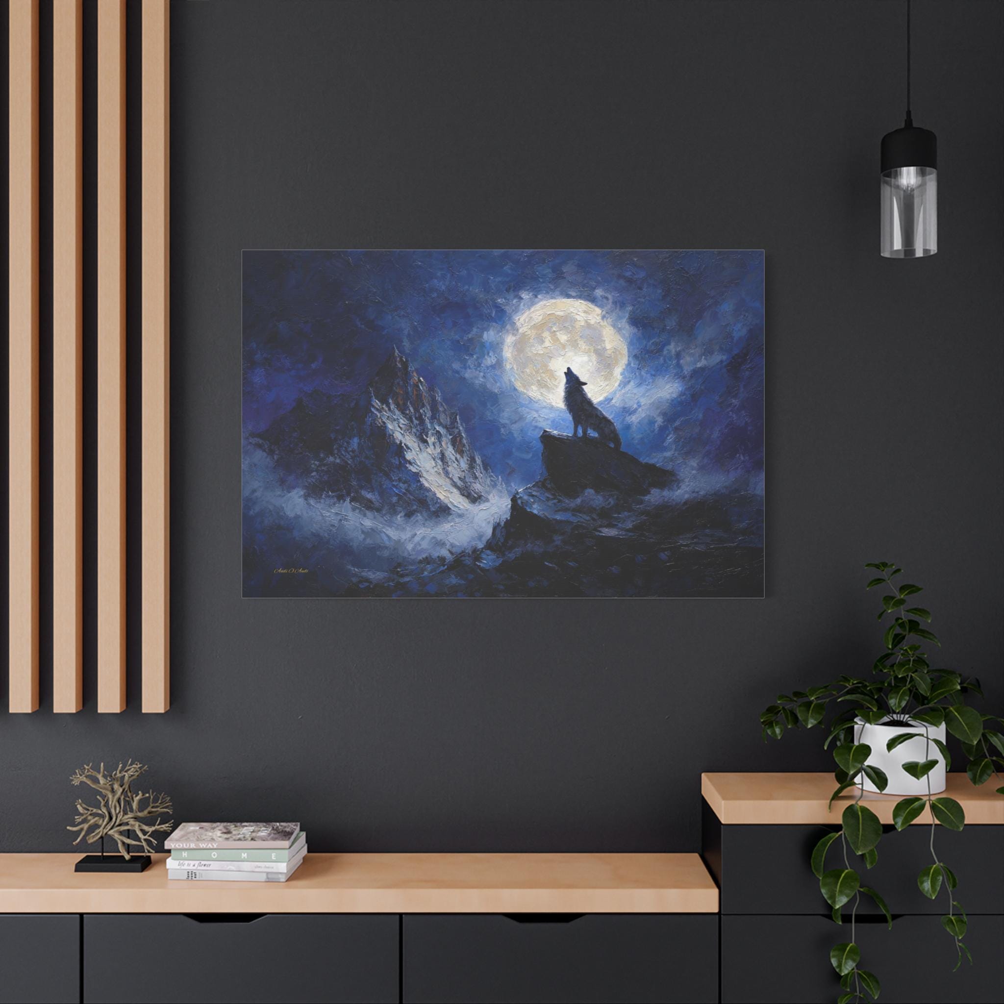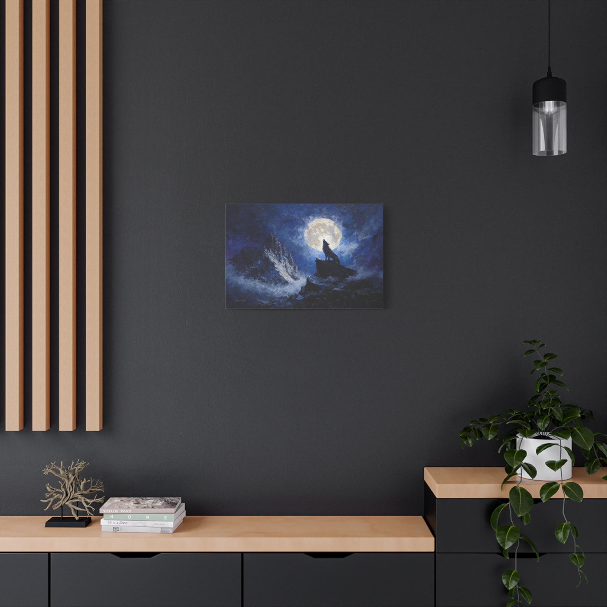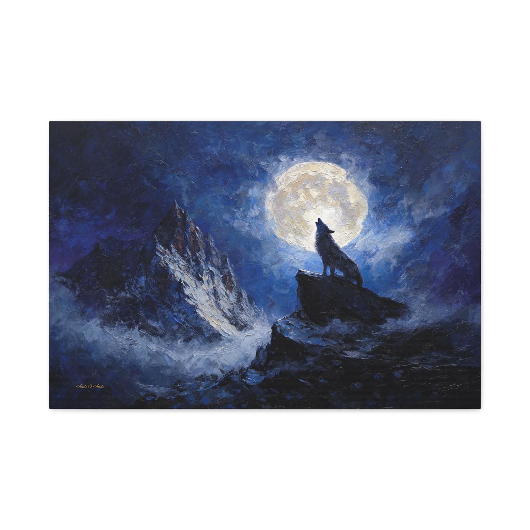 Bring the raw power, mystical energy, and breathtaking drama of the untamed wilderness into your home with this stunning wolf and moon canvas print. This captivating horizontal artwork features the striking silhouette of a lone wolf howling from a rugged mountain peak against a massive, glowing full moon. The intense color palette of deep midnight blues, moody indigos, and luminous lunar whites creates a truly unforgettable and atmospheric visual experience.