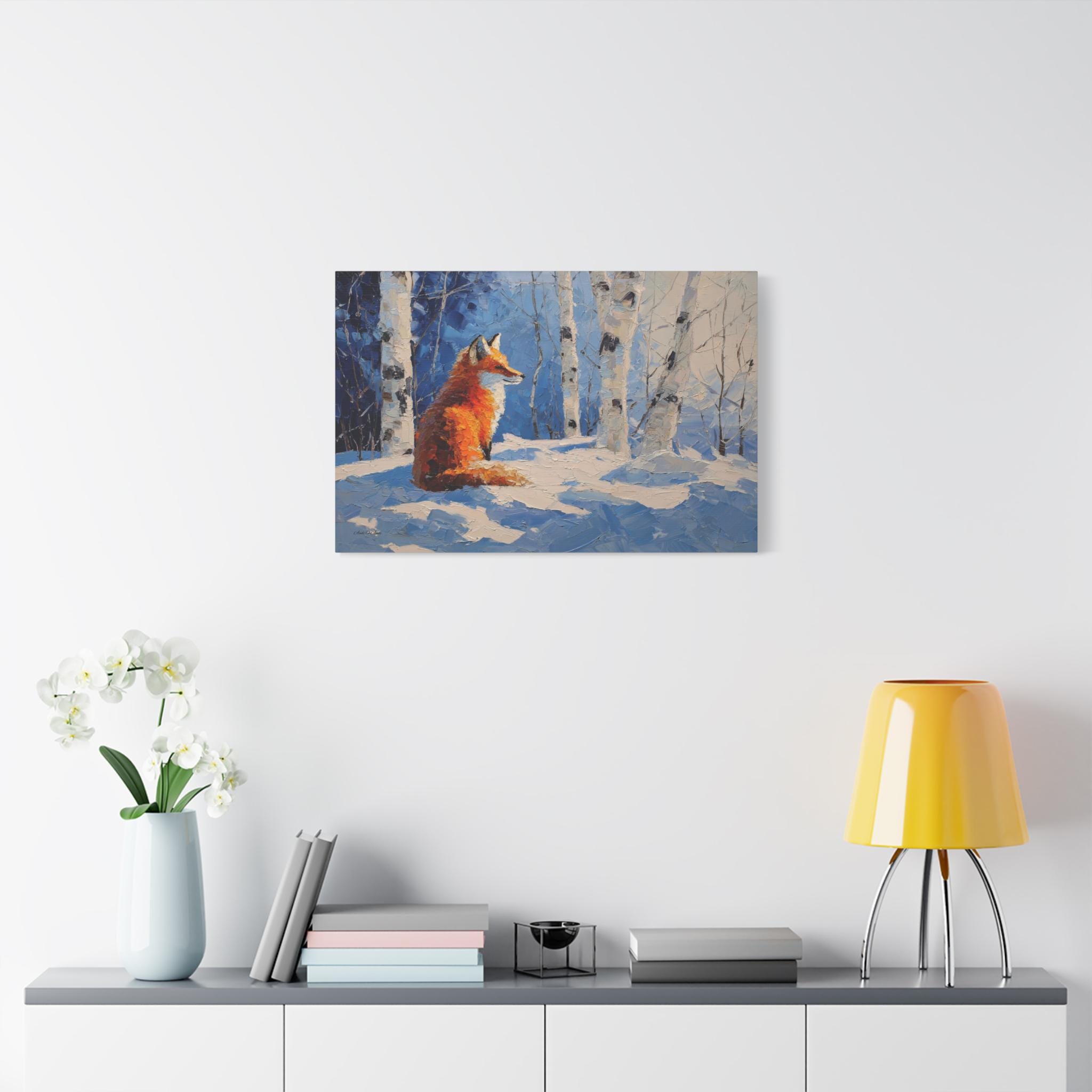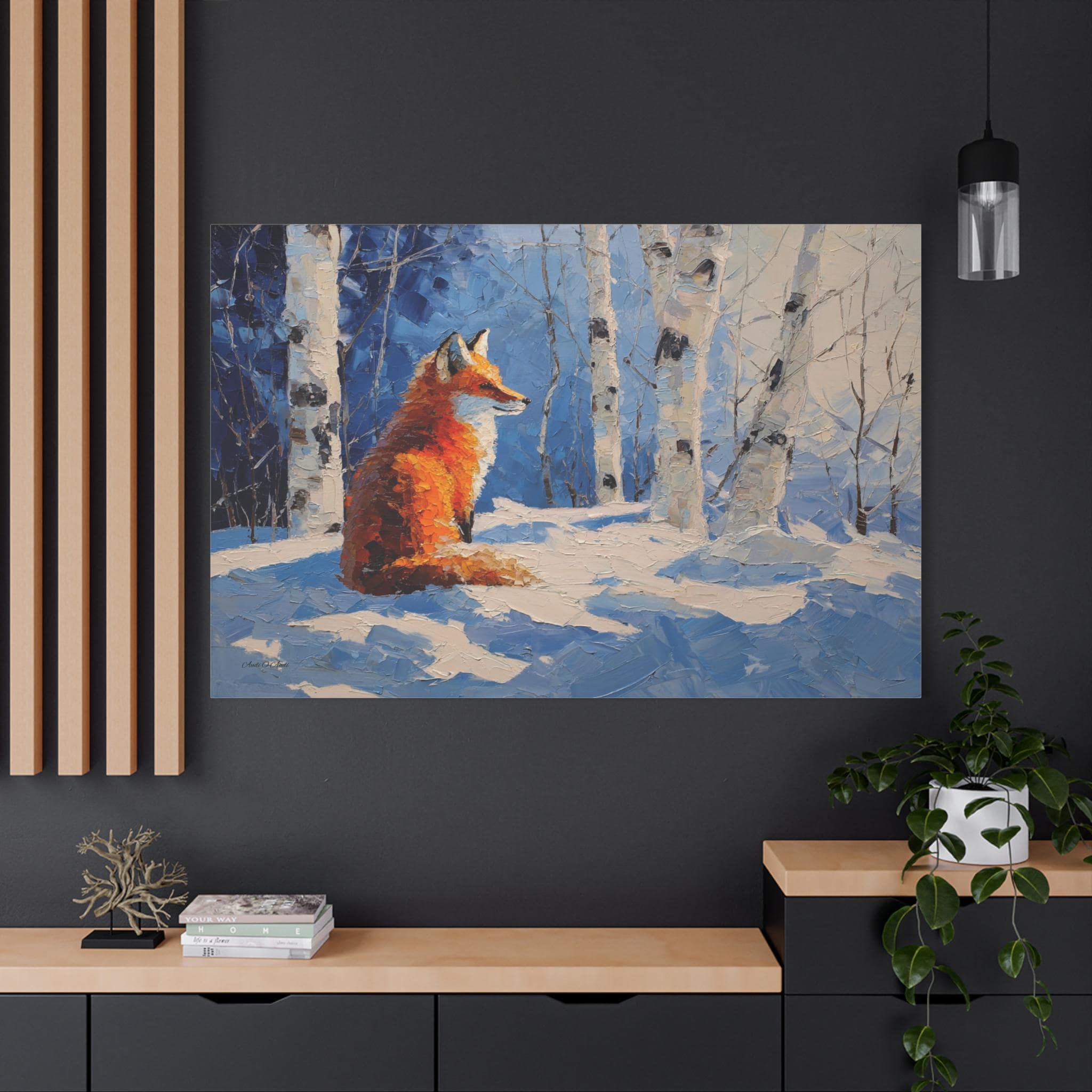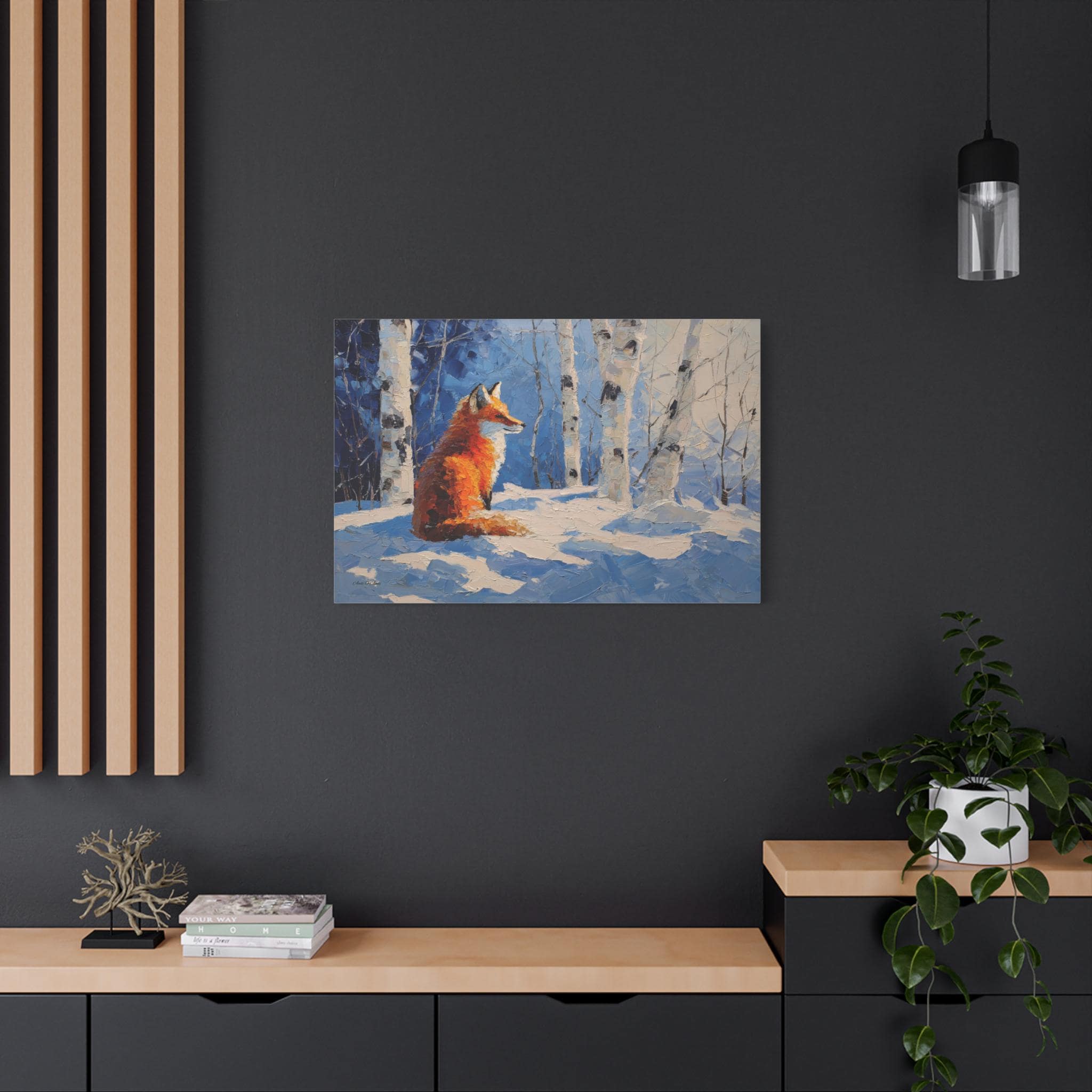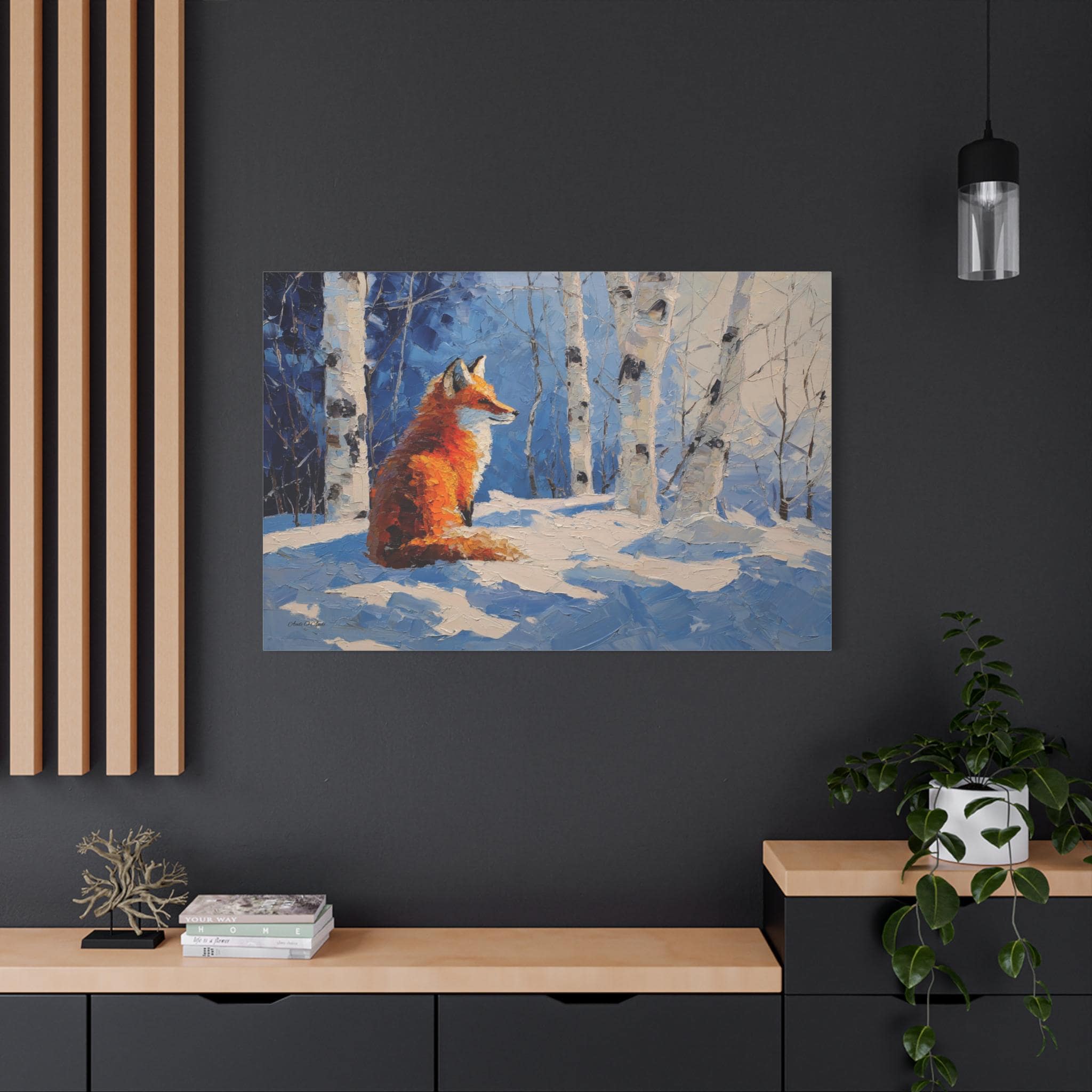 Bring the crisp beauty, striking color, and serene magic of the winter forest into your home with this stunning red fox canvas print. This captivating horizontal artwork features a bright, beautiful red fox sitting peacefully in a deep, snowy woodland landscape, framed by majestic white birch trees. The intense, fiery oranges and golds of the fox's thick winter coat create a breathtaking contrast against the cool icy blues and stark whites of the snow and shadows.