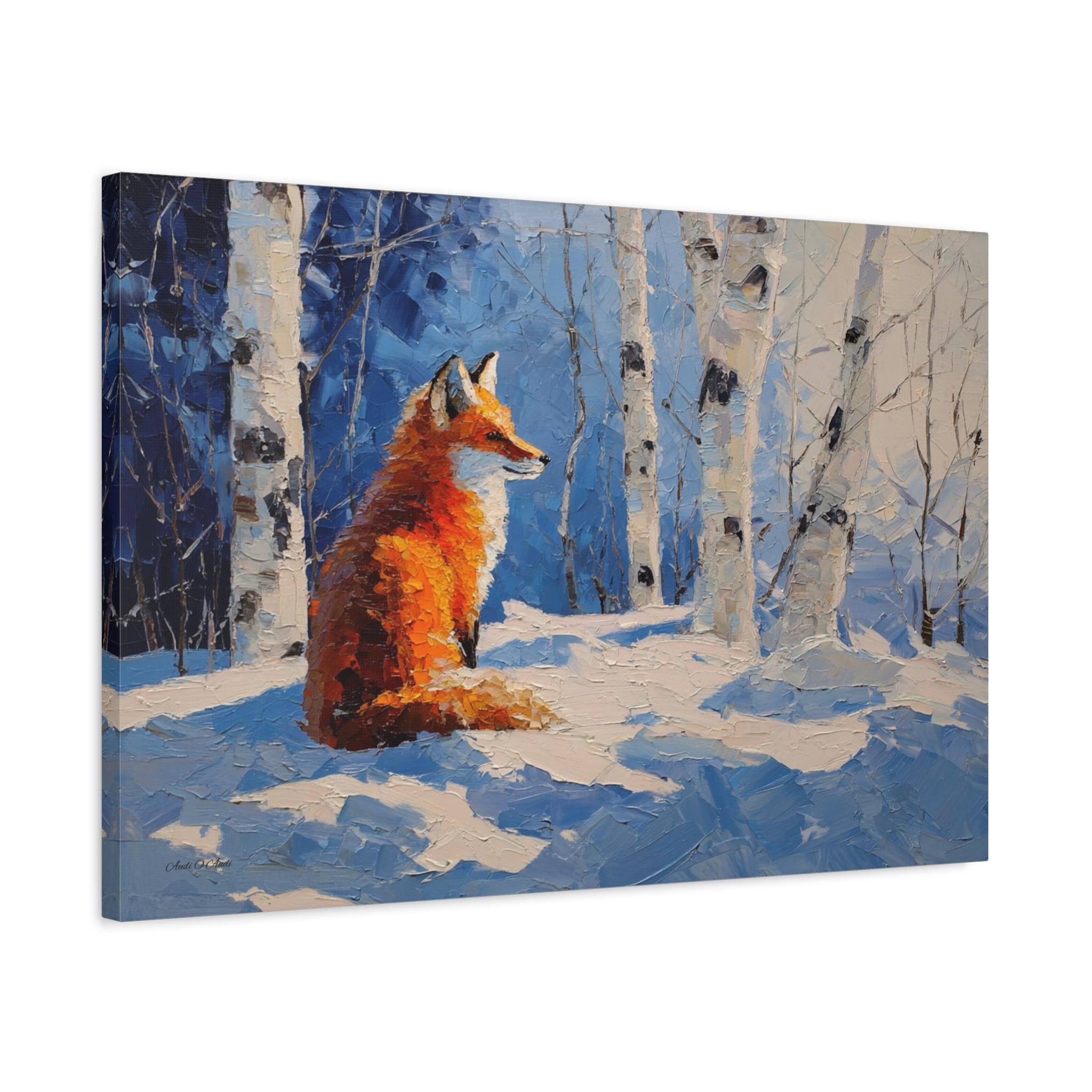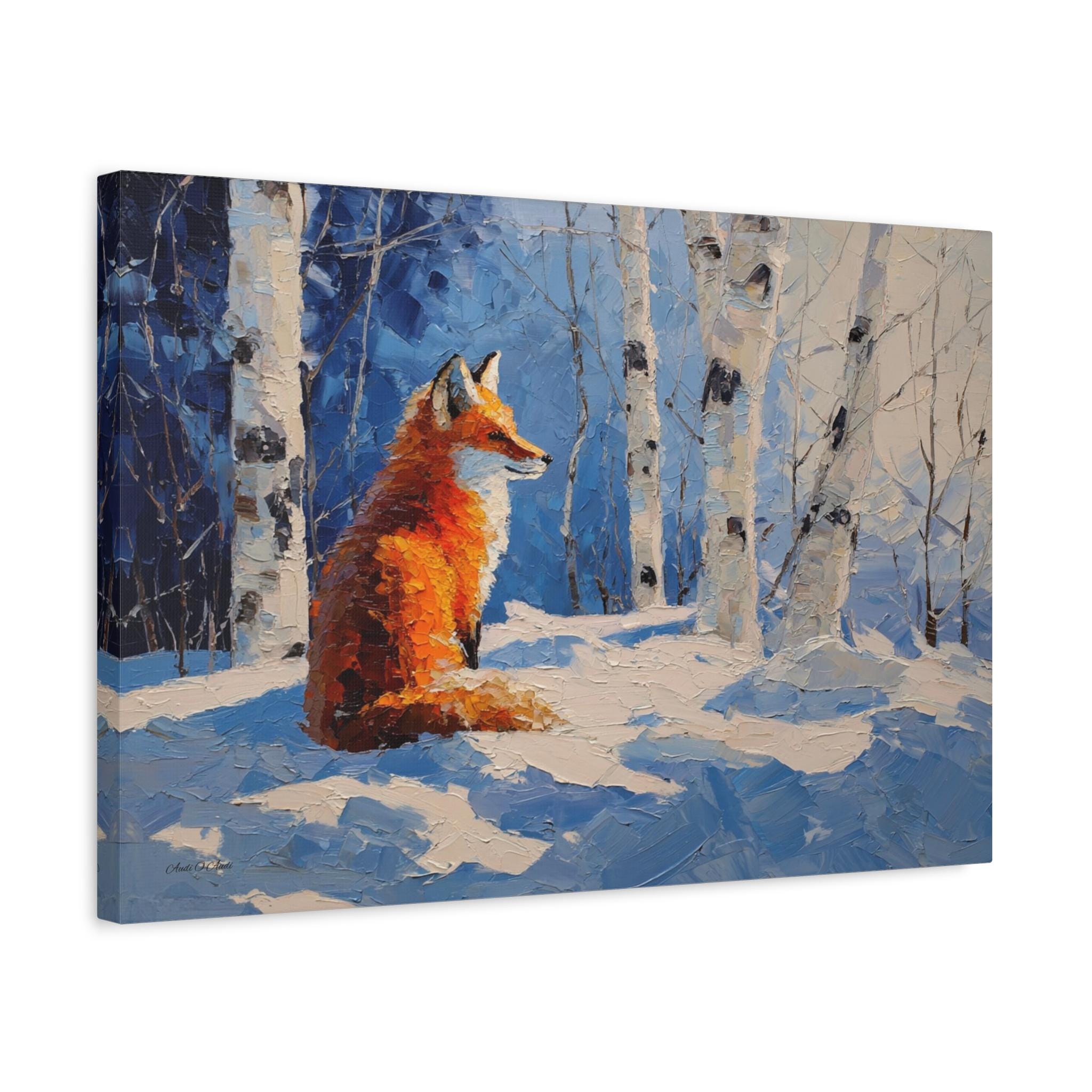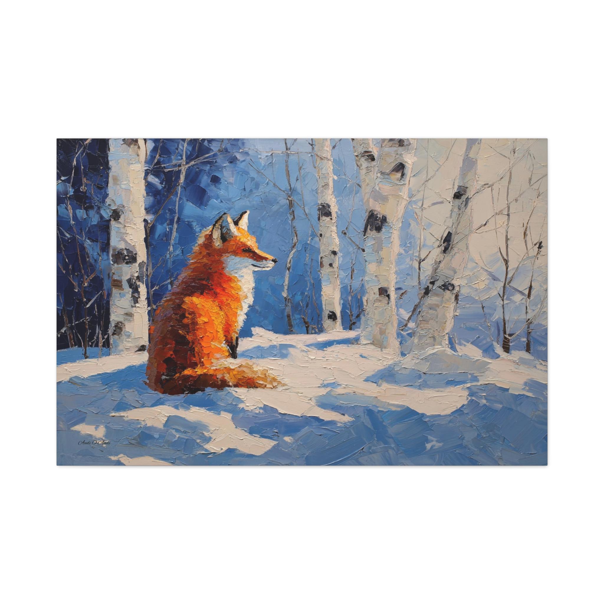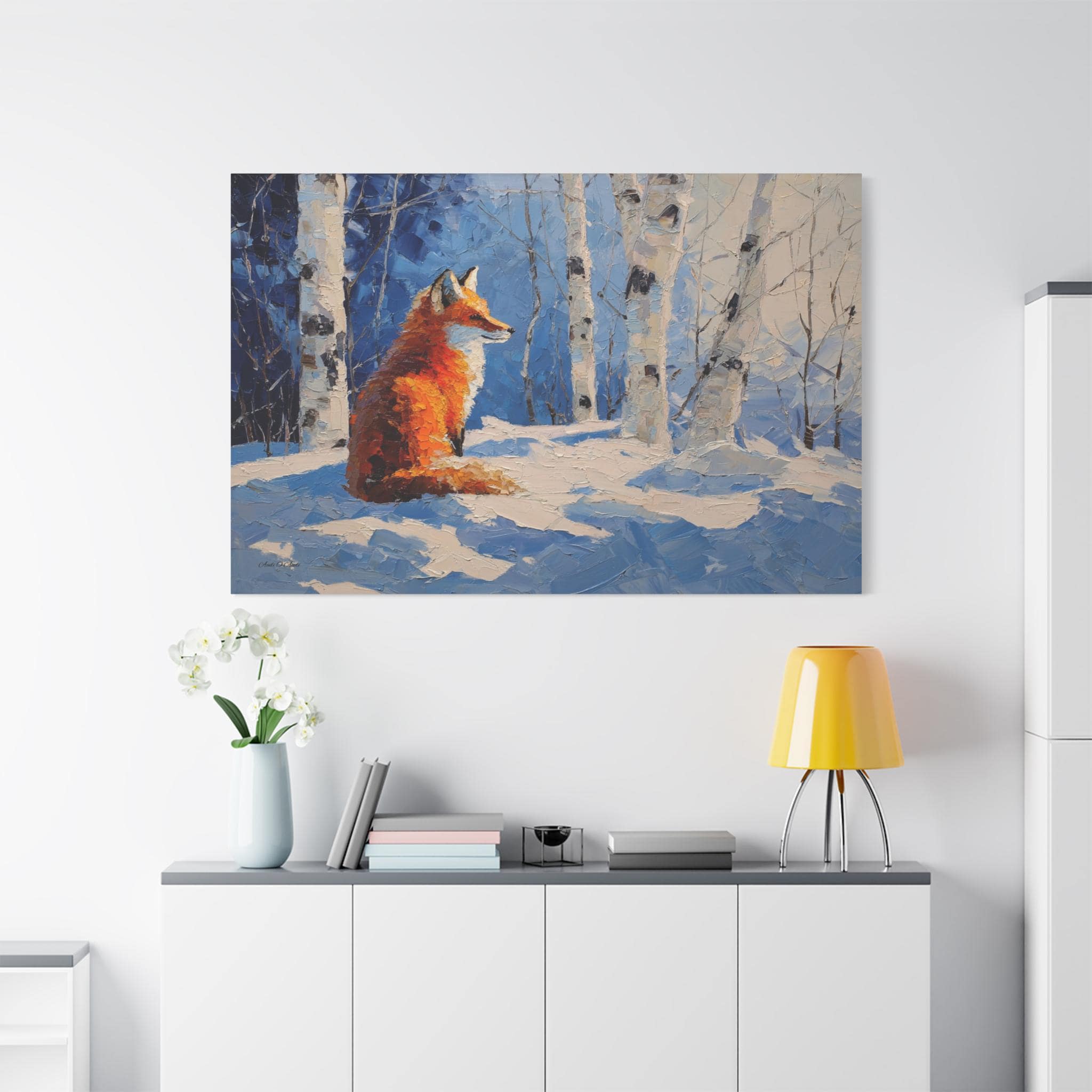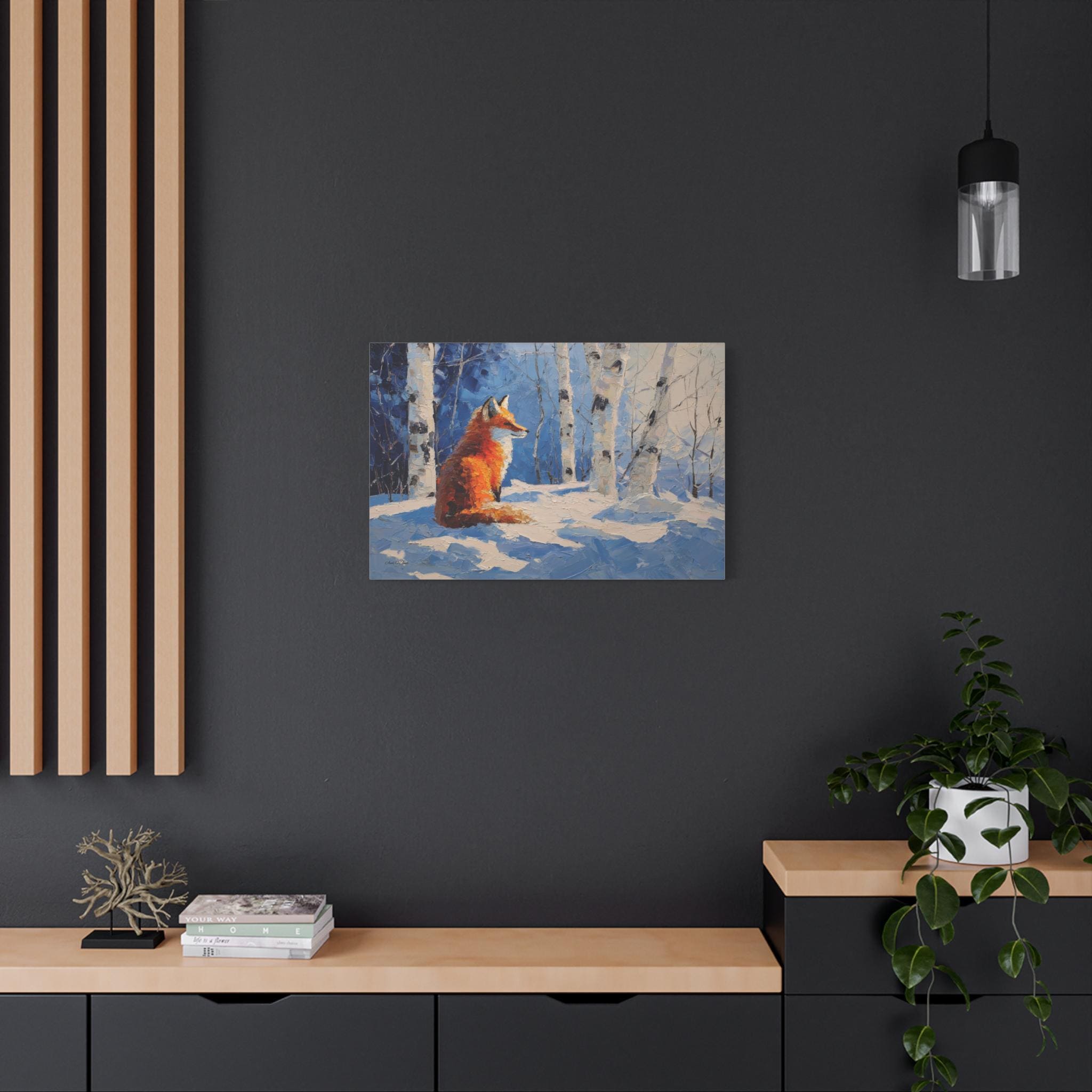 Bring the crisp beauty, striking color, and serene magic of the winter forest into your home with this stunning red fox canvas print. This captivating horizontal artwork features a bright, beautiful red fox sitting peacefully in a deep, snowy woodland landscape, framed by majestic white birch trees. The intense, fiery oranges and golds of the fox's thick winter coat create a breathtaking contrast against the cool icy blues and stark whites of the snow and shadows.
