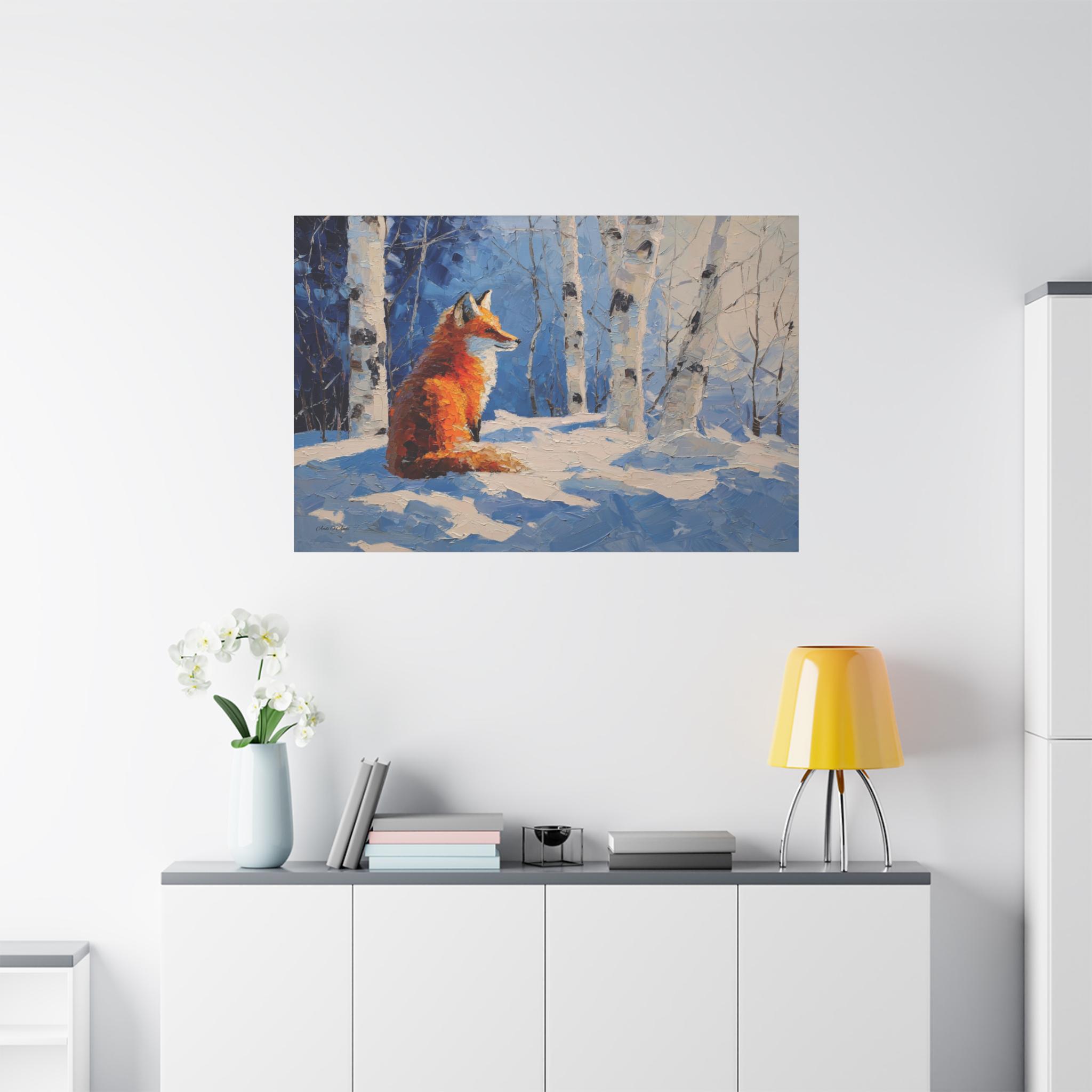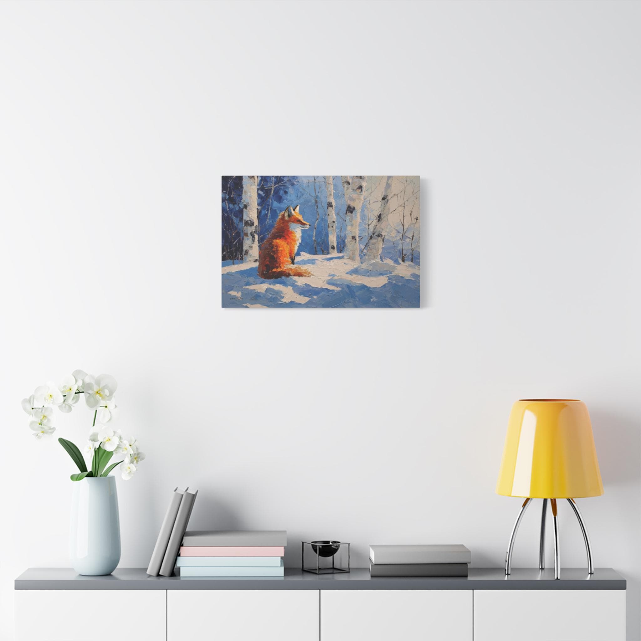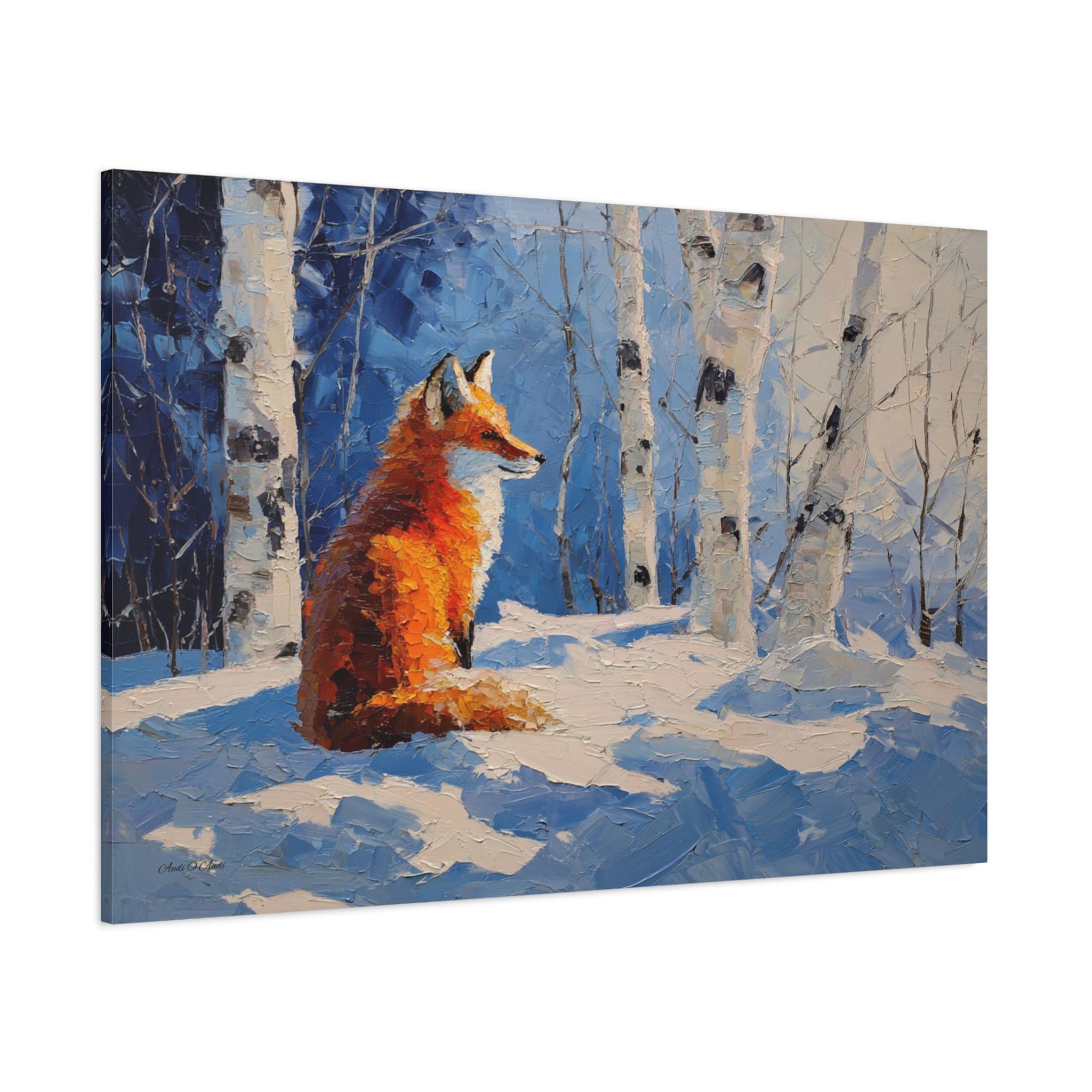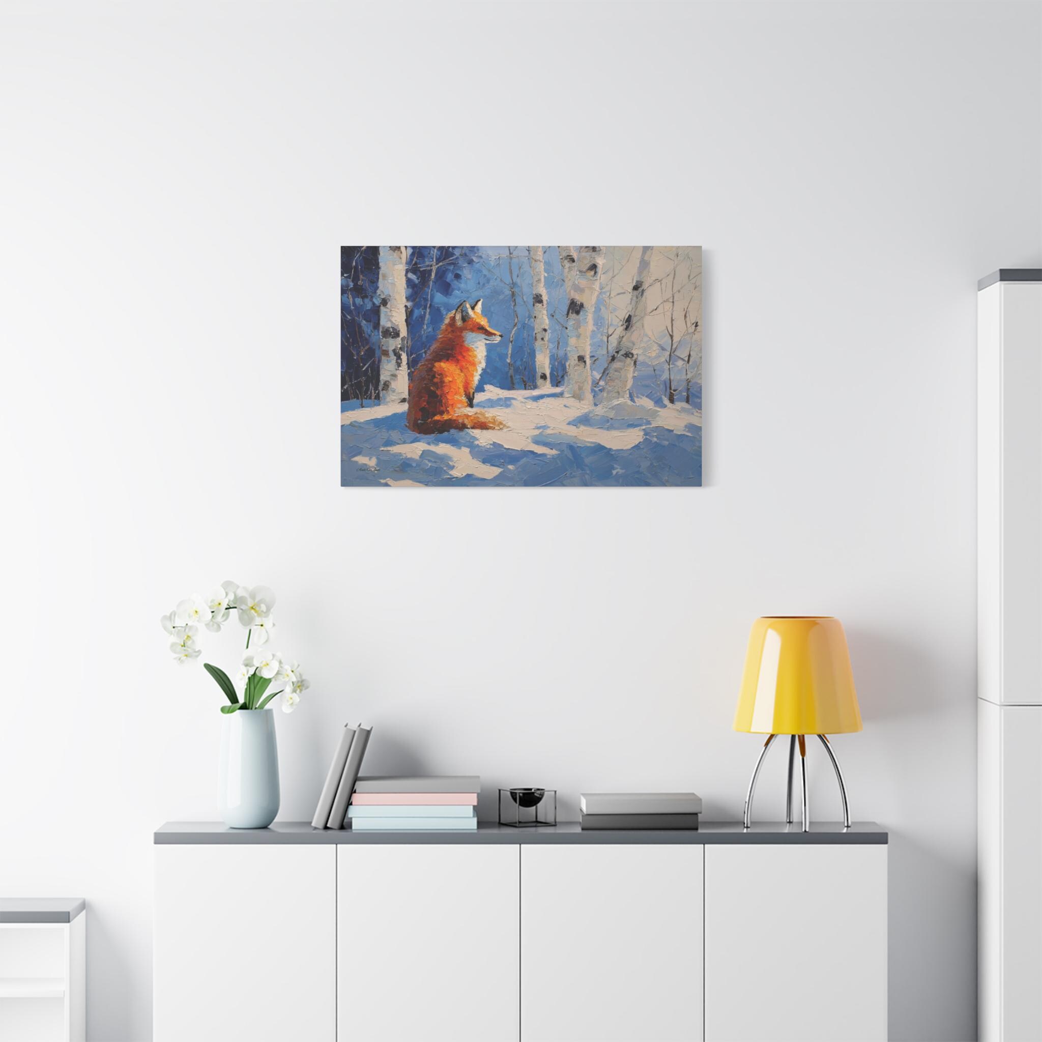 Bring the crisp beauty, striking color, and serene magic of the winter forest into your home with this stunning red fox canvas print. This captivating horizontal artwork features a bright, beautiful red fox sitting peacefully in a deep, snowy woodland landscape, framed by majestic white birch trees. The intense, fiery oranges and golds of the fox's thick winter coat create a breathtaking contrast against the cool icy blues and stark whites of the snow and shadows.