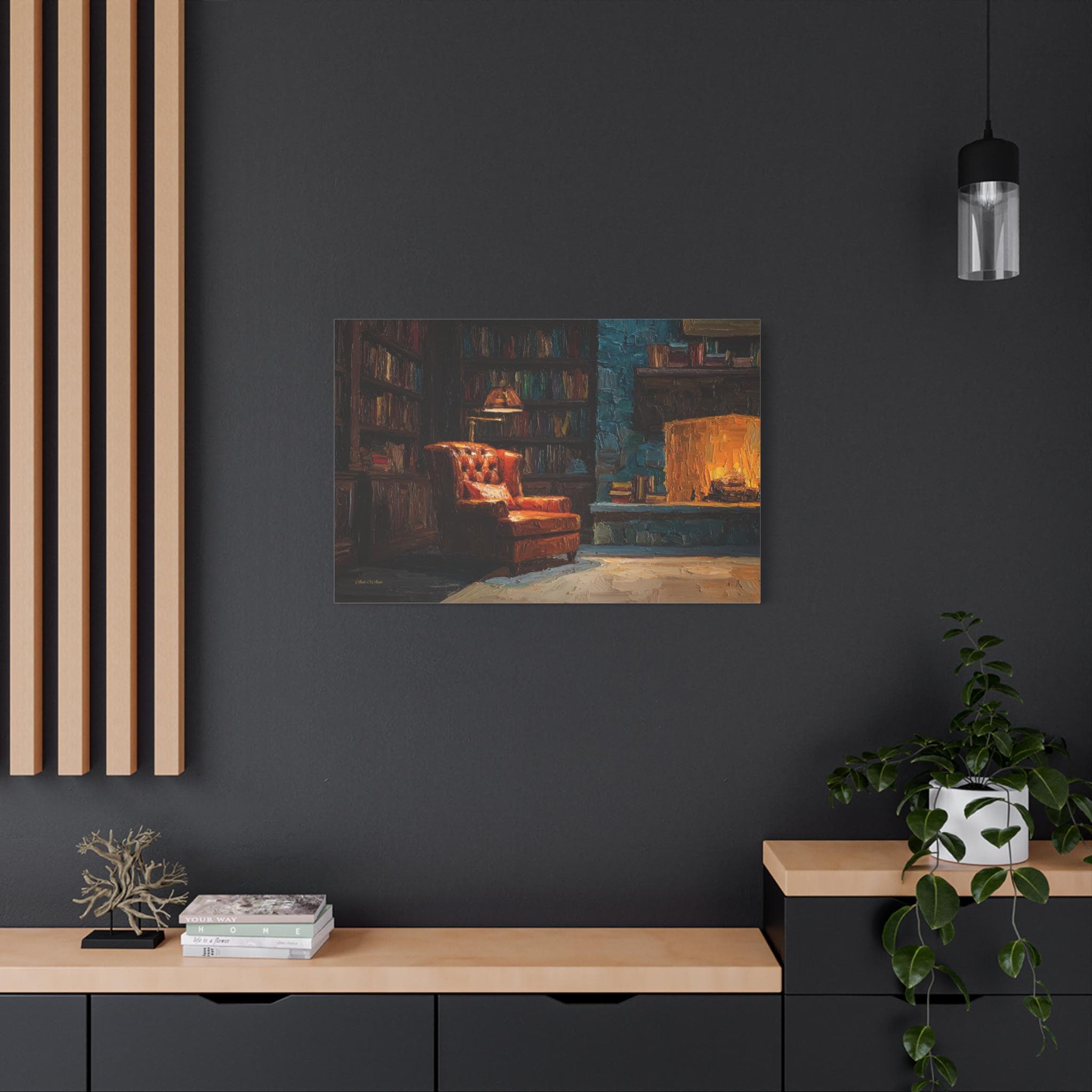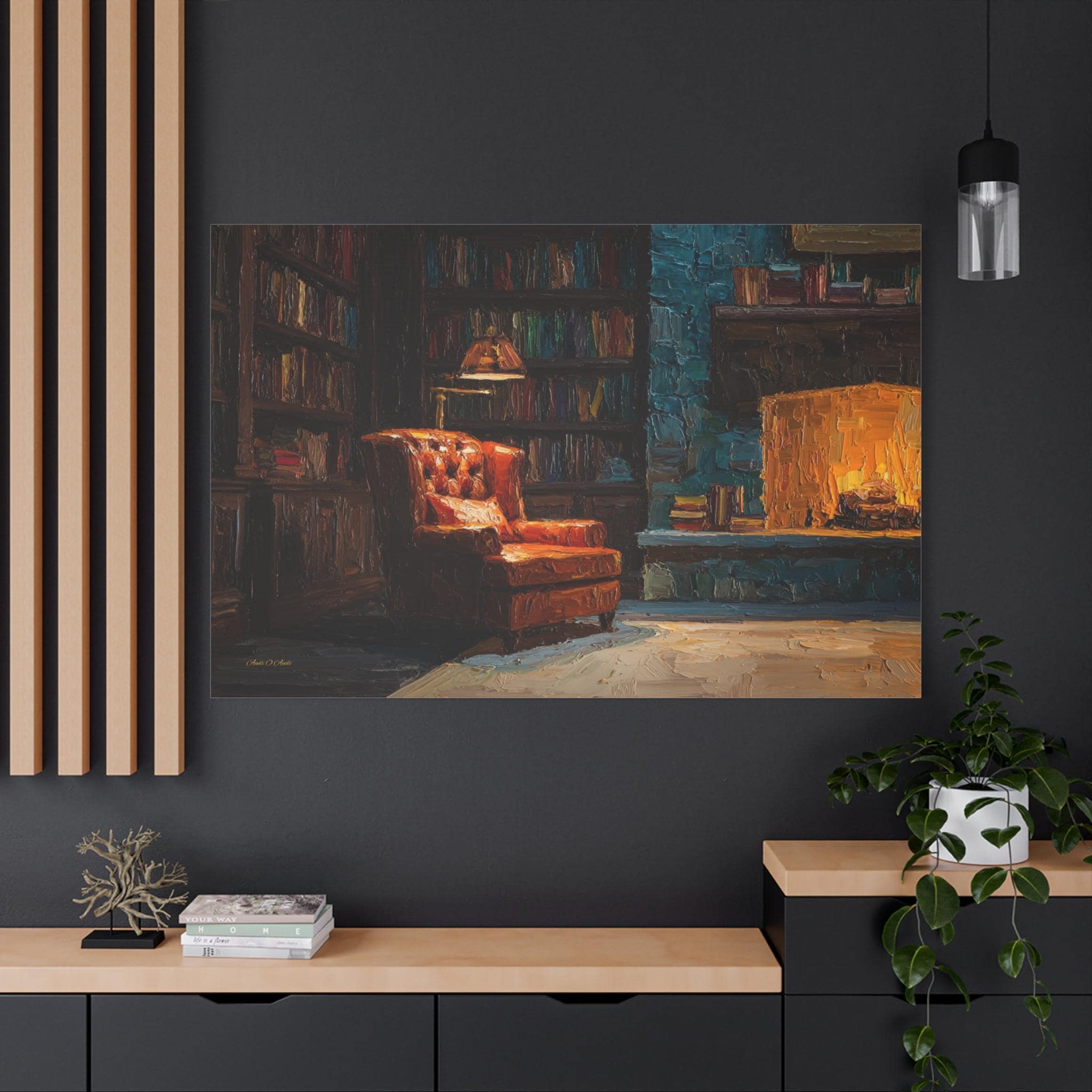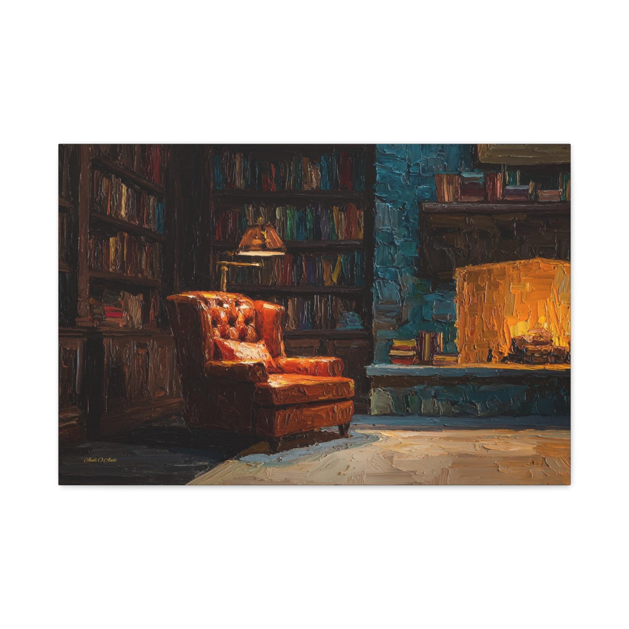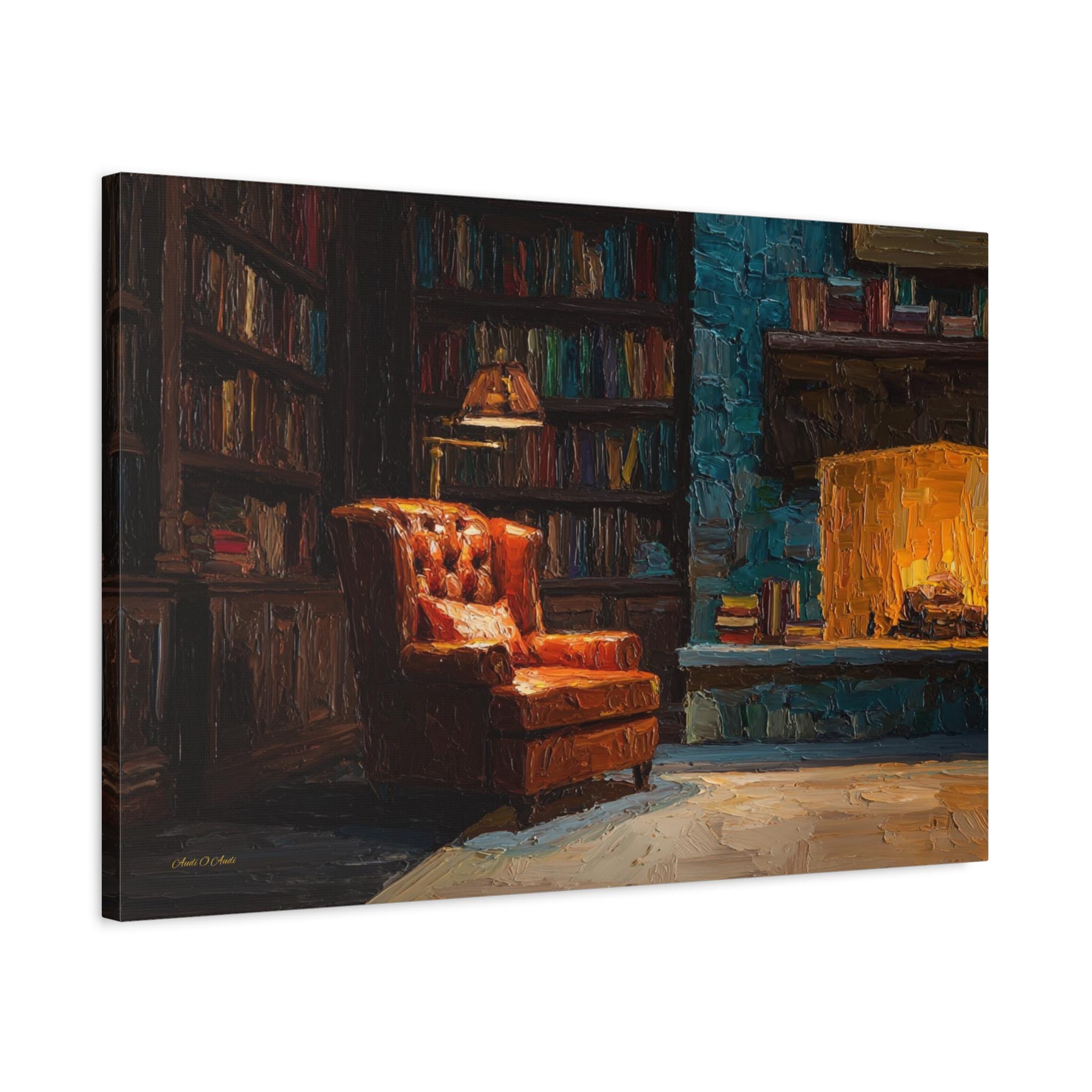 Bring the sophisticated charm, intellectual elegance, and cozy warmth of a classic study into your home with this stunning library fireplace canvas print. This captivating horizontal artwork features a luxurious, tufted cognac leather armchair sitting invitingly beside a roaring stone fireplace. Surrounded by towering, floor-to-ceiling bookshelves and bathed in the warm, golden glow of a vintage reading lamp, the scene is the ultimate bibliophile's dream.