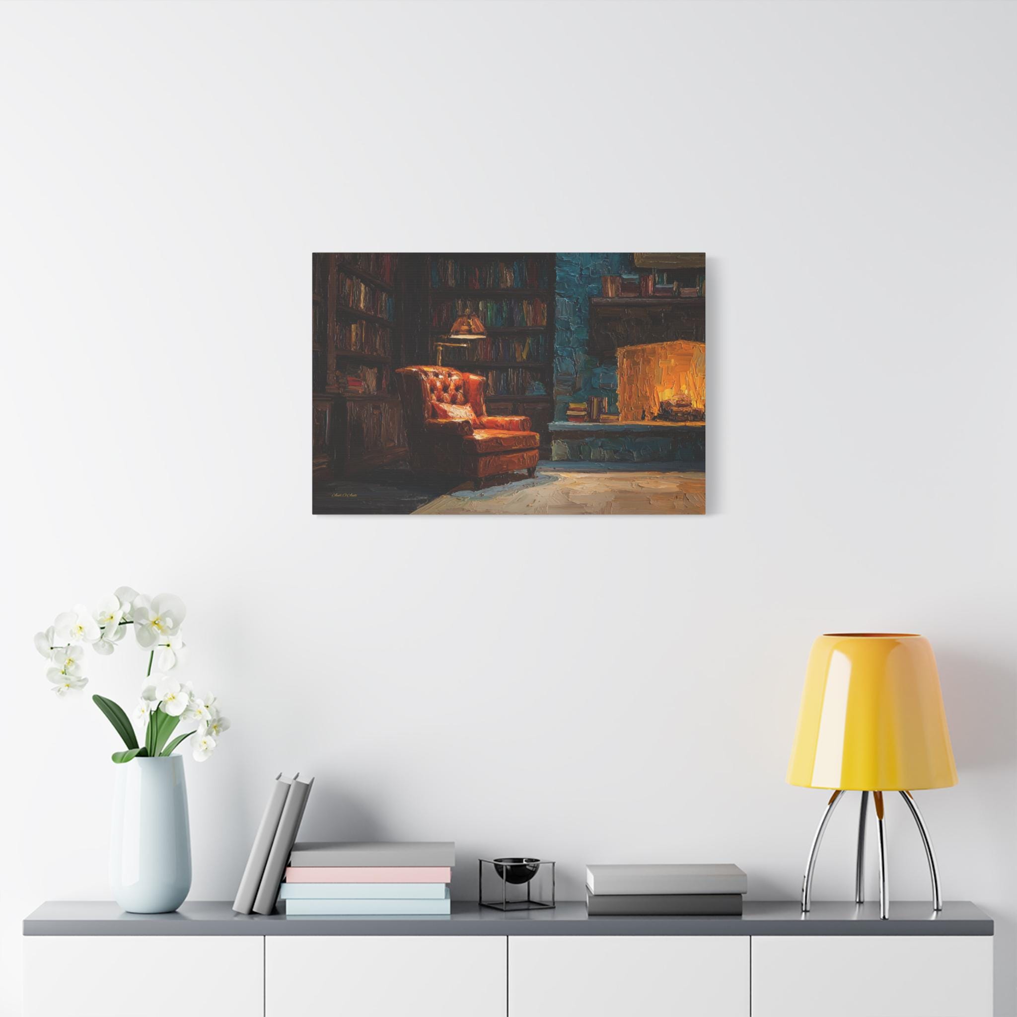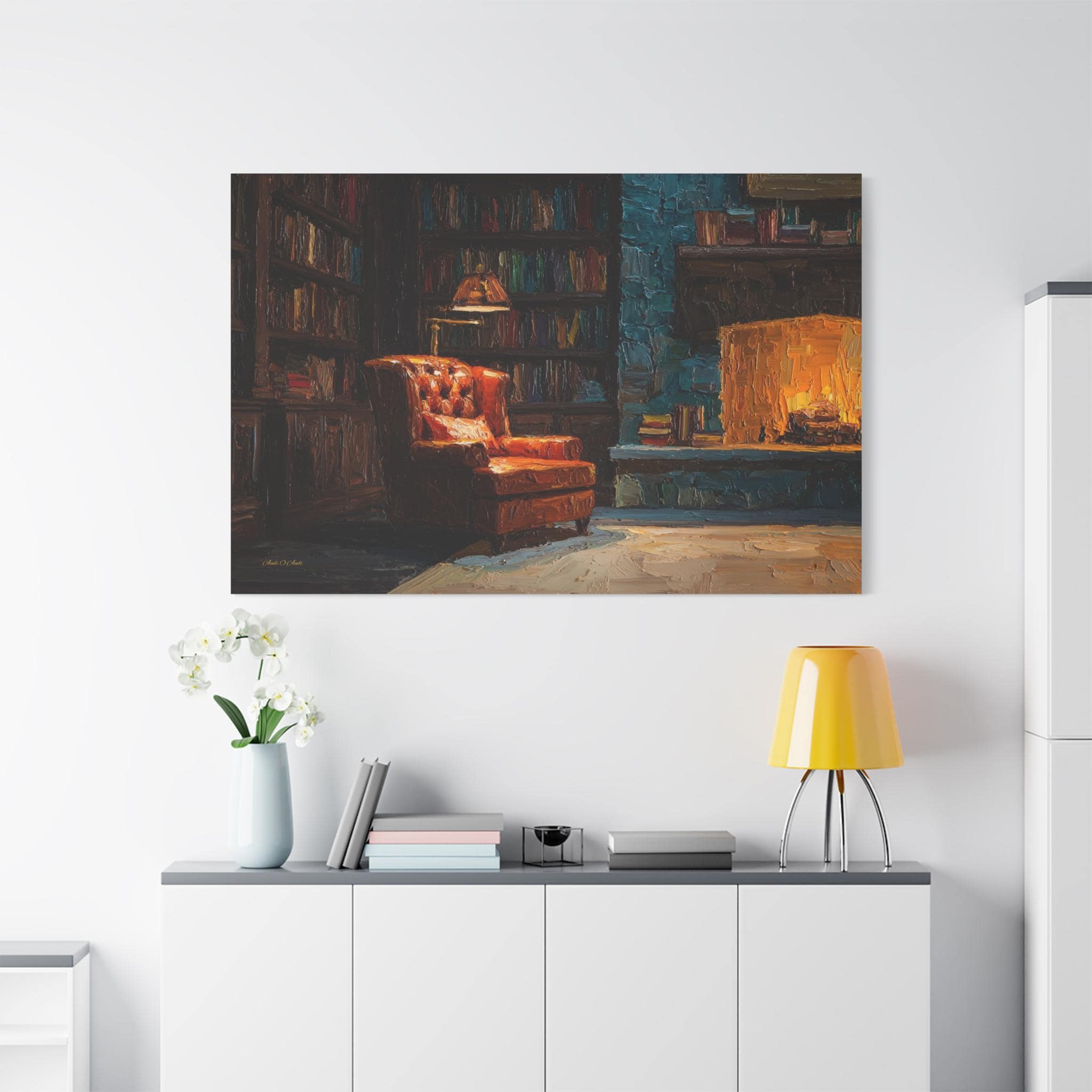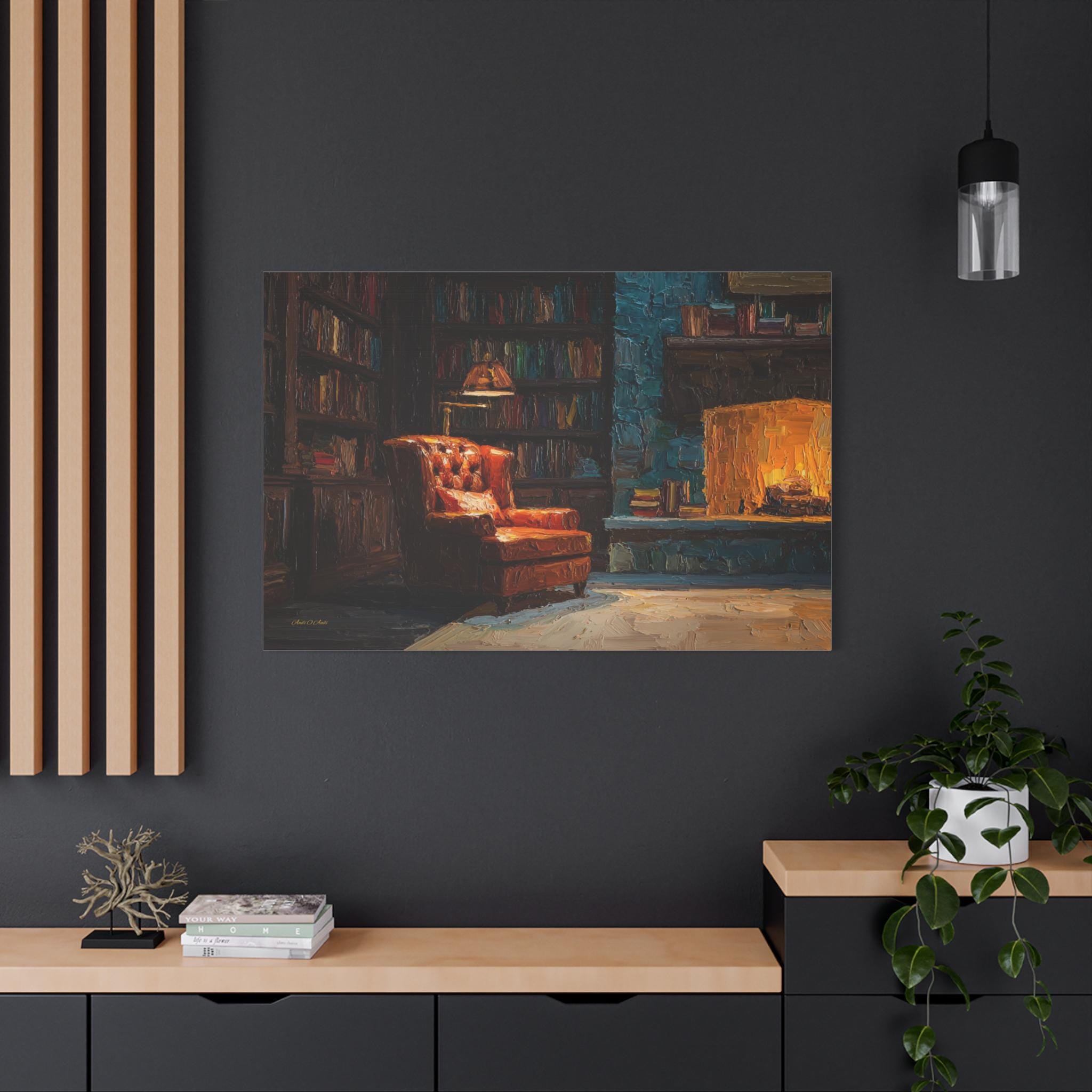 Bring the sophisticated charm, intellectual elegance, and cozy warmth of a classic study into your home with this stunning library fireplace canvas print. This captivating horizontal artwork features a luxurious, tufted cognac leather armchair sitting invitingly beside a roaring stone fireplace. Surrounded by towering, floor-to-ceiling bookshelves and bathed in the warm, golden glow of a vintage reading lamp, the scene is the ultimate bibliophile's dream.