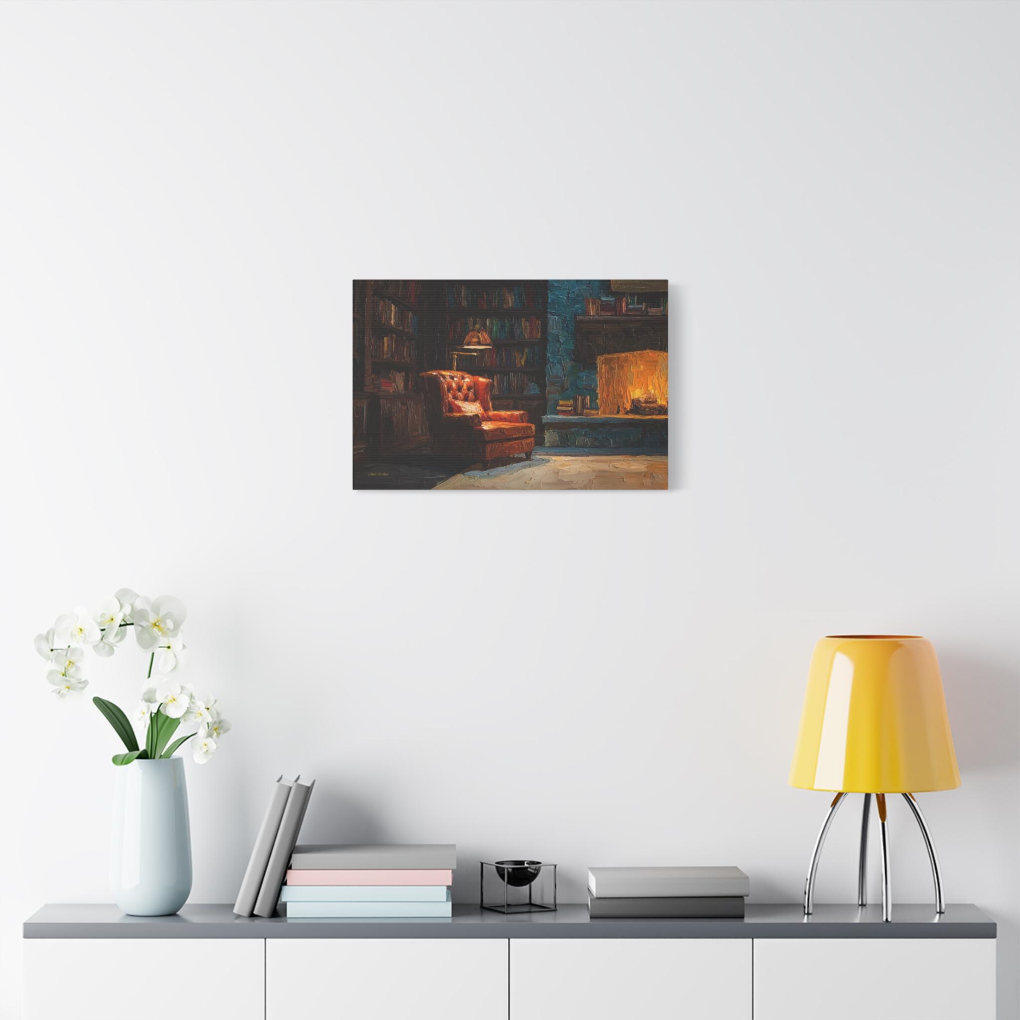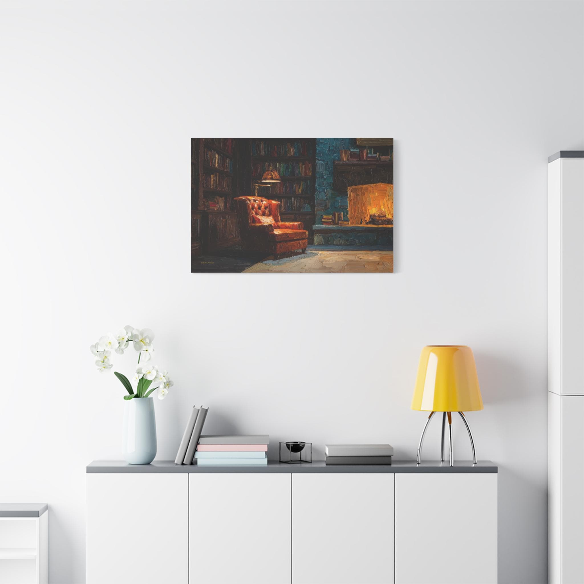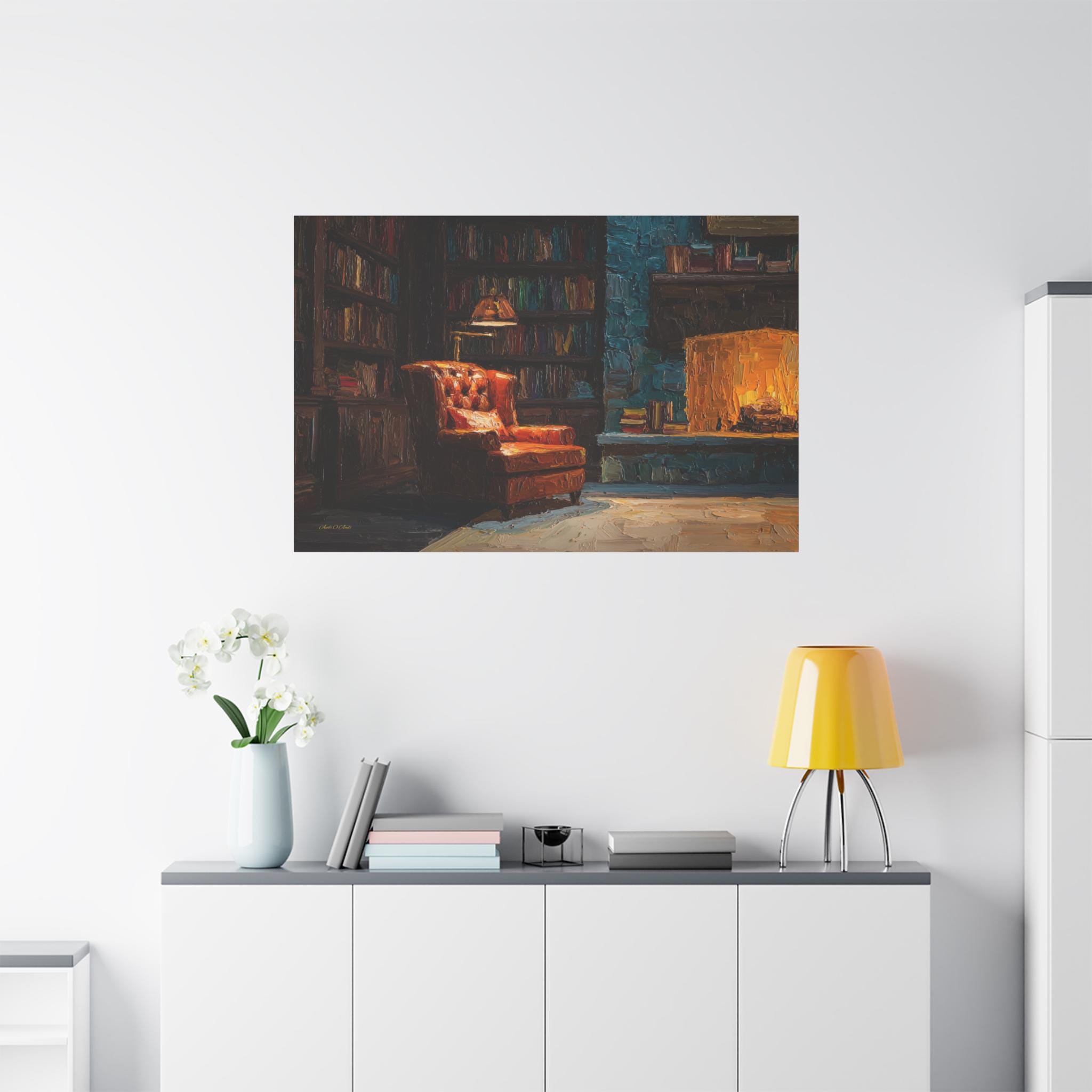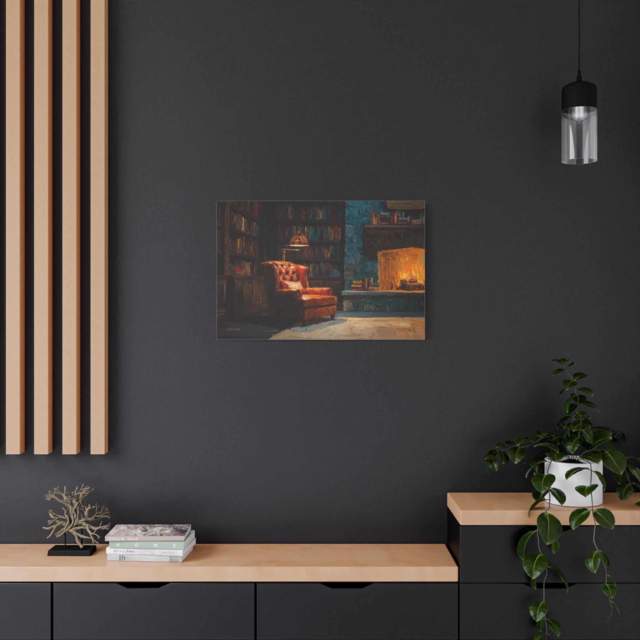Bring the sophisticated charm, intellectual elegance, and cozy warmth of a classic study into your home with this stunning library fireplace canvas print. This captivating horizontal artwork features a luxurious, tufted cognac leather armchair sitting invitingly beside a roaring stone fireplace. Surrounded by towering, floor-to-ceiling bookshelves and bathed in the warm, golden glow of a vintage reading lamp, the scene is the ultimate bibliophile's dream.