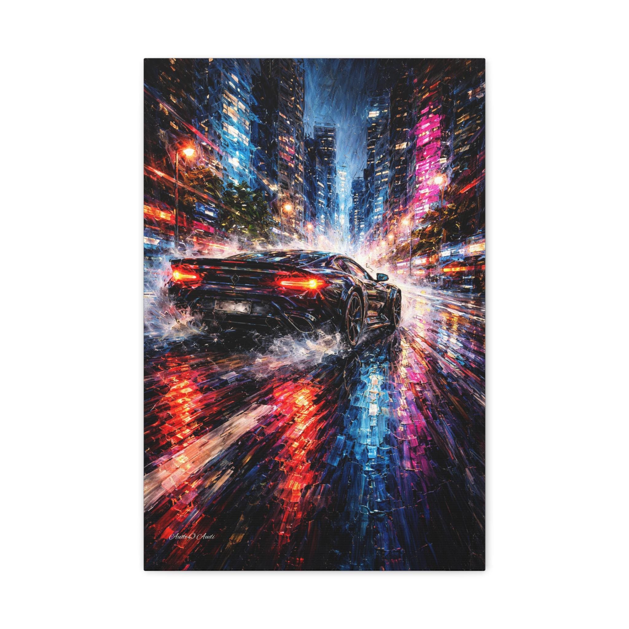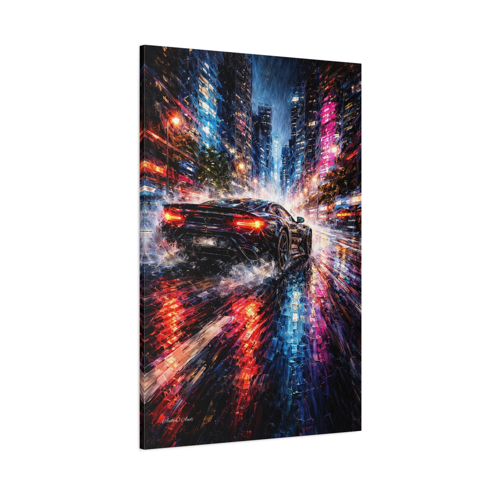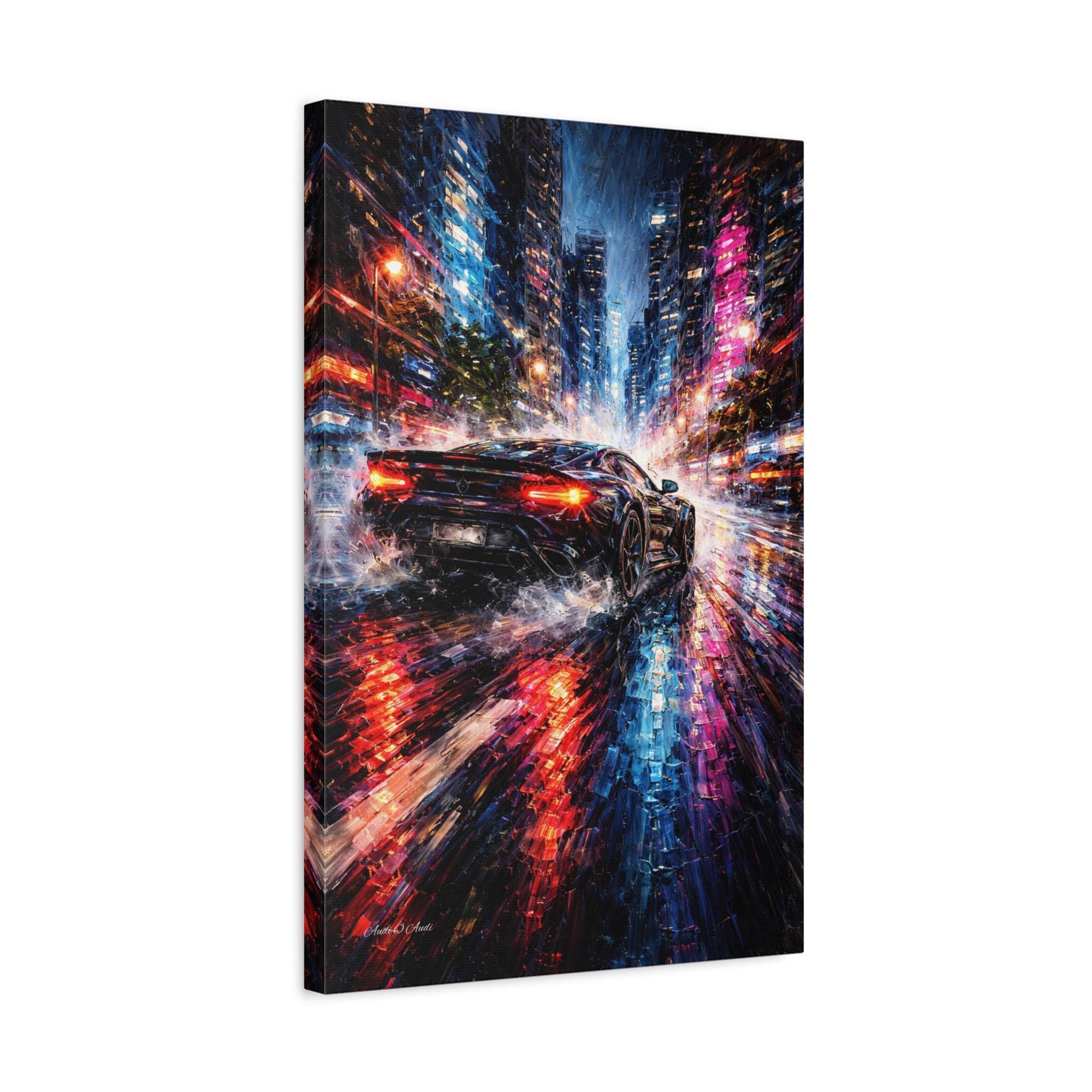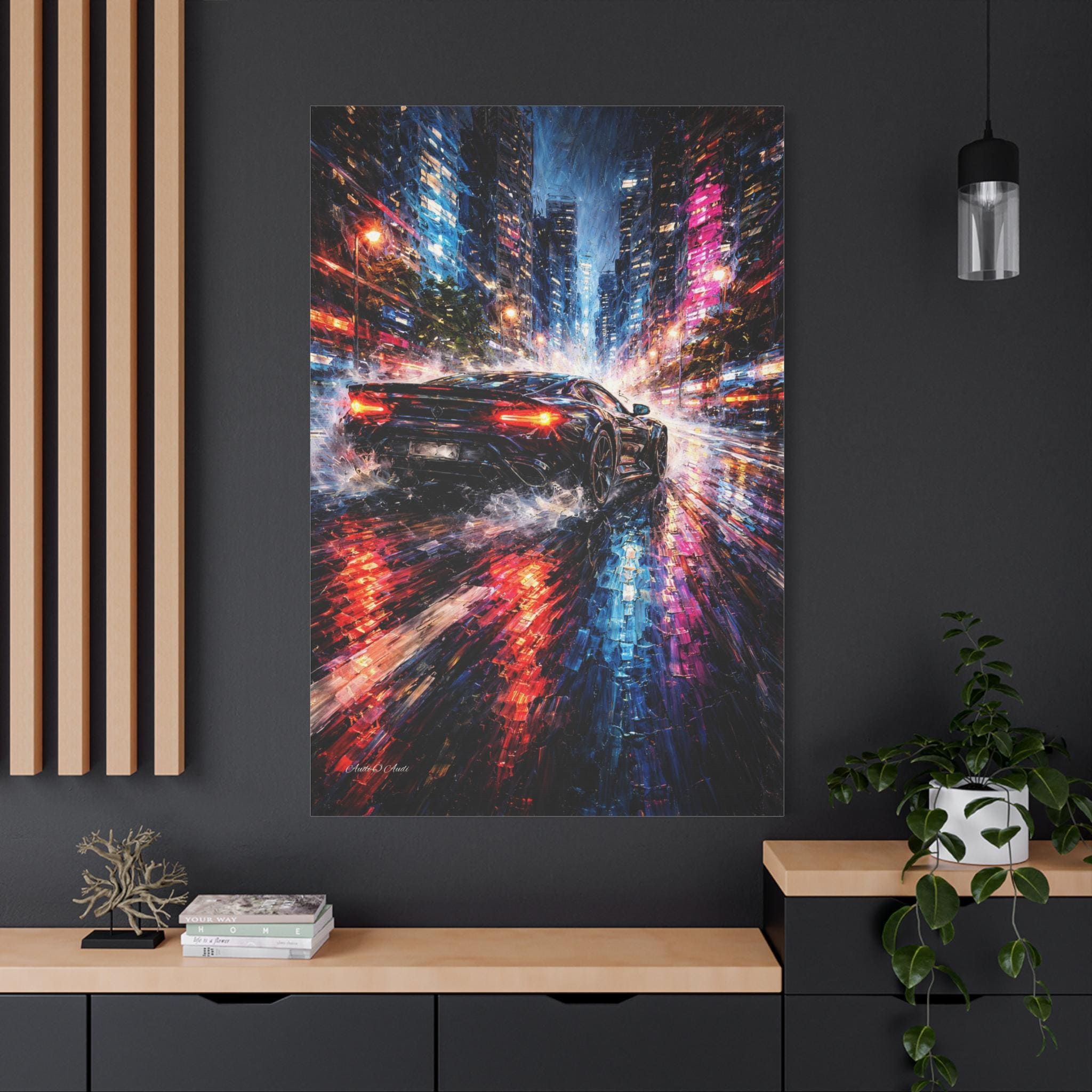 Bring the thrilling adrenaline, cinematic lighting, and explosive modern energy of a high-speed nighttime drive into your home with this stunning neon sports car canvas print. This captivating vertical artwork features a sleek, exotic sports car tearing down a rain-slicked city street. The brilliant neon lights of the towering skyscrapers above reflect beautifully in the wet pavement, creating a vibrant blur of electric blues, striking reds, and vivid magentas.