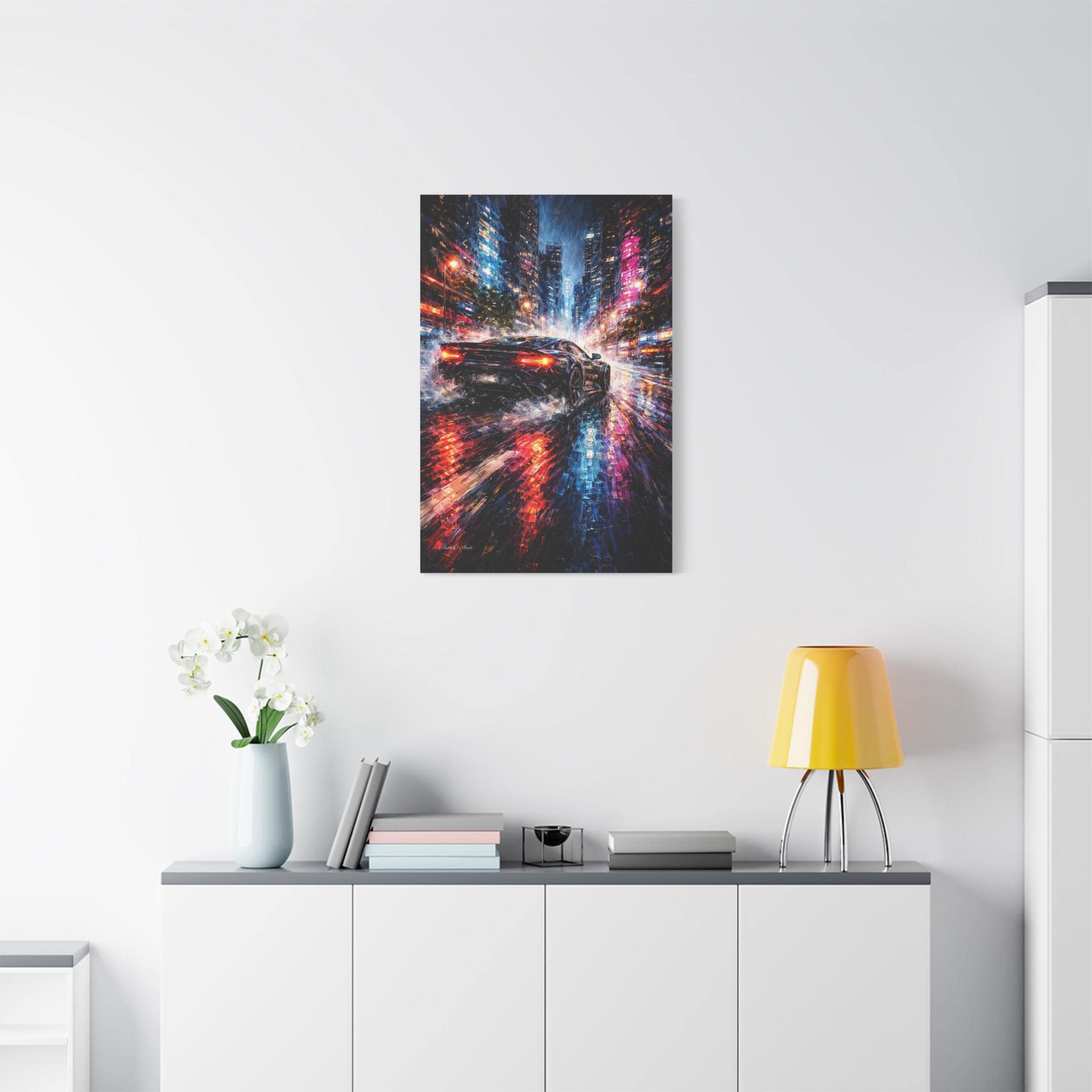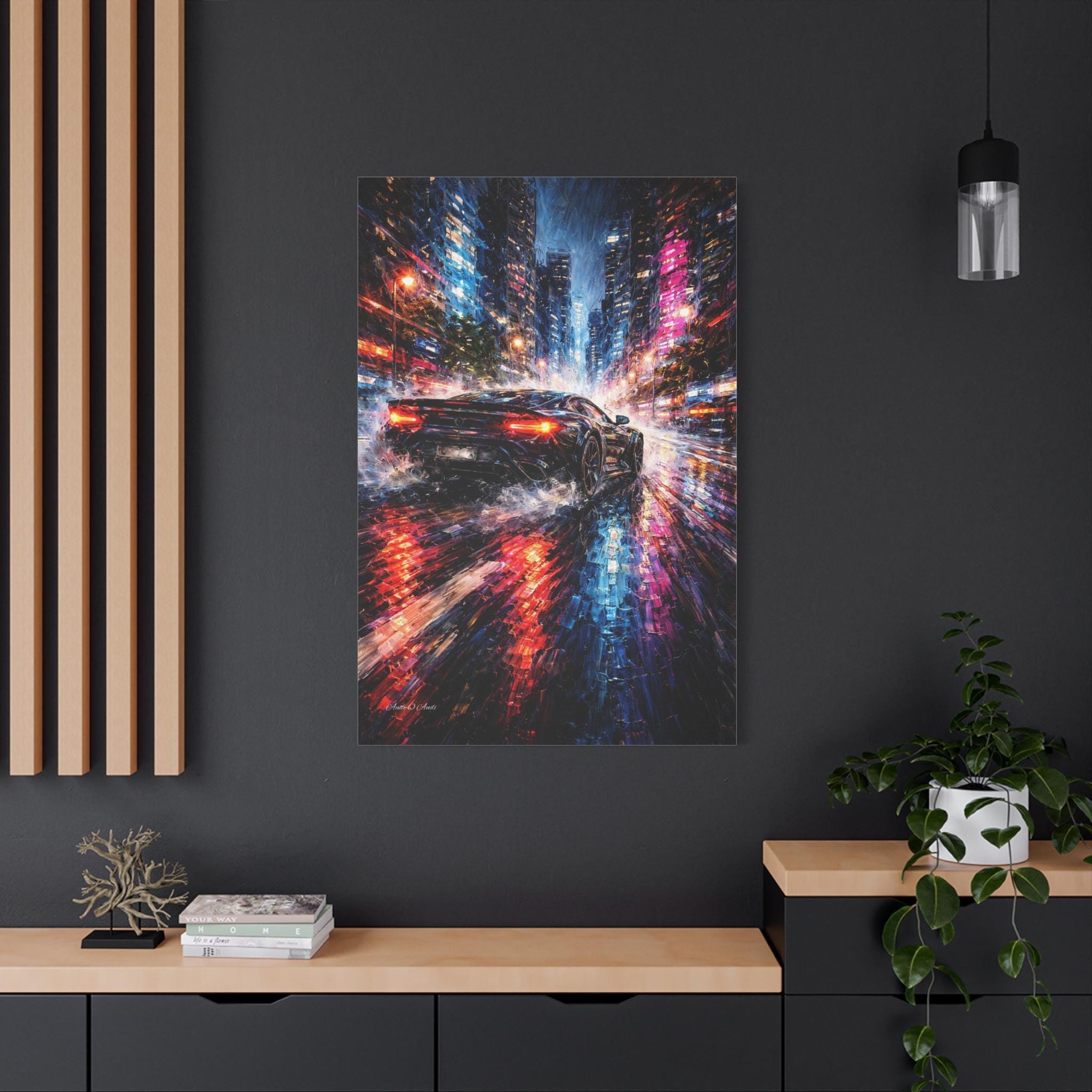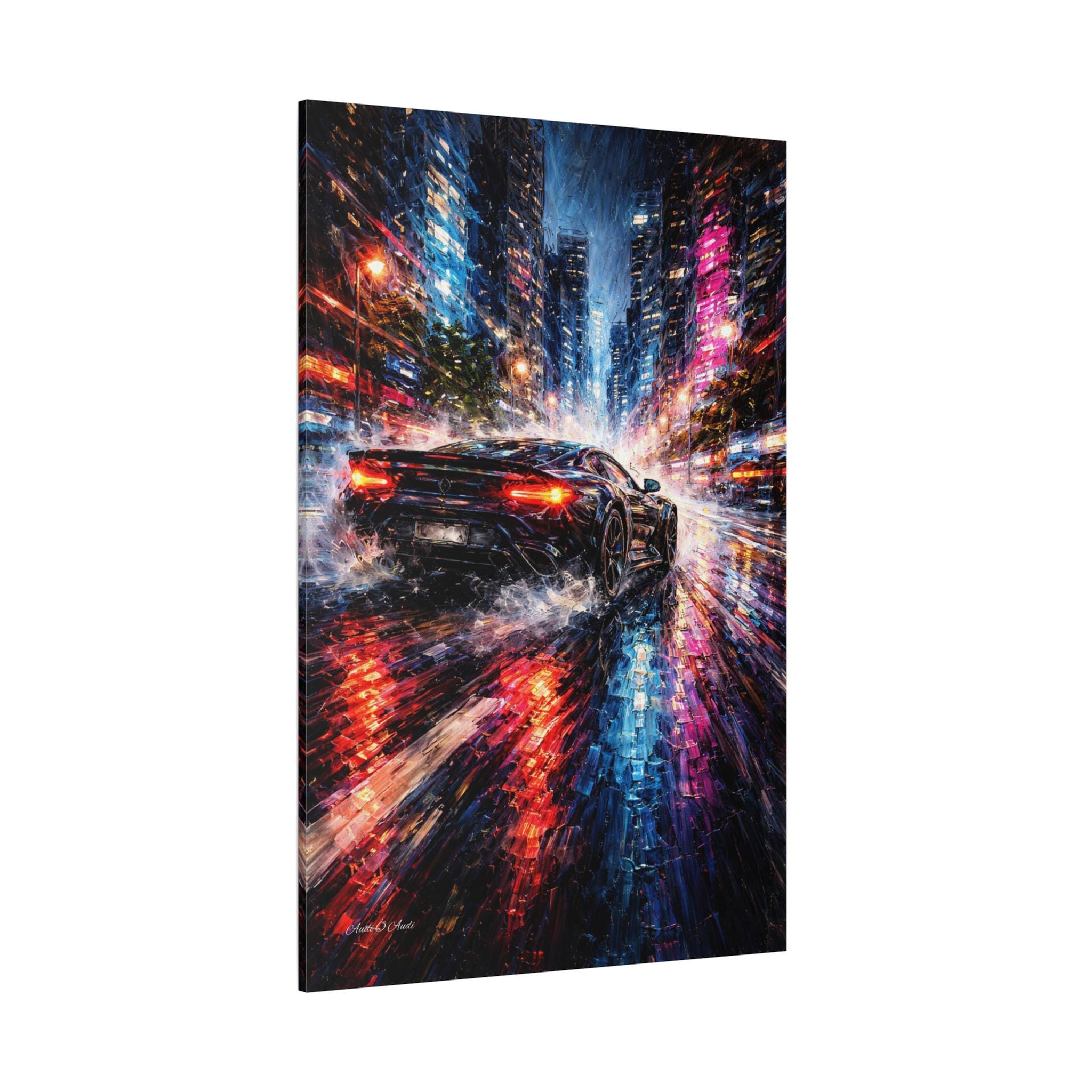 Bring the thrilling adrenaline, cinematic lighting, and explosive modern energy of a high-speed nighttime drive into your home with this stunning neon sports car canvas print. This captivating vertical artwork features a sleek, exotic sports car tearing down a rain-slicked city street. The brilliant neon lights of the towering skyscrapers above reflect beautifully in the wet pavement, creating a vibrant blur of electric blues, striking reds, and vivid magentas.