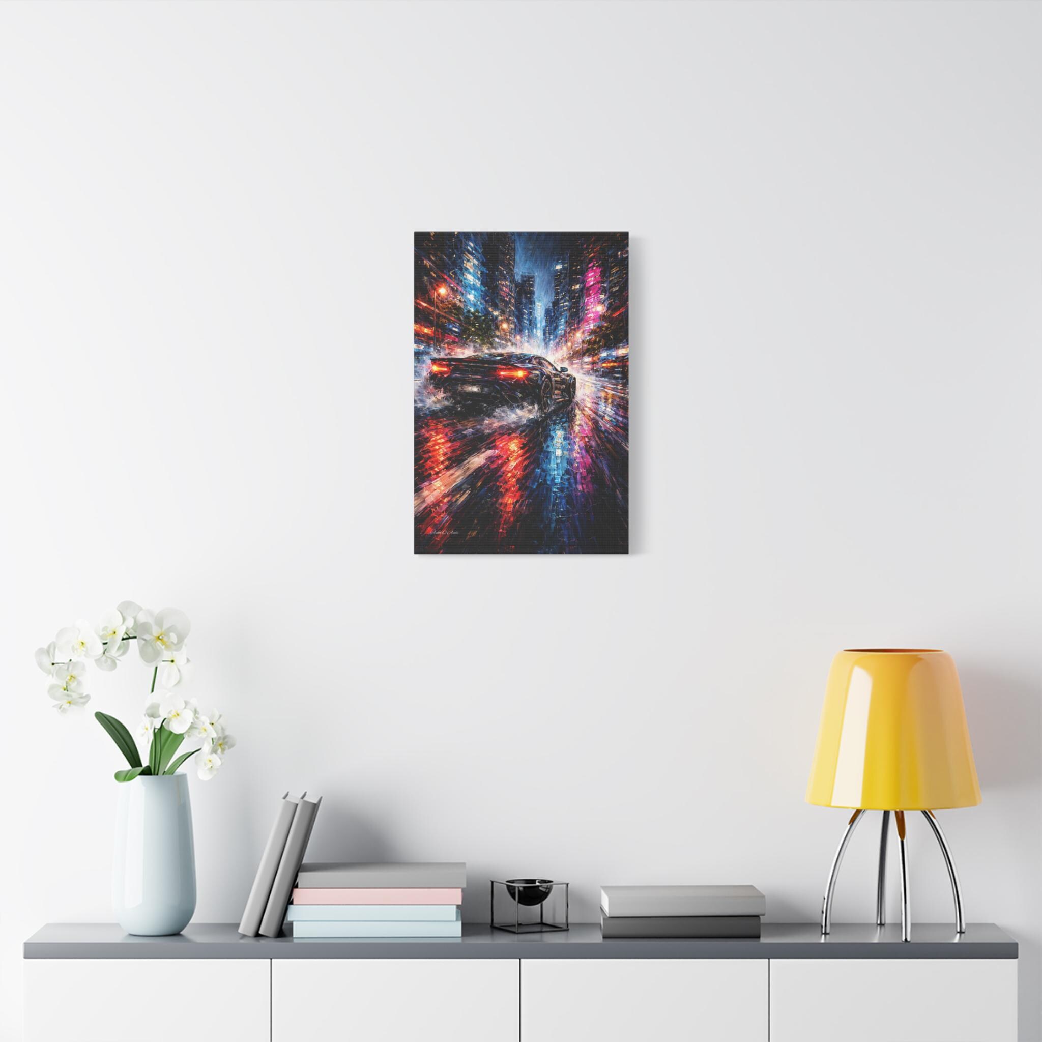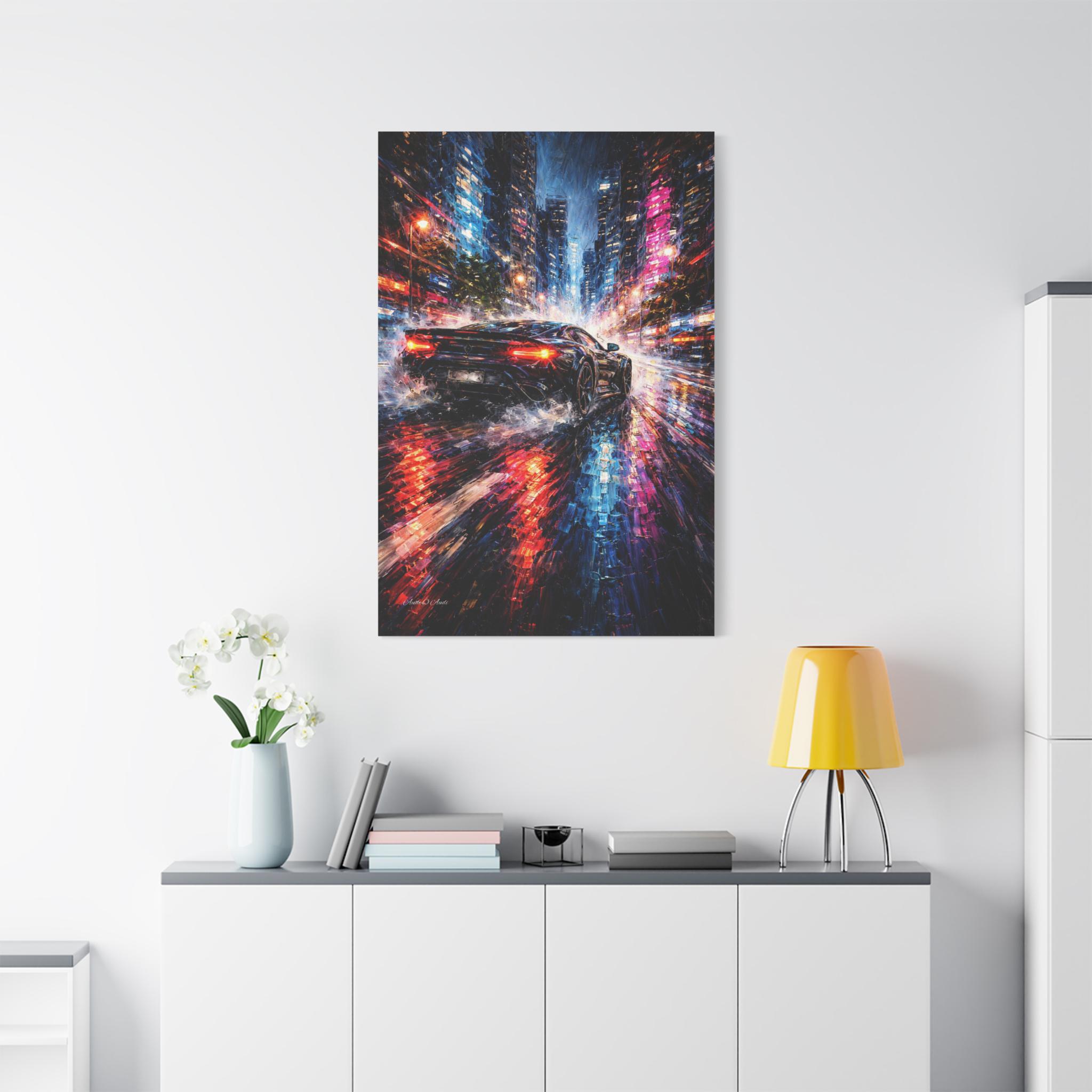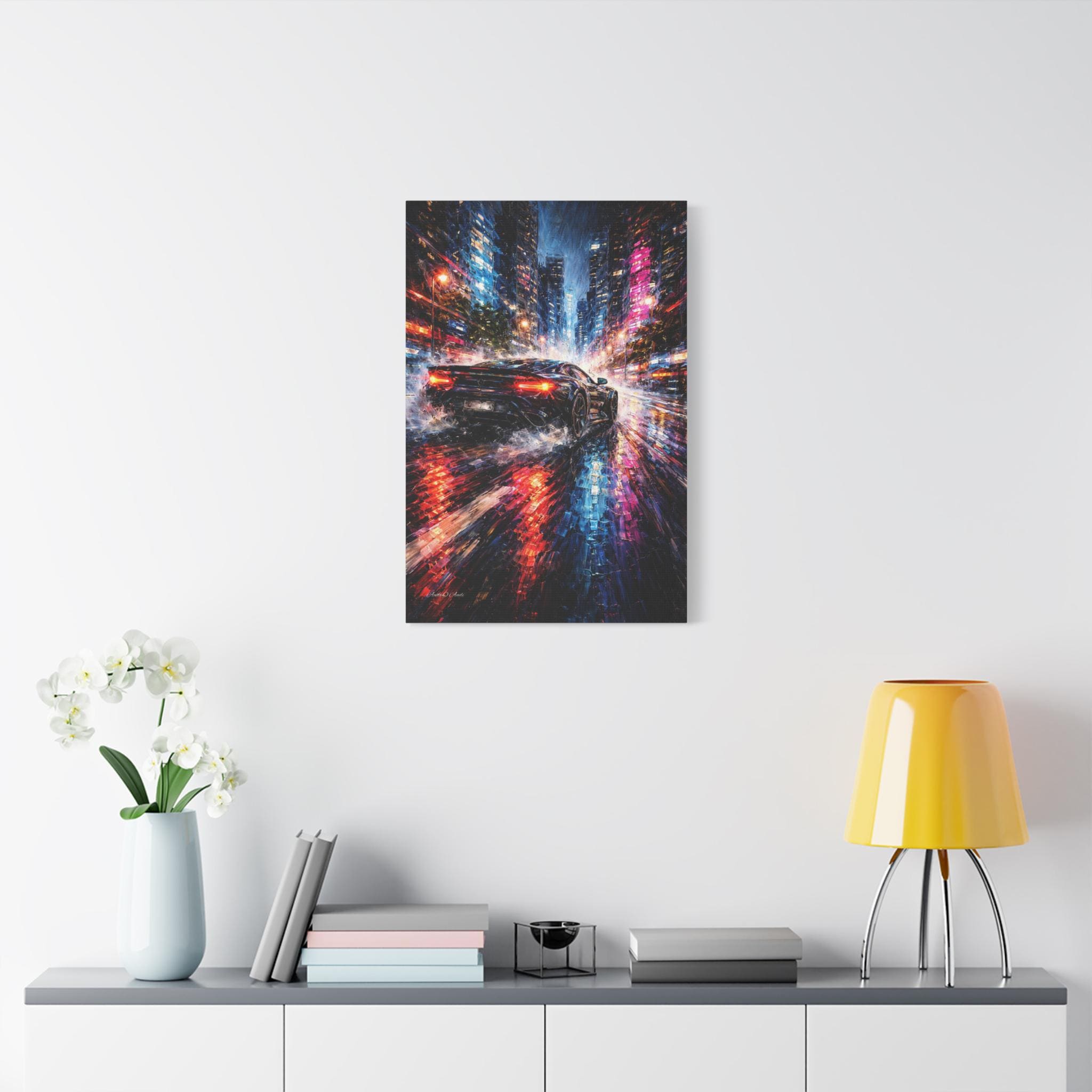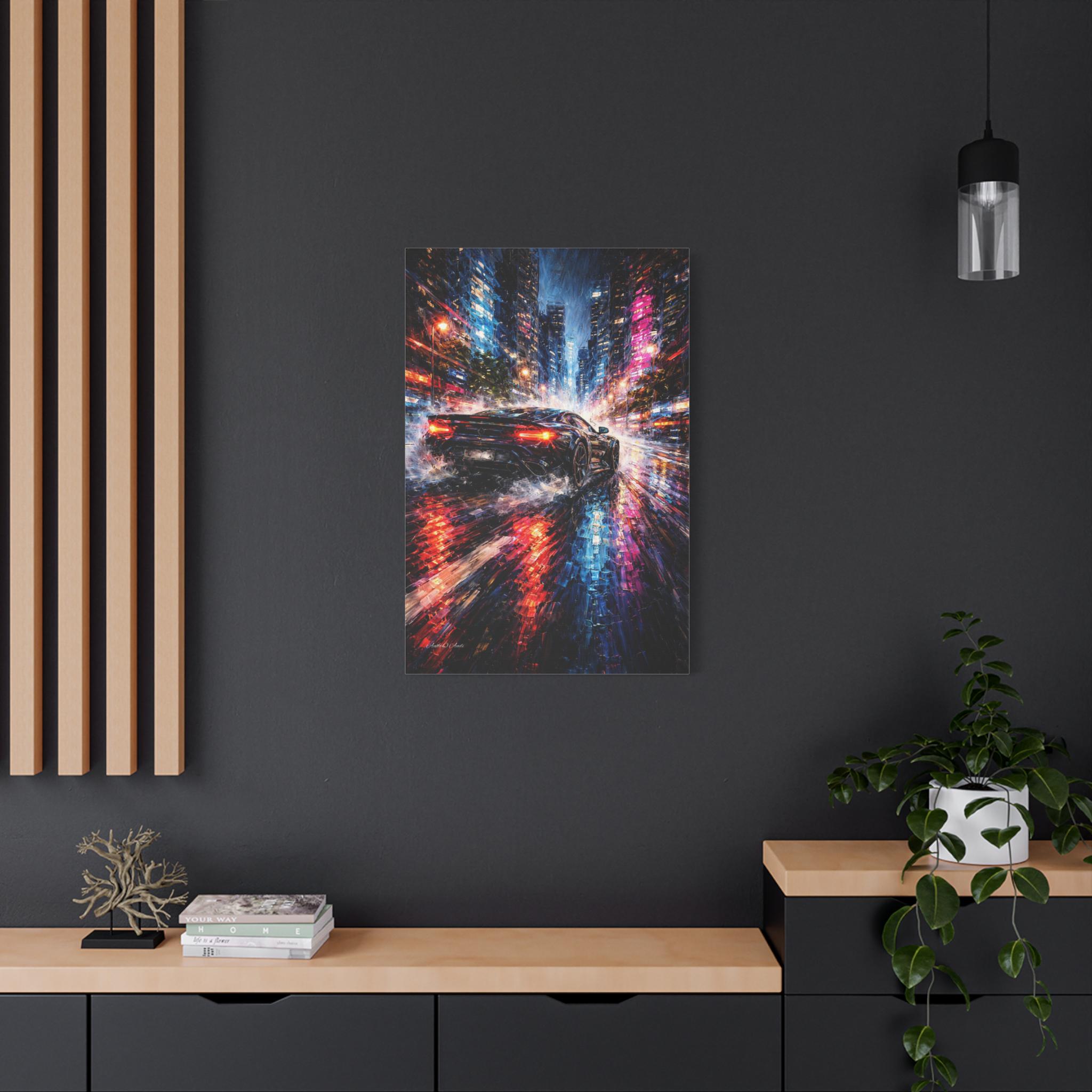 Bring the thrilling adrenaline, cinematic lighting, and explosive modern energy of a high-speed nighttime drive into your home with this stunning neon sports car canvas print. This captivating vertical artwork features a sleek, exotic sports car tearing down a rain-slicked city street. The brilliant neon lights of the towering skyscrapers above reflect beautifully in the wet pavement, creating a vibrant blur of electric blues, striking reds, and vivid magentas.