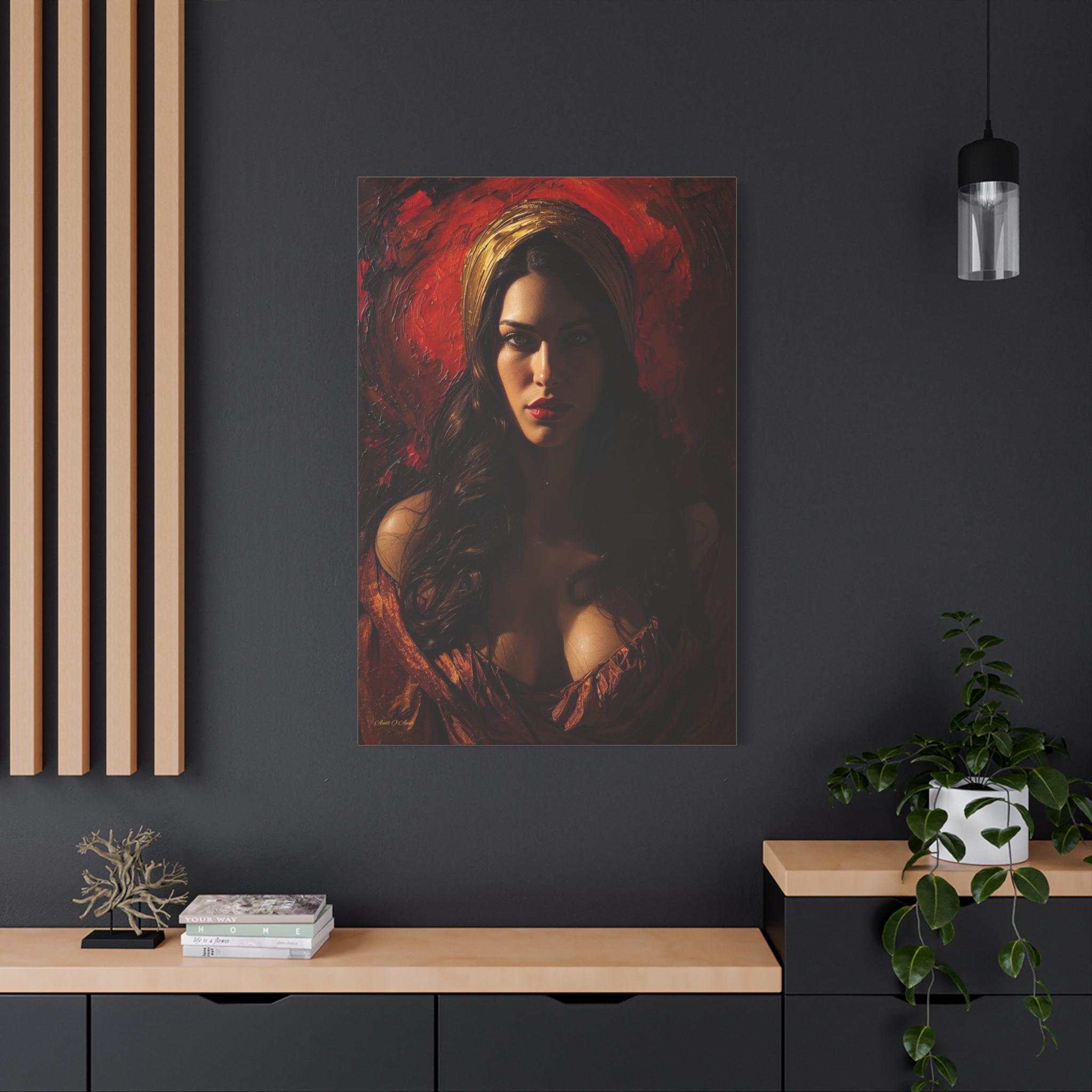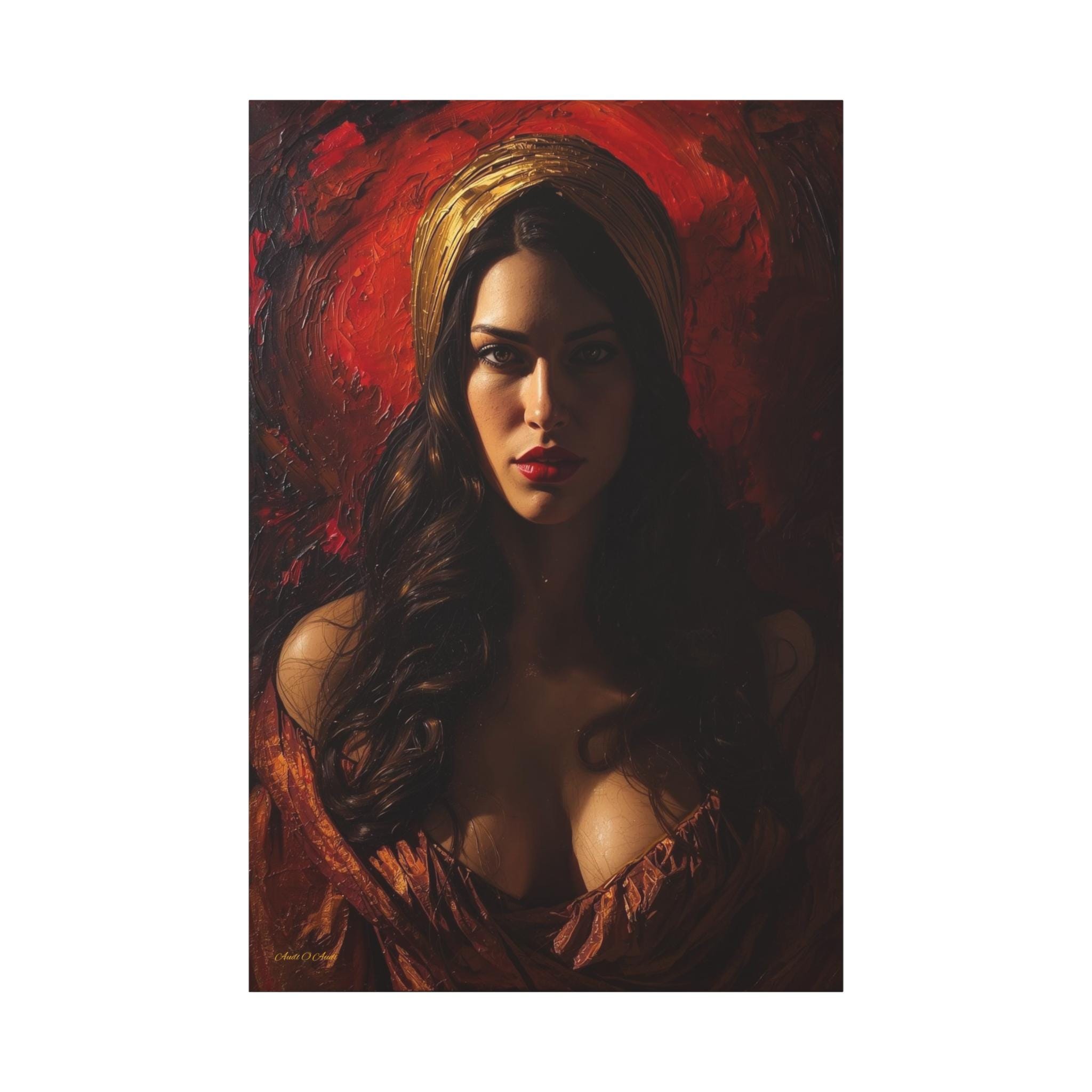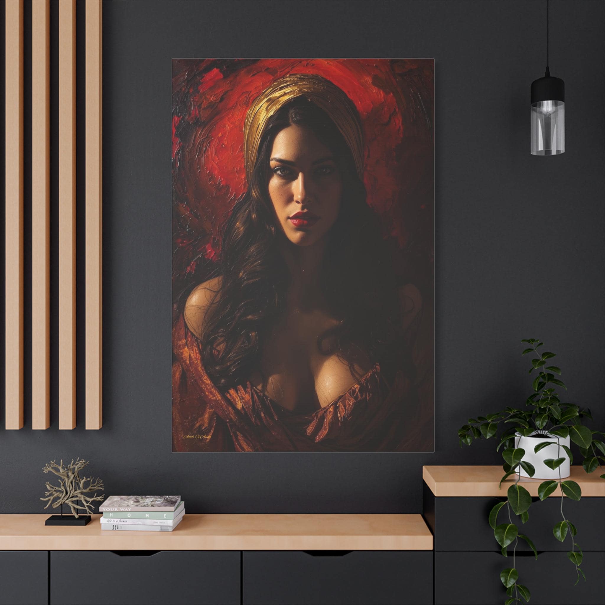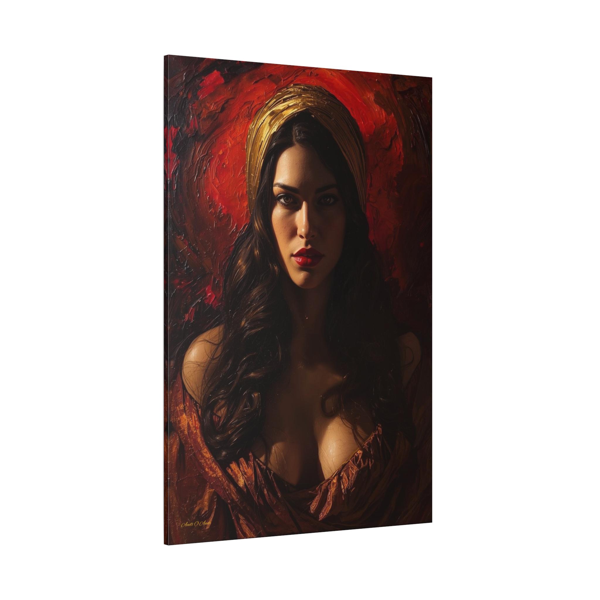 Bring captivating allure, dramatic elegance, and rich, moody warmth into your home with this stunning female portrait canvas print. This striking vertical artwork features the beautiful, expressive face of a dark-haired woman adorned in a luminous golden headband and a draped copper gown. She gazes out with a quiet, sensual intensity, set against a highly textured, fiery background of deep crimsons and swirling ruby reds.