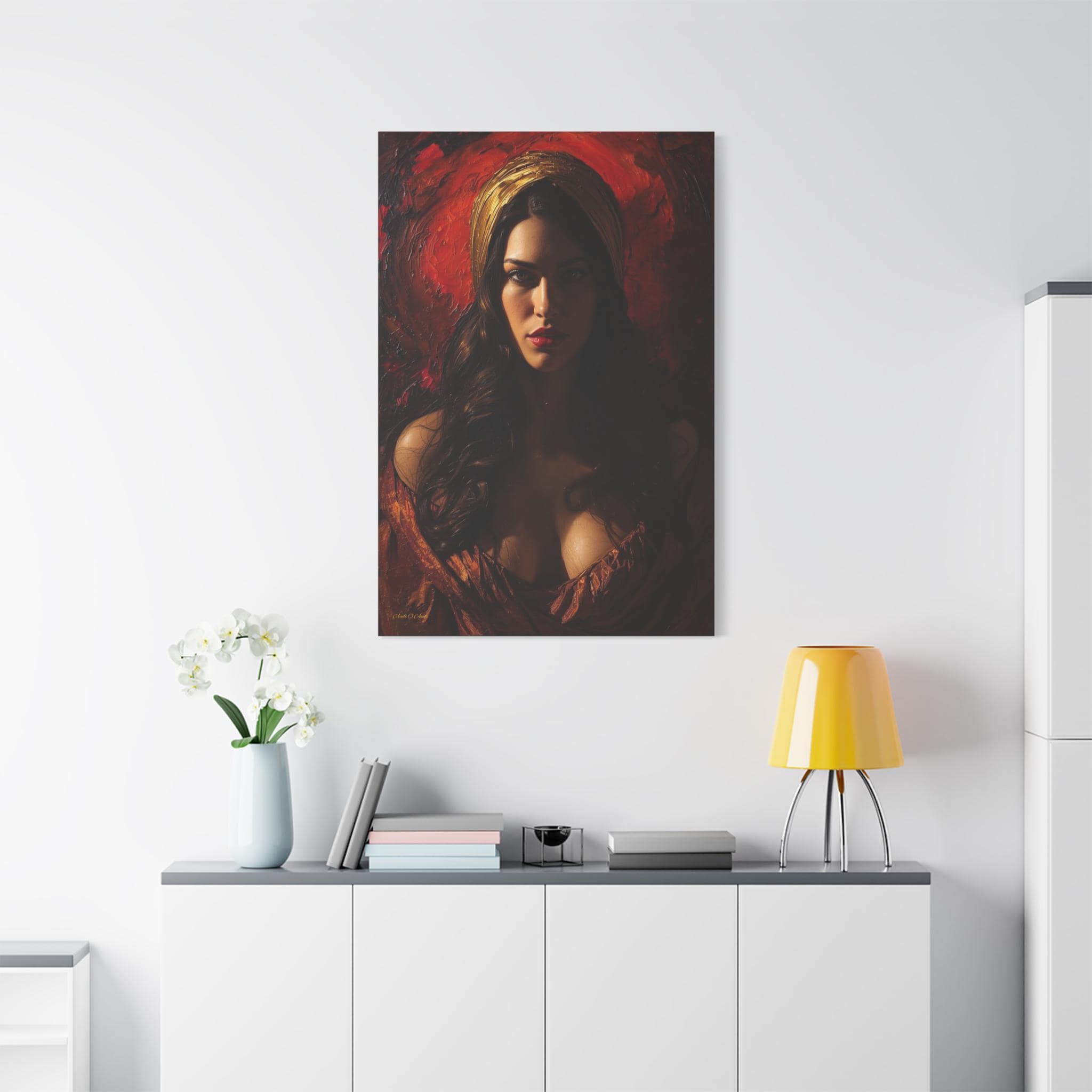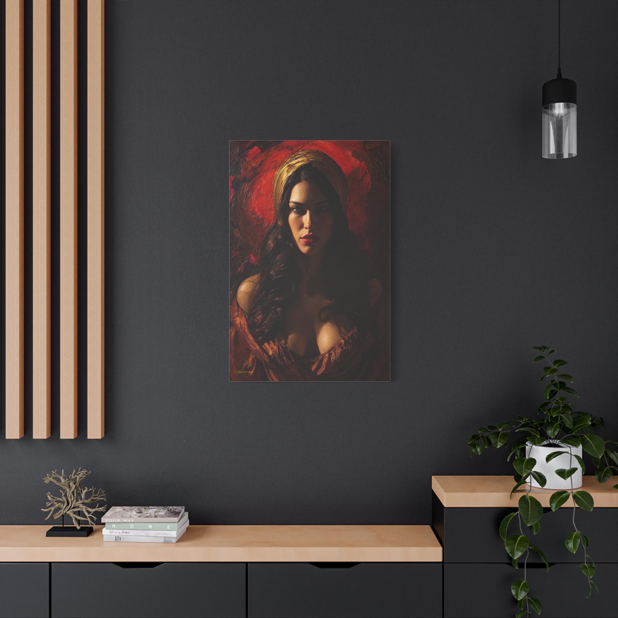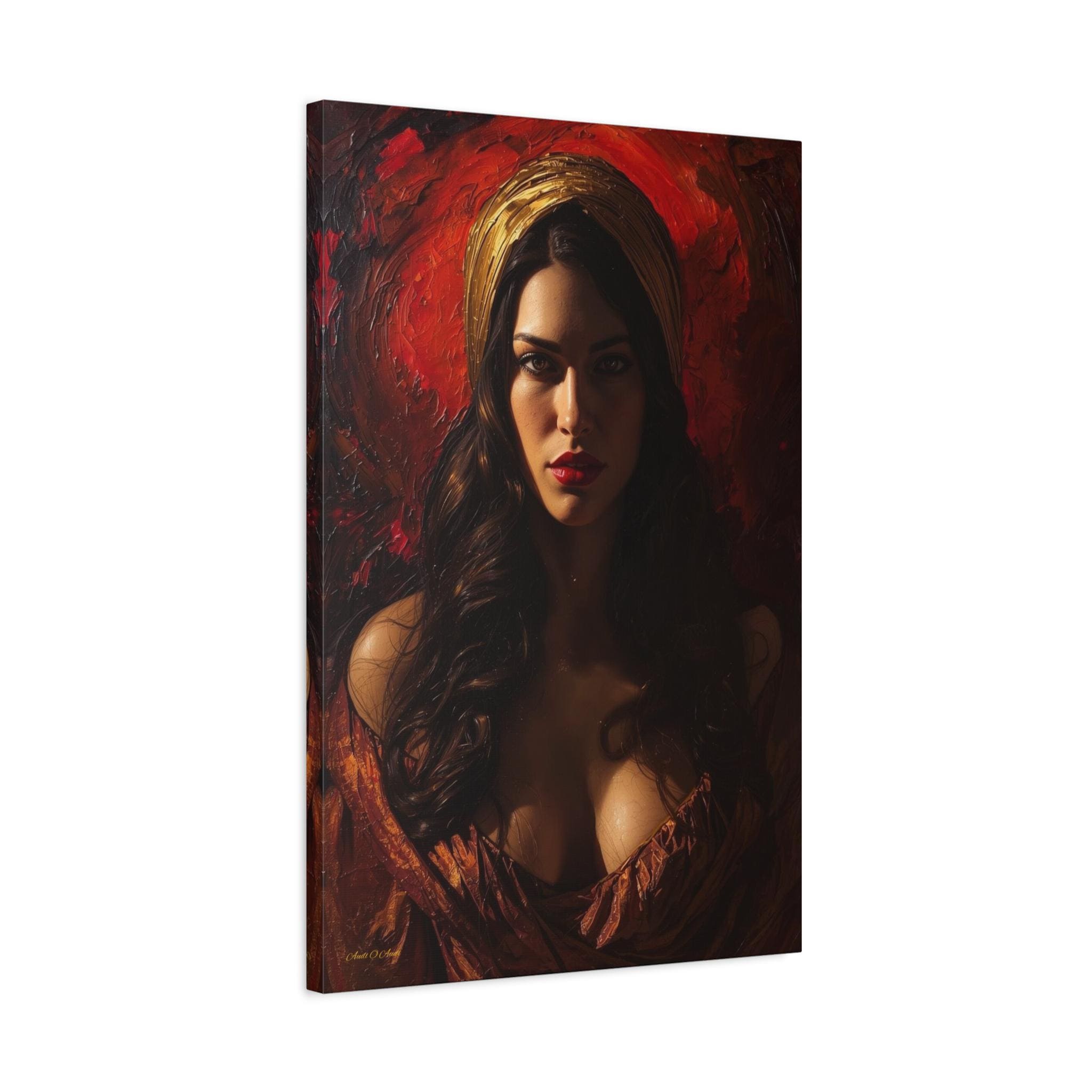 Bring captivating allure, dramatic elegance, and rich, moody warmth into your home with this stunning female portrait canvas print. This striking vertical artwork features the beautiful, expressive face of a dark-haired woman adorned in a luminous golden headband and a draped copper gown. She gazes out with a quiet, sensual intensity, set against a highly textured, fiery background of deep crimsons and swirling ruby reds.