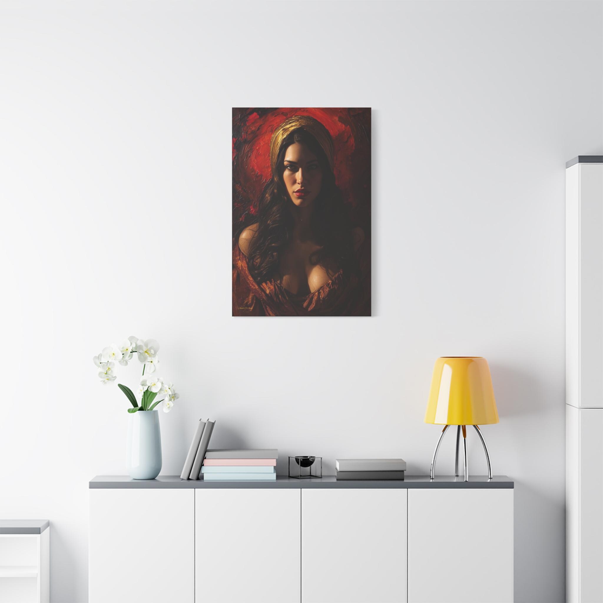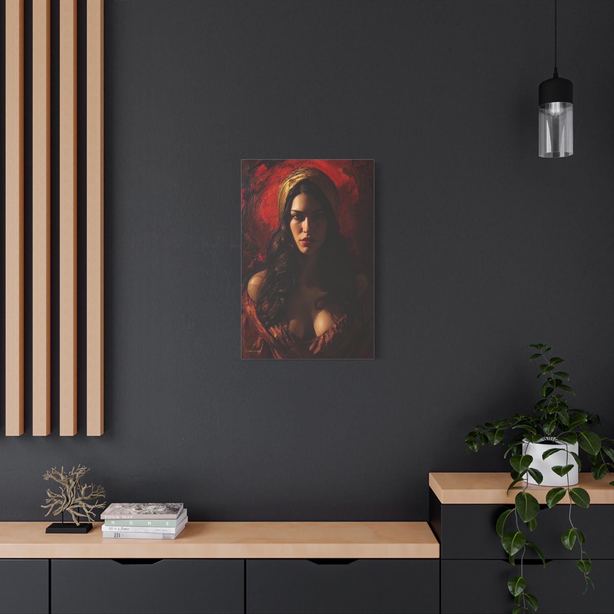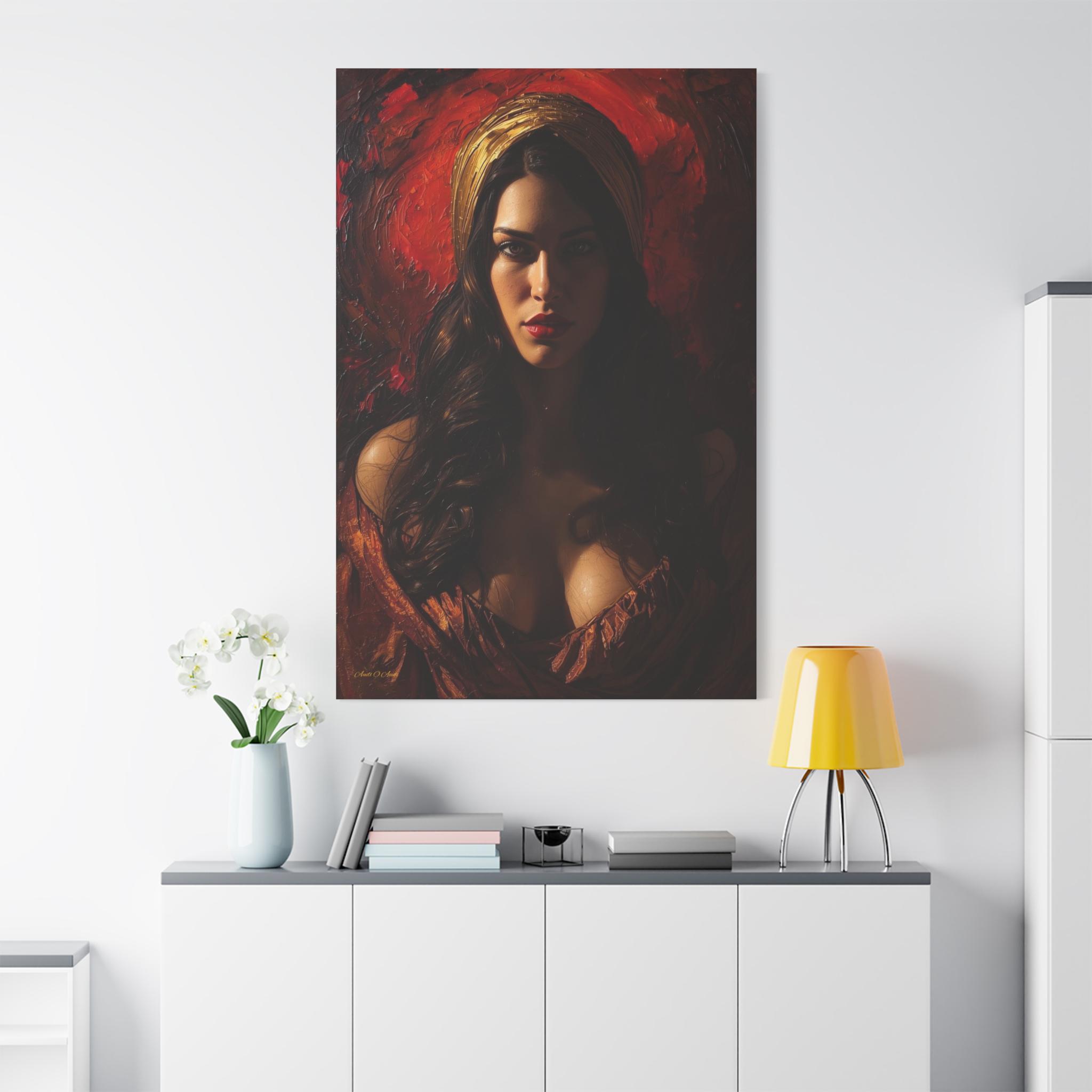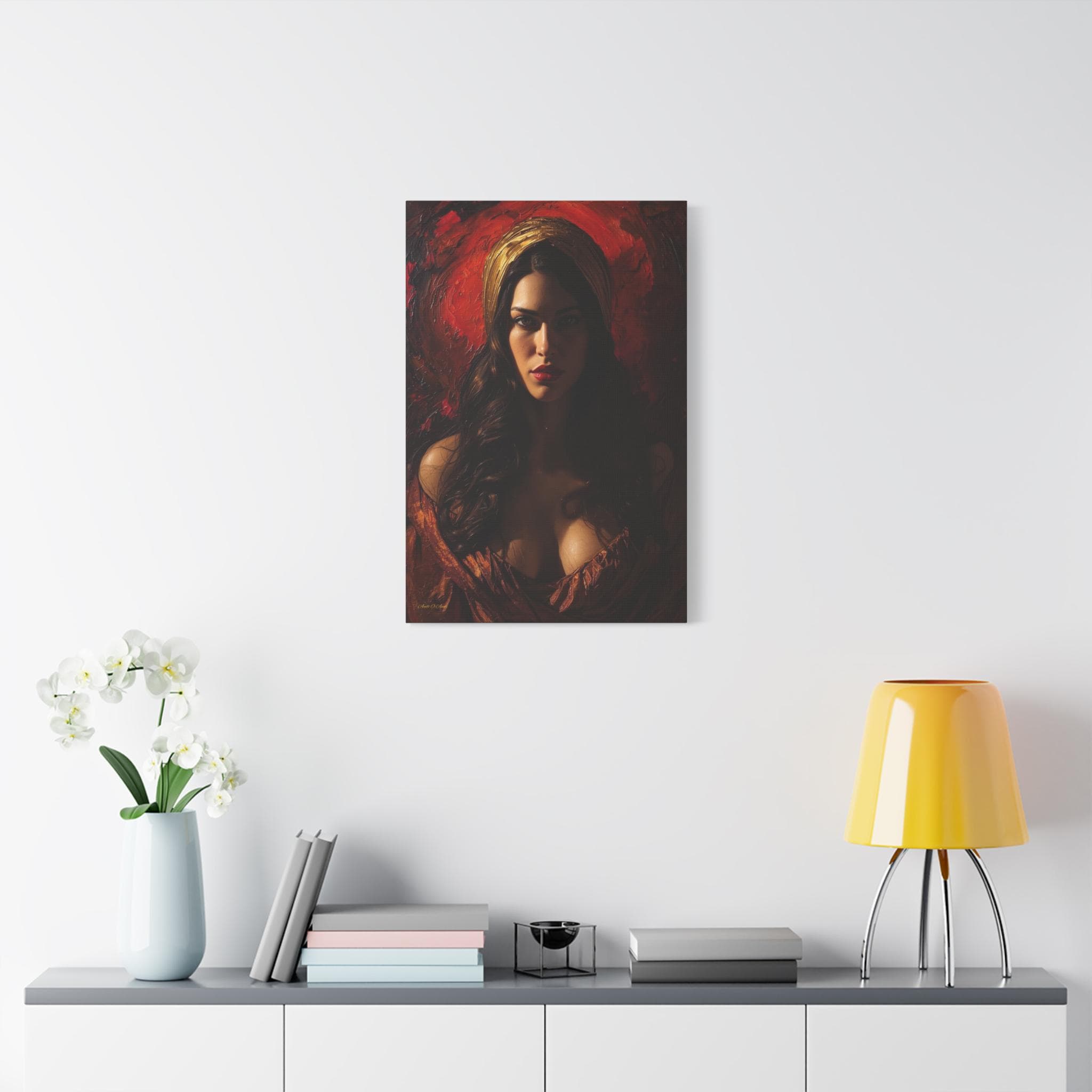 Bring captivating allure, dramatic elegance, and rich, moody warmth into your home with this stunning female portrait canvas print. This striking vertical artwork features the beautiful, expressive face of a dark-haired woman adorned in a luminous golden headband and a draped copper gown. She gazes out with a quiet, sensual intensity, set against a highly textured, fiery background of deep crimsons and swirling ruby reds.