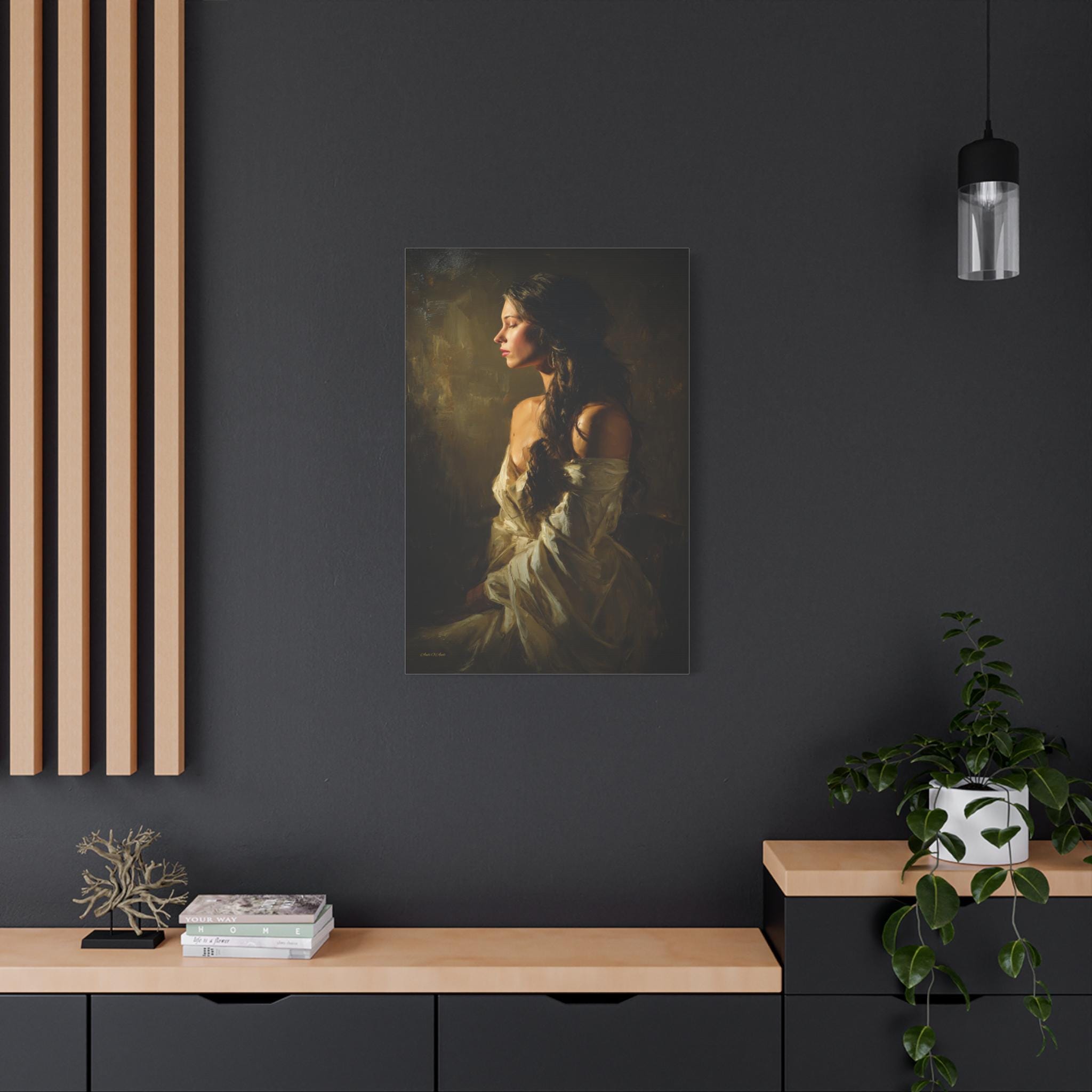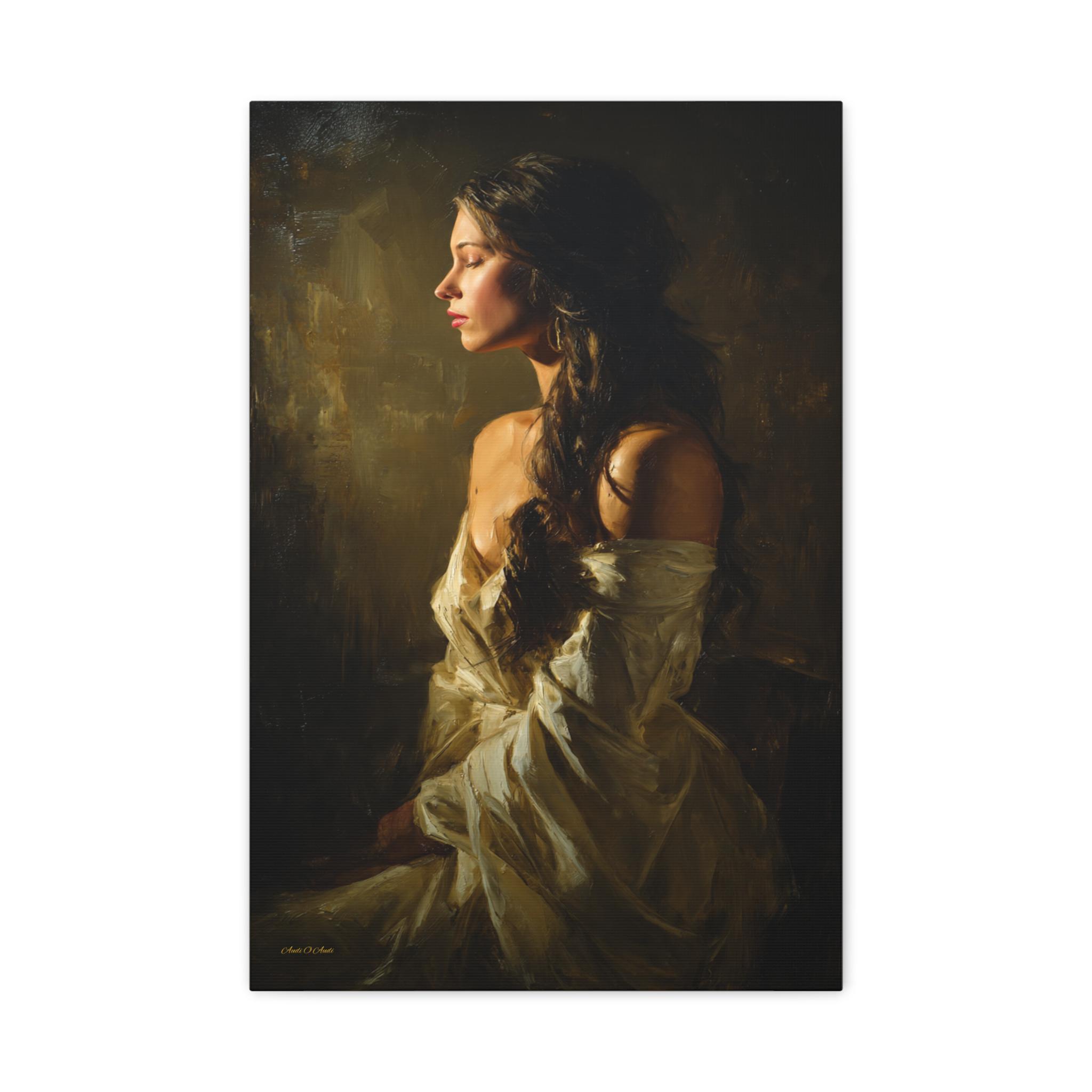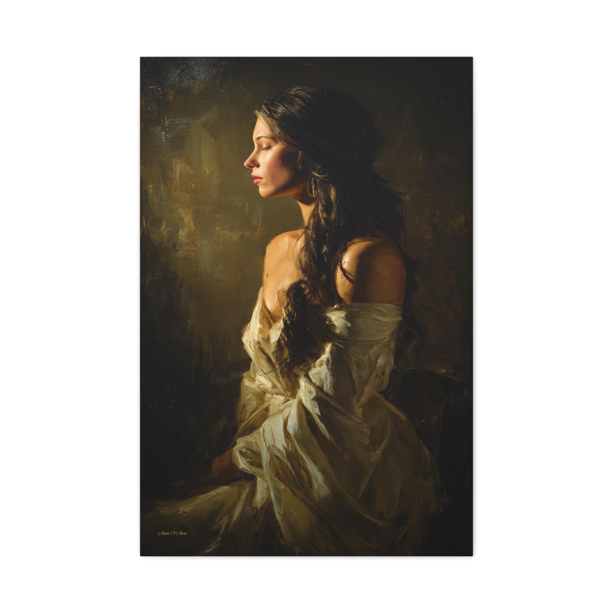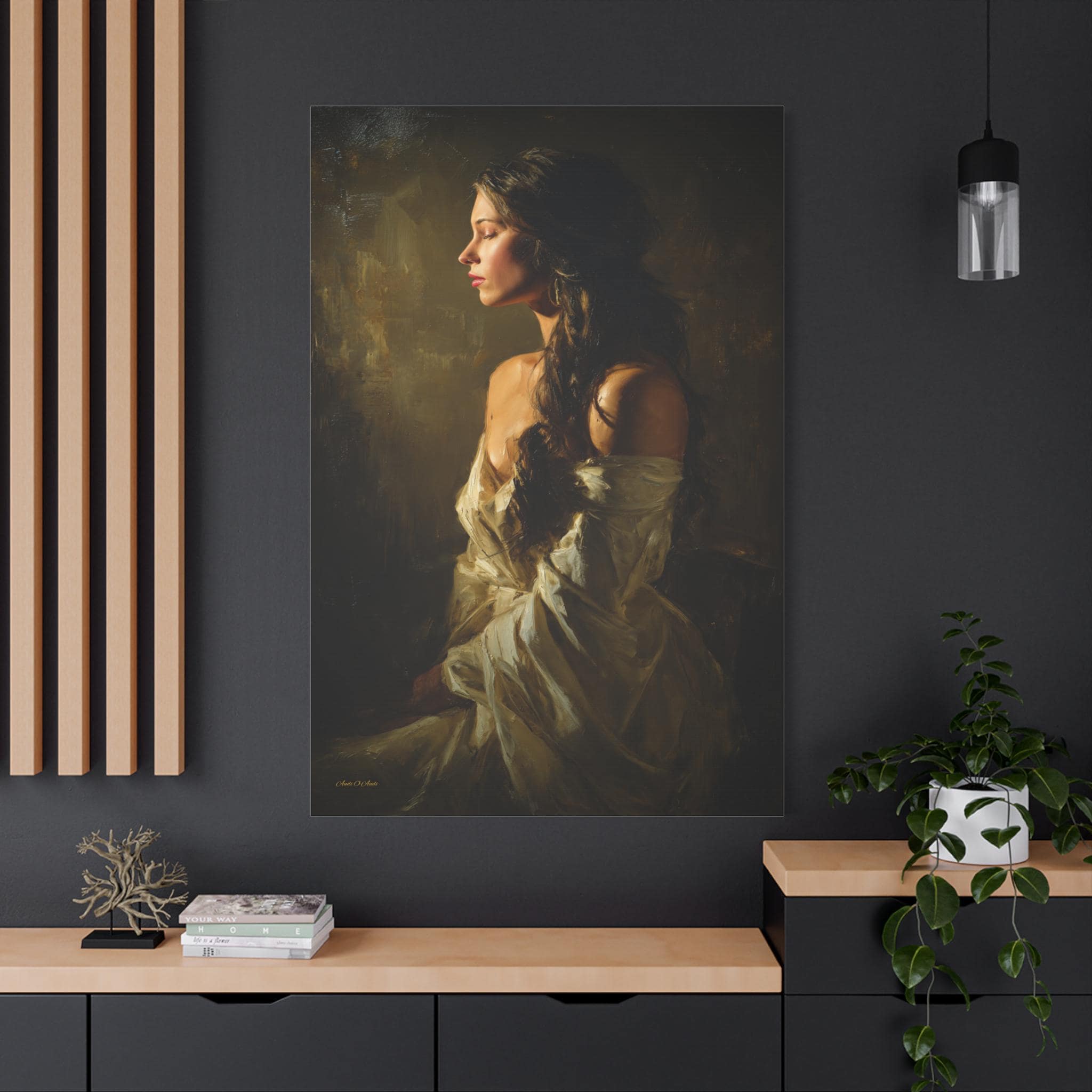 Bring the breathtaking elegance, quiet romance, and timeless beauty of classic fine art into your home with this stunning vintage woman portrait canvas print. This captivating vertical artwork features the serene profile of a woman with her eyes closed in peaceful contemplation. Bathed in soft, dramatic light against a moody, earthy background, her flowing dark hair and draped cream gown evoke the masterful chiaroscuro style of Renaissance and Baroque painters.