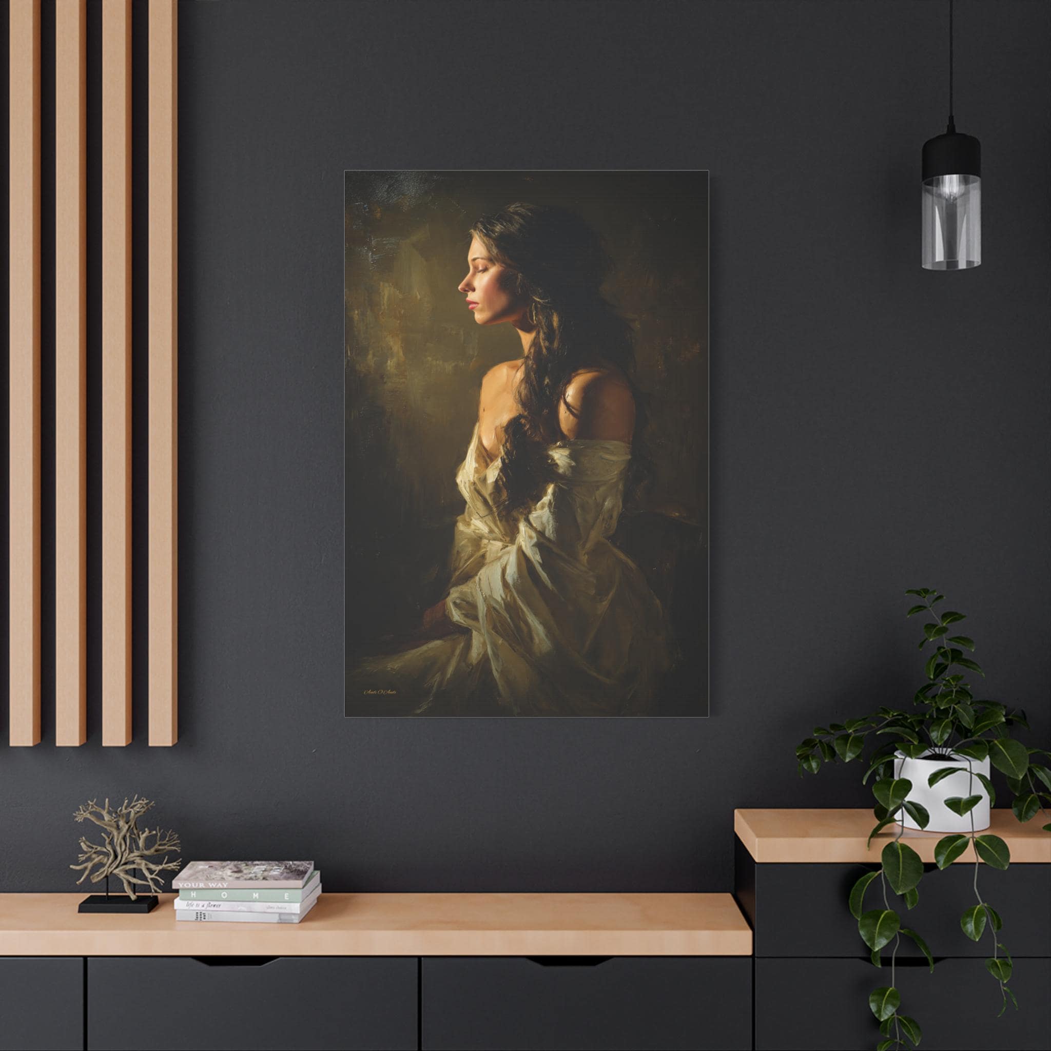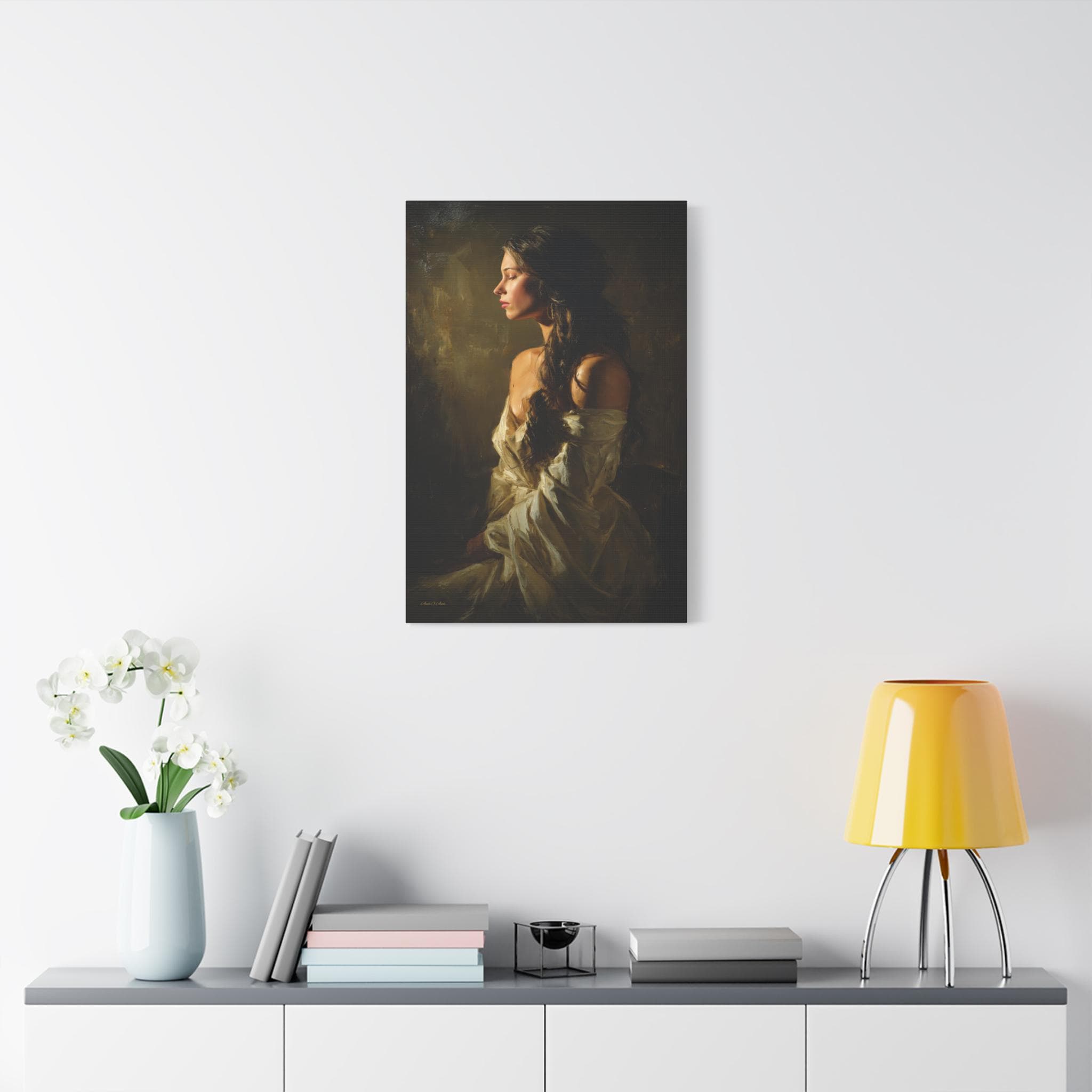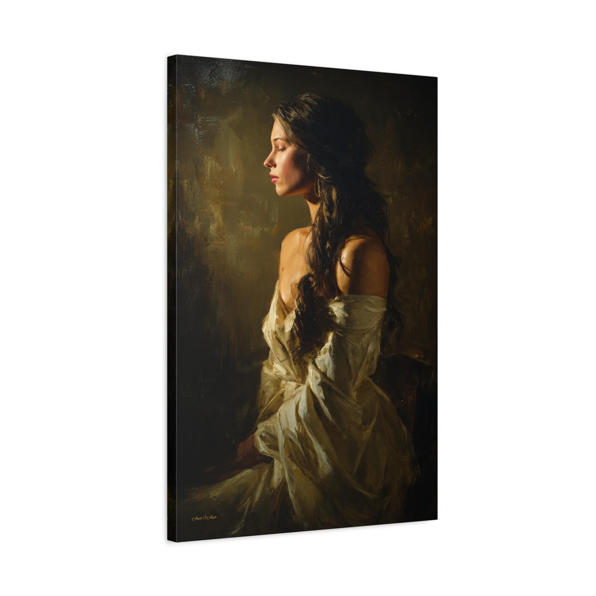 Bring the breathtaking elegance, quiet romance, and timeless beauty of classic fine art into your home with this stunning vintage woman portrait canvas print. This captivating vertical artwork features the serene profile of a woman with her eyes closed in peaceful contemplation. Bathed in soft, dramatic light against a moody, earthy background, her flowing dark hair and draped cream gown evoke the masterful chiaroscuro style of Renaissance and Baroque painters.