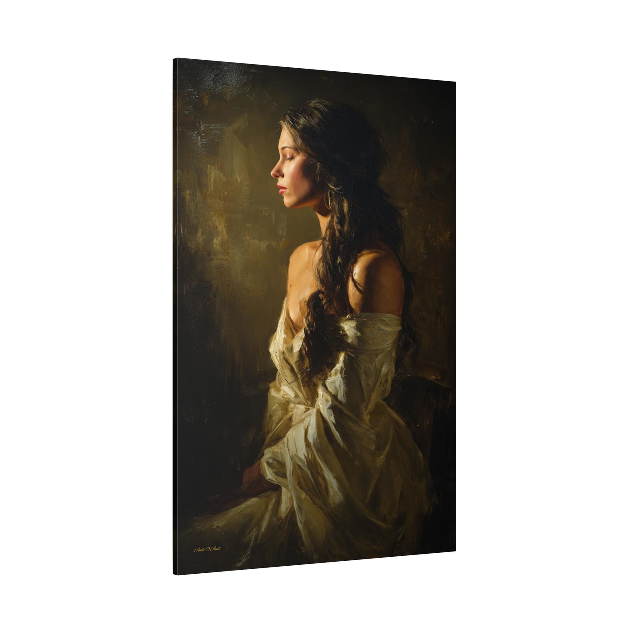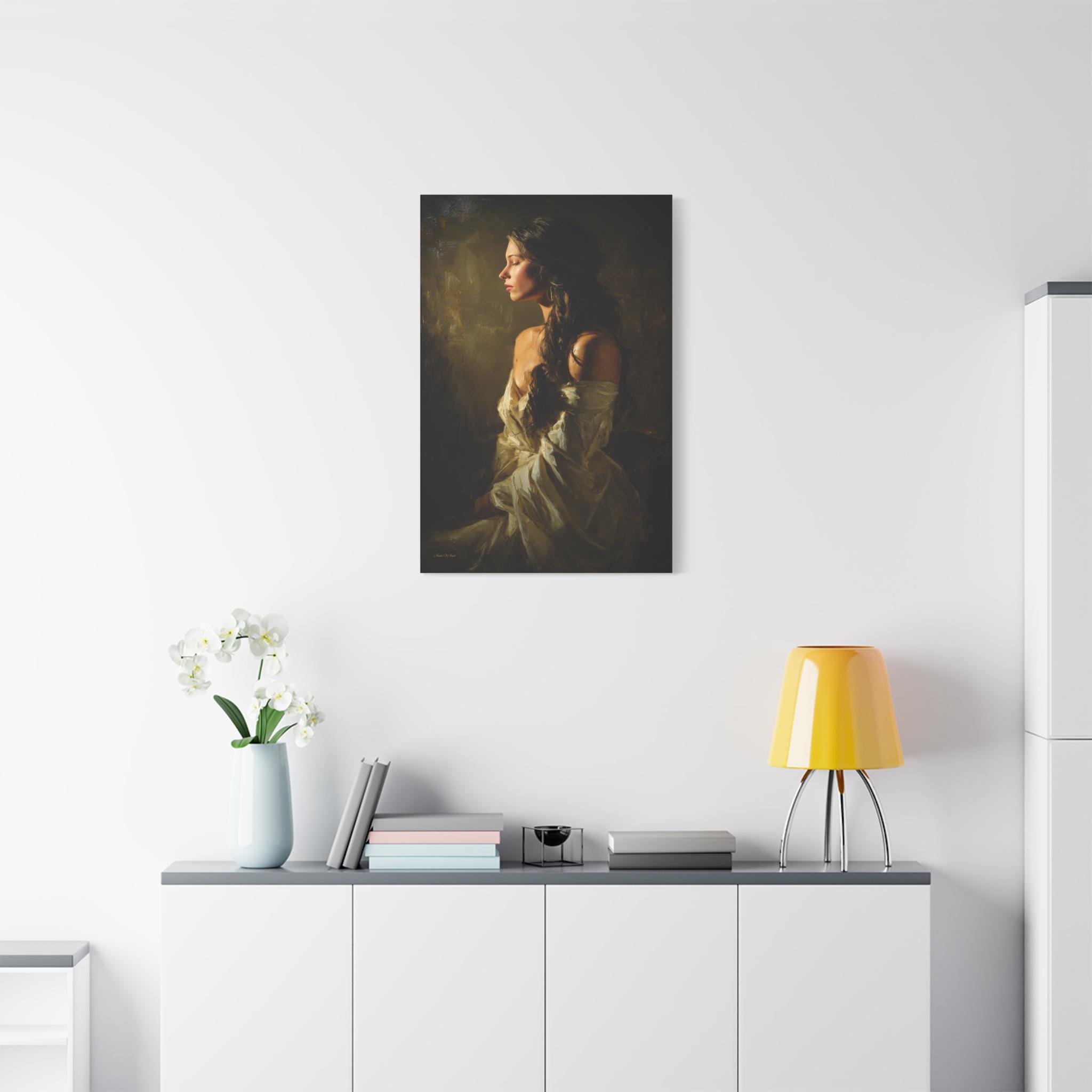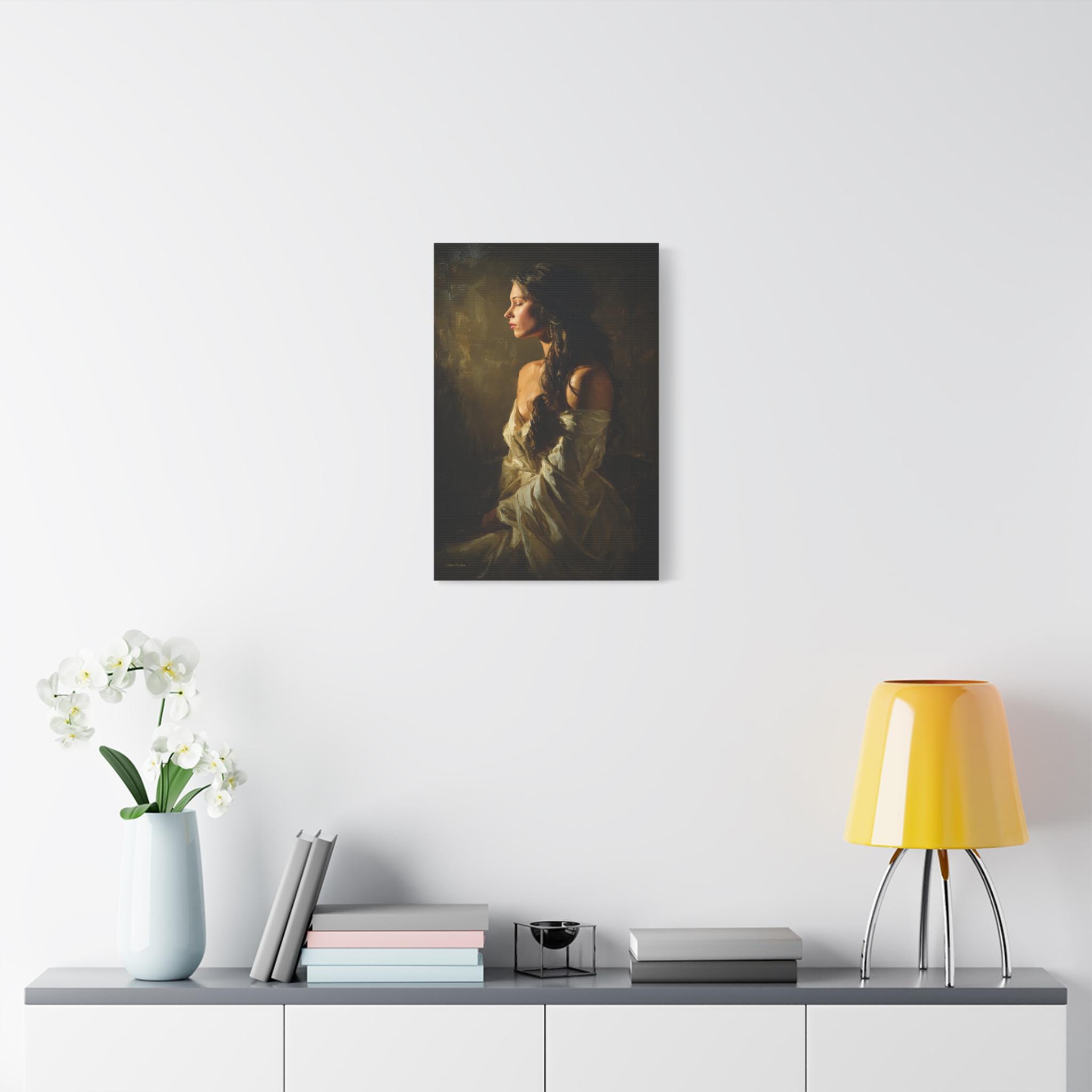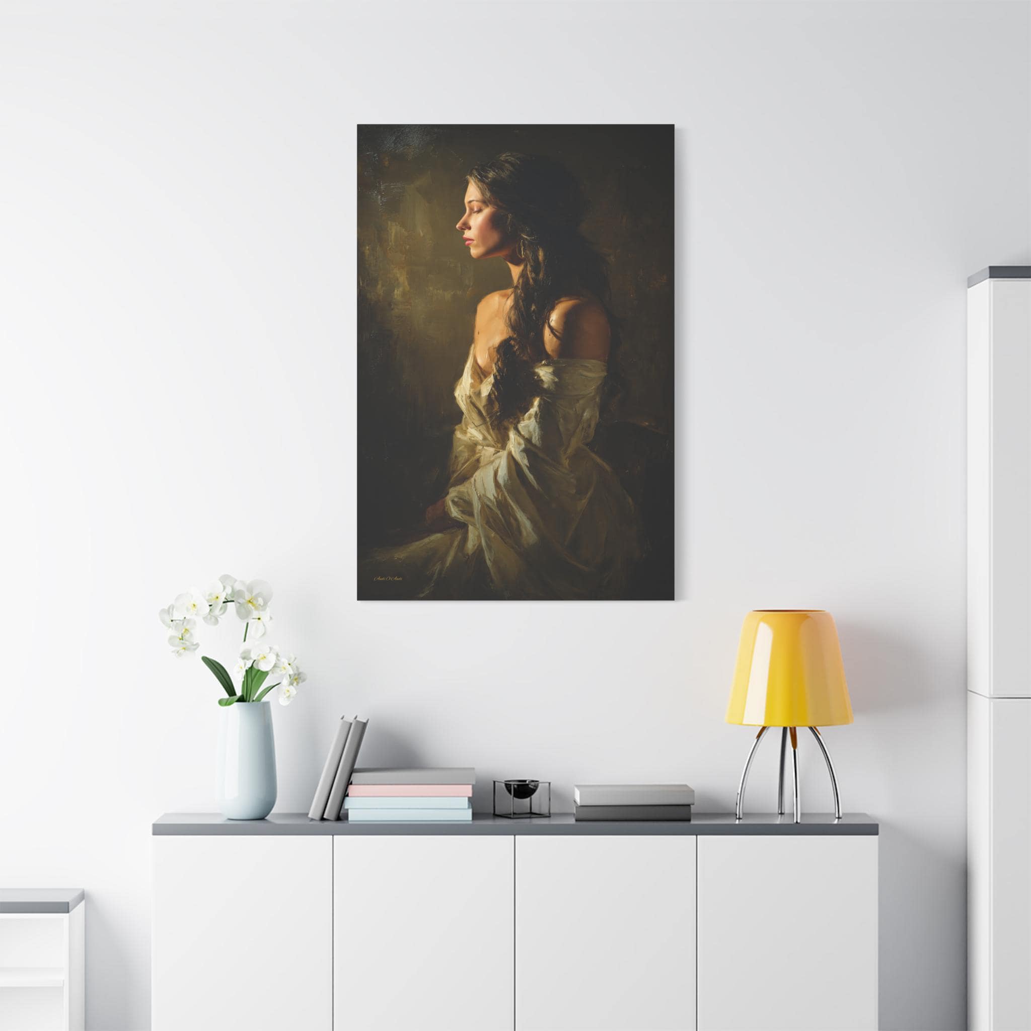 Bring the breathtaking elegance, quiet romance, and timeless beauty of classic fine art into your home with this stunning vintage woman portrait canvas print. This captivating vertical artwork features the serene profile of a woman with her eyes closed in peaceful contemplation. Bathed in soft, dramatic light against a moody, earthy background, her flowing dark hair and draped cream gown evoke the masterful chiaroscuro style of Renaissance and Baroque painters.