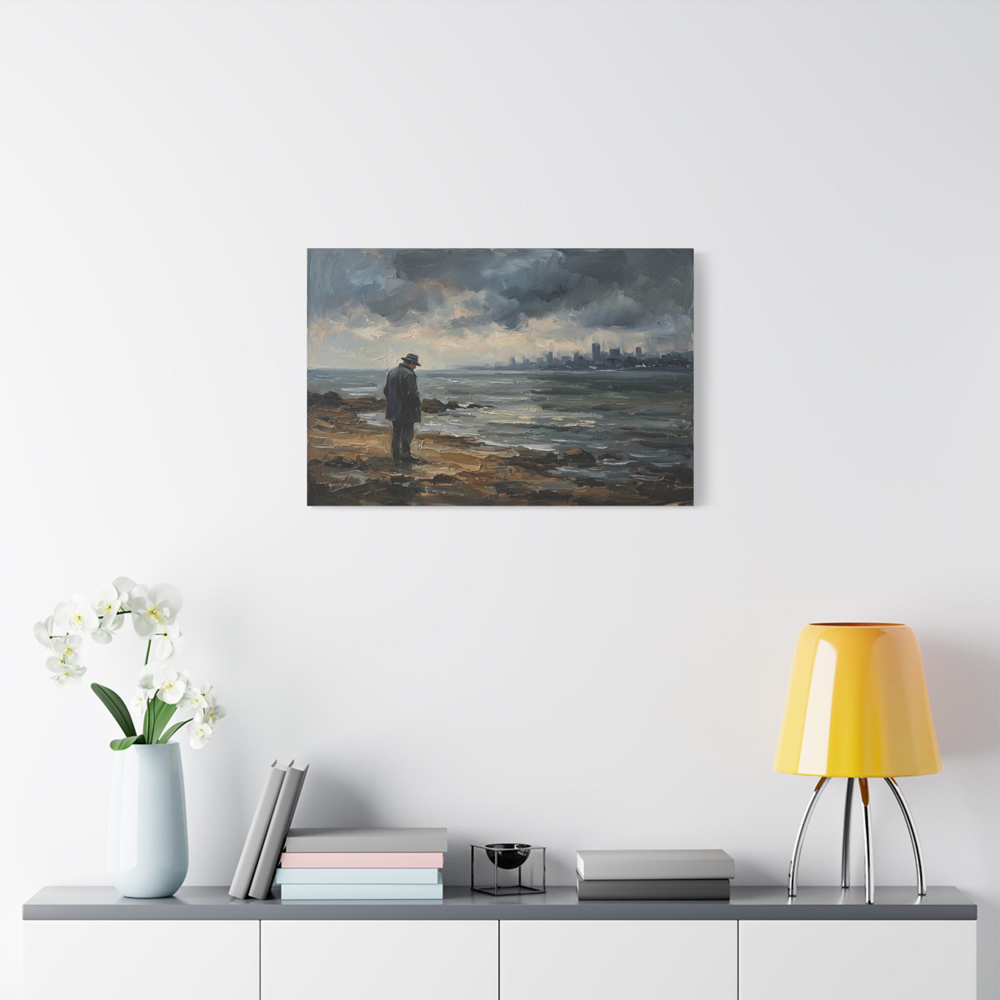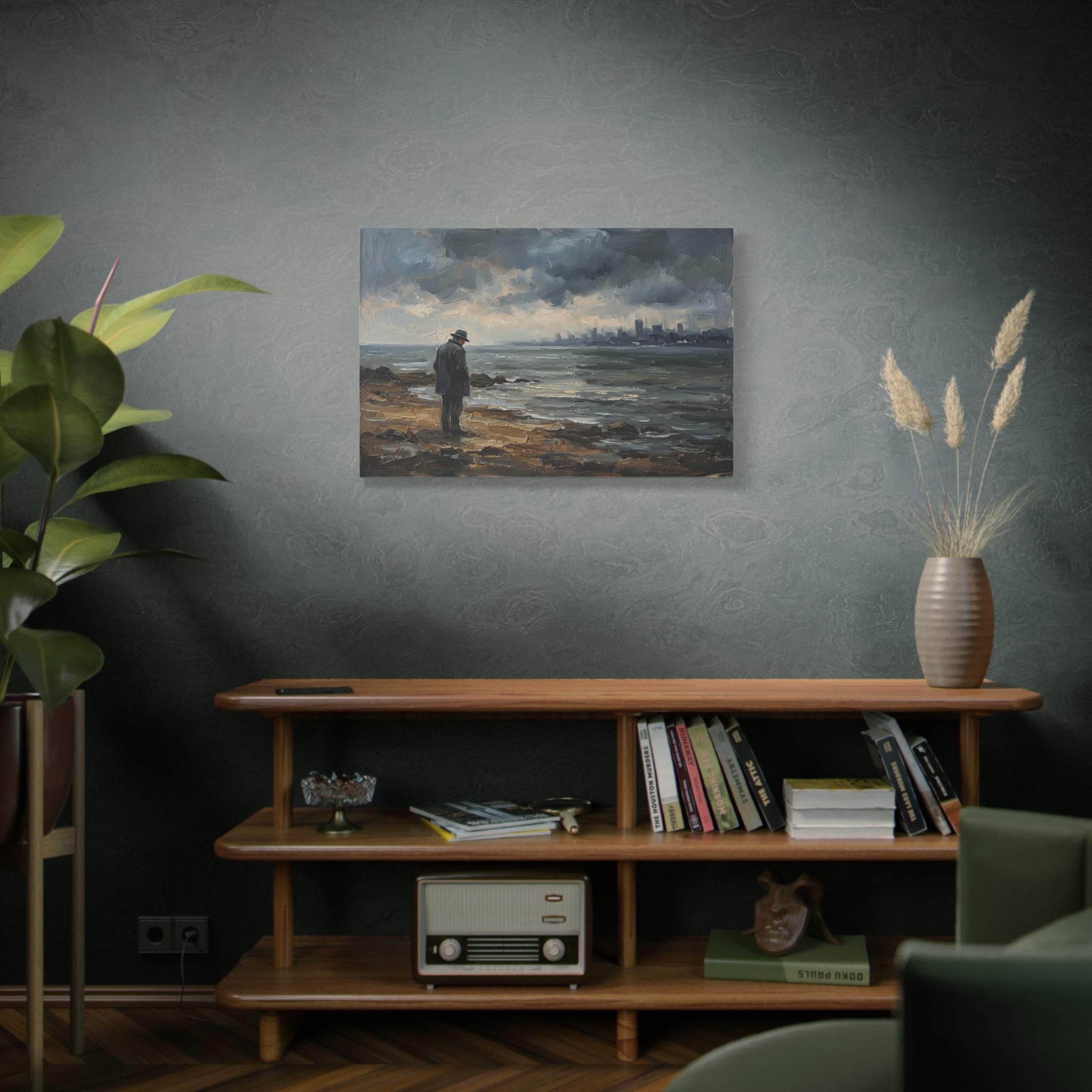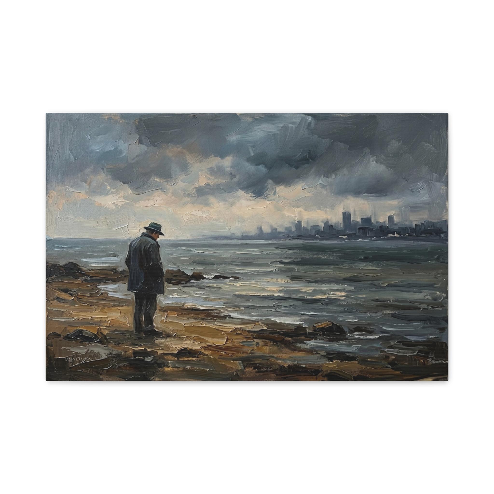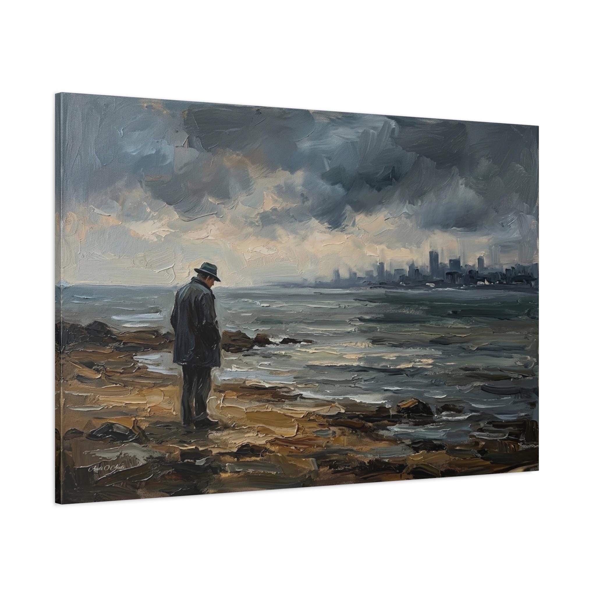 Bring the quiet power, contemplative solitude, and cinematic atmosphere of a stormy coastline into your home with this stunning moody seascape canvas print. This captivating horizontal artwork features a solitary man in a coat and fedora standing on a rugged, rocky shore, gazing out across restless, choppy waters. In the distance, a hazy, muted city skyline rests beneath a dramatic sky of heavy, rolling clouds.