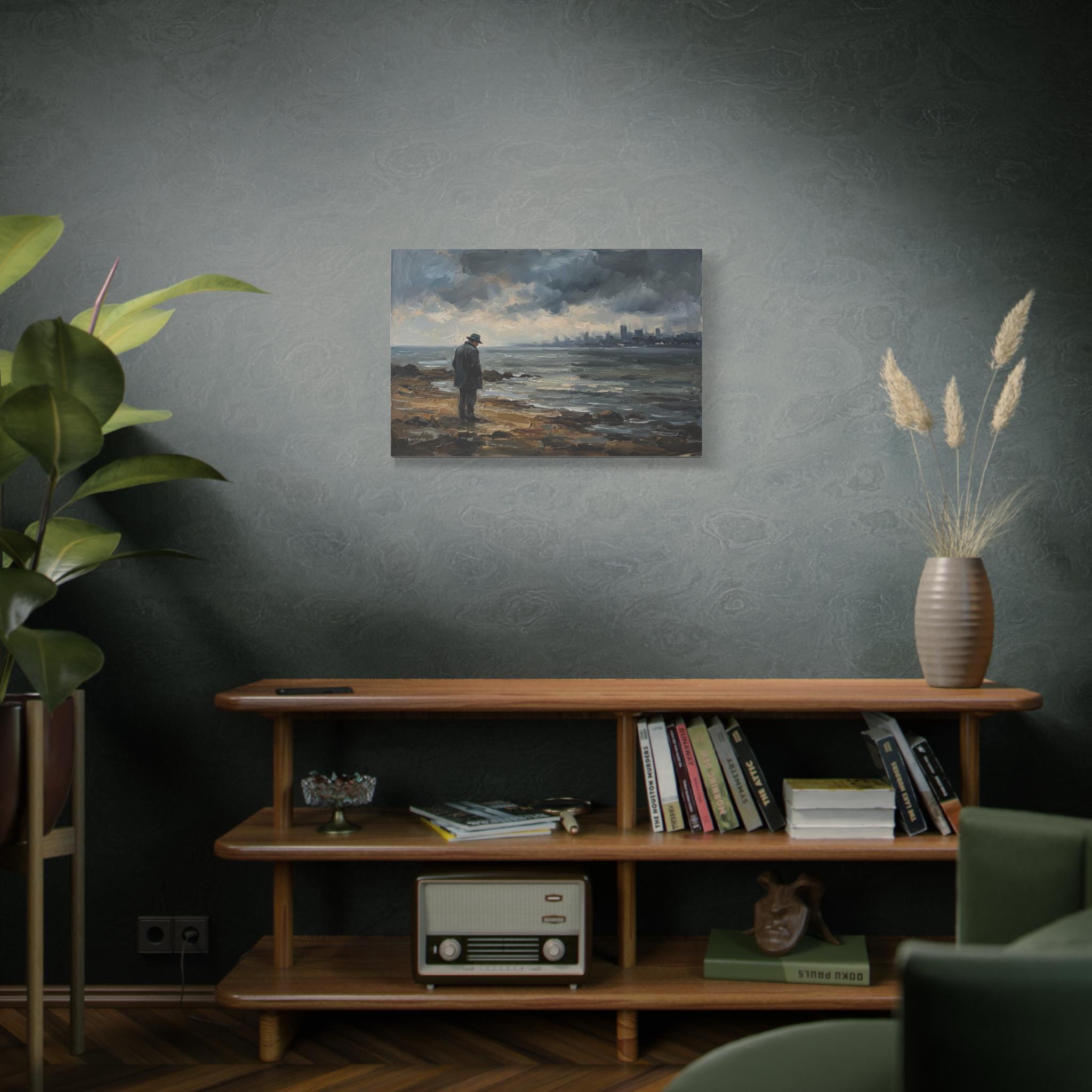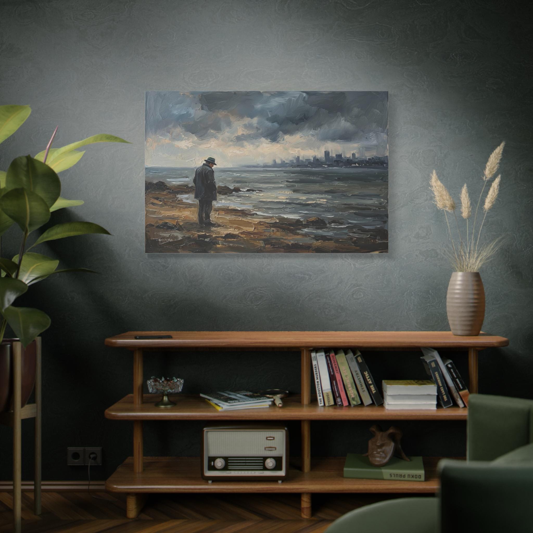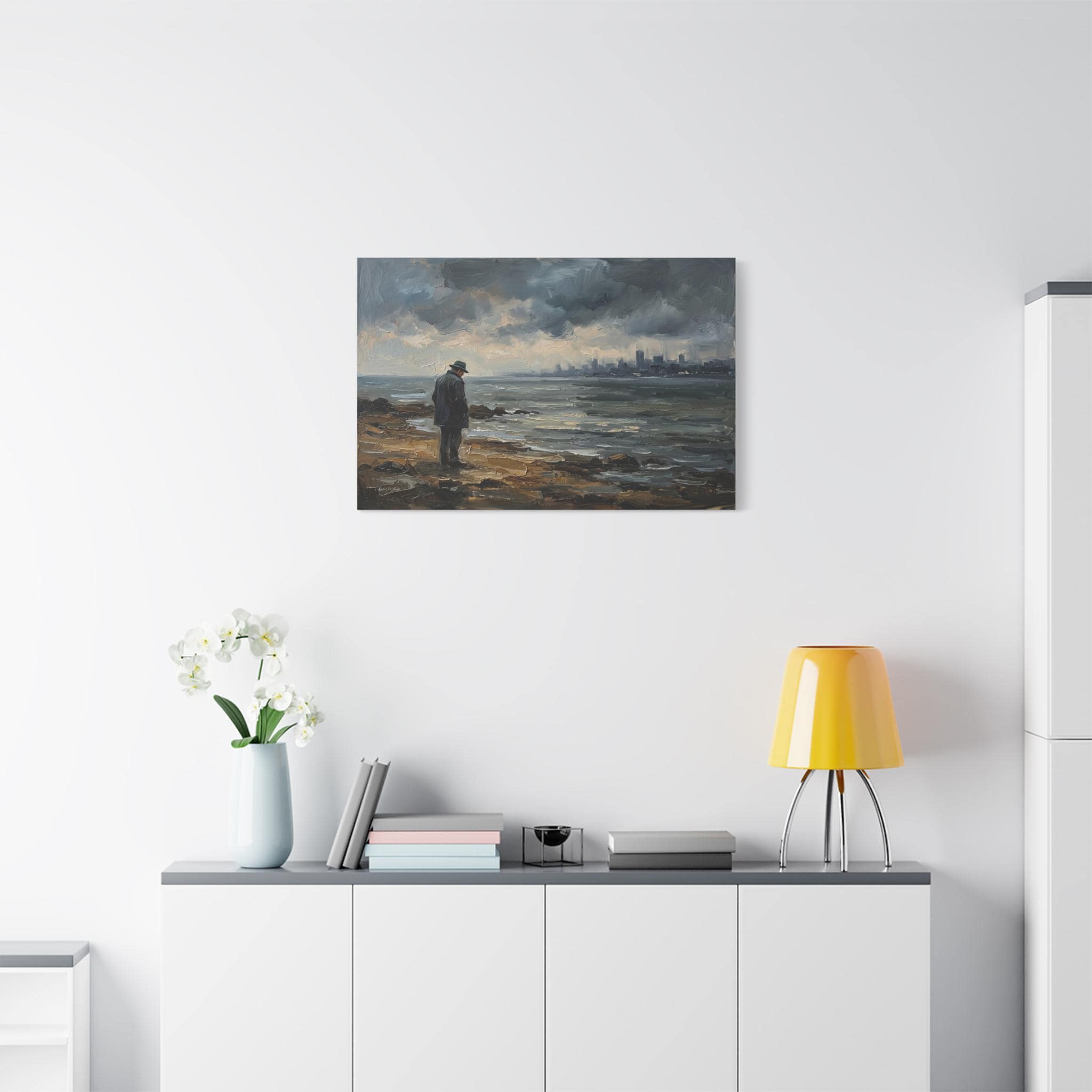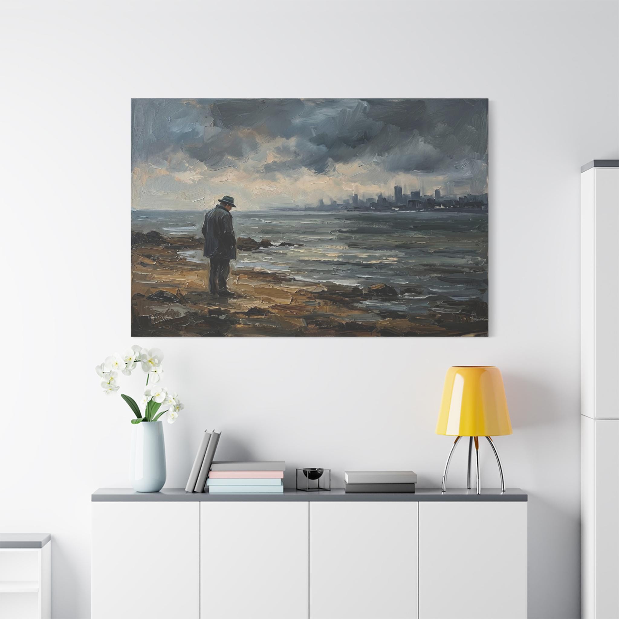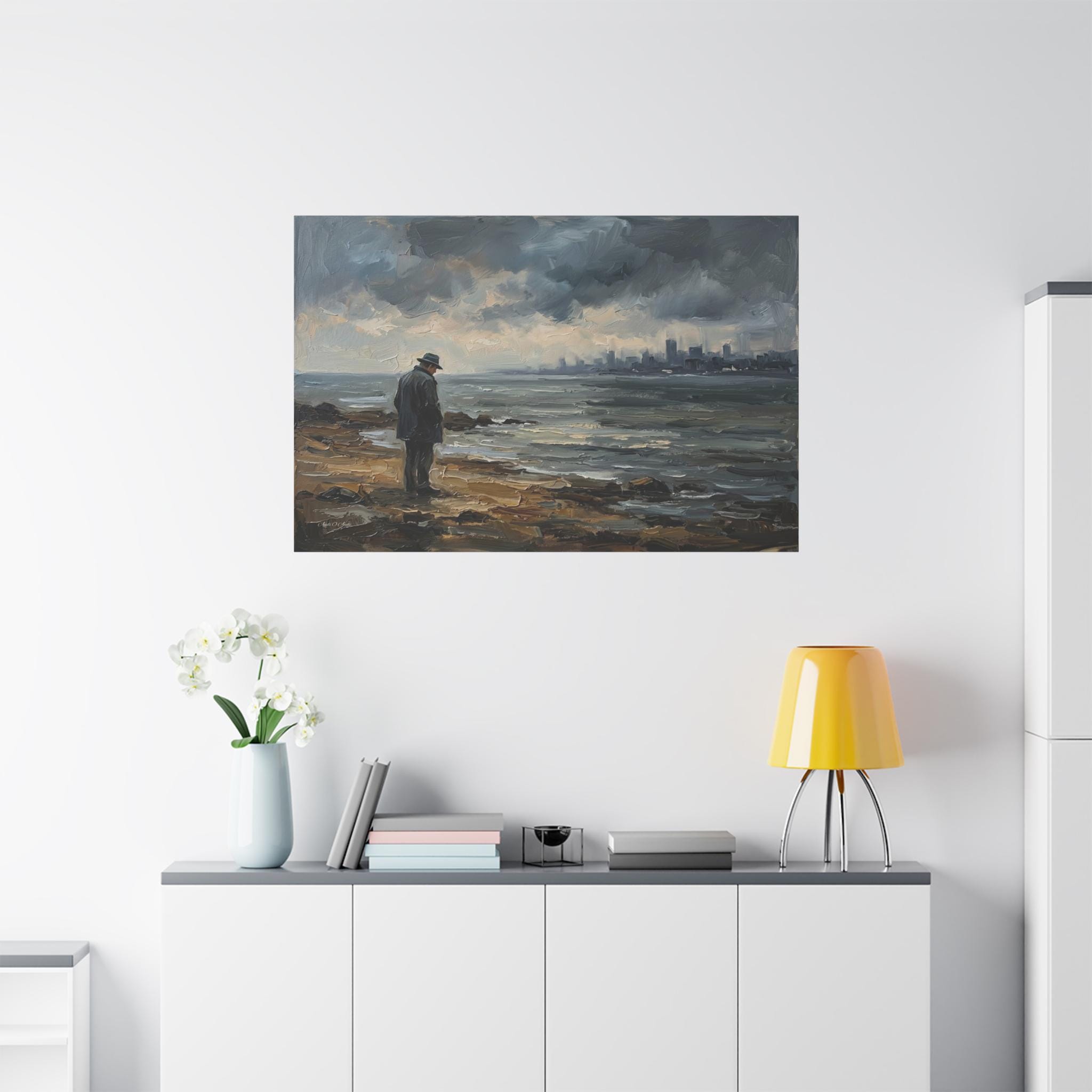Bring the quiet power, contemplative solitude, and cinematic atmosphere of a stormy coastline into your home with this stunning moody seascape canvas print. This captivating horizontal artwork features a solitary man in a coat and fedora standing on a rugged, rocky shore, gazing out across restless, choppy waters. In the distance, a hazy, muted city skyline rests beneath a dramatic sky of heavy, rolling clouds.